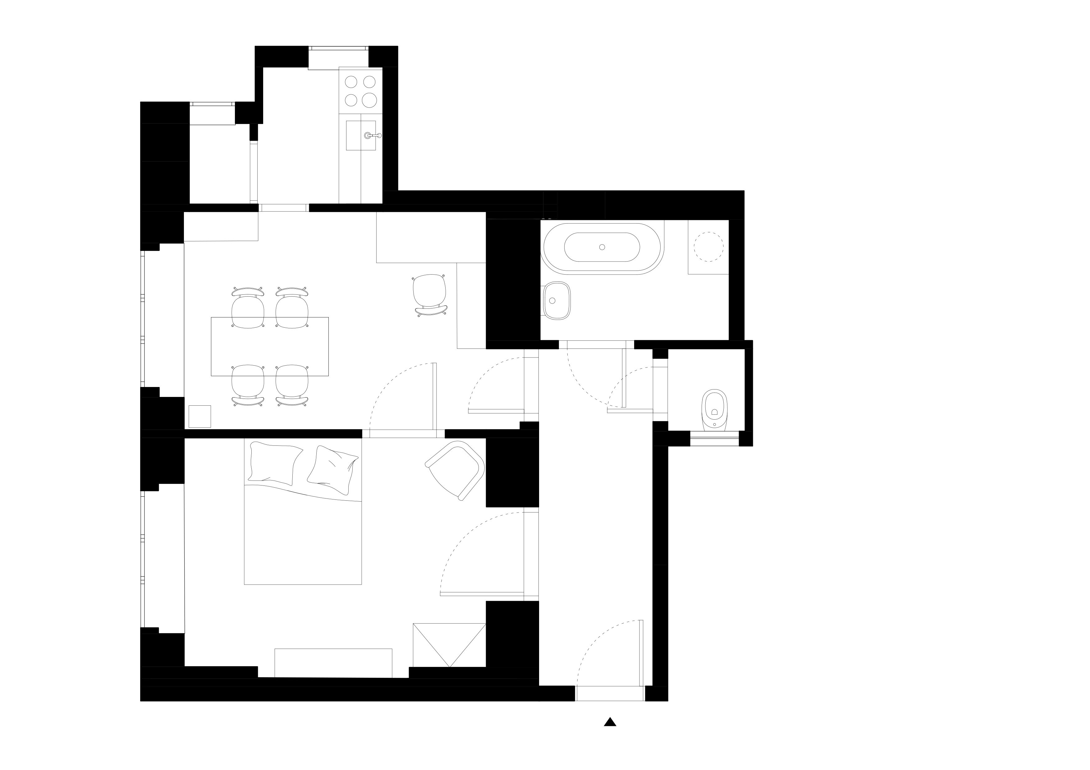 Základný princíp kompletnej rekonštrukcie spočíval vo vytvorení otvoreného obytného priestoru, ktorý vznikol na pôdoryse pôvodnej kuchyne, jedálne a spálne. Zjednotenie dispozície umožnilo presvetlenie interiéru z dvoch smerov a posilnilo vizuálny kontakt so zeleňou na dvore. Hygienické zázemie a vstupná chodba prešli tiež kompletnou rekonštrukciou. Pôdorys sa však v tejto časti, s výnimkou odstránenia dverí bývalej spálne, nemenil.