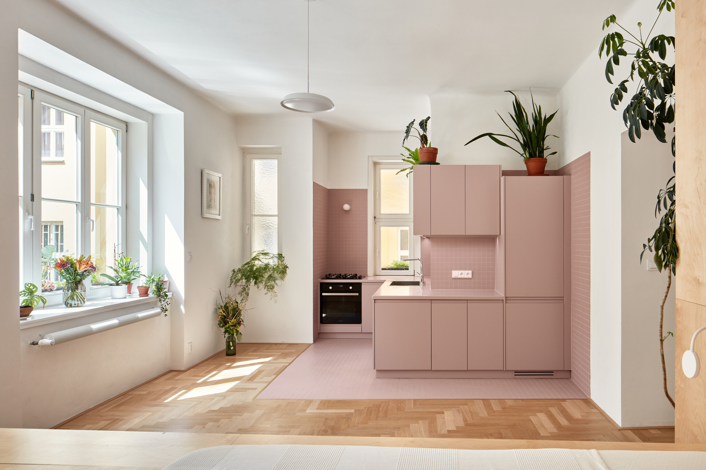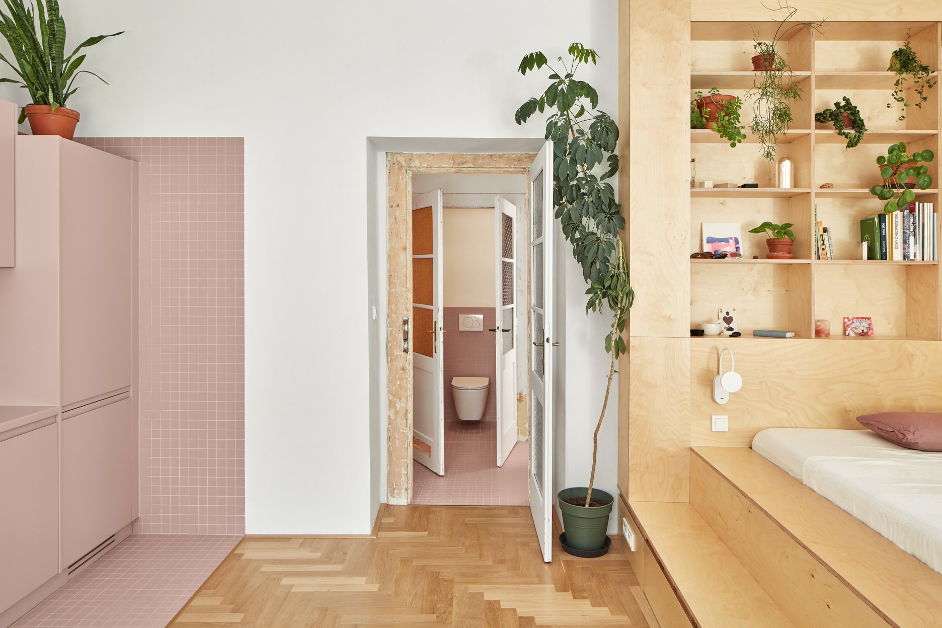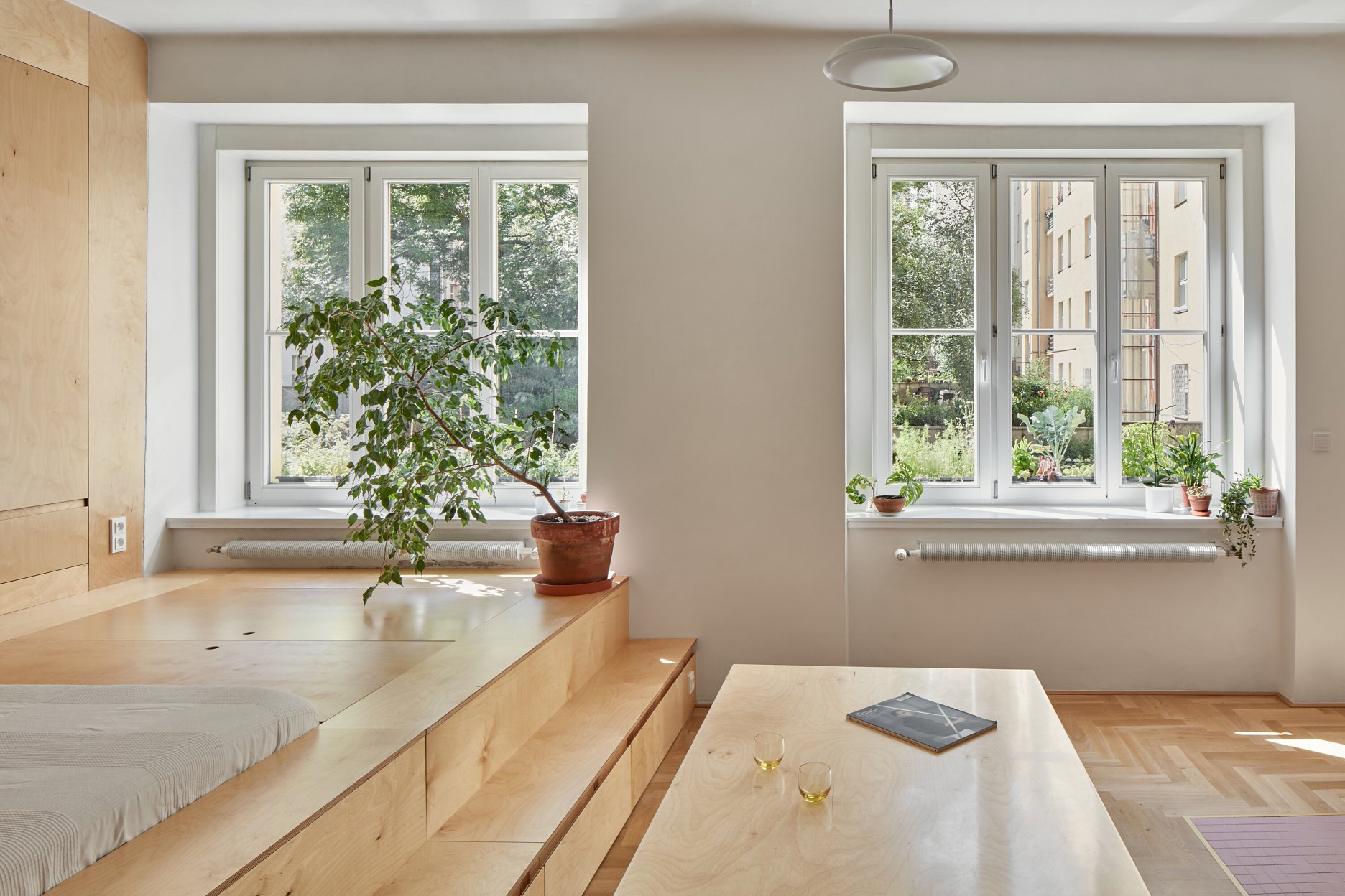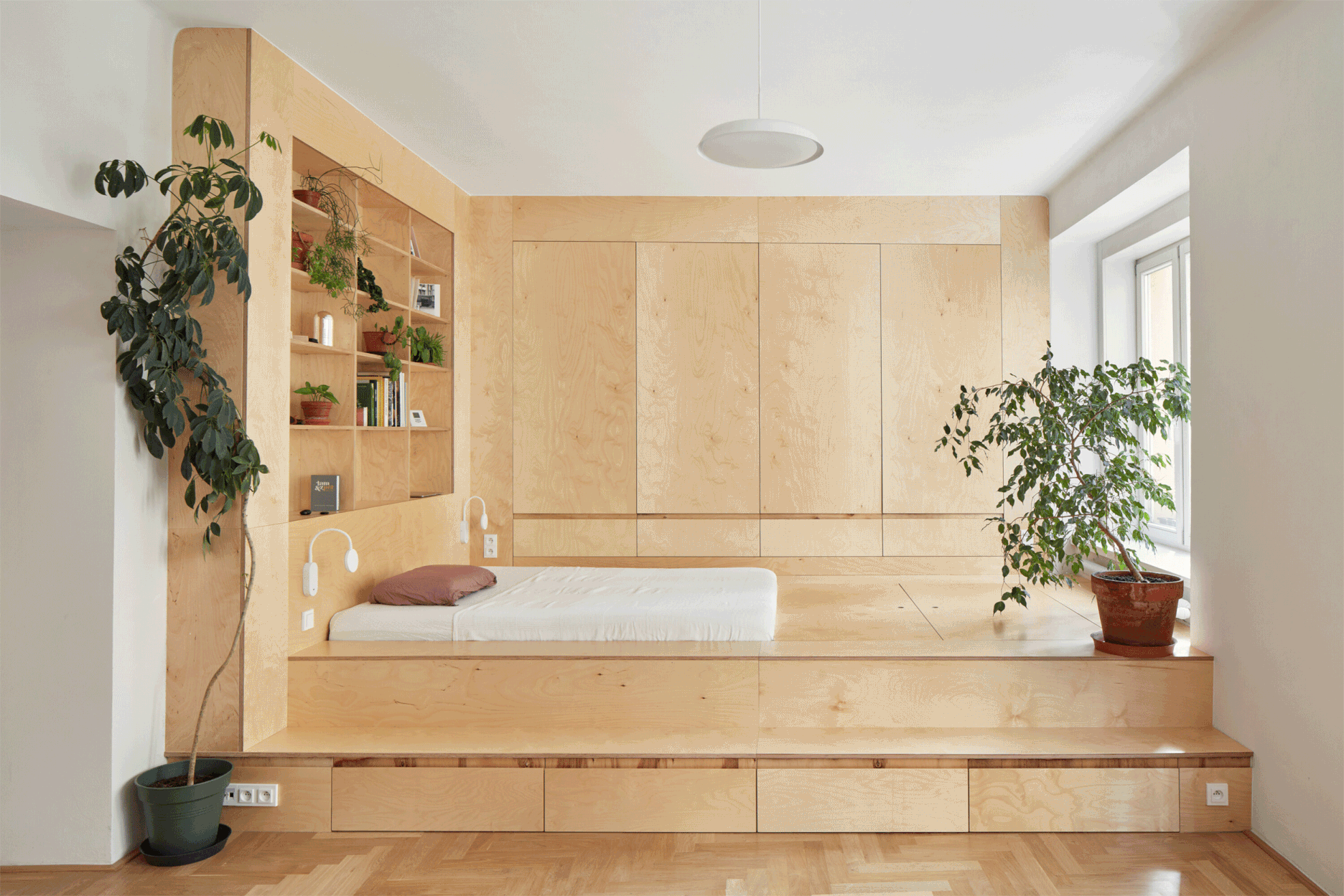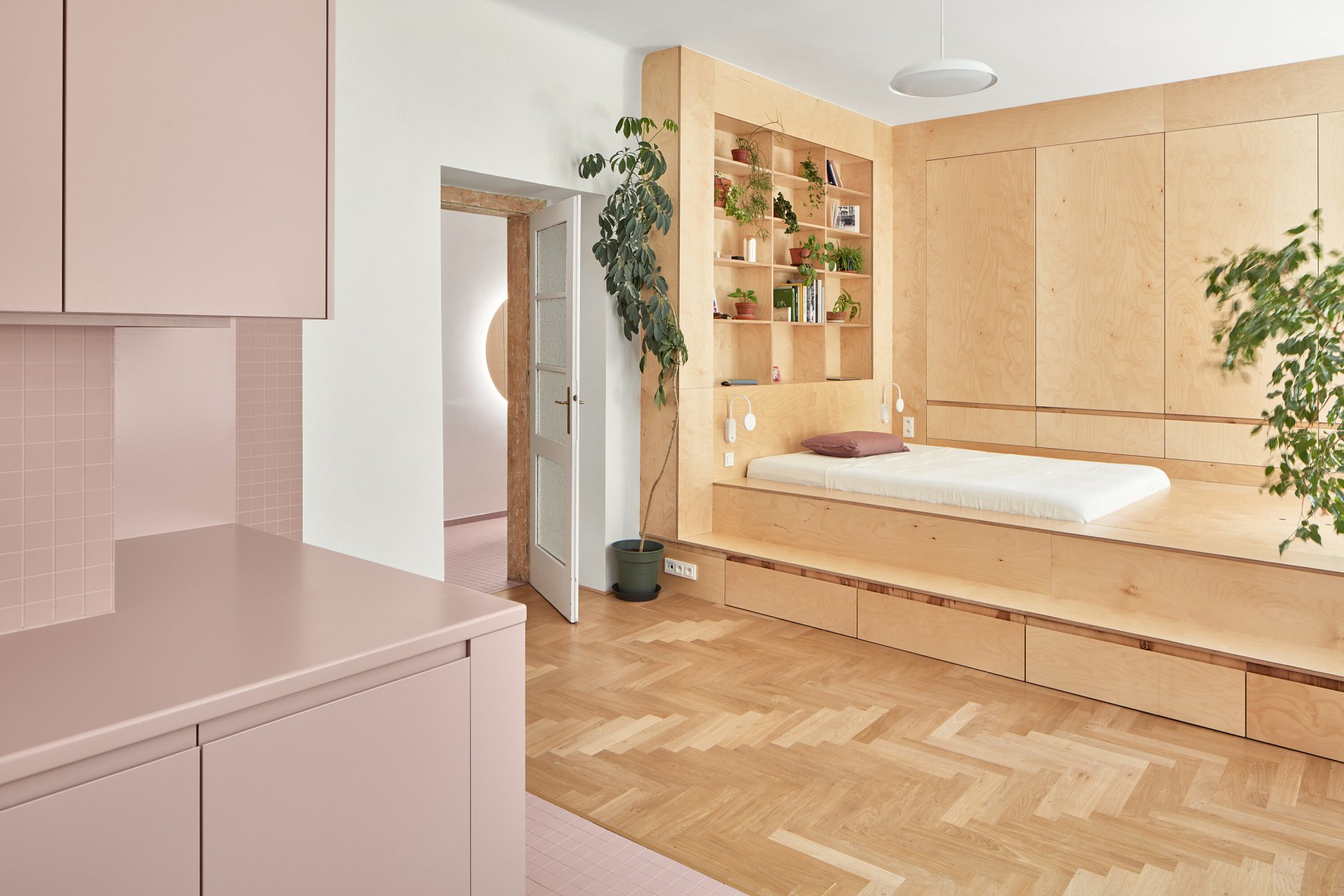 Architekti zónujú priestor jedinej izby bytu prostredníctvom výrazných nábytkových prvkov na dva hlavné celky: drevený blok na spanie a ružový blok na varenie. Kuchyňa a multifunkčné pódium, slúžia ako posteľ, úložný priestor, knižnica, šatňa aj lavica. Z vyvýšenej platformy na mieste spálne sa otvára príjemný pohľad priamo do zelene.