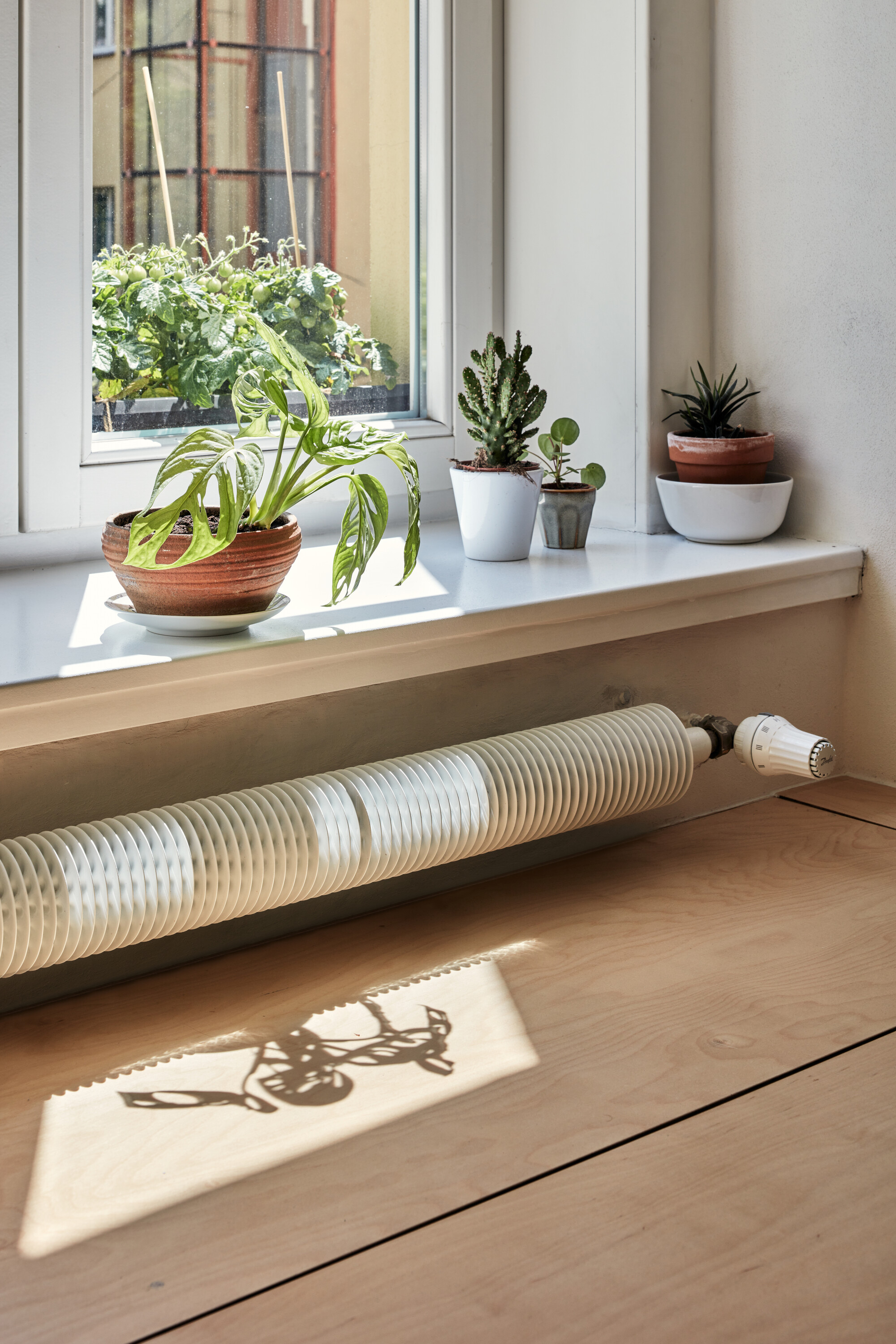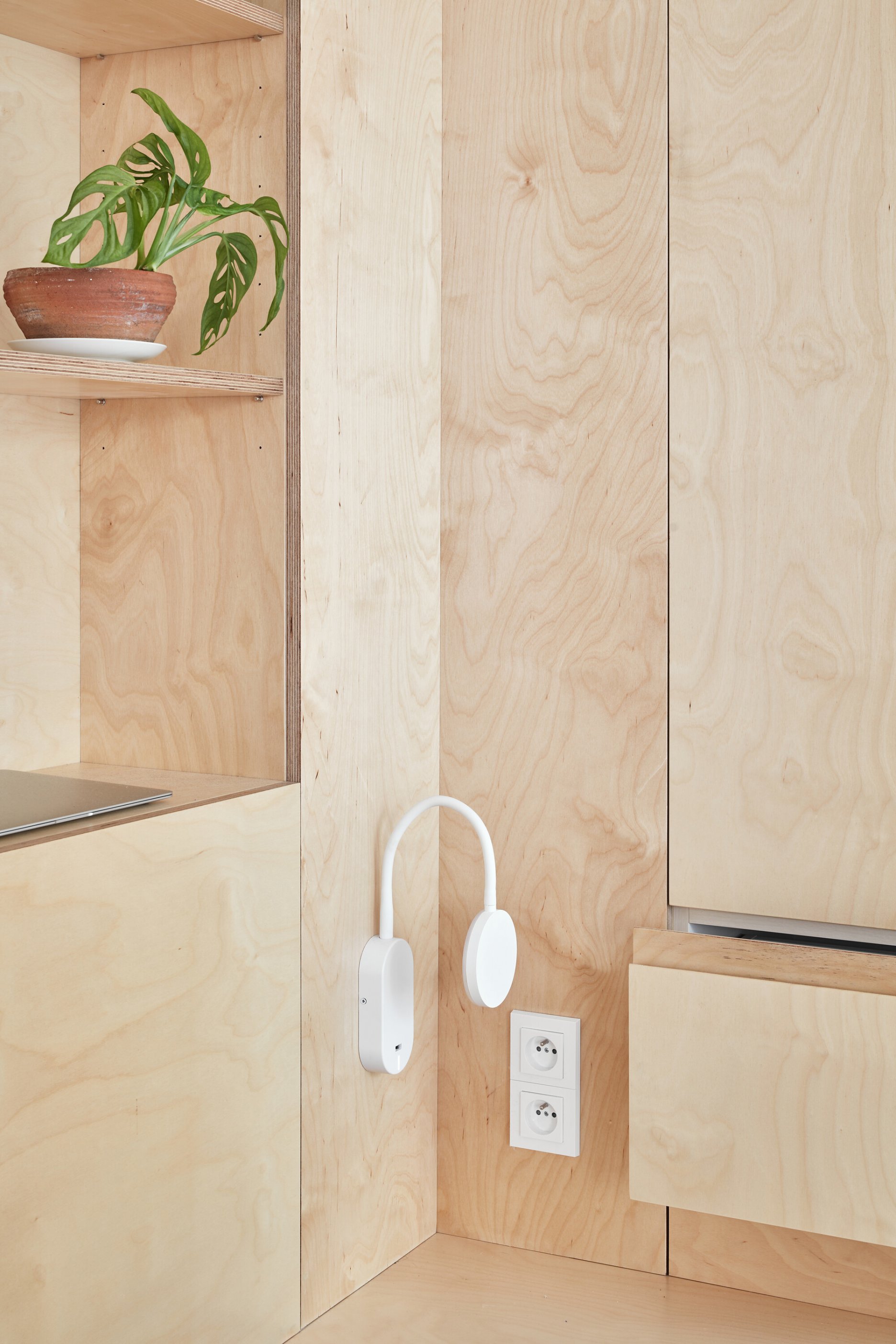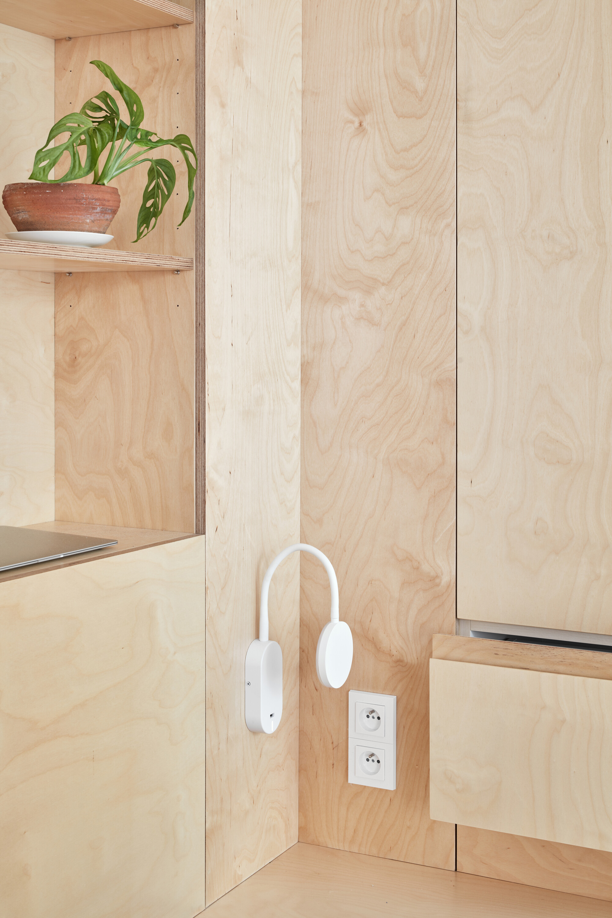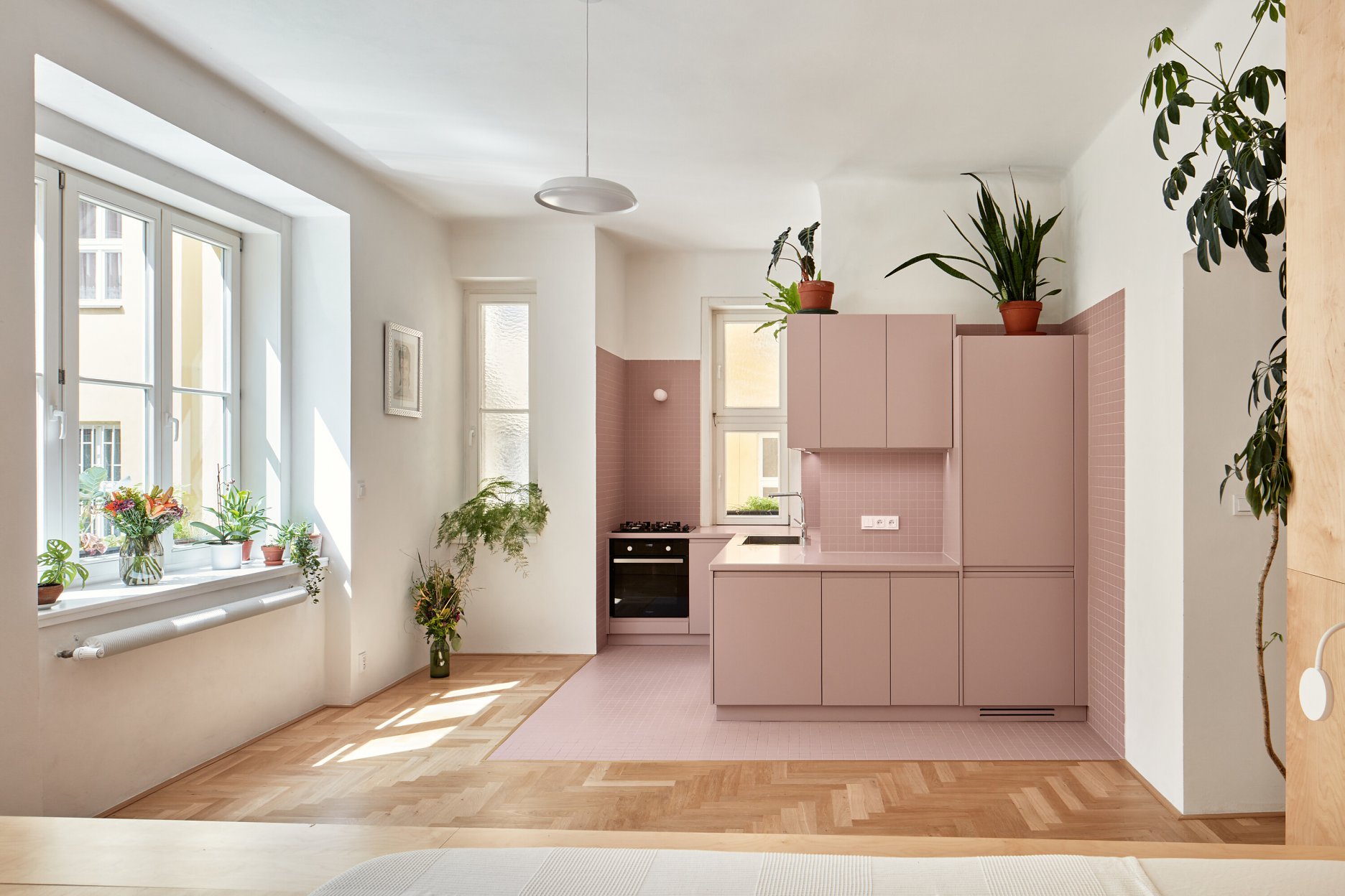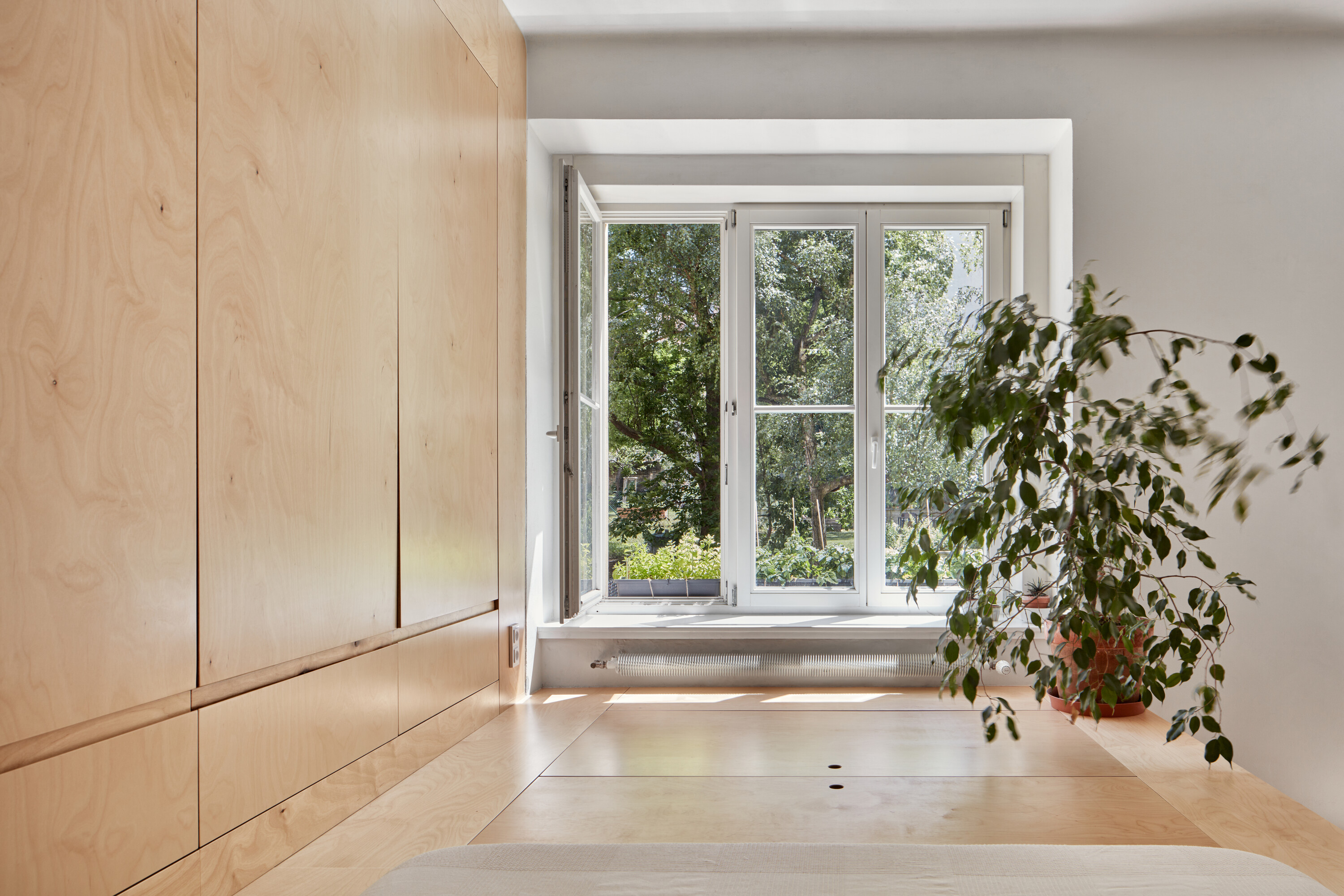 Architekti zónujú priestor jedinej izby bytu prostredníctvom výrazných nábytkových prvkov na dva hlavné celky: drevený blok na spanie a ružový blok na varenie. Kuchyňa a multifunkčné pódium, slúžia ako posteľ, úložný priestor, knižnica, šatňa aj lavica. Z vyvýšenej platformy na mieste spálne sa otvára príjemný pohľad priamo do zelene.