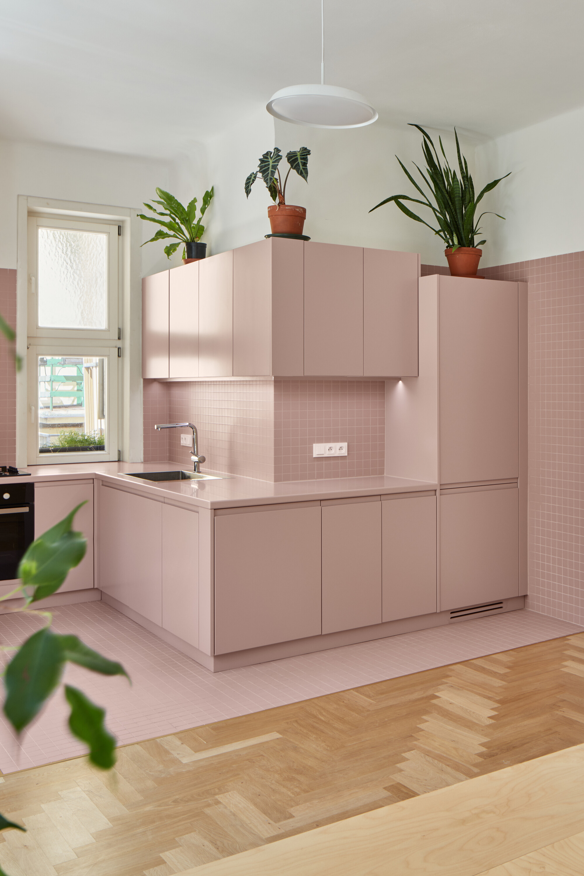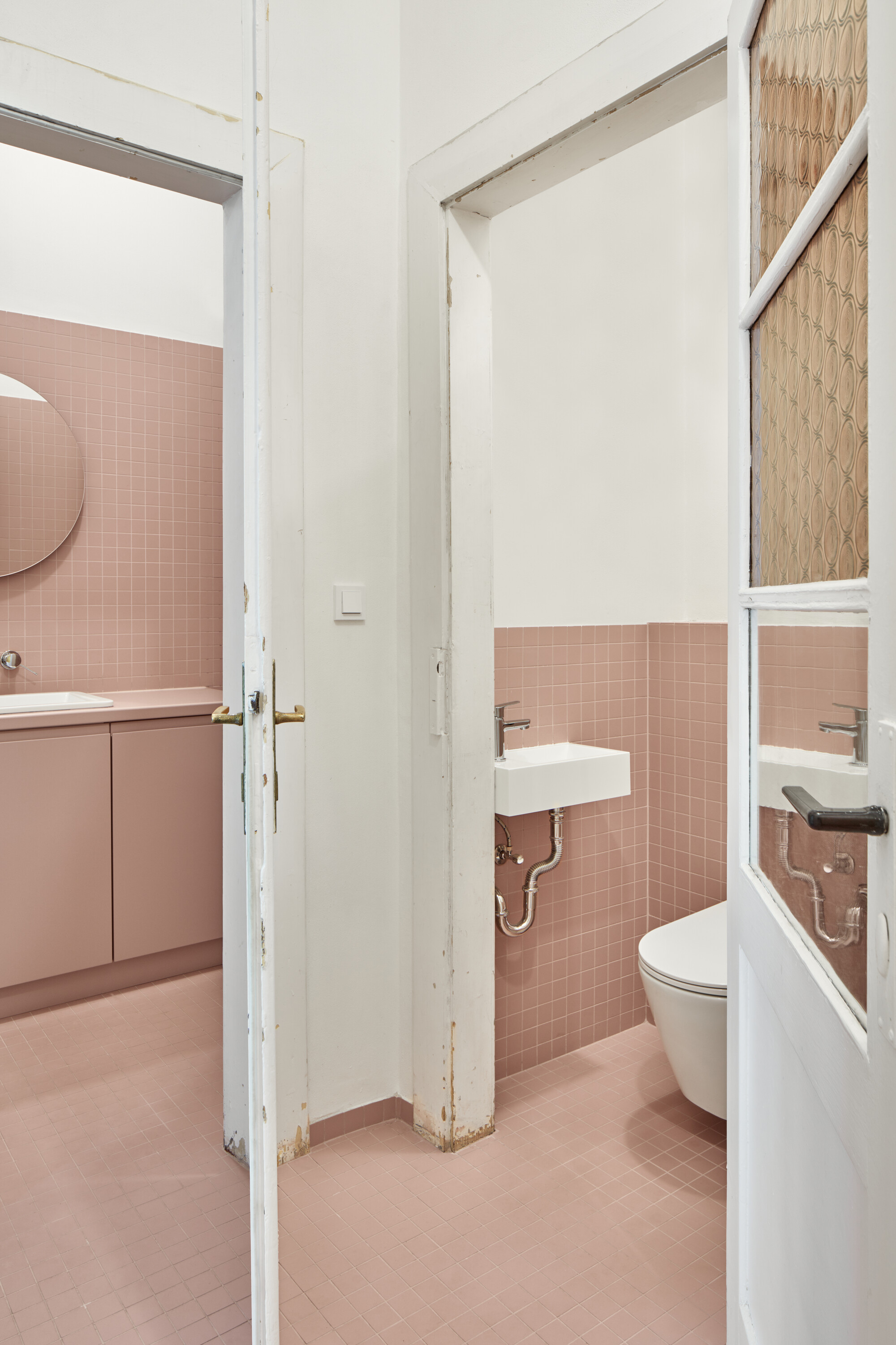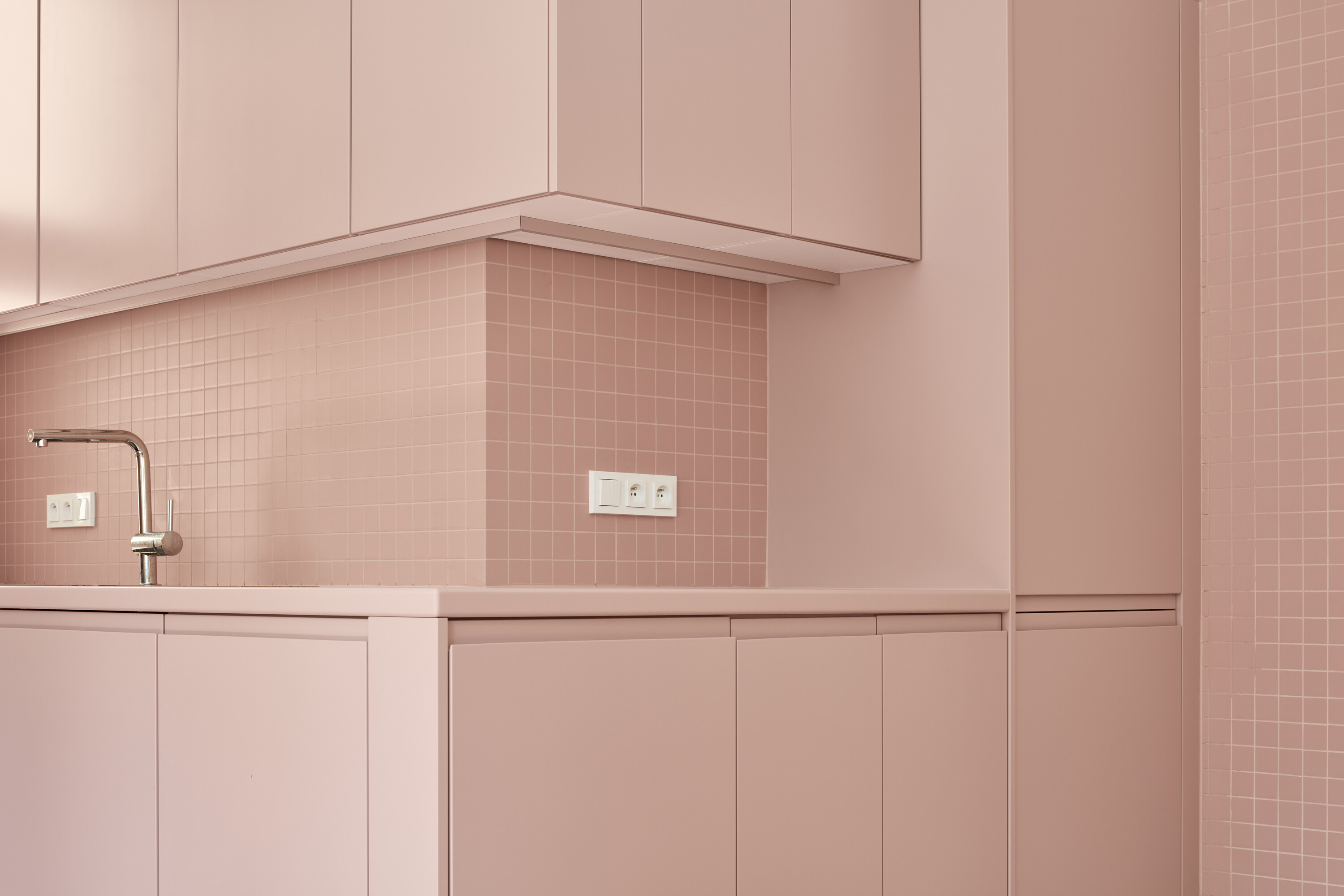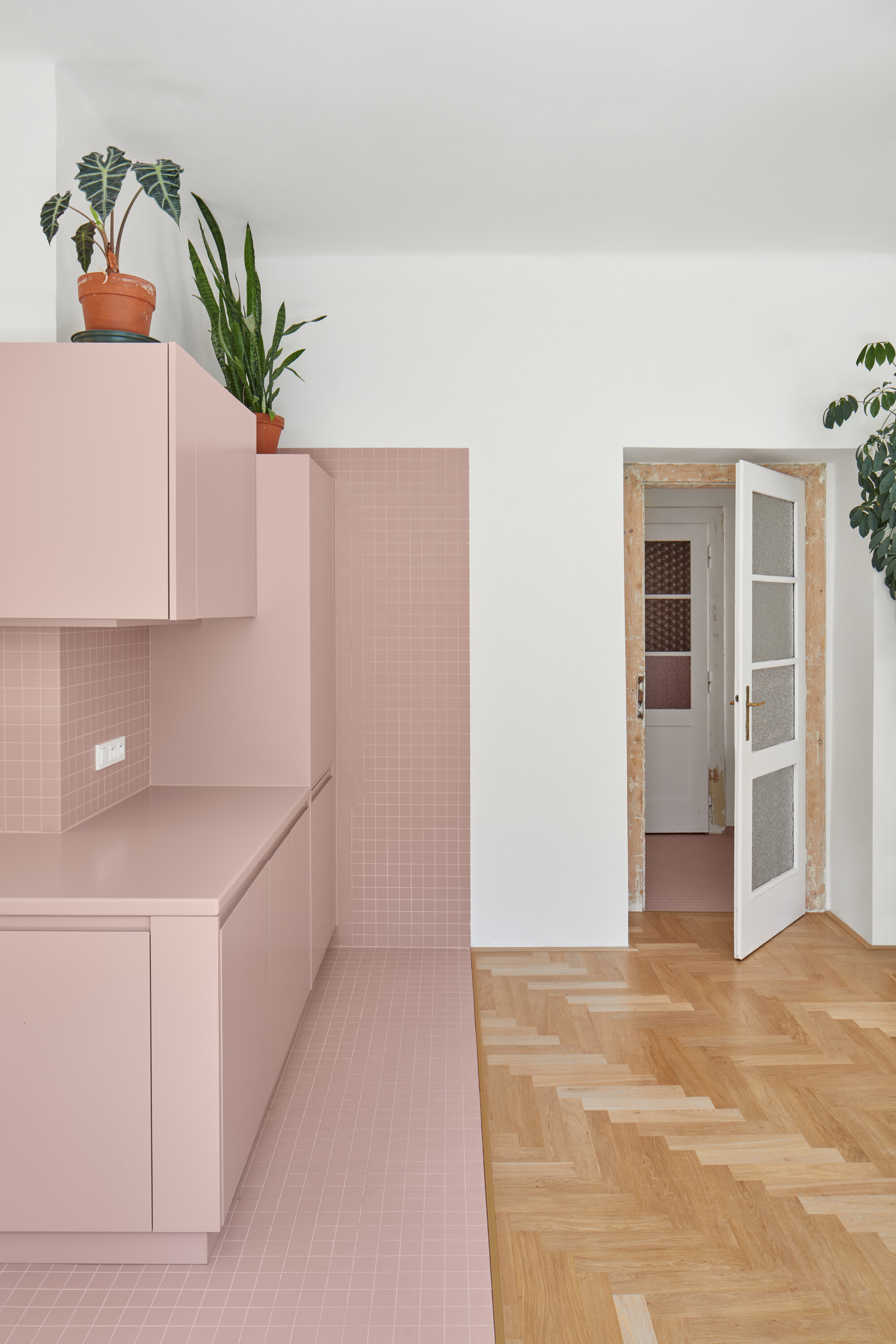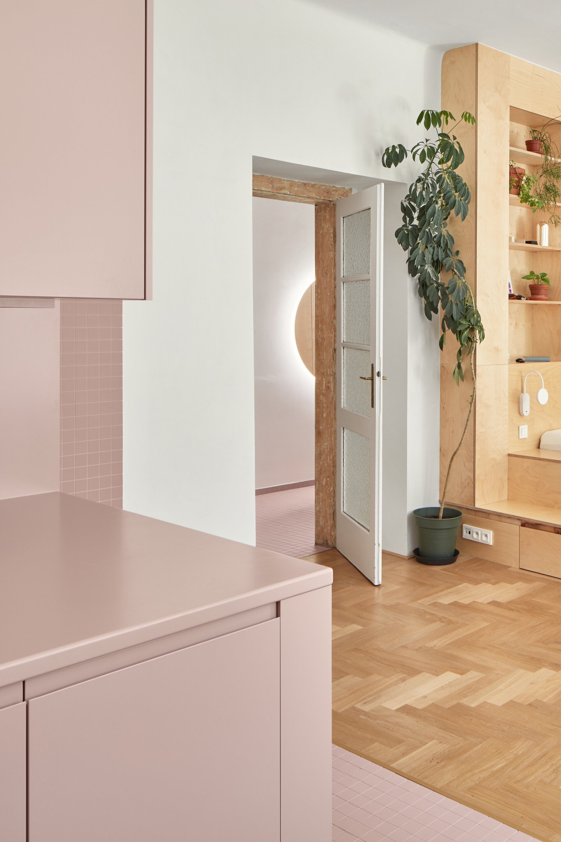 Dialóg obytnej a obslužnej zóny bytu je podčiarknutý použitými materiálmi a ich jednoznačnou farebnosťou. Kúpeľňu, kuchyňu, toaletu a chodbu definuje ružová farba nábytku, dlažby a obkladu. Úložné priestory a predovšetkým multifunkčná platforma sú vyrobené z brezovej preglejky. Výslednú kompozíciu zjemňujú kruhové svietidlá a zrkadlá.