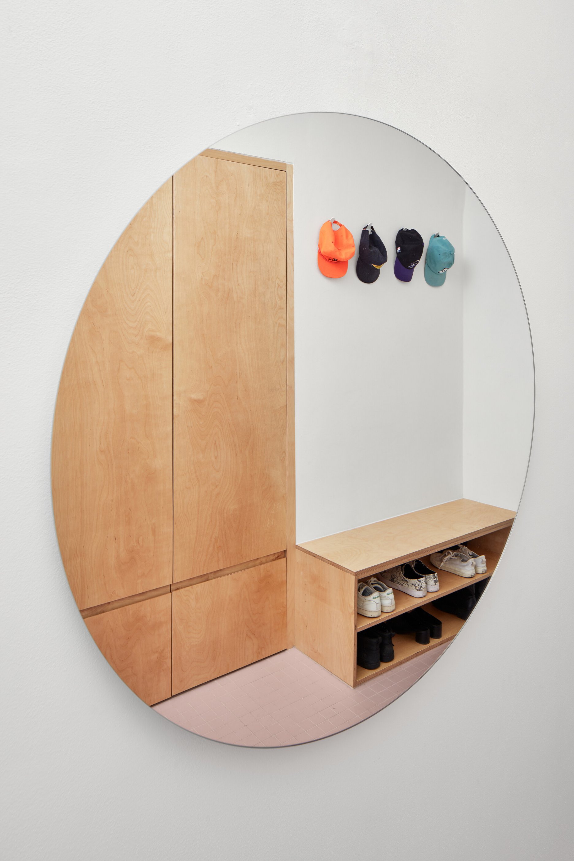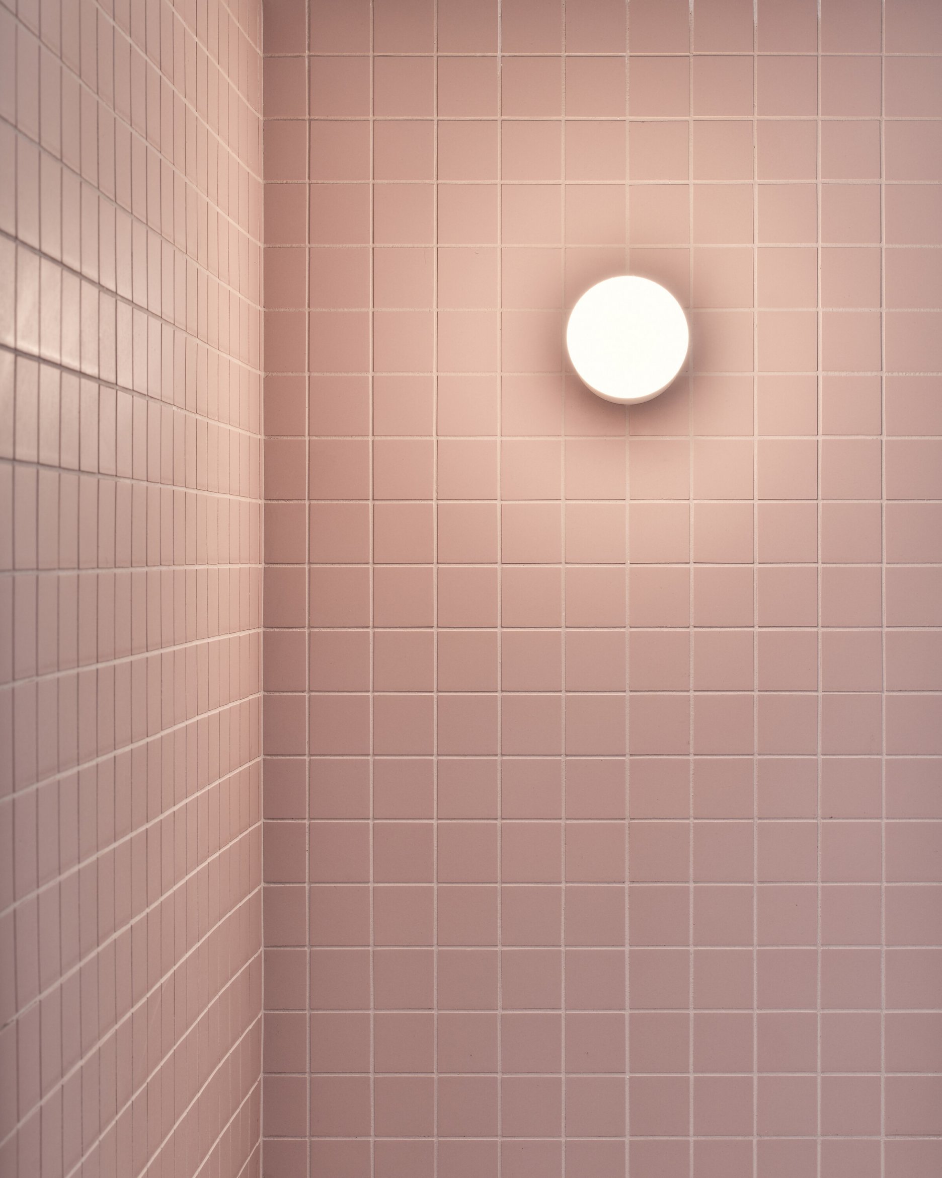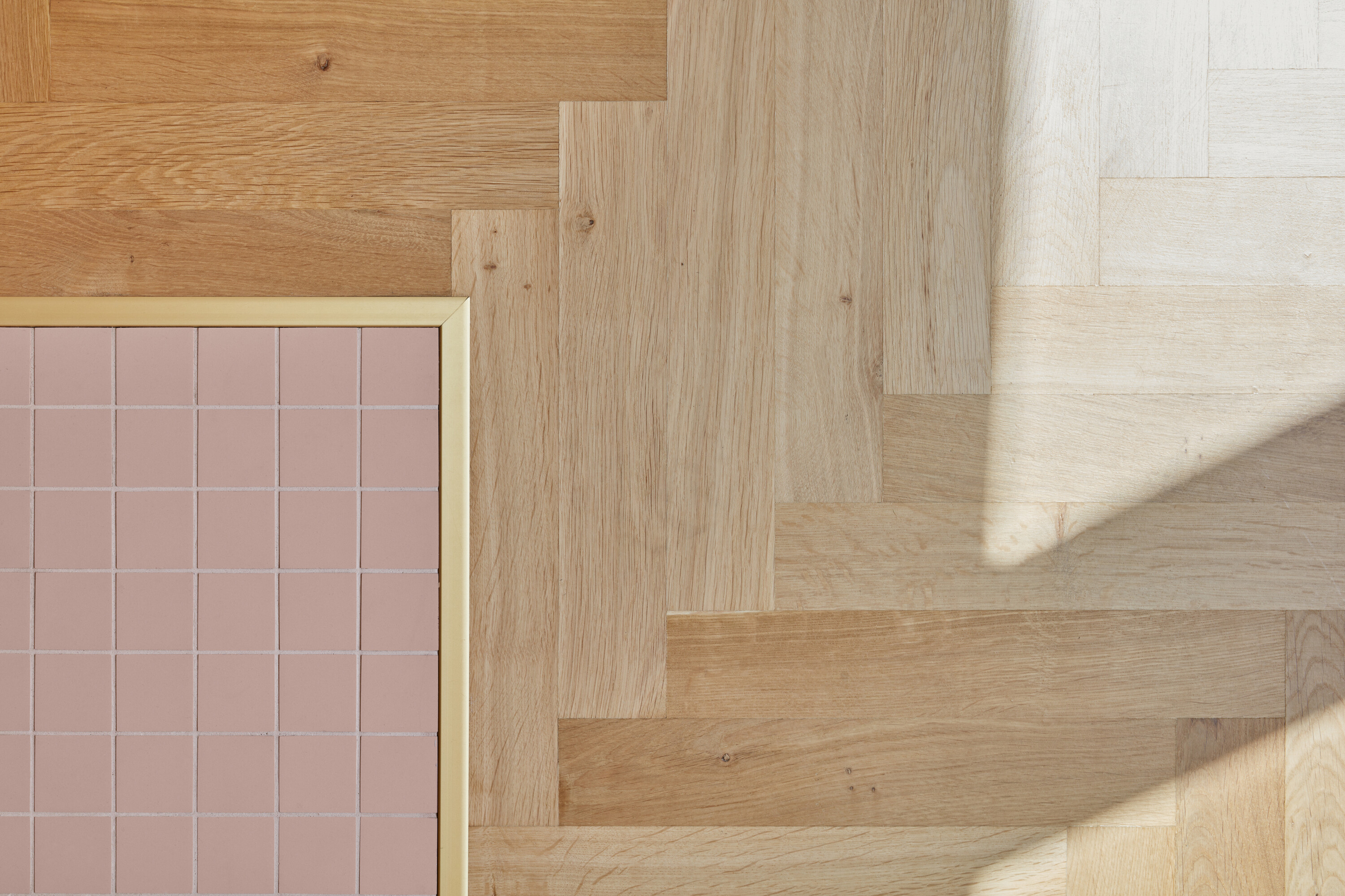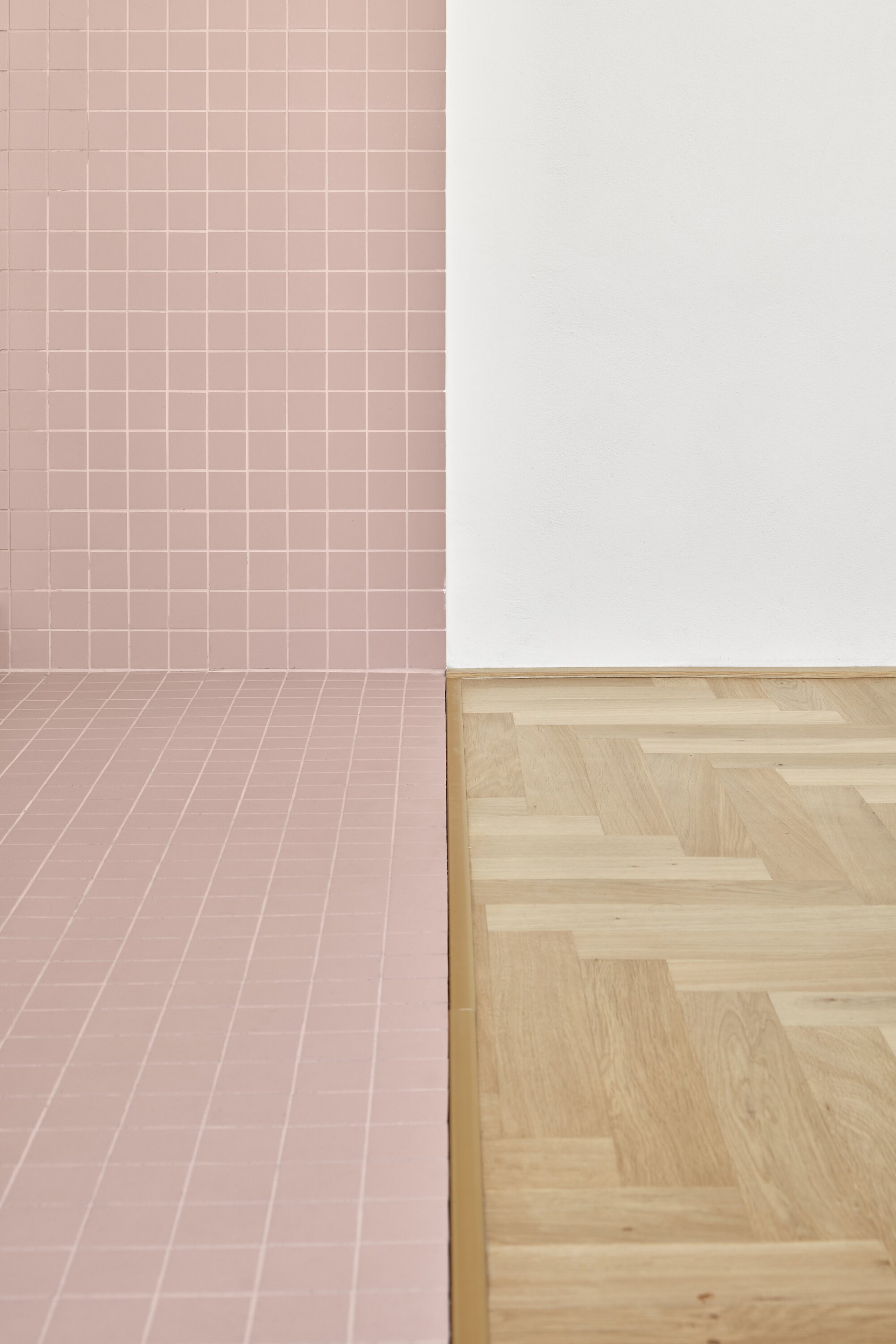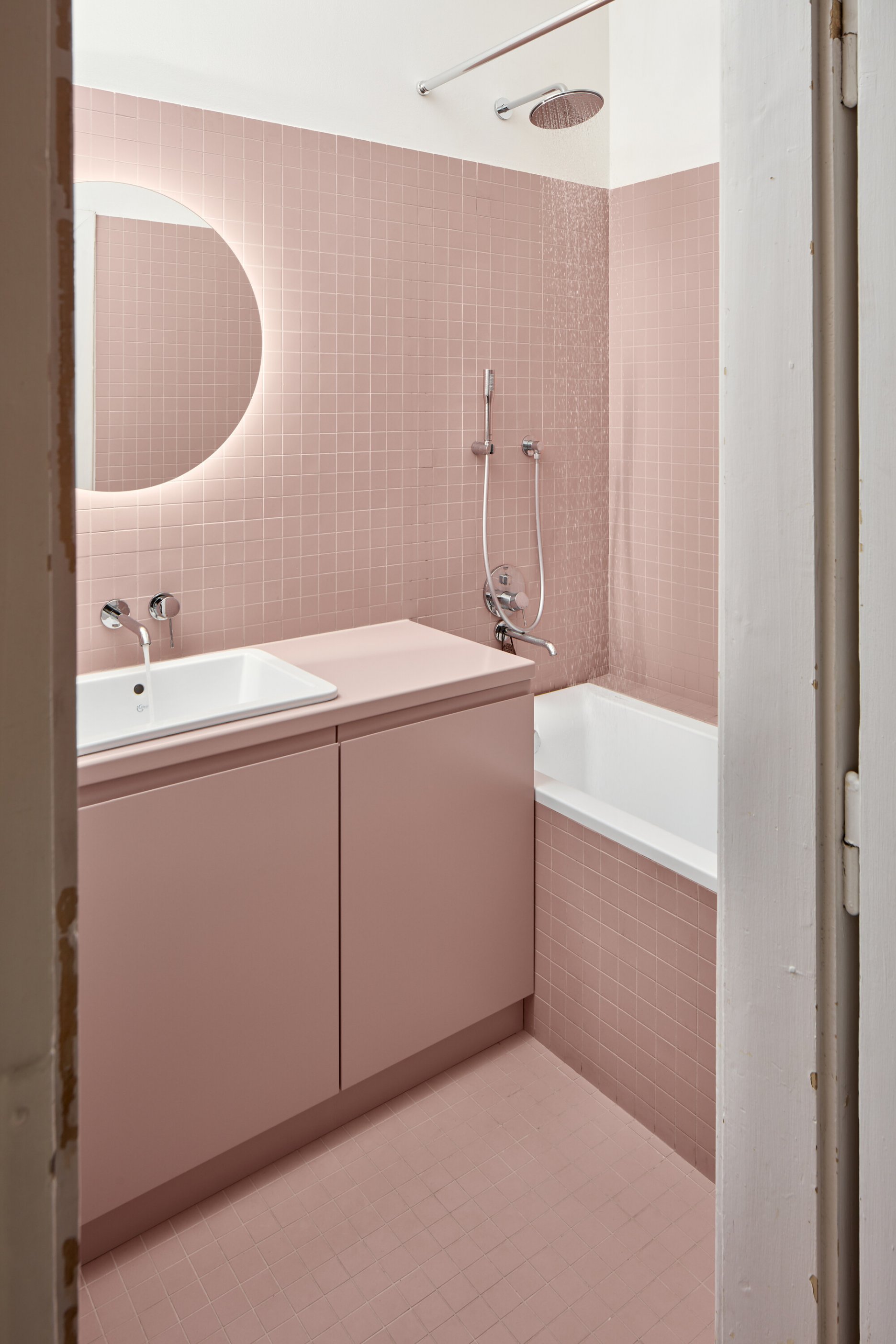 Dialóg obytnej a obslužnej zóny bytu je podčiarknutý použitými materiálmi a ich jednoznačnou farebnosťou. Kúpeľňu, kuchyňu, toaletu a chodbu definuje ružová farba nábytku, dlažby a obkladu. Úložné priestory a predovšetkým multifunkčná platforma sú vyrobené z brezovej preglejky. Výslednú kompozíciu zjemňujú kruhové svietidlá a zrkadlá.