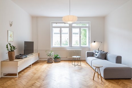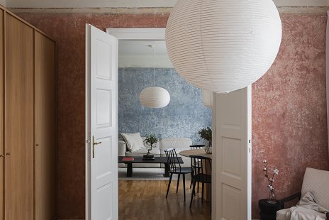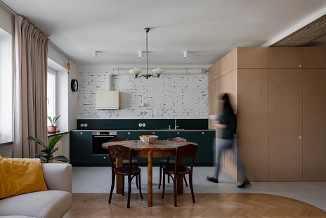 Dispozícia zostala zachovaná, búracie práce sa v tomto prípade nekonali. Pôvodné výplne dverí a parkety kladené do stromčekového vzoru boli zachované, remeselne zrekonštruované. Najvýraznejším prvkom v hlavnom obytnom priestore je stena s odhalenými vrstvami starej omietky. Zaujímavá textúra sa odkryla pri odstraňovaní novodobých nánosov, autori sa ju rozhodli zachovať ako odkaz na historickú podobu bytu.