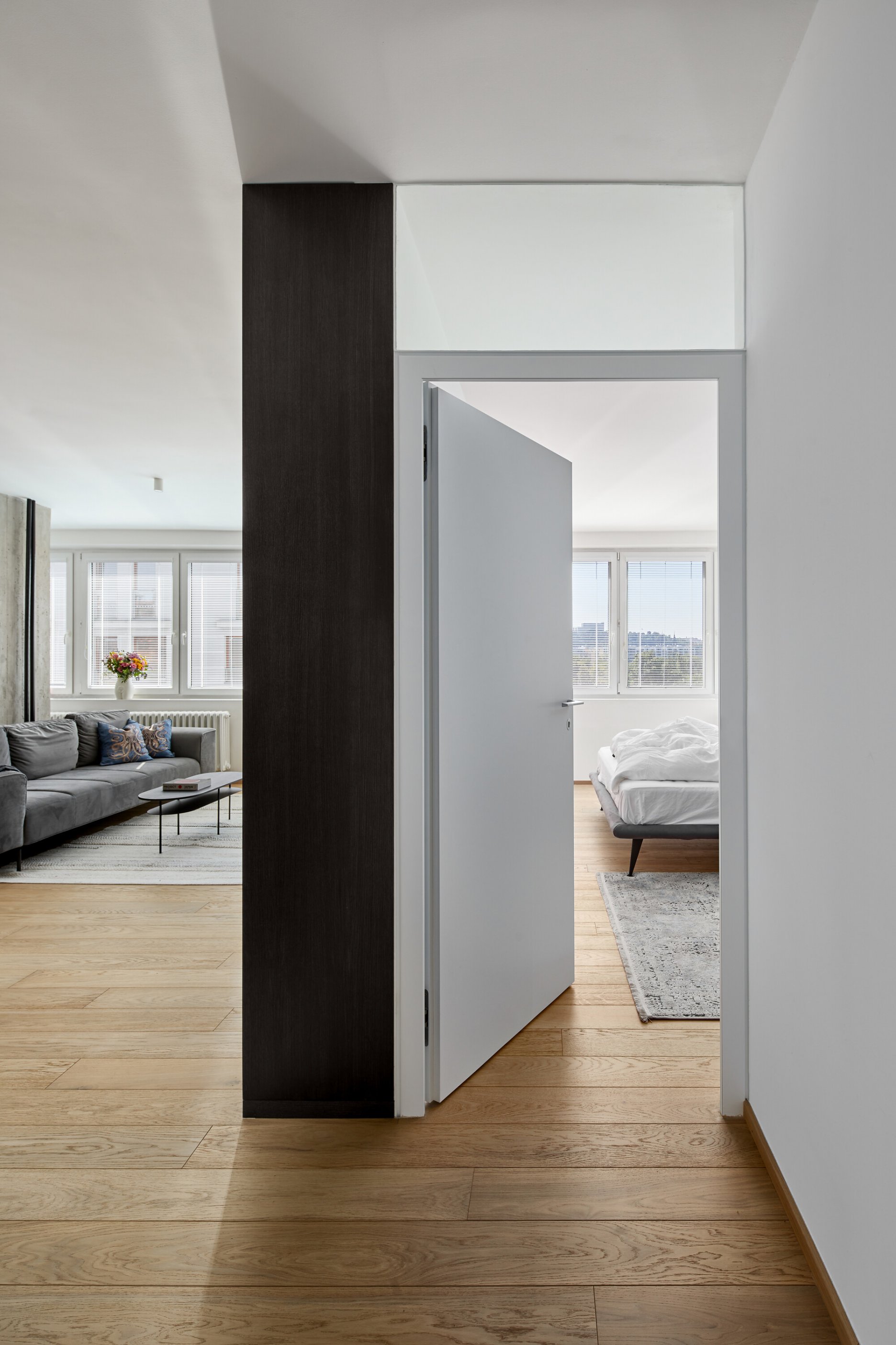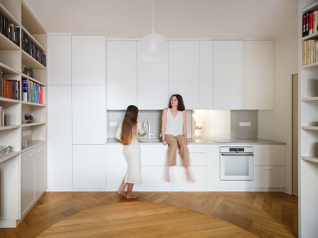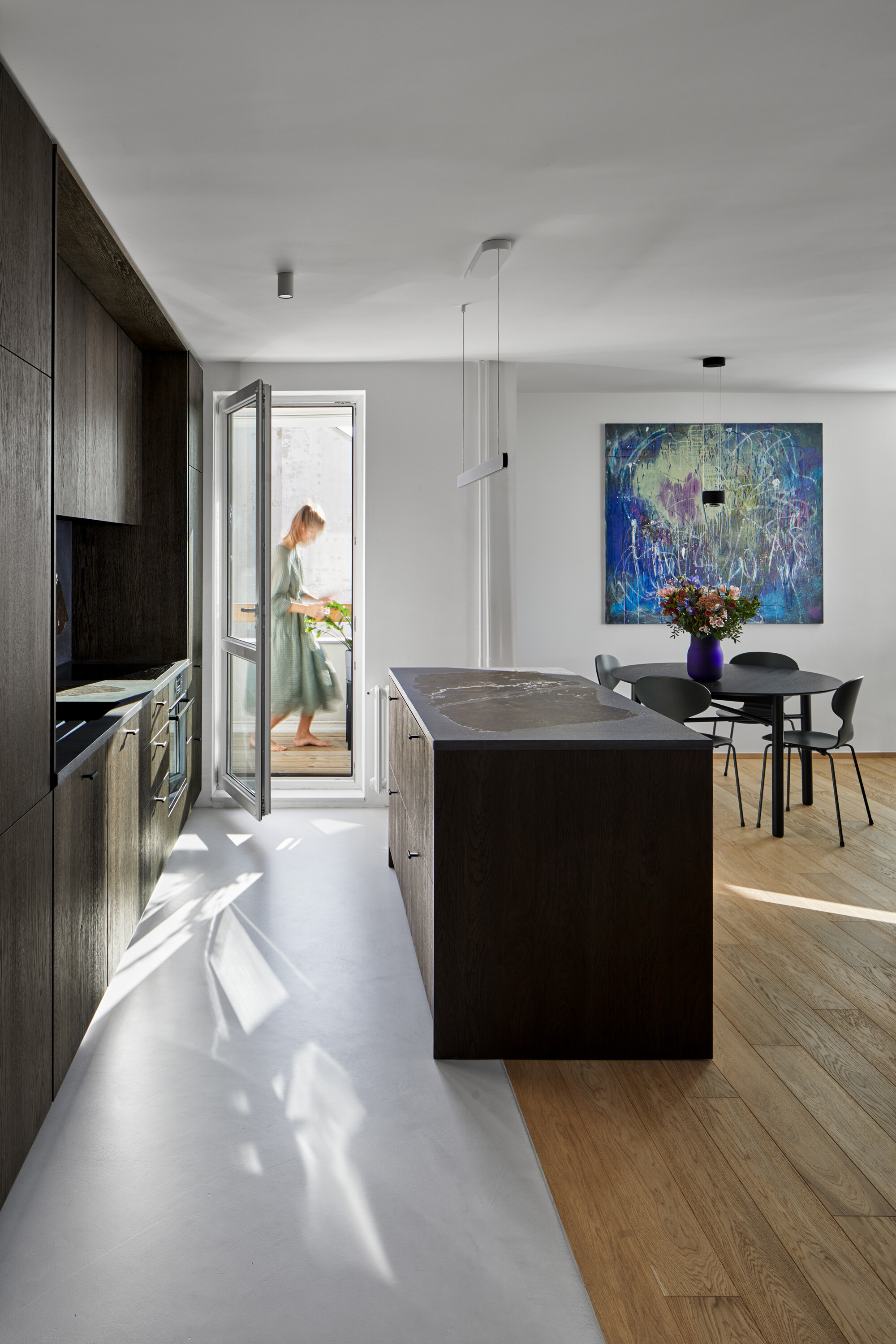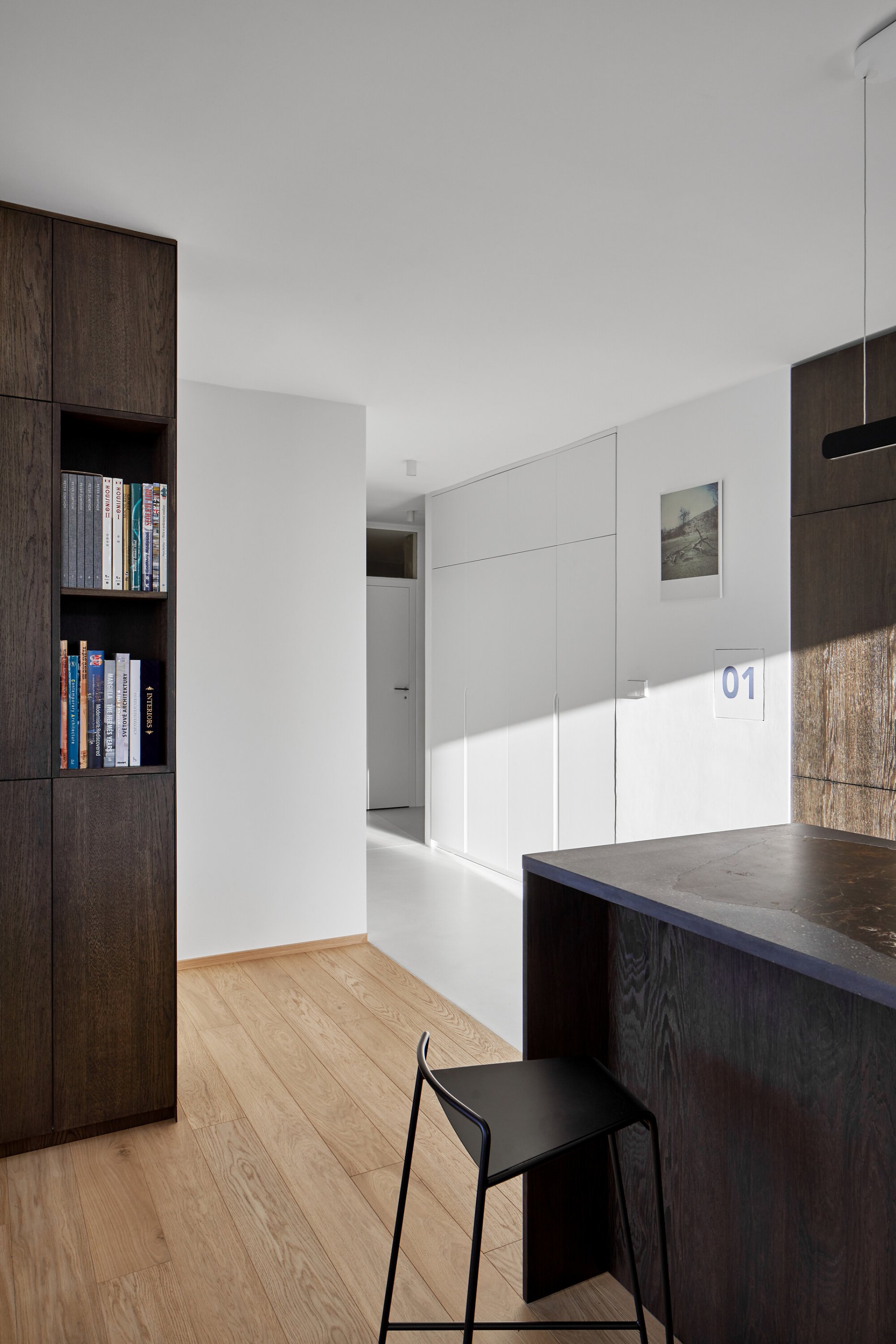 Dennú aj nočnú zónu prepája jednotná dubová podlaha a stierka. Drevenú palubovku zvolili architektky pre priestory spálne a obývacej izby. Stierka prechádza pod kuchynským ostrovčekom - pomyselne sa tak oddeľuje obývacia časť bytu od technického a komunikačného zázemia.
