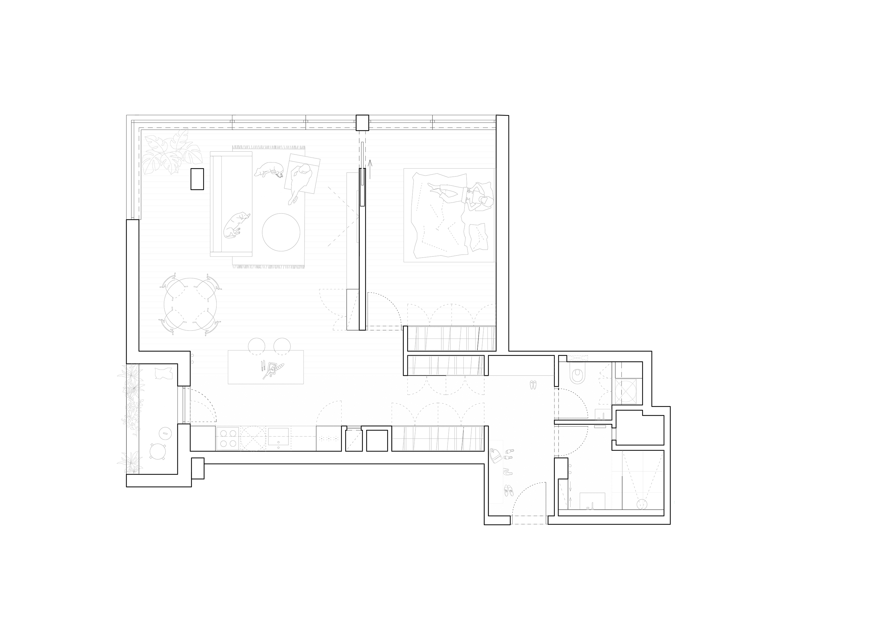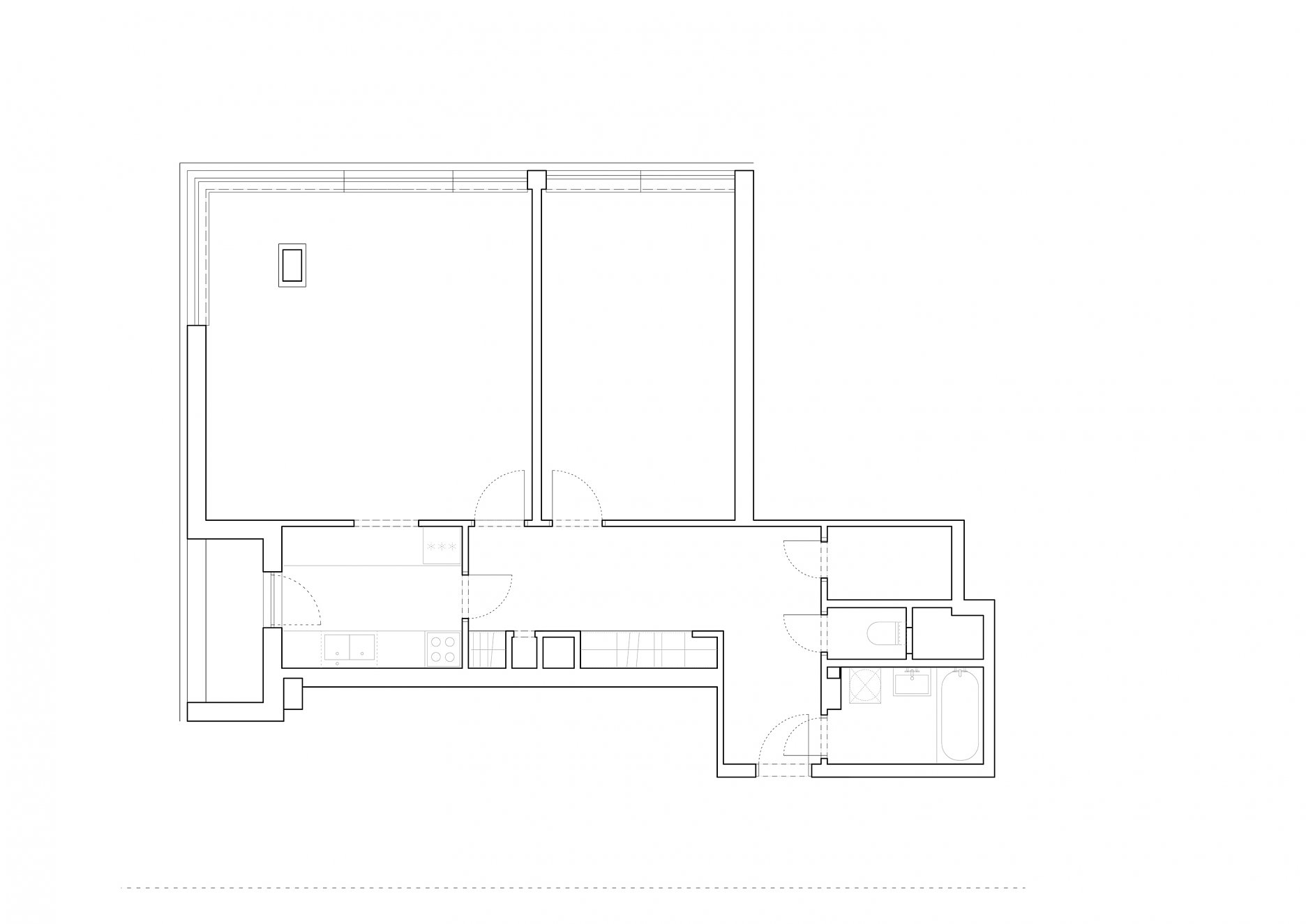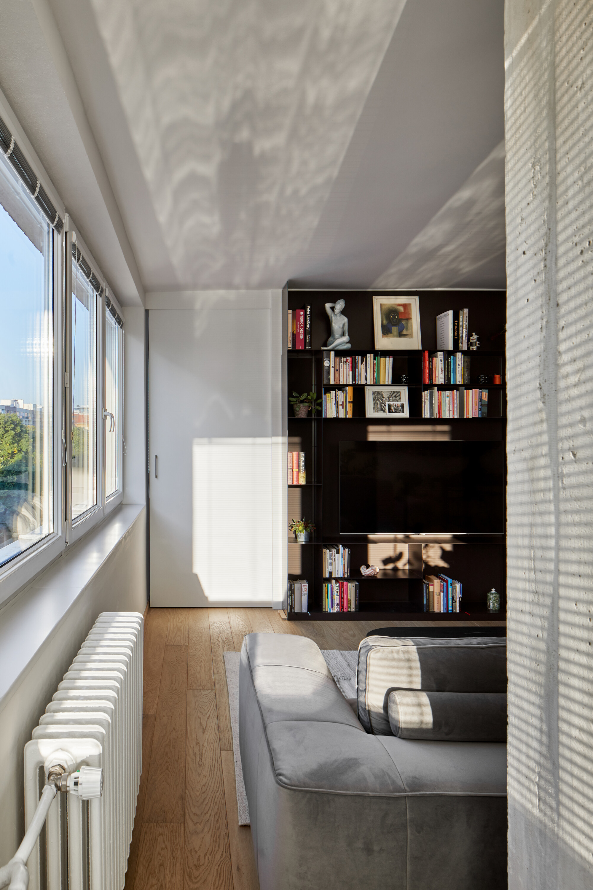 Otvorená denná časť bytu, spojená po novom s kuchyňou a zádverím, vedie svetlo aj do pôvodne tmavého priestoru zádveria. K presvetleniu interiéru prispievajú tiež sklenené svetlíky nad všetkými dverami, vrátane tých do kúpeľne a toalety.