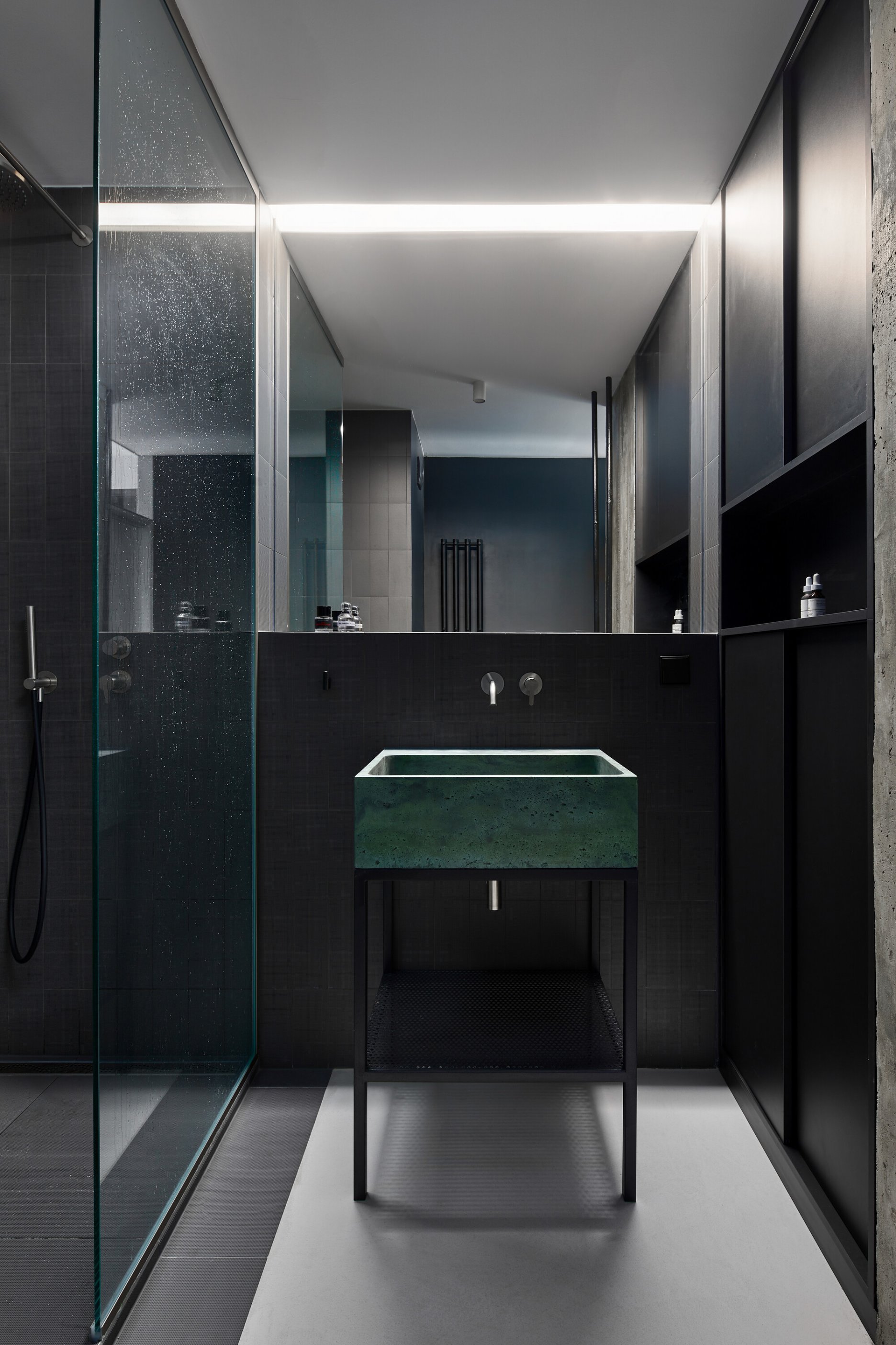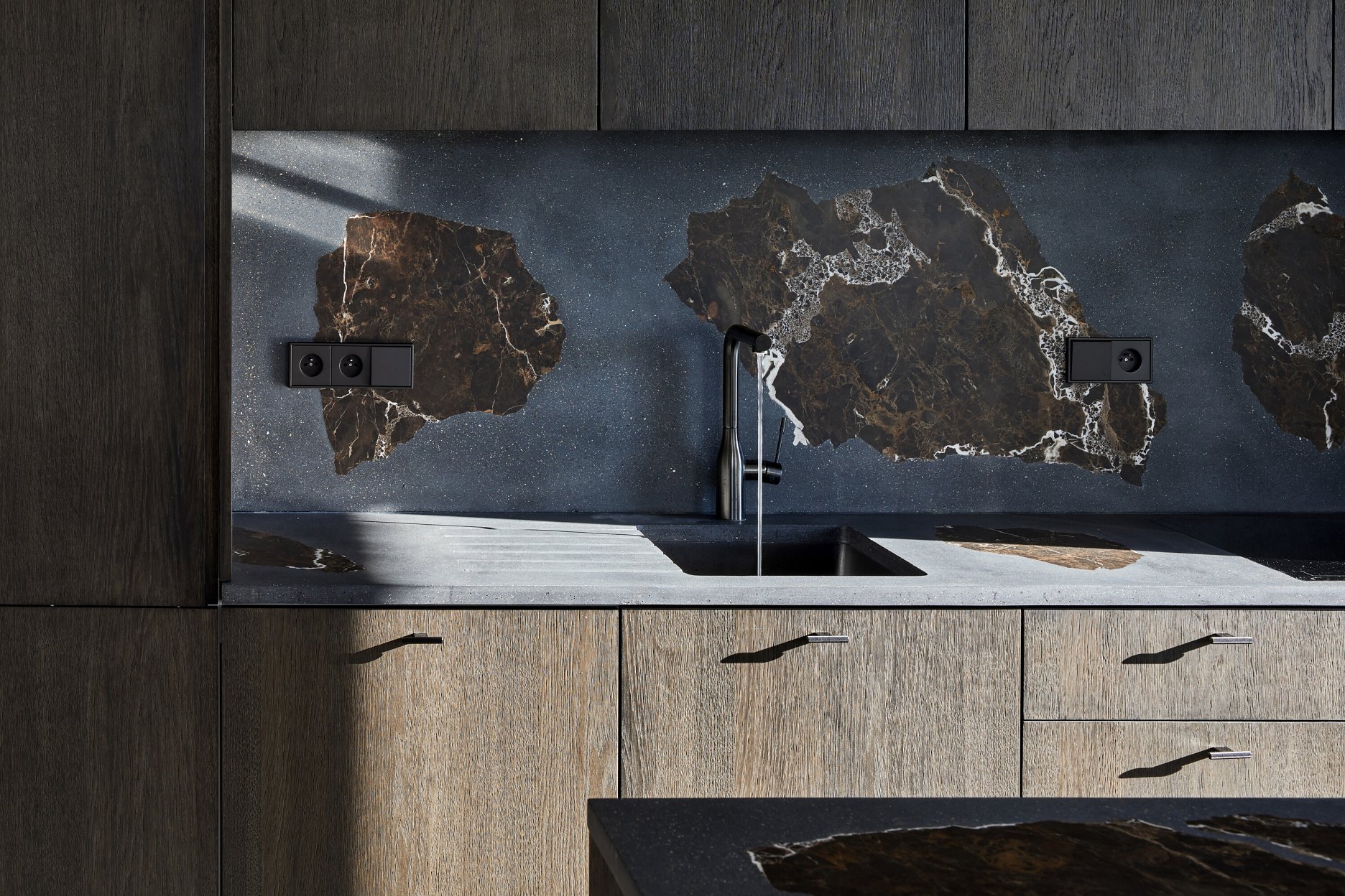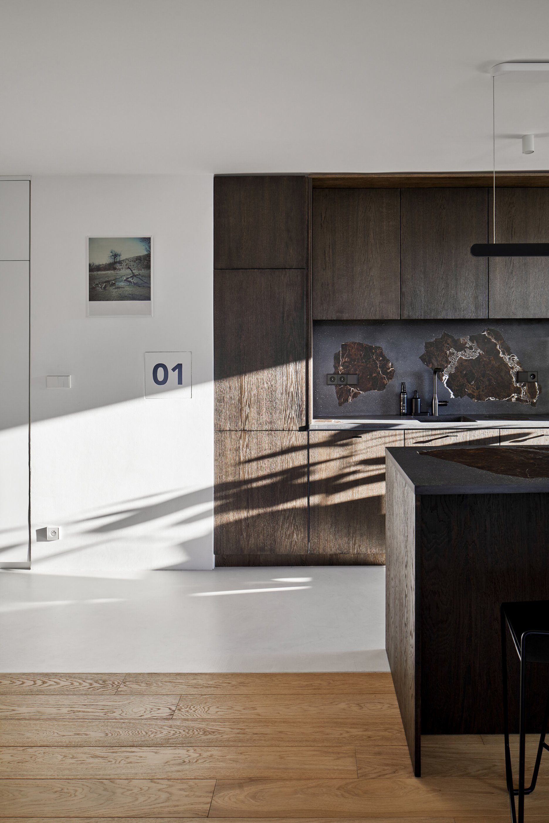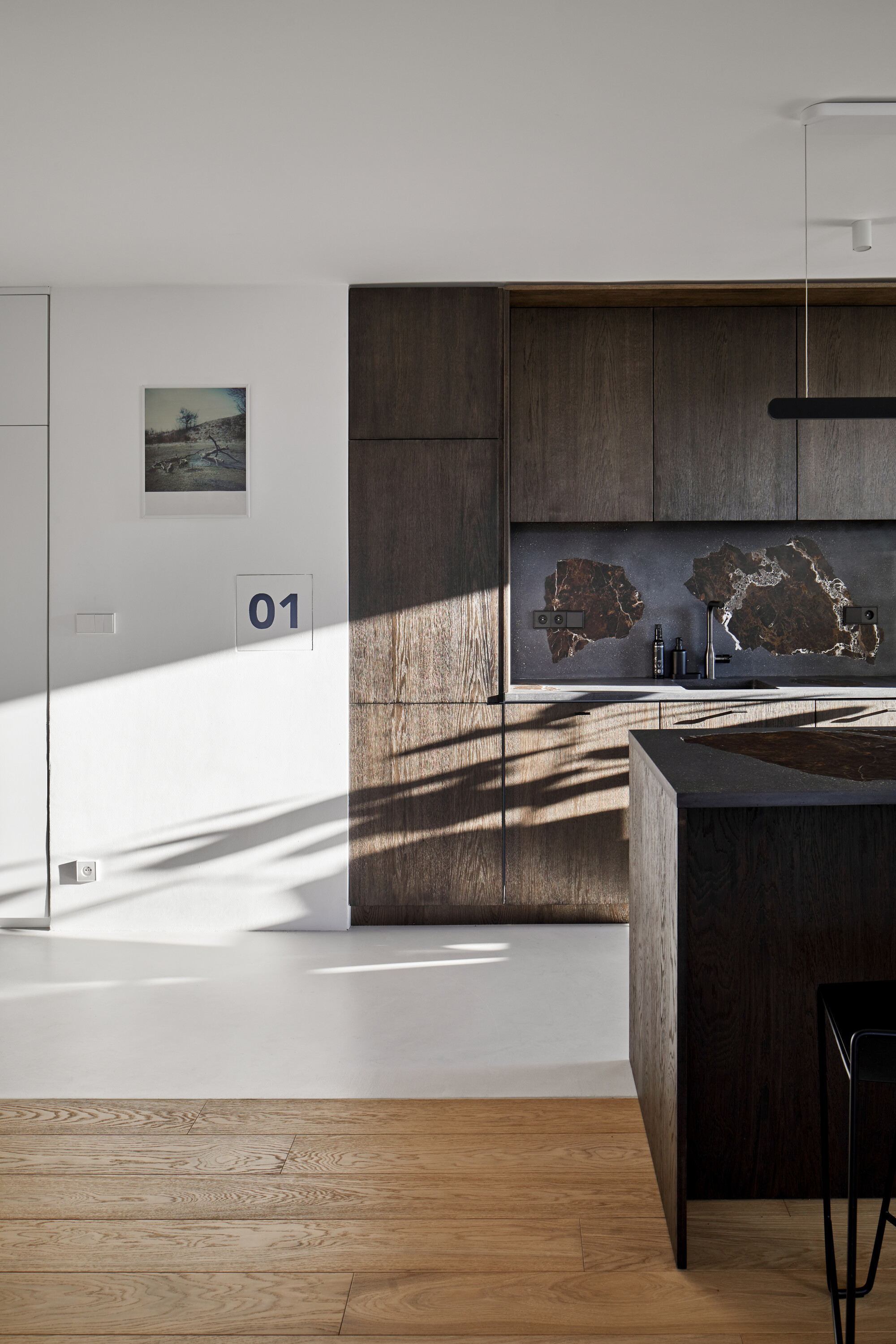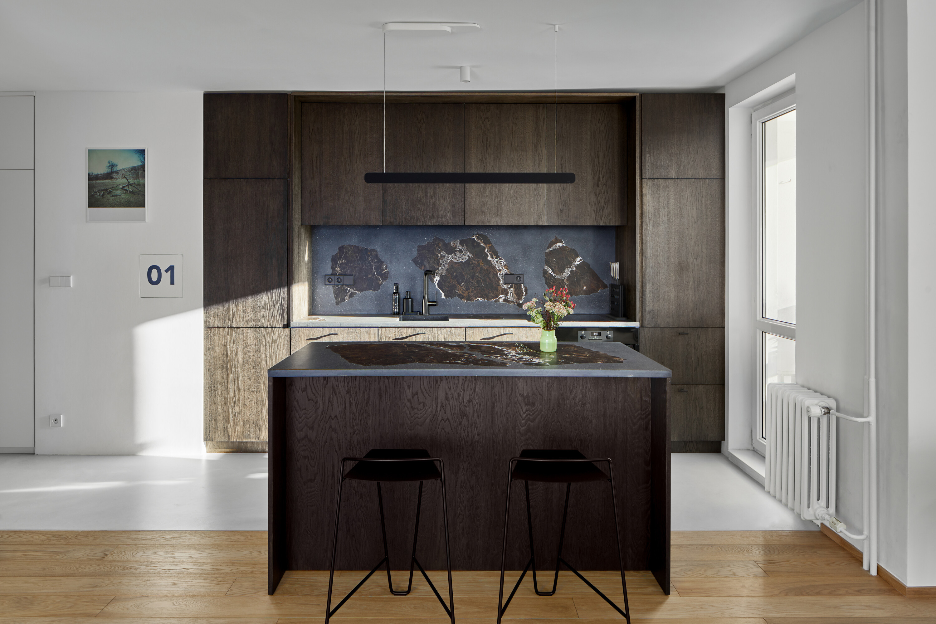Dominantu obytnej miestnosti tvorí kuchyňa, ktorá definuje jadro celého bytu. Spomínanú tmavú dyhu dopĺňa betónová pracovná doska a zástena so zaliatymi kusmi kameňa v hnedých odtieňoch. Rovnaká materiálová skladba charakterizuje aj kuchynský ostrovček.