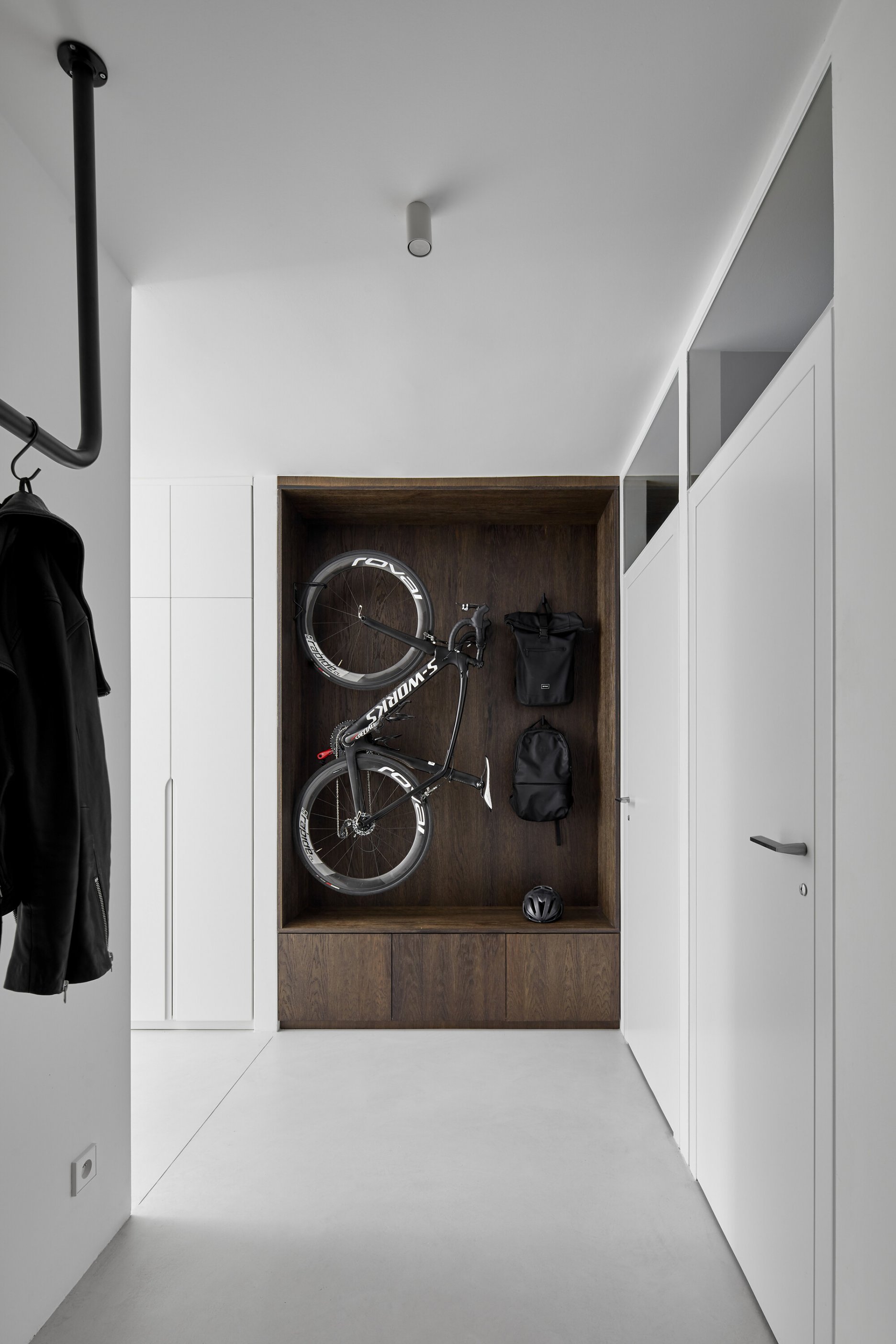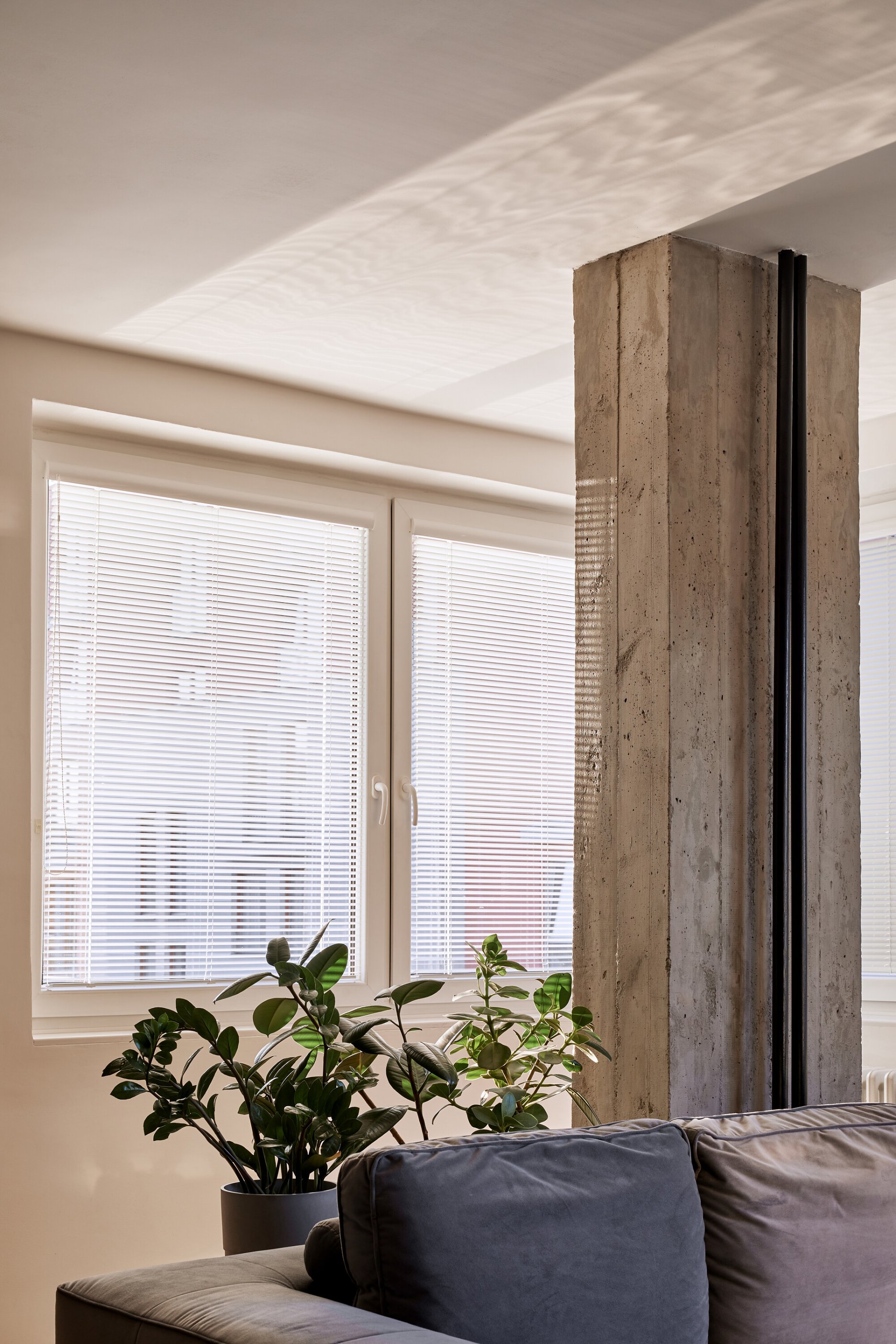 Architektky Petra Ciencialová a Kateřina Průchová v obývacej izbe a kúpeľni obnažili betónové stĺpy, tvoriace nosnú časť konštrukcie domu. Na prianie investora ďalej rozšírili kúpeľňu na úkor pôvodnej technickej miestnosti a šatníka, pričom úložné priestory nahradili sadou vstavaných skríň v chodbe.