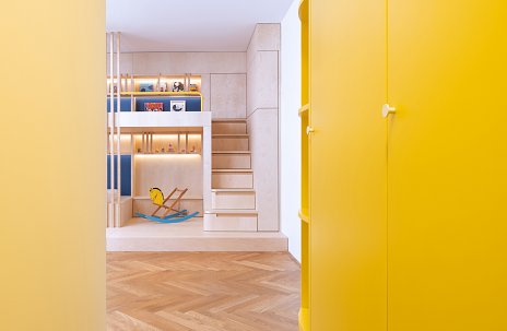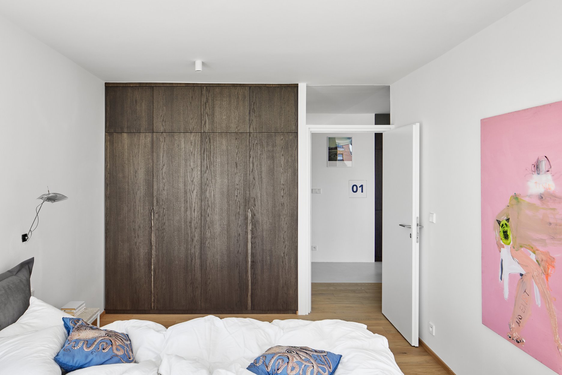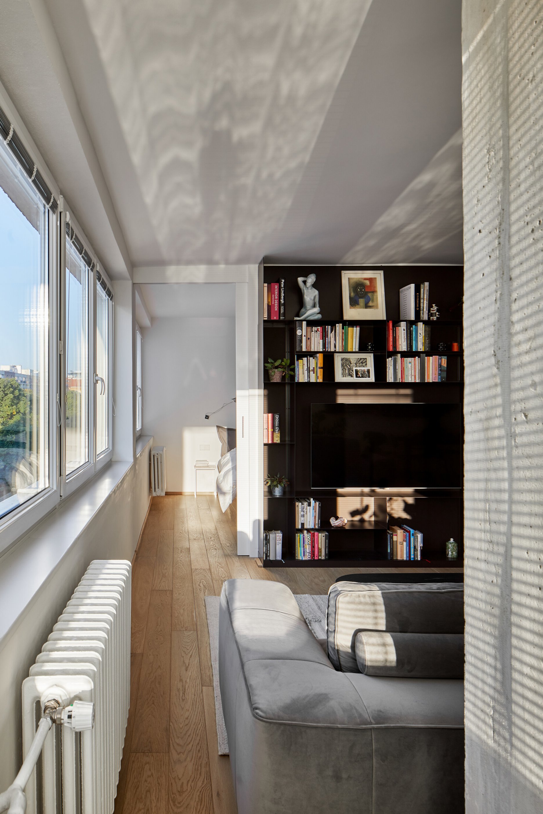 Za jedným z charakteristických radov pásových okien sa nachádza byt s výmerou 73 m2, do ktorého prestavby sa pustili majitelia pod vedením pražského ateliéru Plus One Architects.