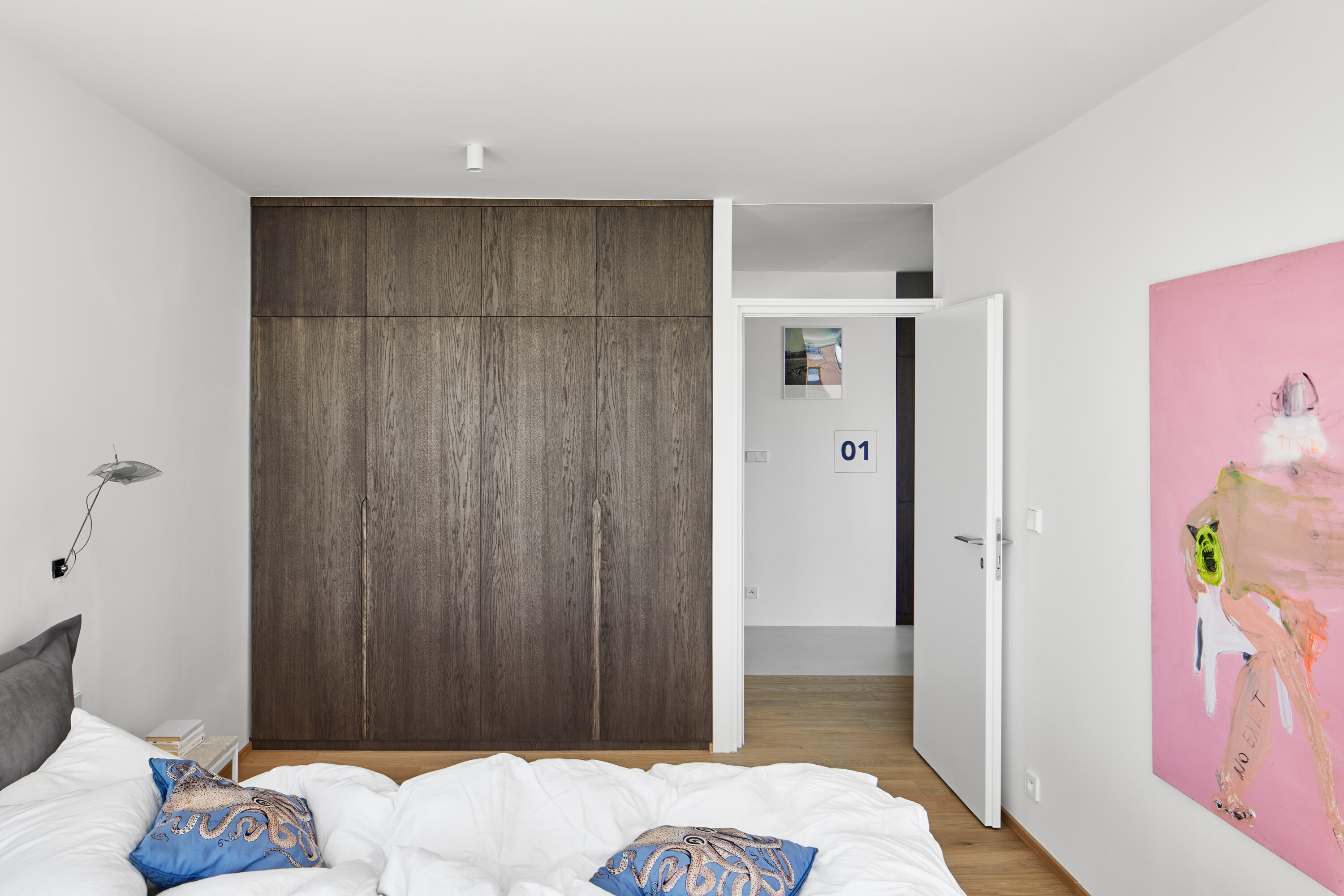 Celý priestor je vybavený nábytkom na mieru. Niekde nenápadným bielym, v exponovaných miestach naopak oplášteným výraznou tmavou dubovou dyhou.
