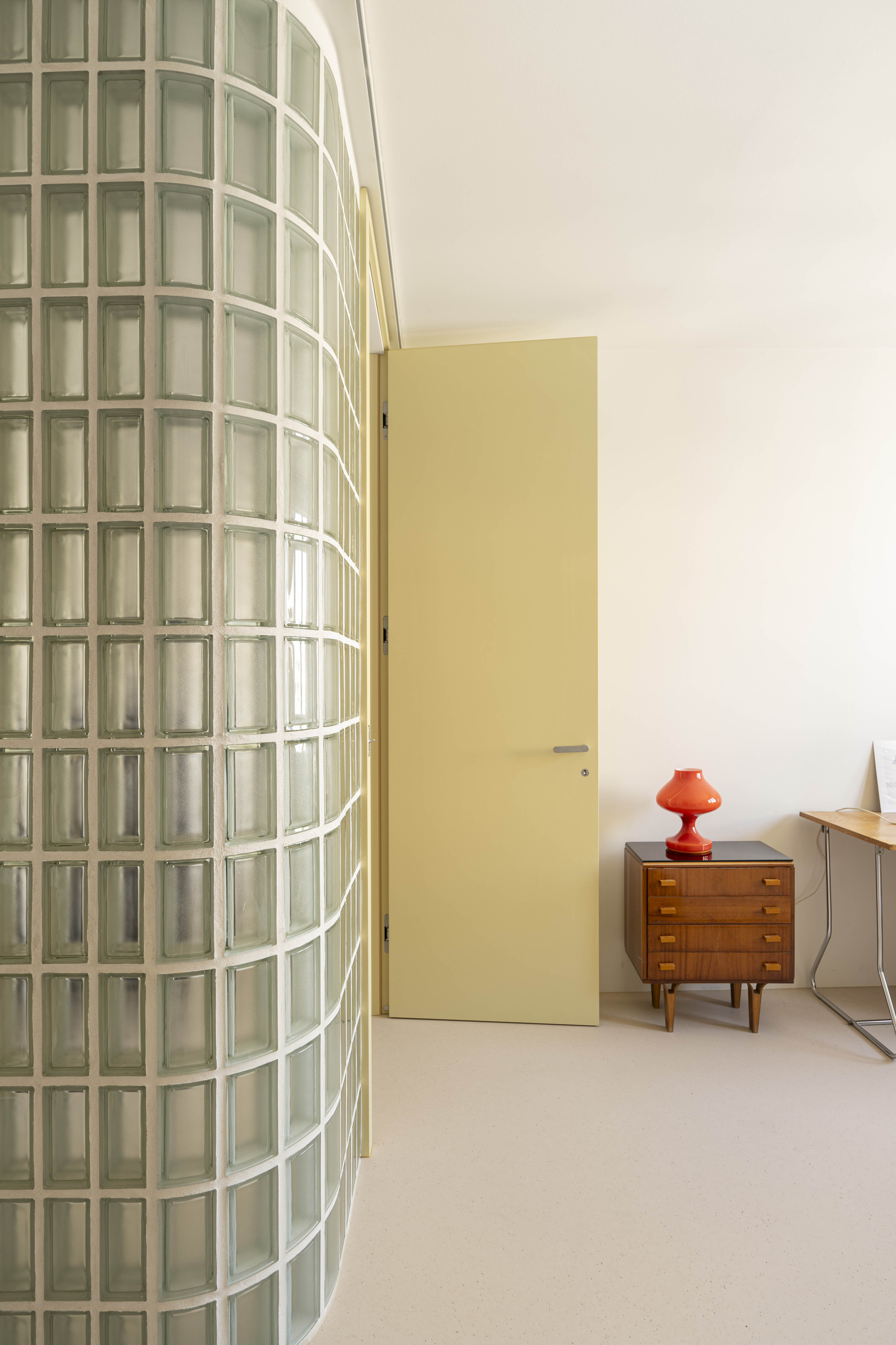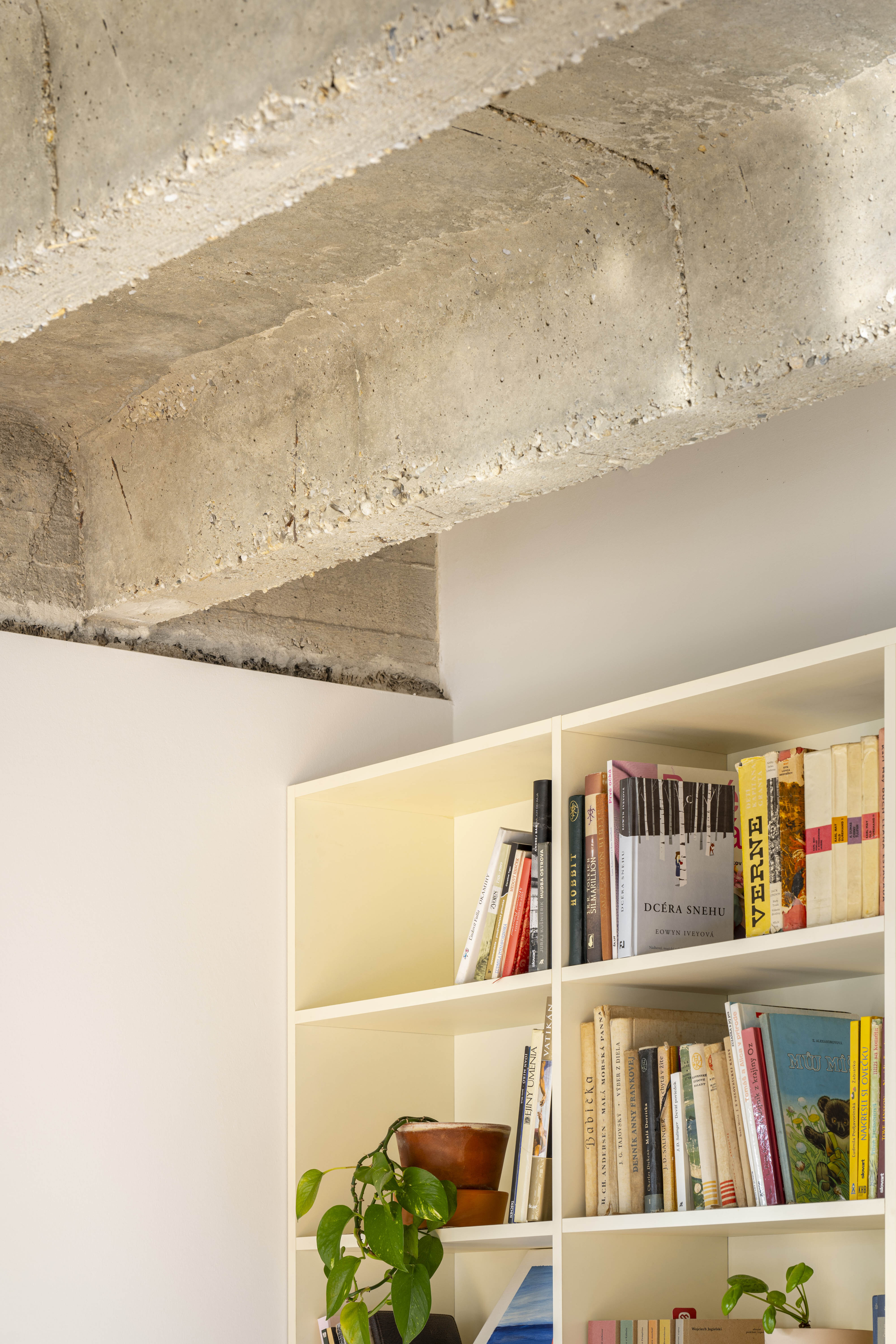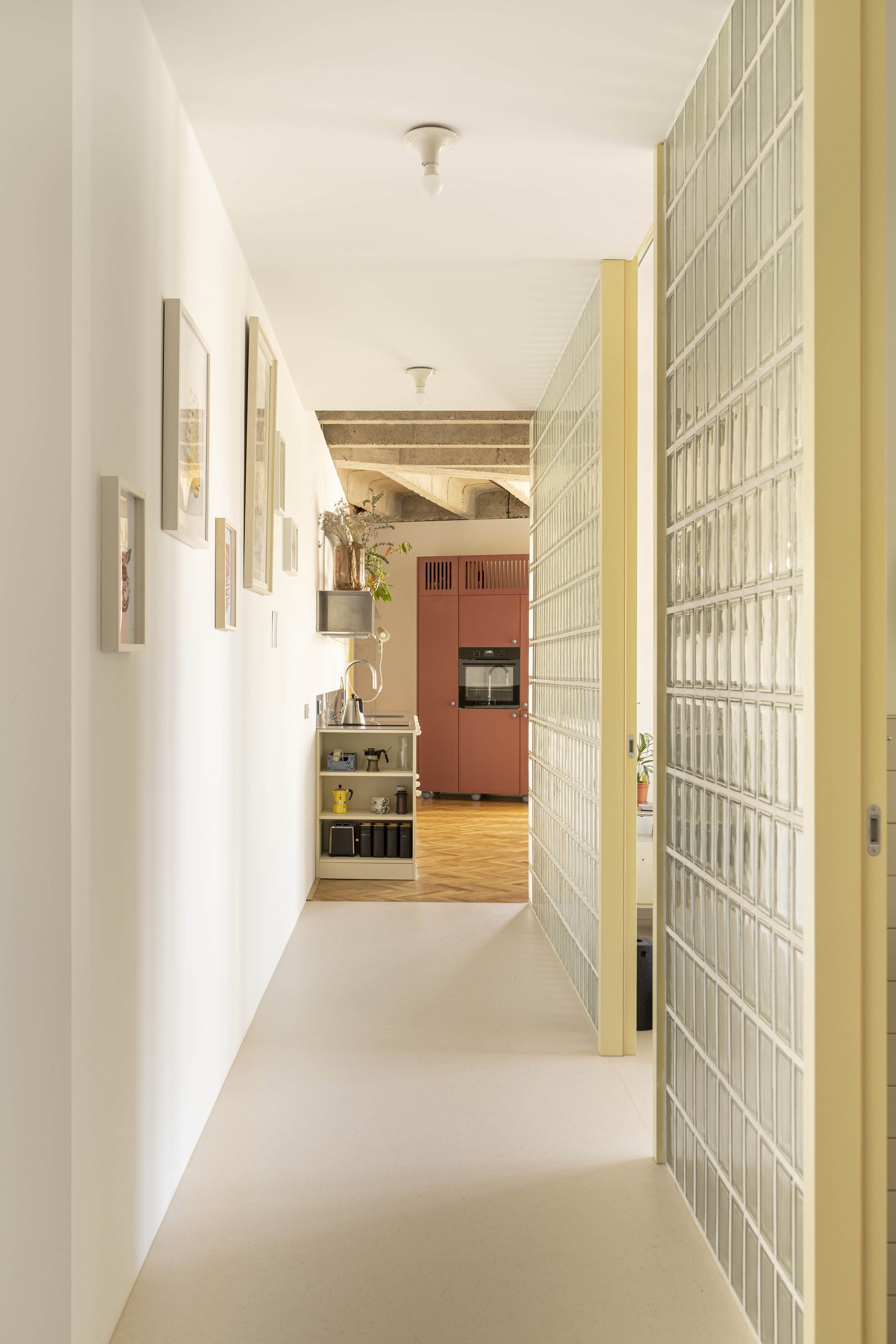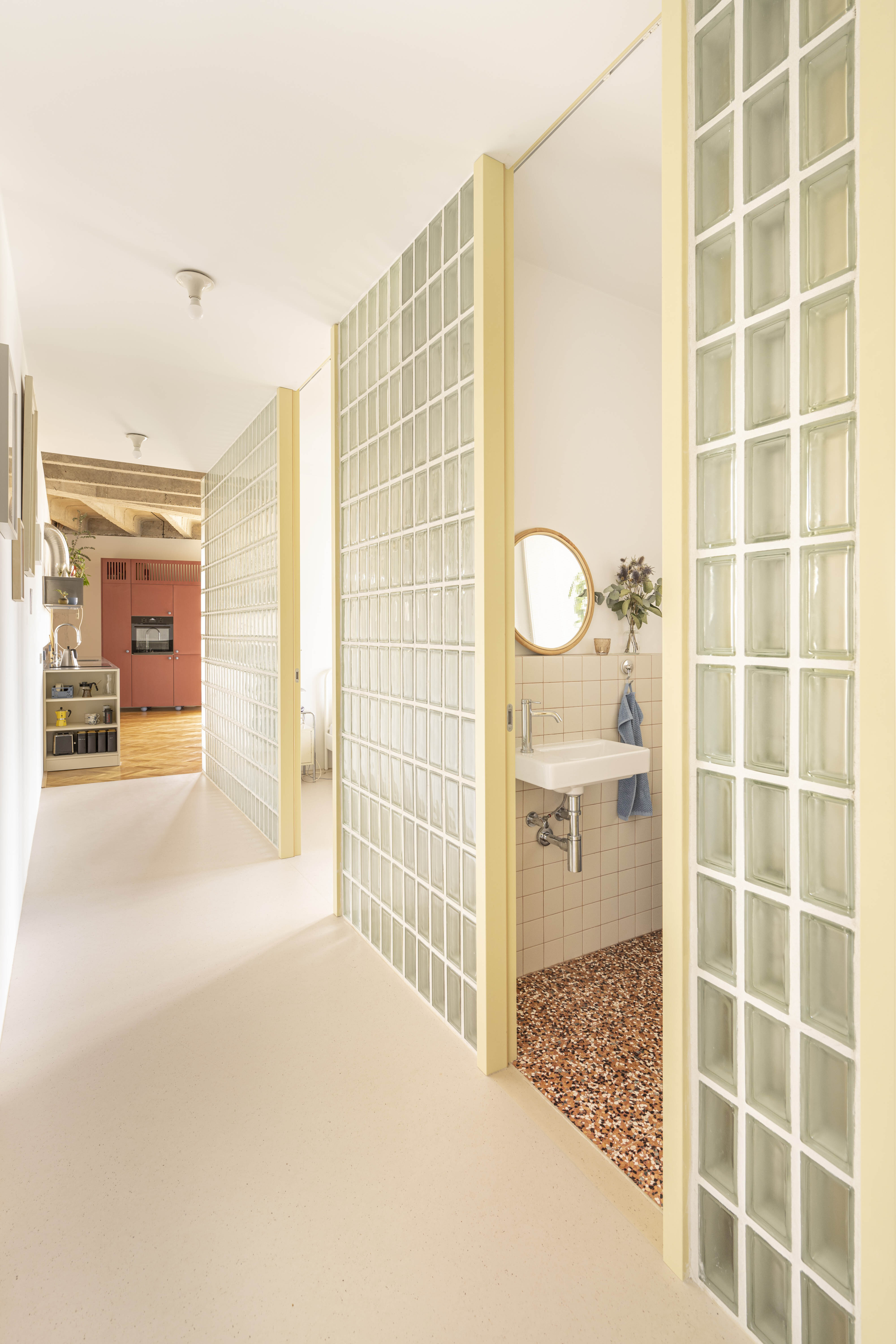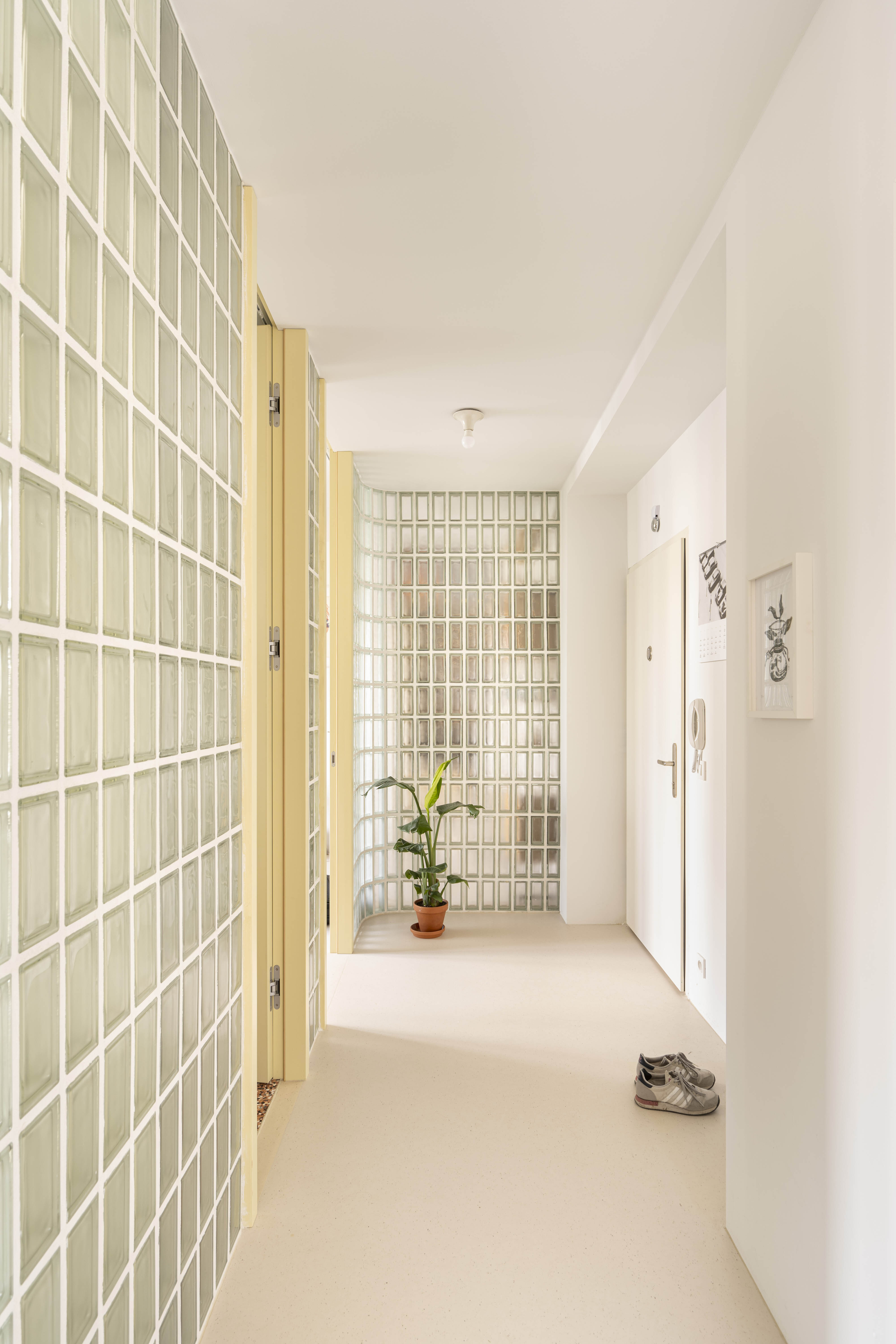 Keďže izby sú svetlé a ich hĺbka relatívne malá, priečka medzi izbami, toaletou a chodbou je z sklobetónu, čo zabezpečuje celodenné presvetlenie chodby a jej prípadné využitie ako „galerijného“ priestoru bytu. Pôvodné kastlíkové okná ostávajú zachované, čím podčiarkujú charakter bytu z 30. rokov. Ich jemne žltá farba sa objavuje aj na ďalších súčasných prvkoch v byte, čím sa moderný charakter prepája s pôvodnými detailmi. V procese rekonštrukcie sa v byte objavili mnohé vrstvy stavby, ktoré boli čiastočne alebo úplne odkryté – najmä na strope. Priestoru tento prístup dodal príjemnú surovosť a pravdivý detail.