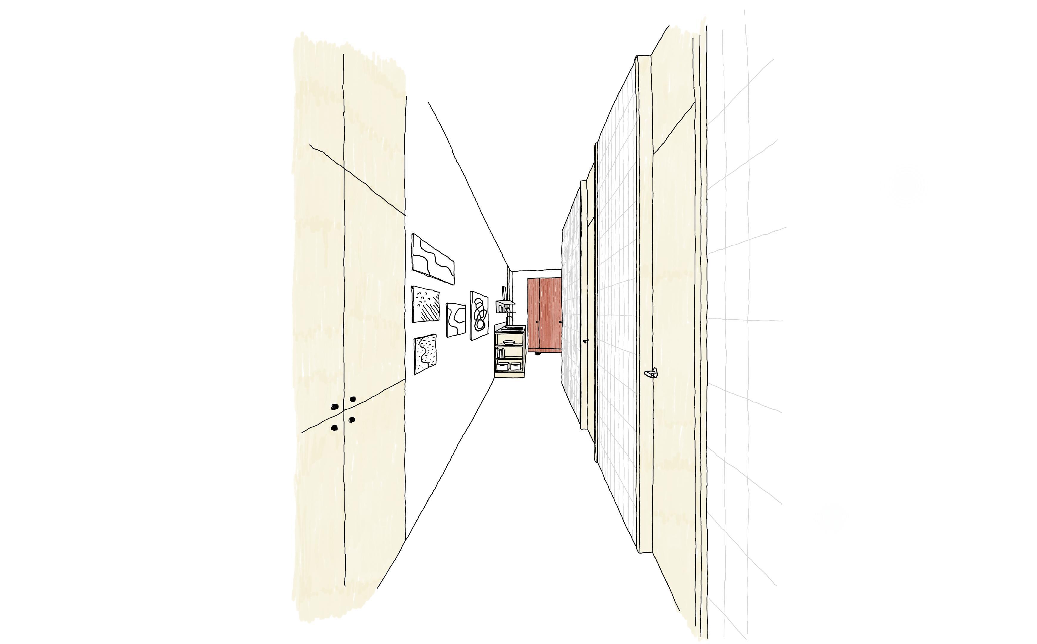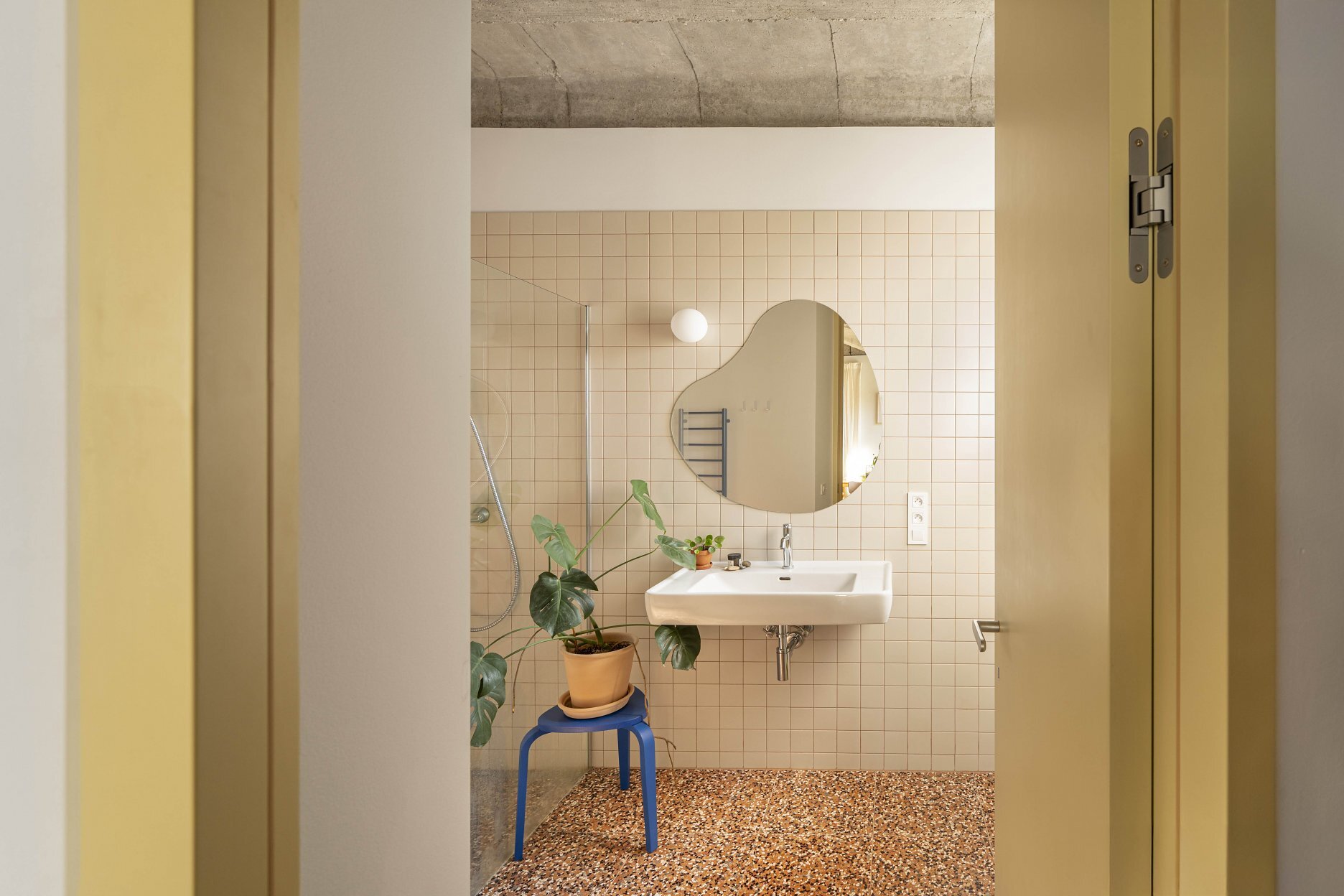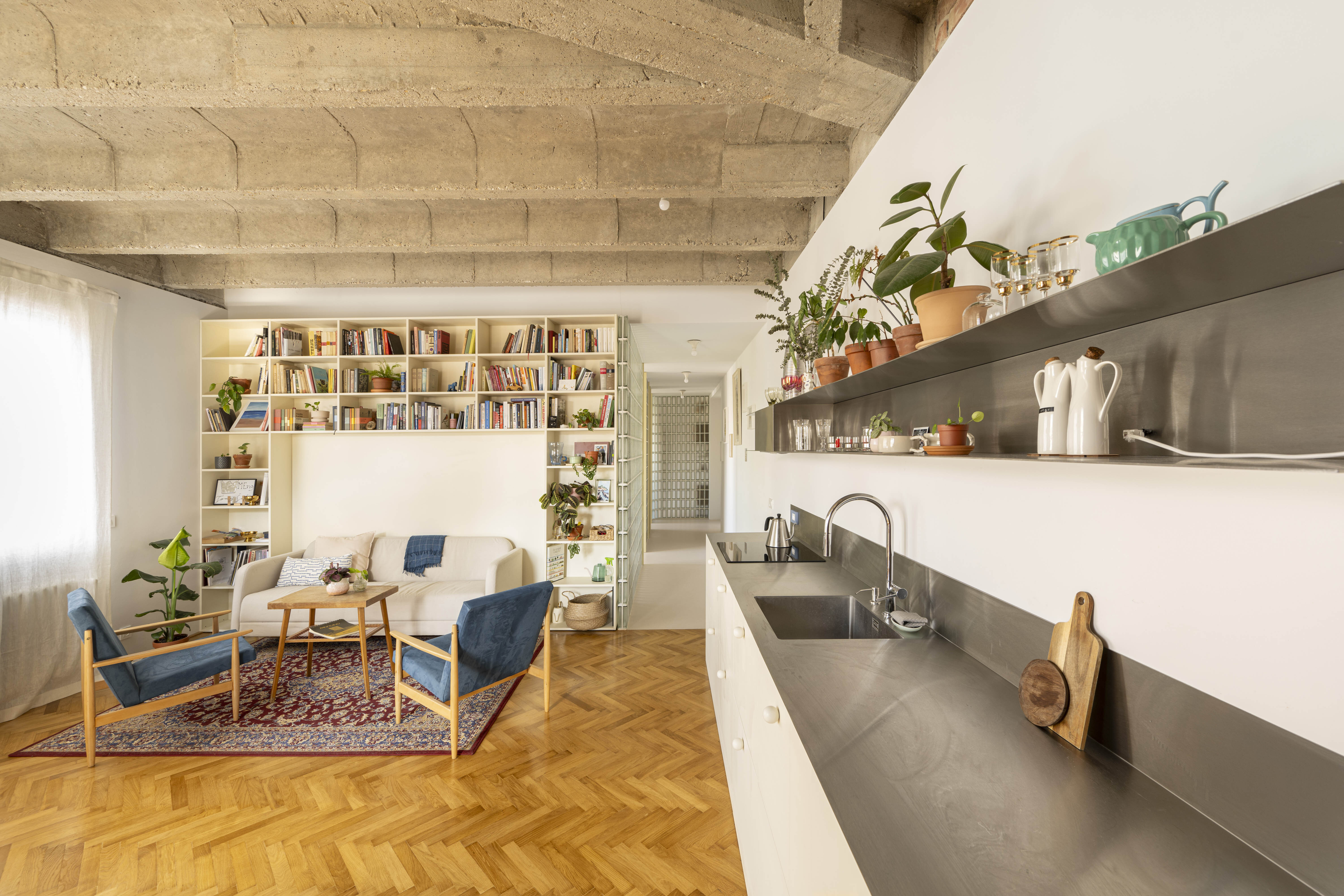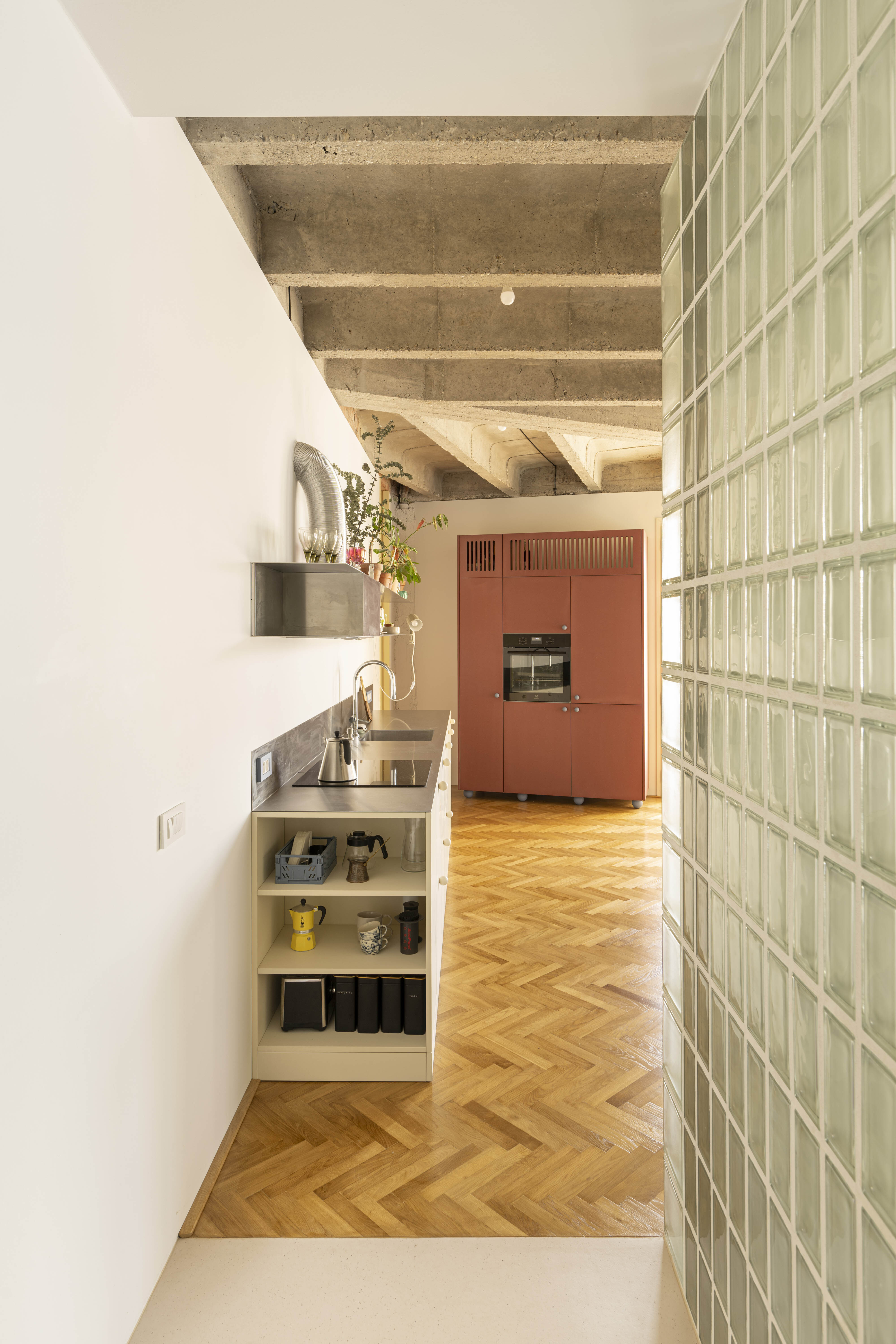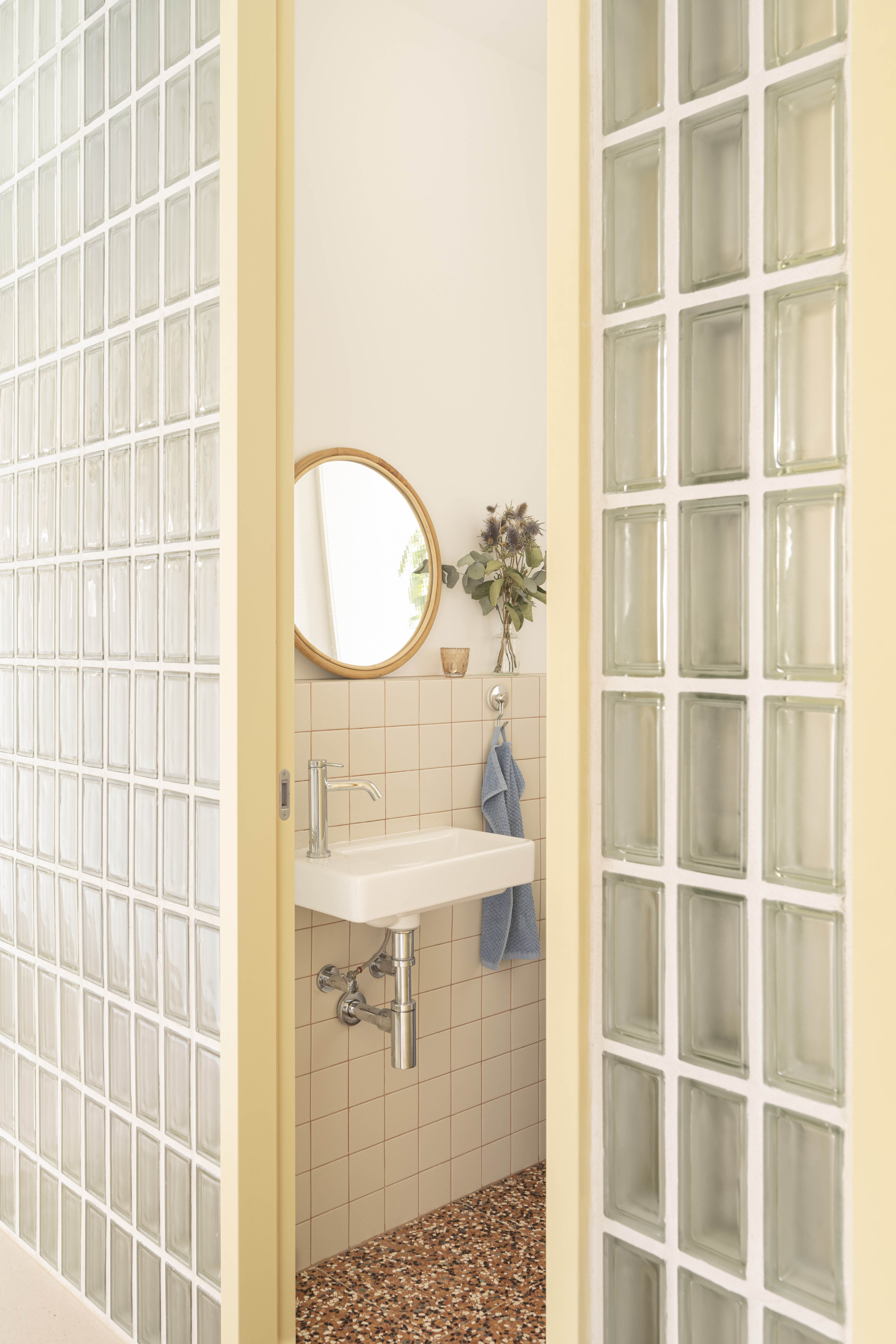 Keďže izby sú svetlé a ich hĺbka relatívne malá, priečka medzi izbami, toaletou a chodbou je z sklobetónu, čo zabezpečuje celodenné presvetlenie chodby a jej prípadné využitie ako „galerijného“ priestoru bytu. Pôvodné kastlíkové okná ostávajú zachované, čím podčiarkujú charakter bytu z 30. rokov. Ich jemne žltá farba sa objavuje aj na ďalších súčasných prvkoch v byte, čím sa moderný charakter prepája s pôvodnými detailmi. V procese rekonštrukcie sa v byte objavili mnohé vrstvy stavby, ktoré boli čiastočne alebo úplne odkryté – najmä na strope. Priestoru tento prístup dodal príjemnú surovosť a pravdivý detail.