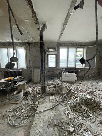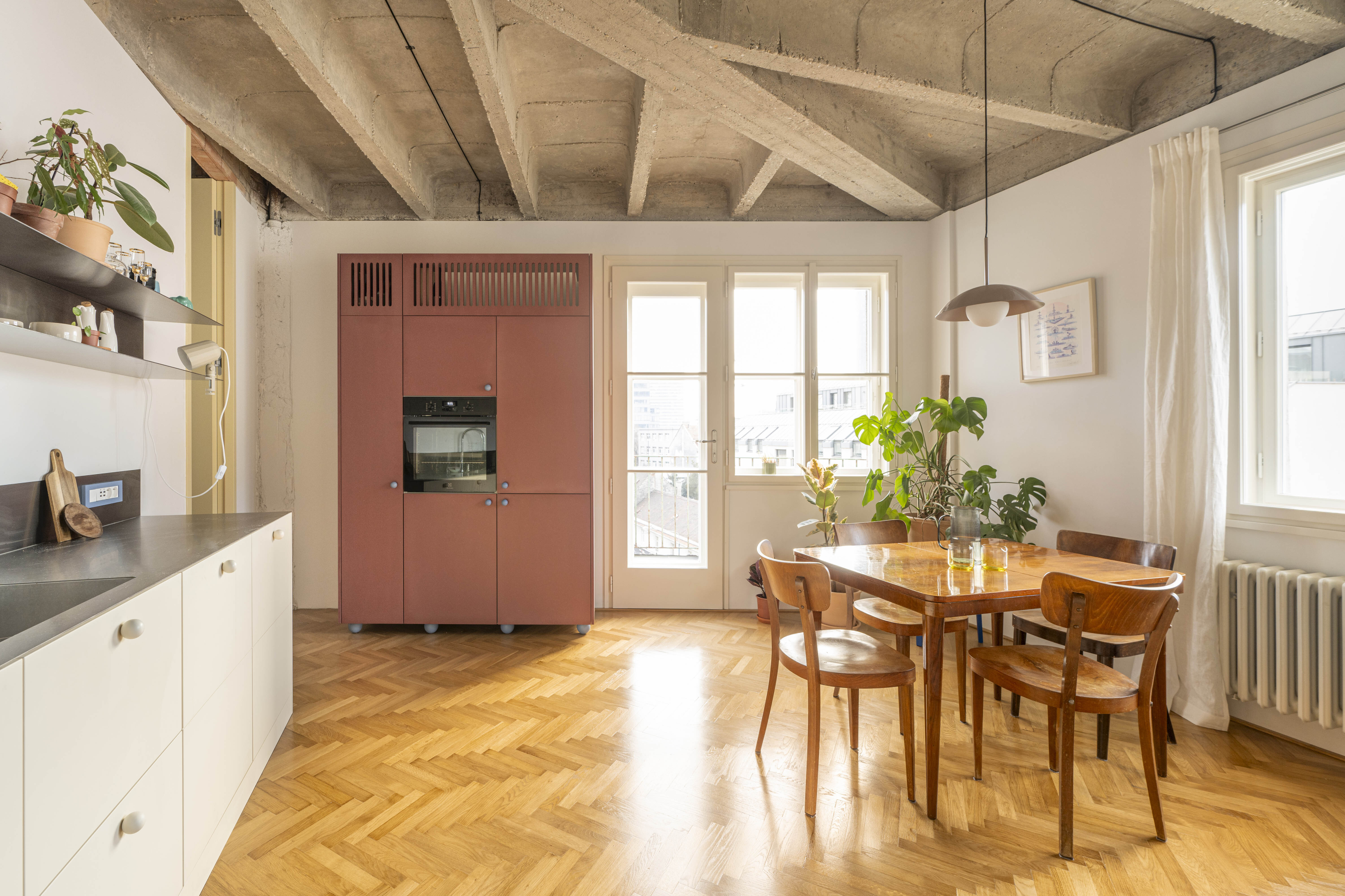 Prestavba staromestského bytu z dielne ateliéru diagram studio. Odkryté pôvodné vrstvy interiéru a ich hrubá materialita vytvárajú podklad pre nové precízne prvky zariadenia. Dominantné sklobetónové priečky vnášajú do interiéru otvorenosť a dynamickú hru s denným svetlom.
