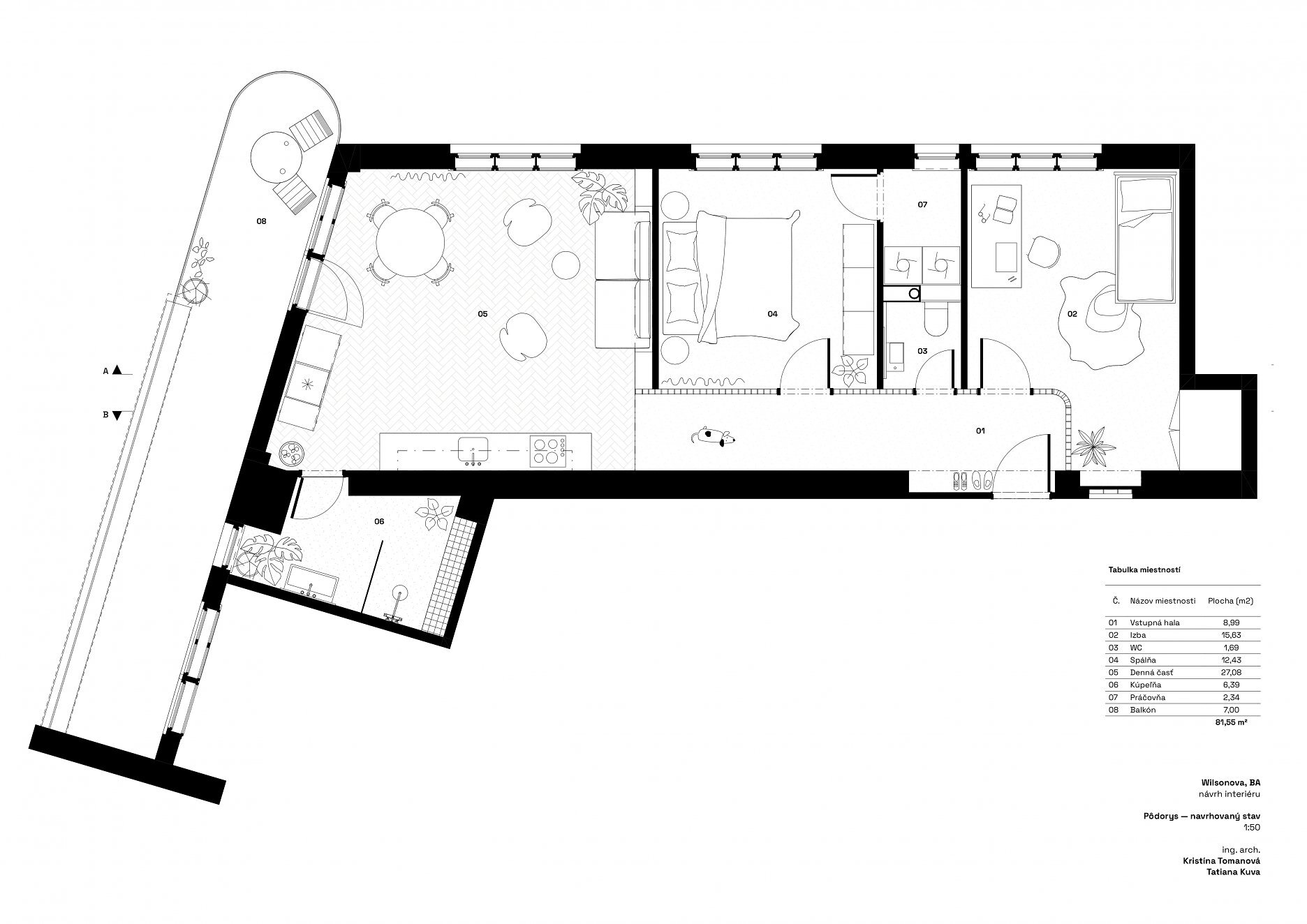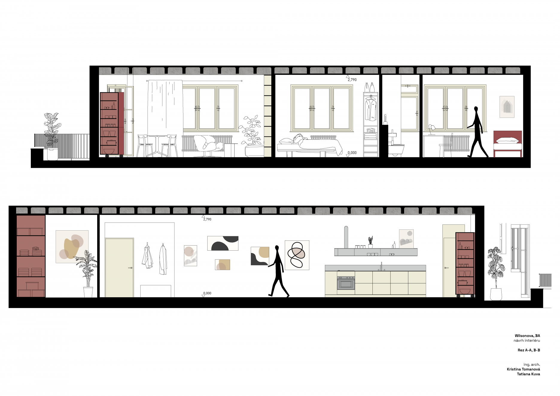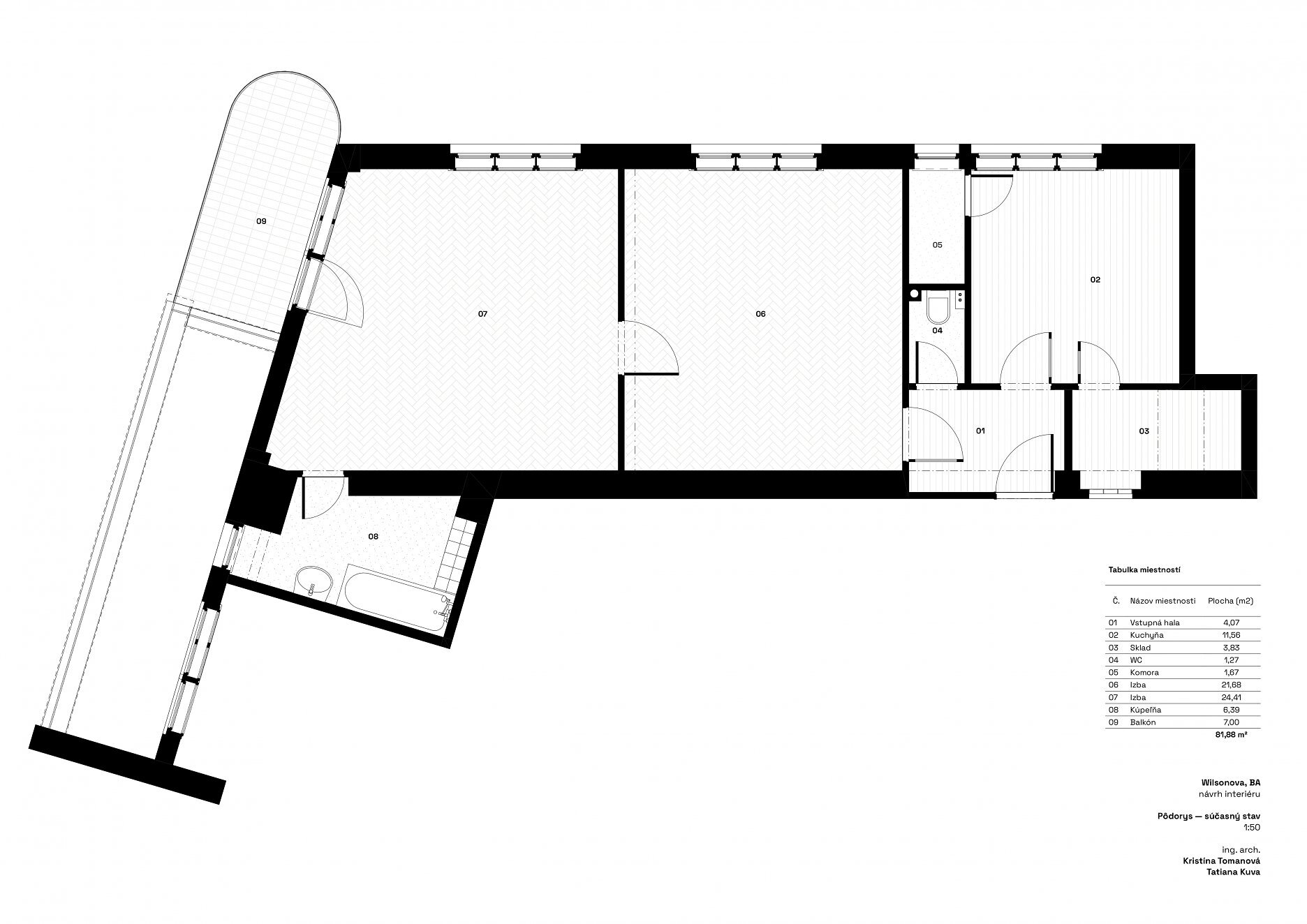Pôvodne dvojizbový byt na Wilsonovej ulici v Bratislave pozostával z veľkorysých prechodných izieb. Takéto usporiadanie však mladej rodine nevyhovovalo, navyše byt bol v neobývateľnom stave. Preto sa pristúpilo k úprave na trojizbový byt.