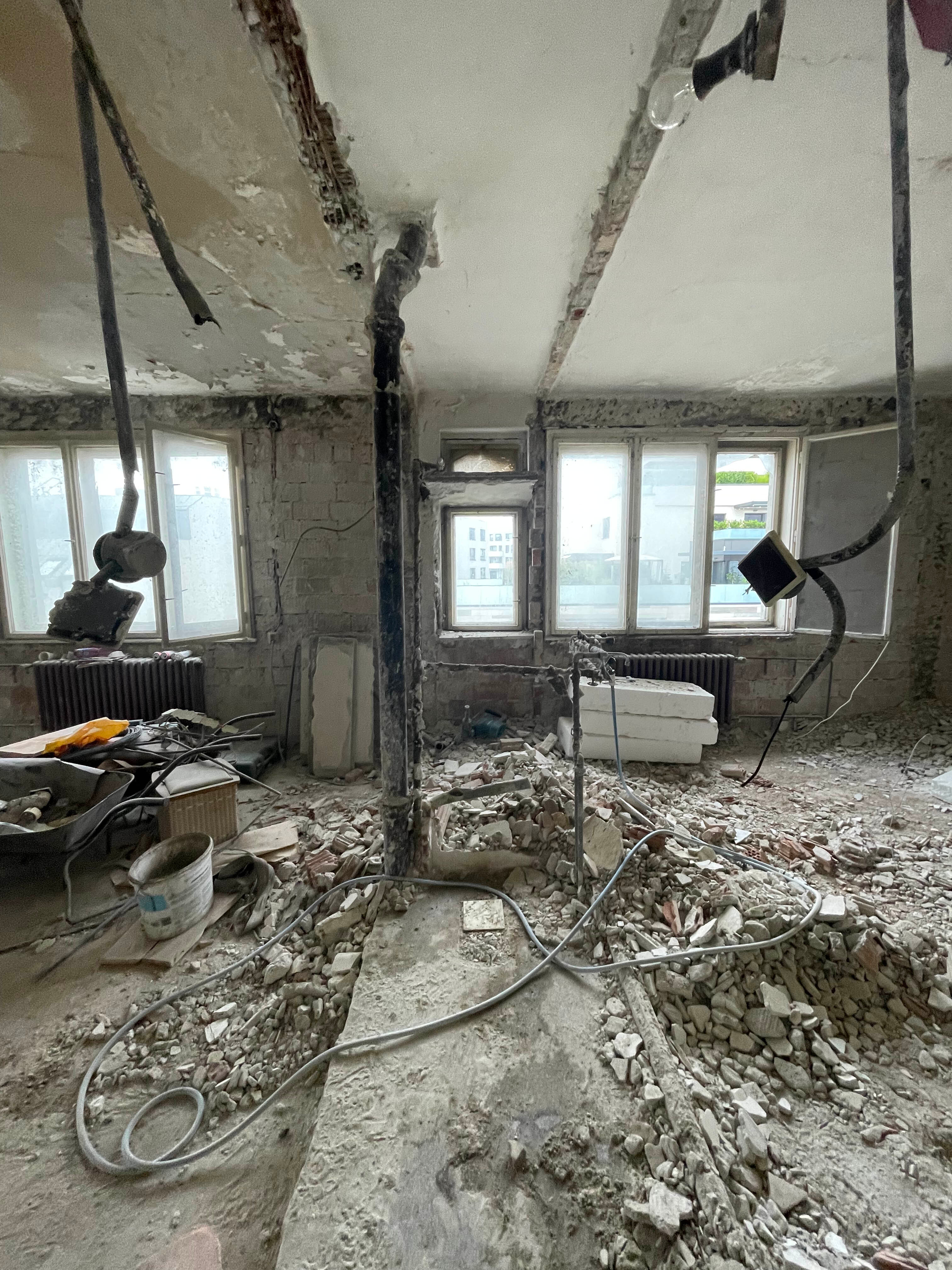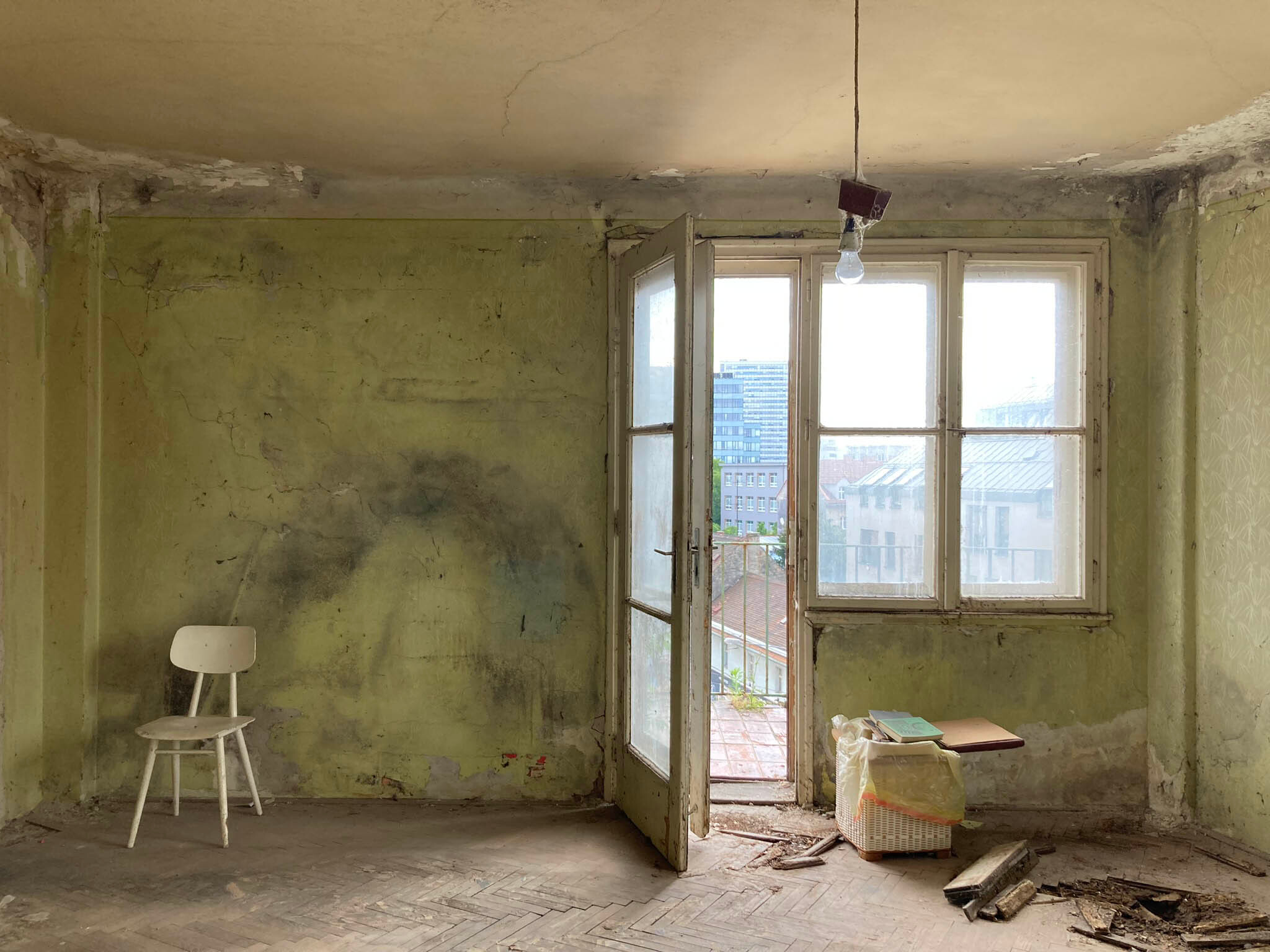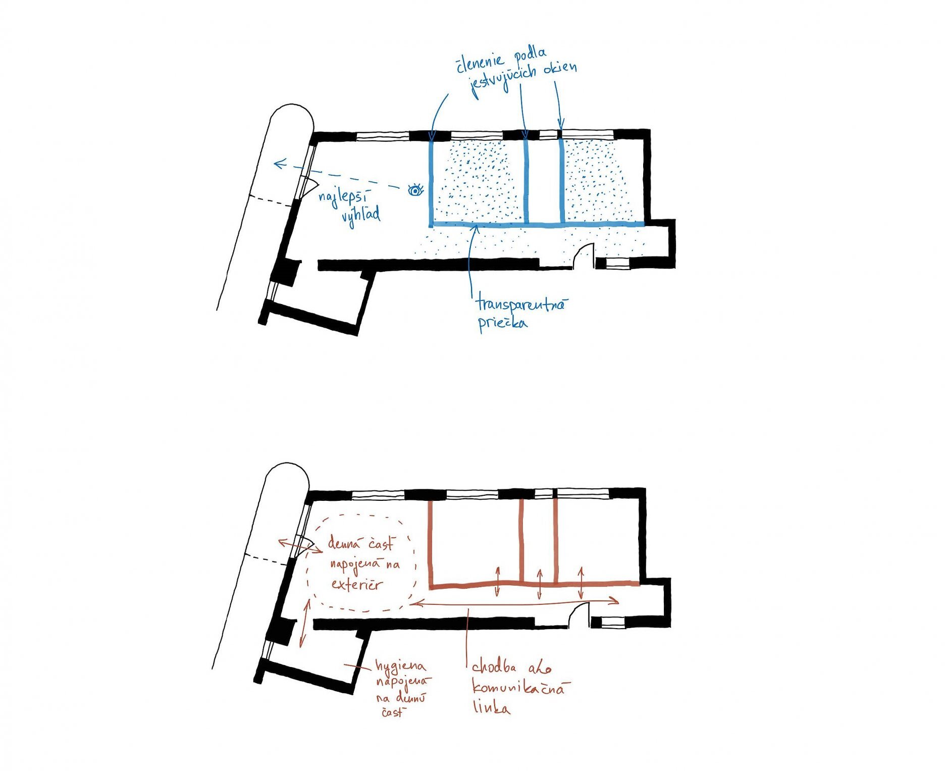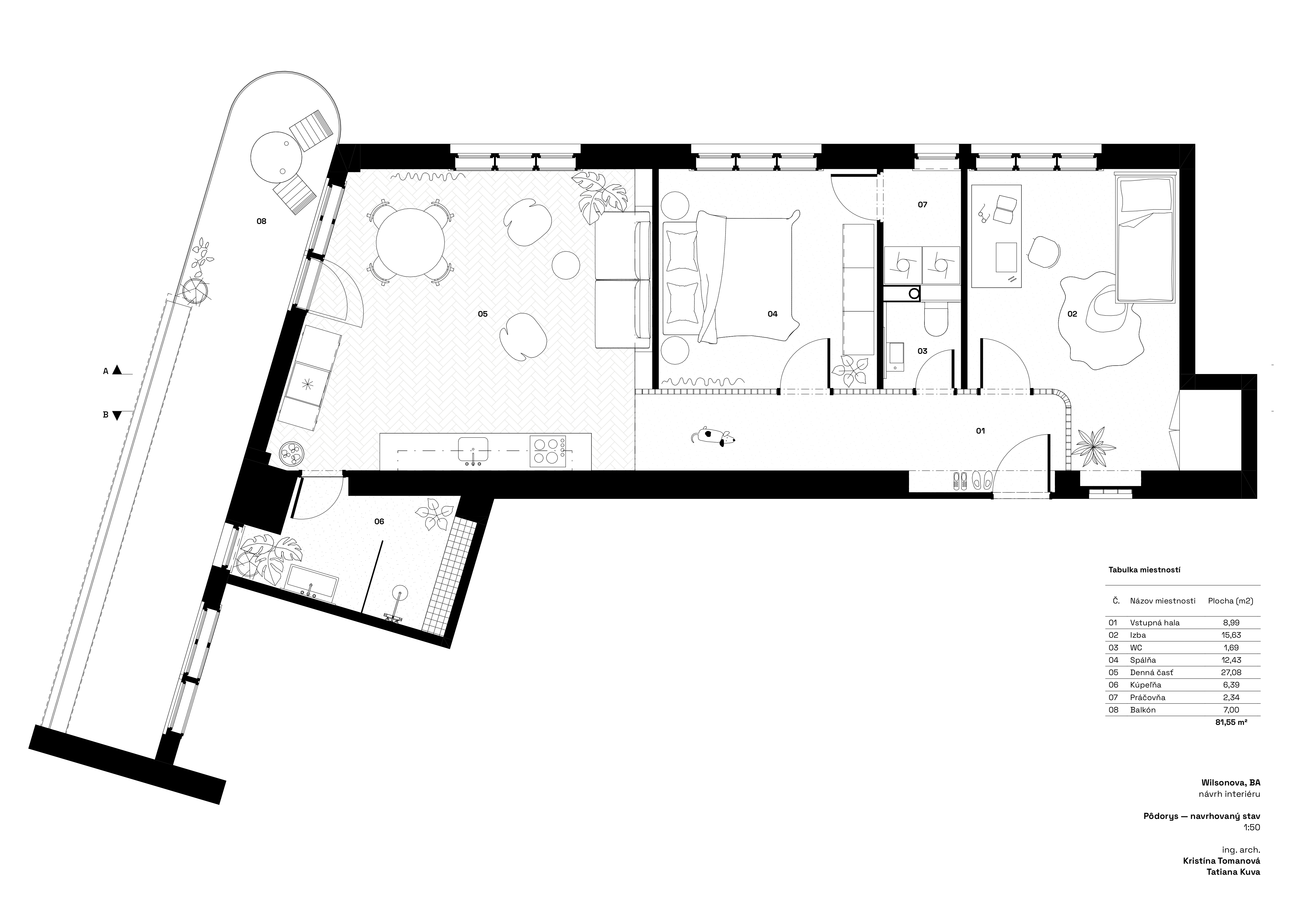Pôvodne dvojizbový byt na Wilsonovej ulici v Bratislave pozostával z veľkorysých prechodných izieb. Takéto usporiadanie však mladej rodine nevyhovovalo, navyše byt bol v neobývateľnom stave. Preto sa pristúpilo k úprave na trojizbový byt.