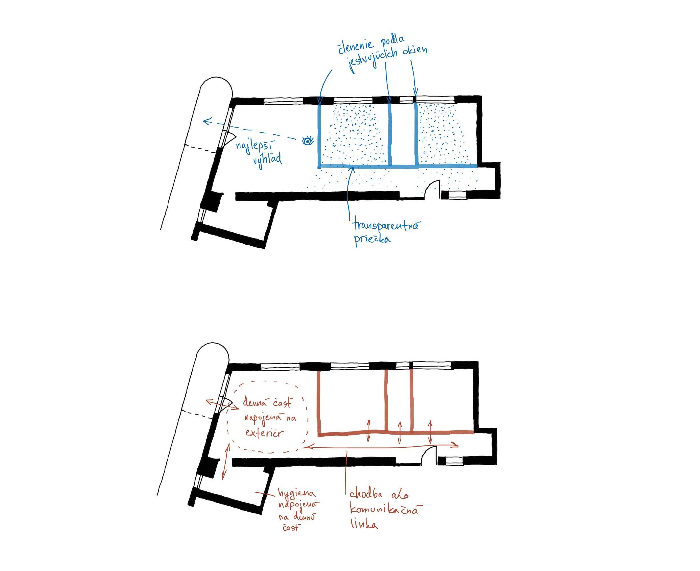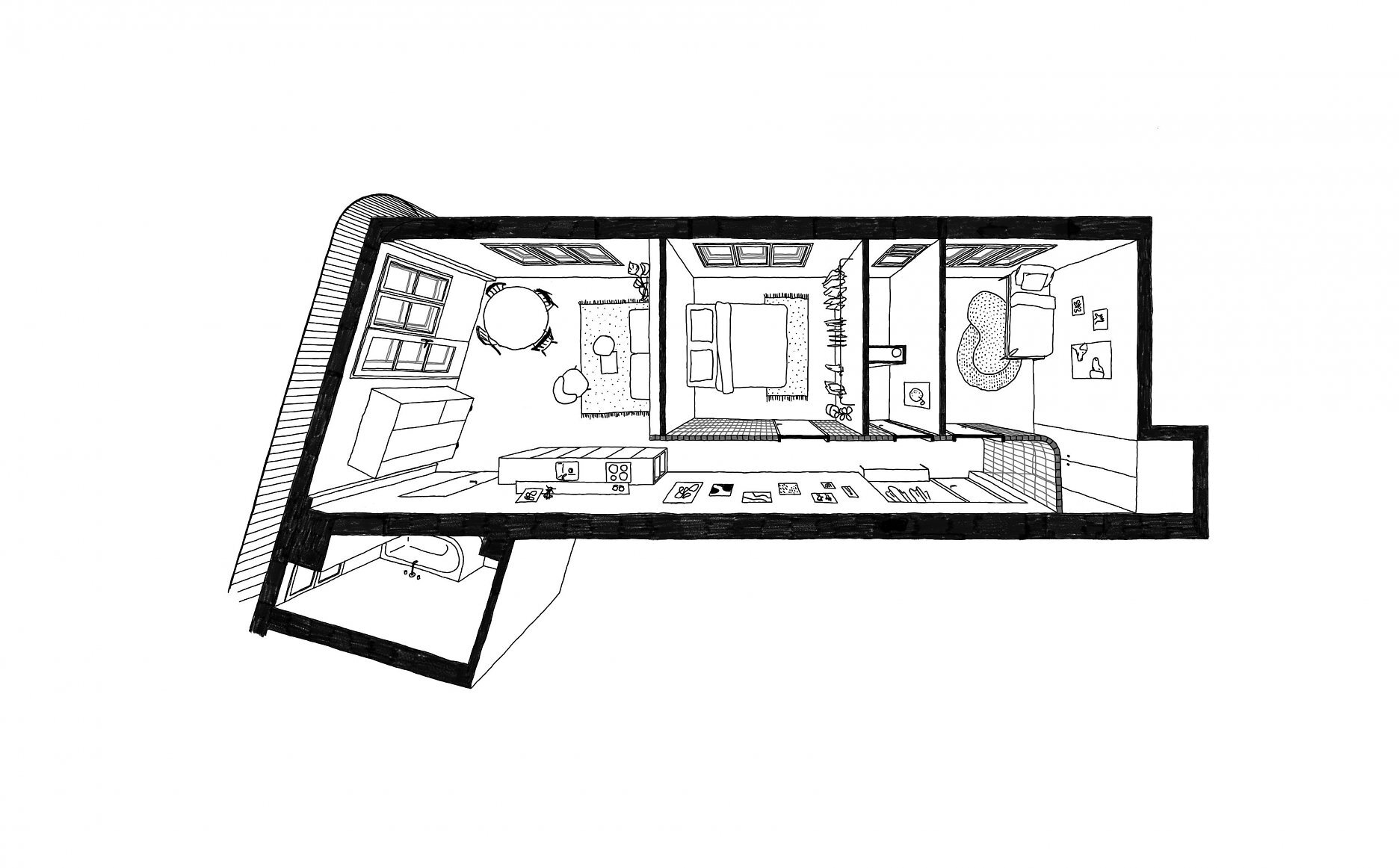 Polohy pôvodných priečok sa takmer nemenili pre umiestnenie okien na fasádnej stene. Prirodzene tak vznikli dve izby a medzi nimi práčovňa prístupná zo spálne a WC prístupné z chodby, prepojené svetlíkom. Pozdĺž izieb sa nachádza chodba smerujúca do dennej časti bytu – nárožného priestoru s balkónom, ktorý je najatraktívnejším priestorom bytu a zároveň nadväzuje na priestrannú kúpeľňu.