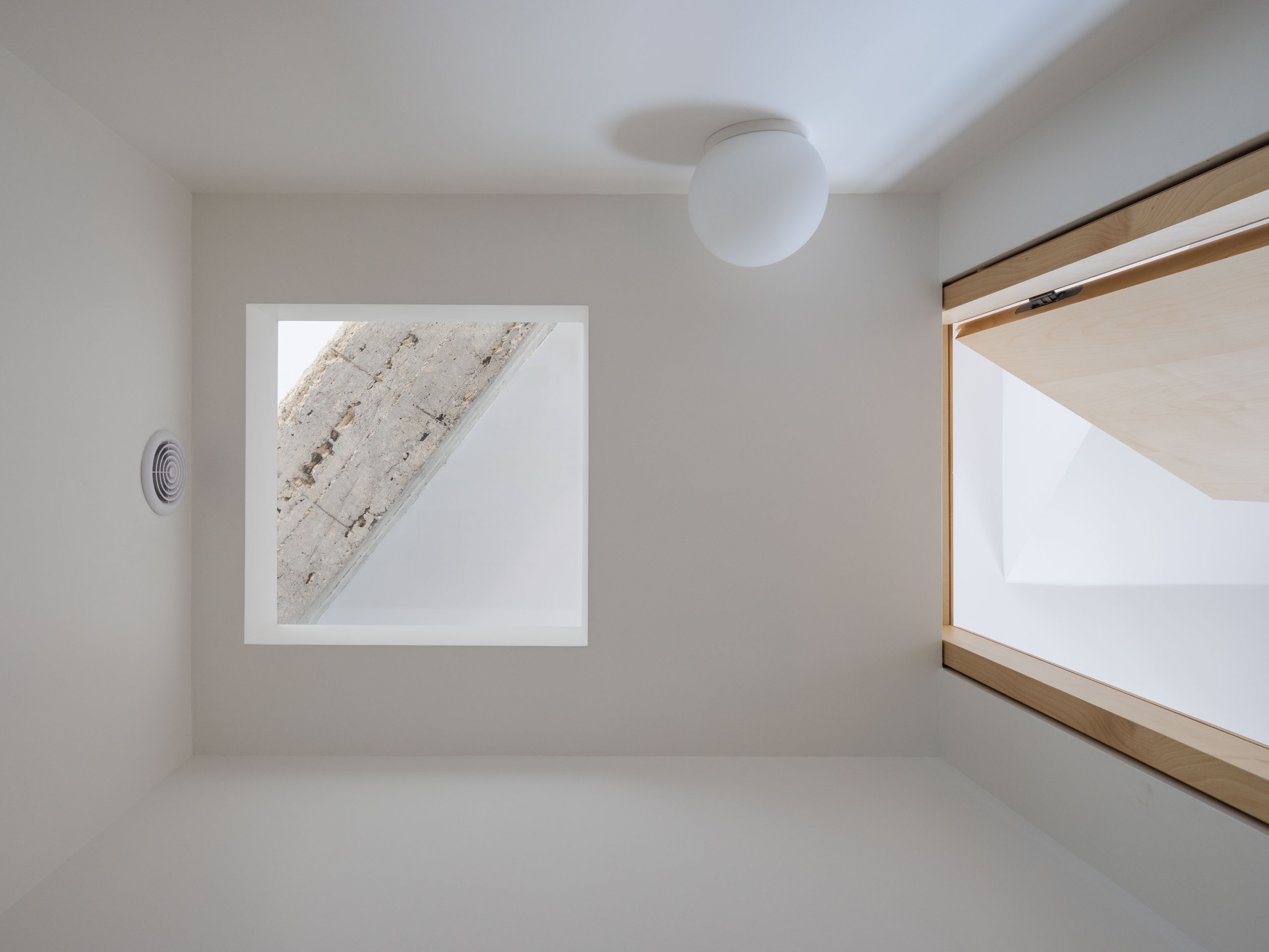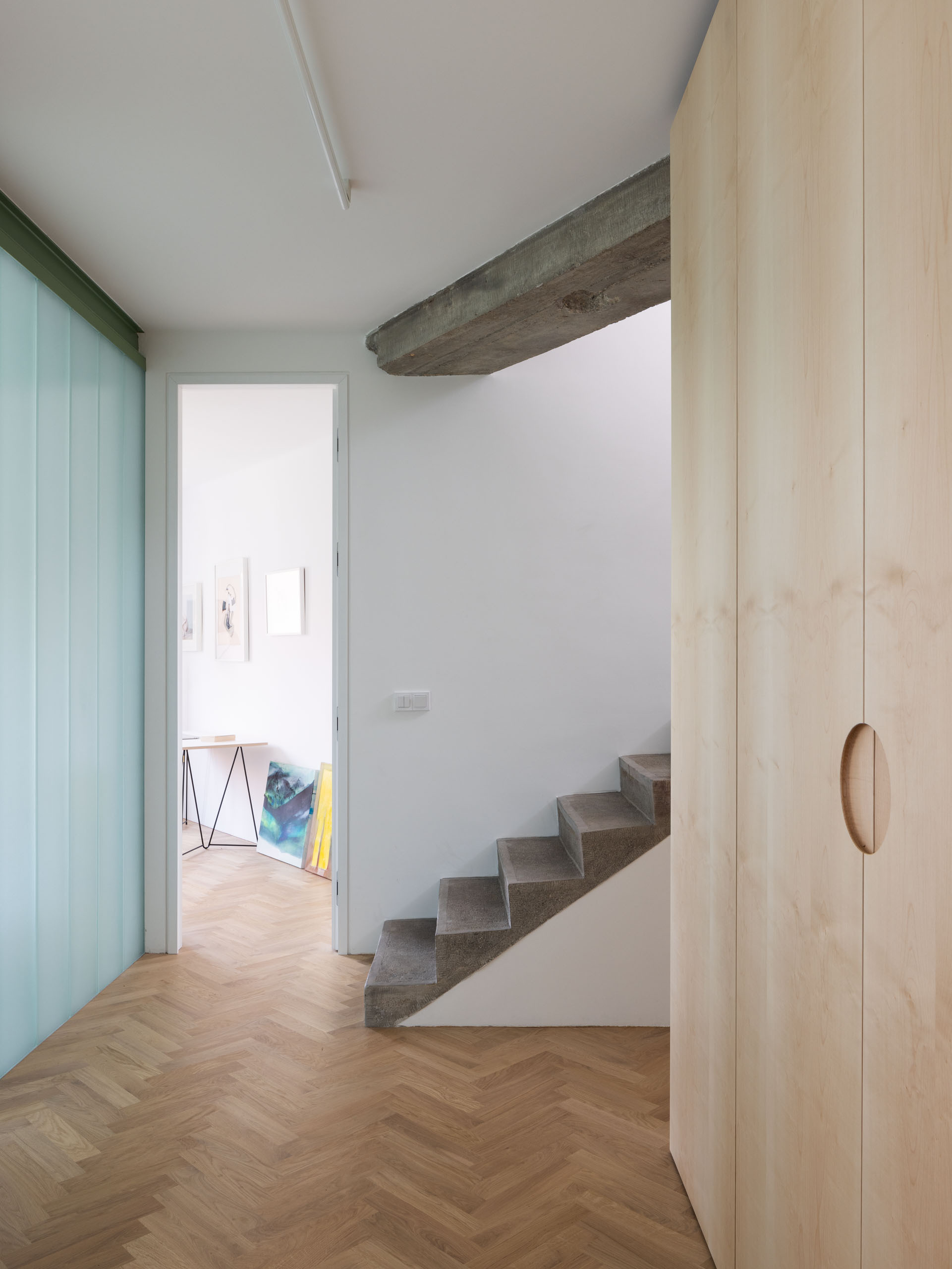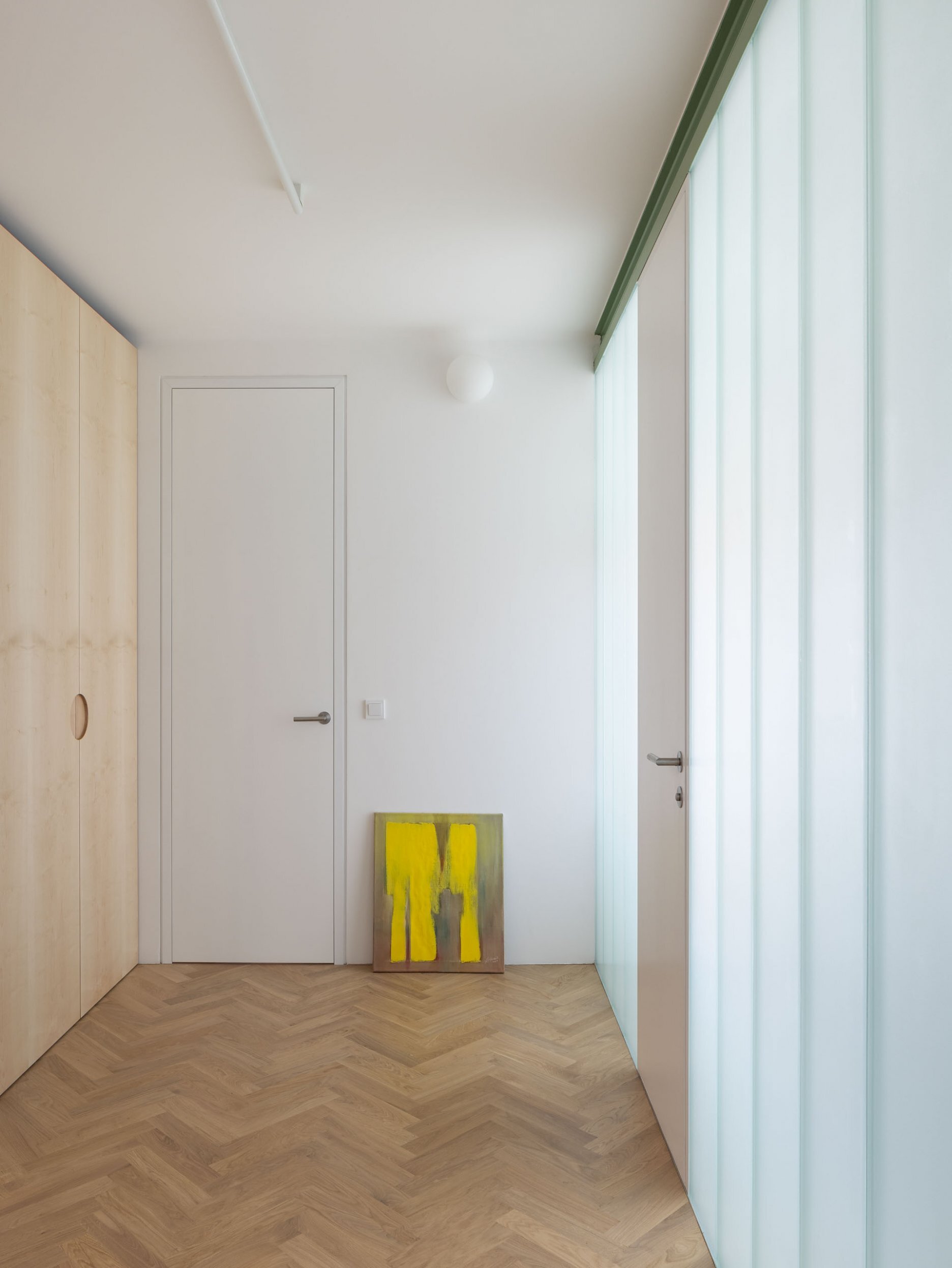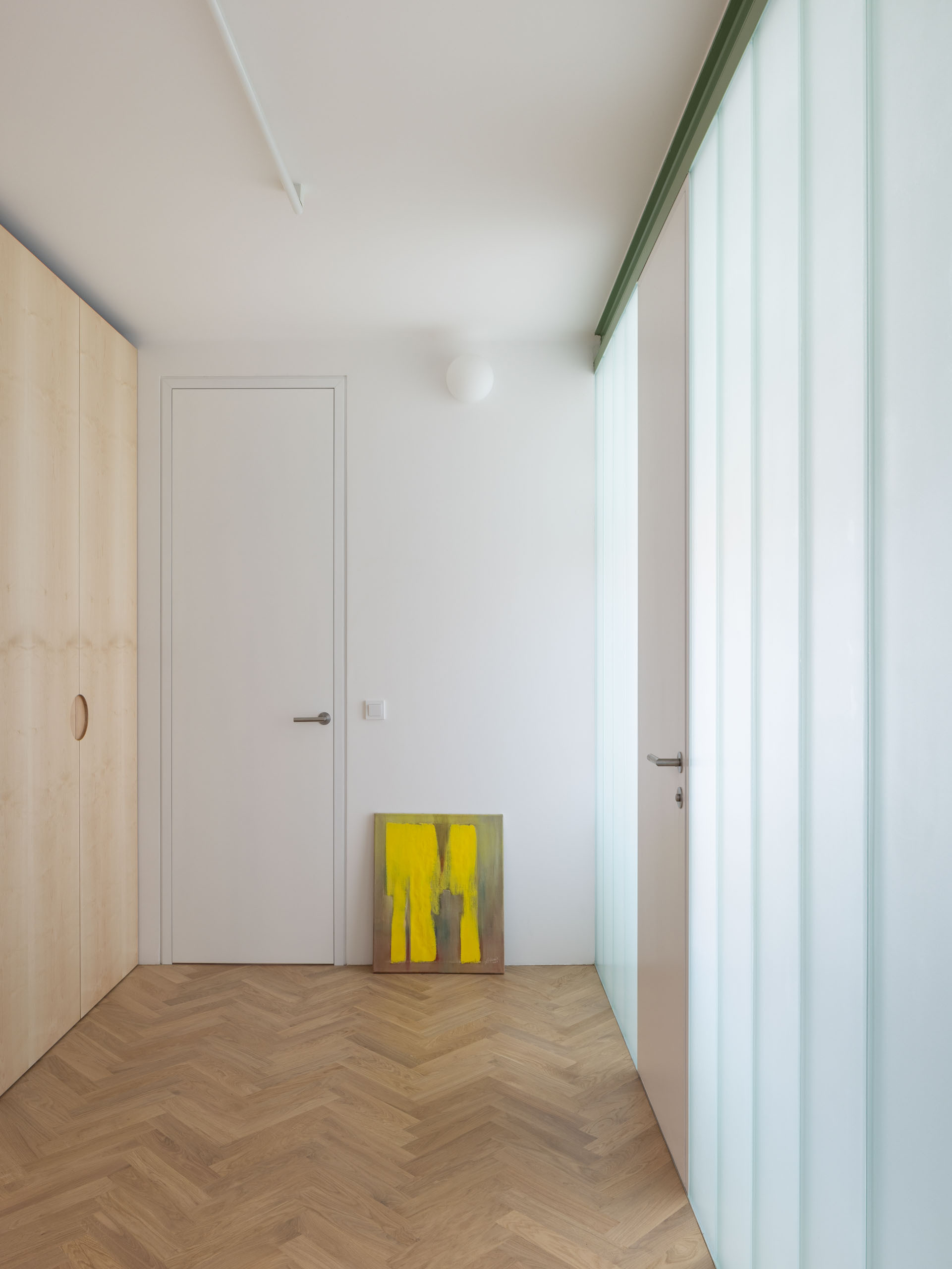Spodné podlažie bytu funguje ako nočná zóna so spálňou, detskou izbou a kúpeľňou, oddelenou translucentnou kopilitovou stenou, ktorá prináša svetlo do vstupnej chodby. Dominantným schodiskom sa dostaneme do veľkého otvoreného priestoru slúžiaceho ako denná časť.