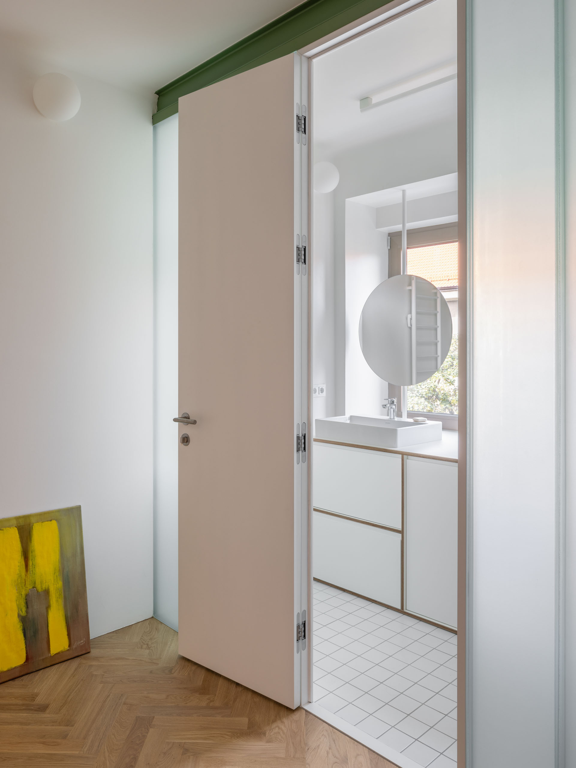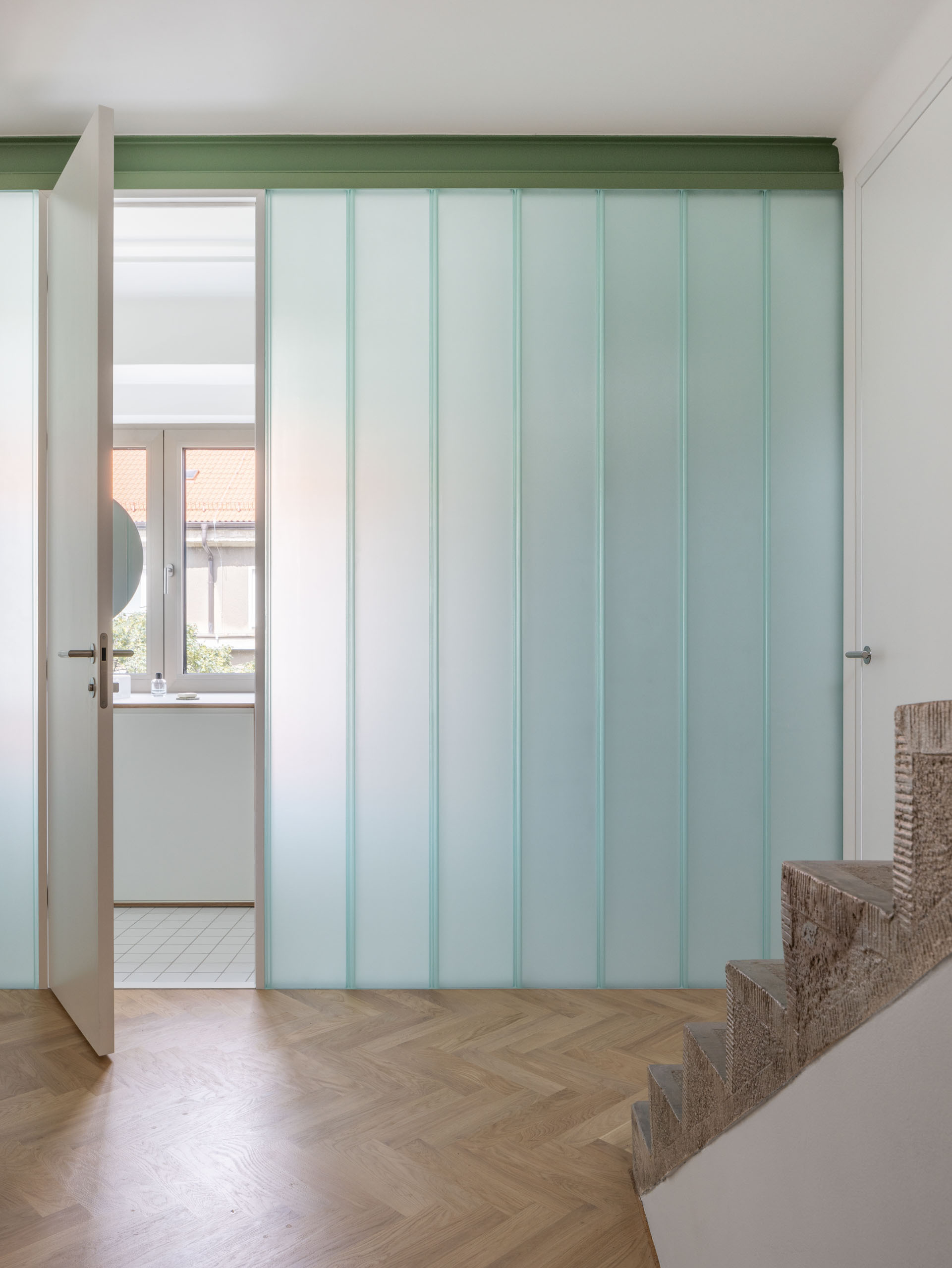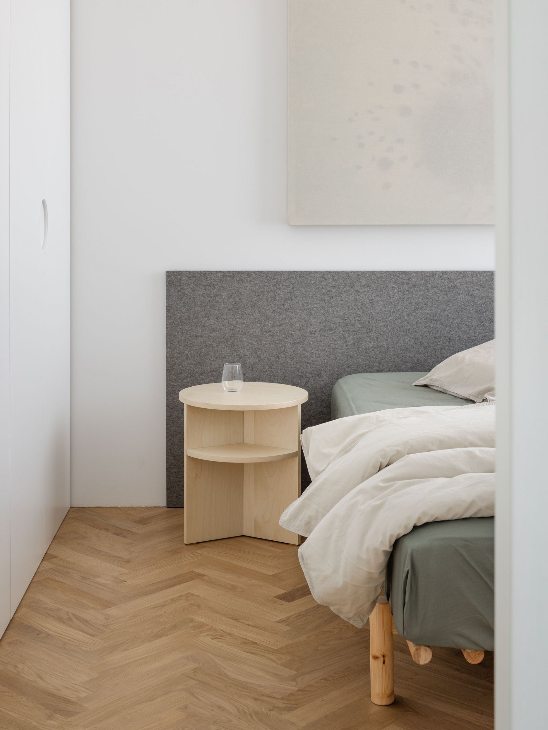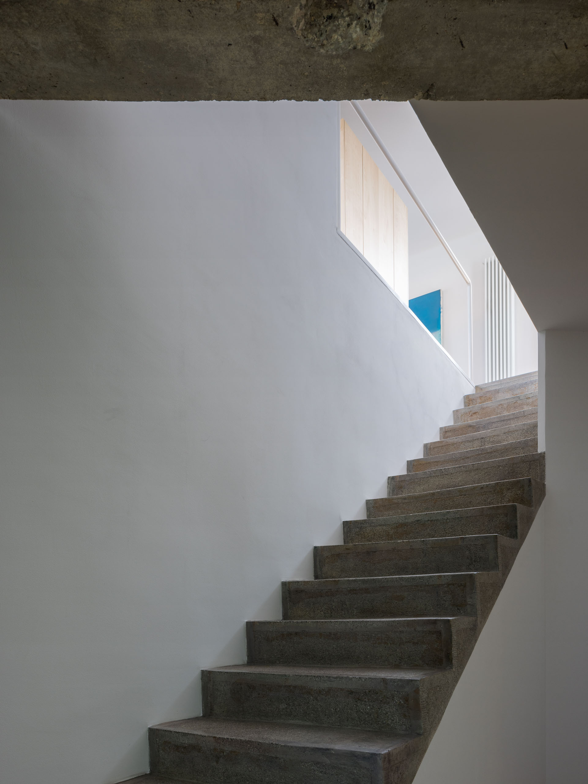 Spodné podlažie bytu funguje ako nočná zóna so spálňou, detskou izbou a kúpeľňou, oddelenou translucentnou kopilitovou stenou, ktorá prináša svetlo do vstupnej chodby. Dominantným schodiskom sa dostaneme do veľkého otvoreného priestoru slúžiaceho ako denná časť.