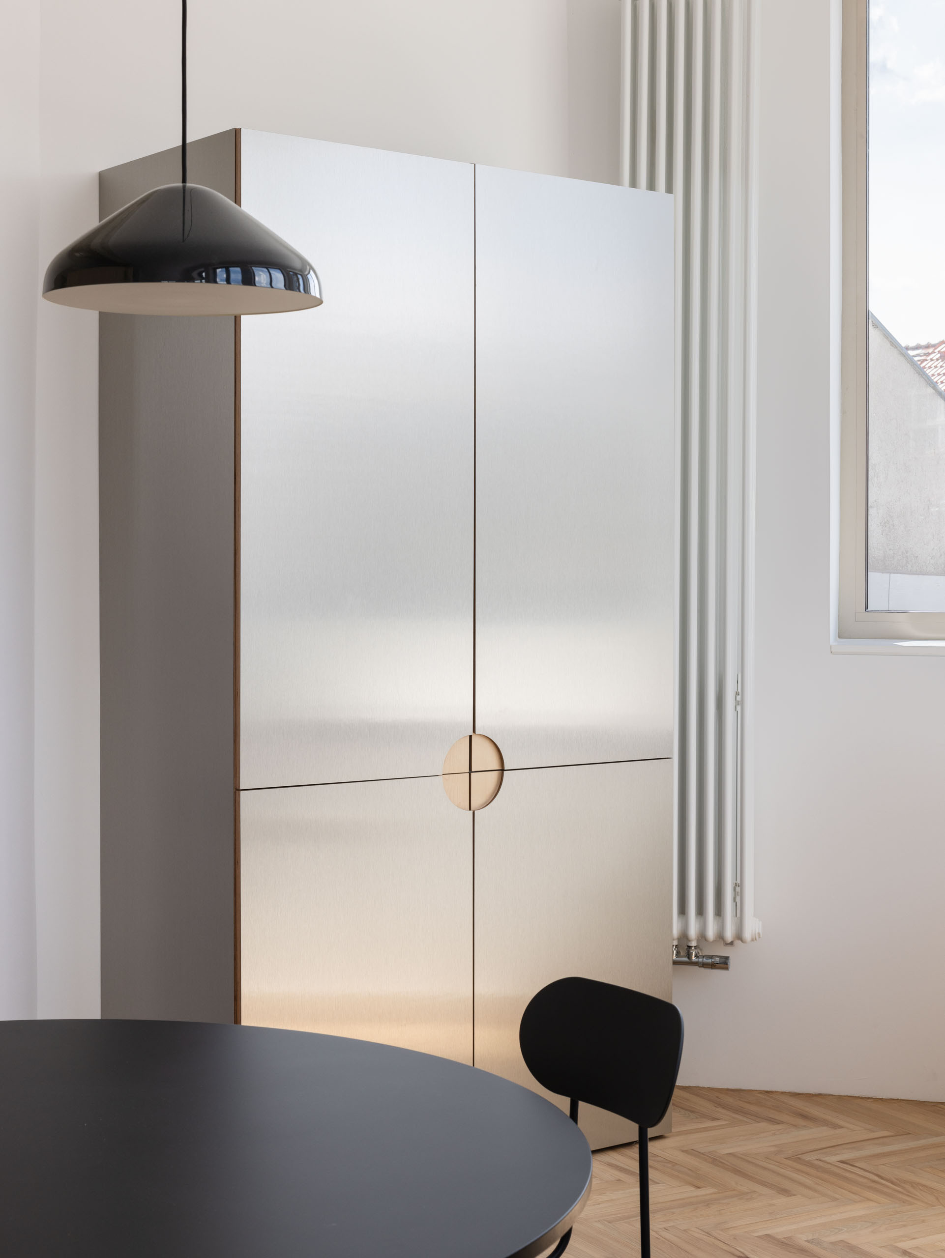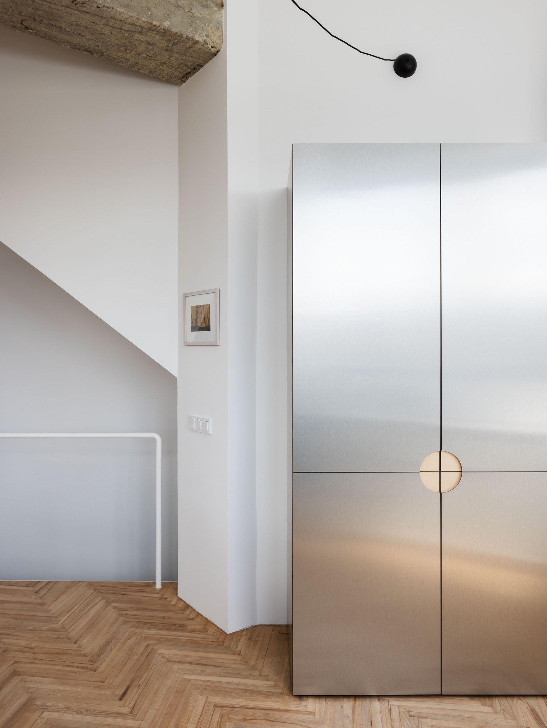 Otvorená denná zóna s flexibilným usporiadaním ťaží z priameho prepojenia s rozsiahlou strešnou terasou. Nové, precízne spracované nábytkové prvky, ktoré v mnohých prípadoch nahrádzajú klasické deliace konštrukcie, kontrastujú s hrubou materialitou odhalených stavebných prvkov pôvodného interiéru. Stvárnenie interiéru necháva vyniknúť autorské solitéry, detaily a zbierku obrazov majiteľov.