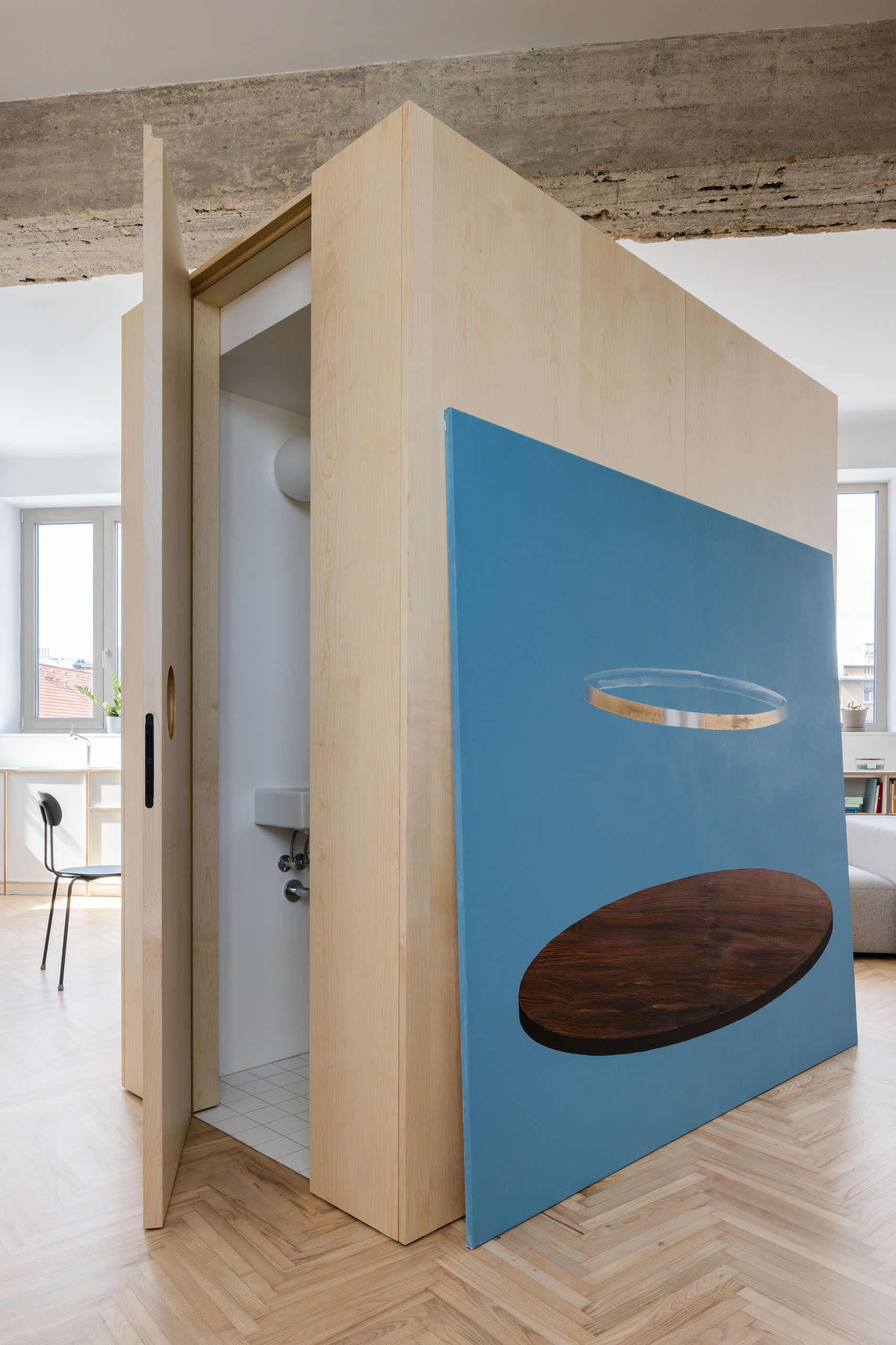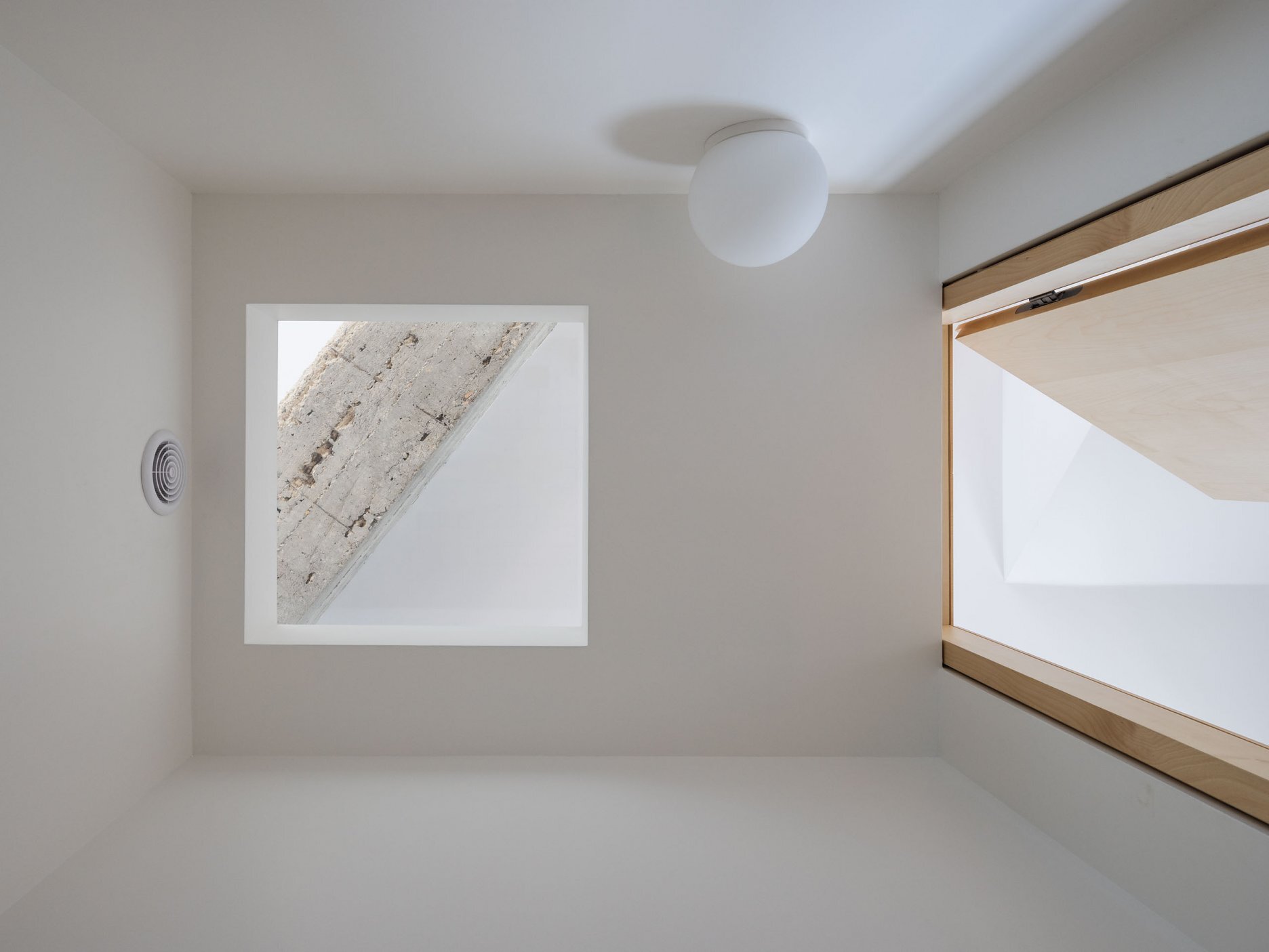 Vložený centrálny box delí priestor na rôzne funkcie a zároveň ponúka aj ďalšie plochy na vystavovanie obrazov. Nájdeme tu čitáreň, priestor pre klavír, kuchyňu s jedálňou a obývaciu izbu. Box neslúži len ako toaleta, ale funguje aj ako náladové priestorové svietidlo. Zo všetkých strán je priestor presvetlený veľkými oknami, z ktorých je možné vystúpiť na terasu.