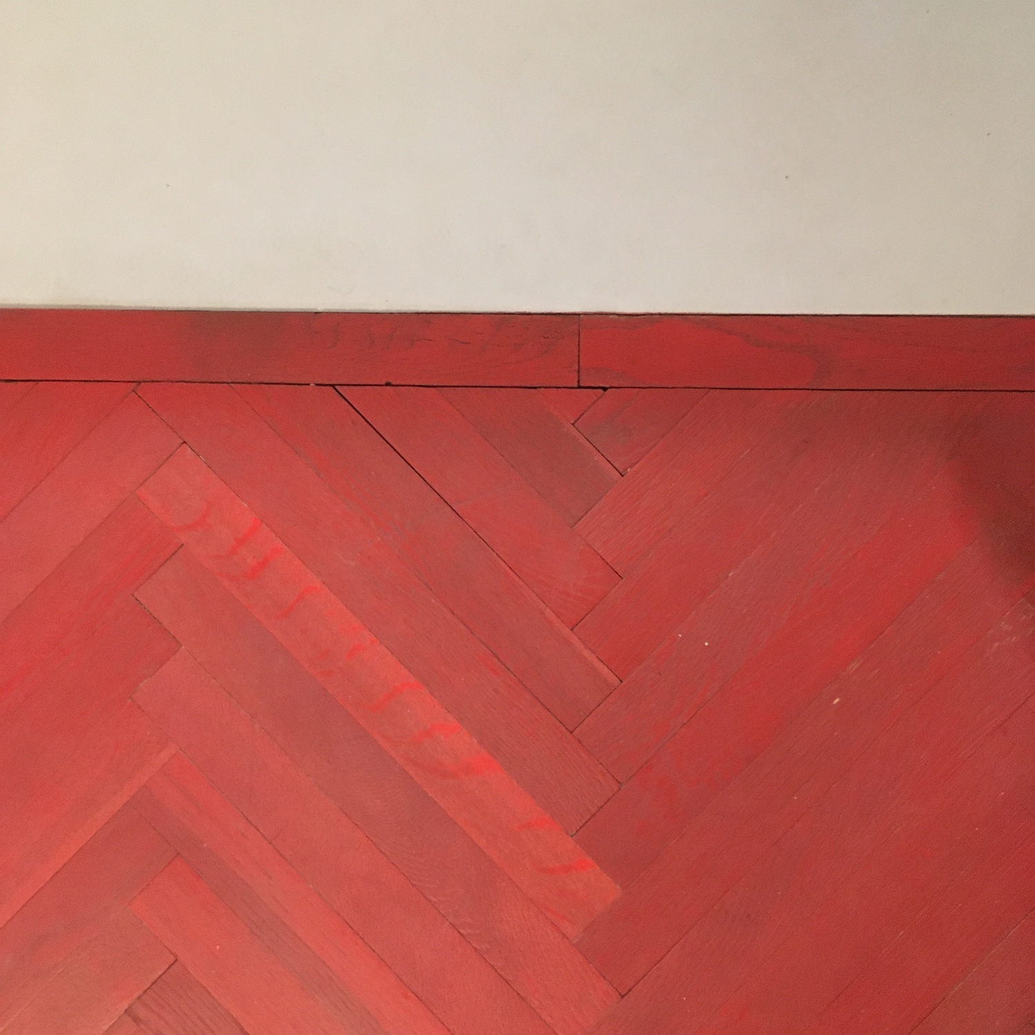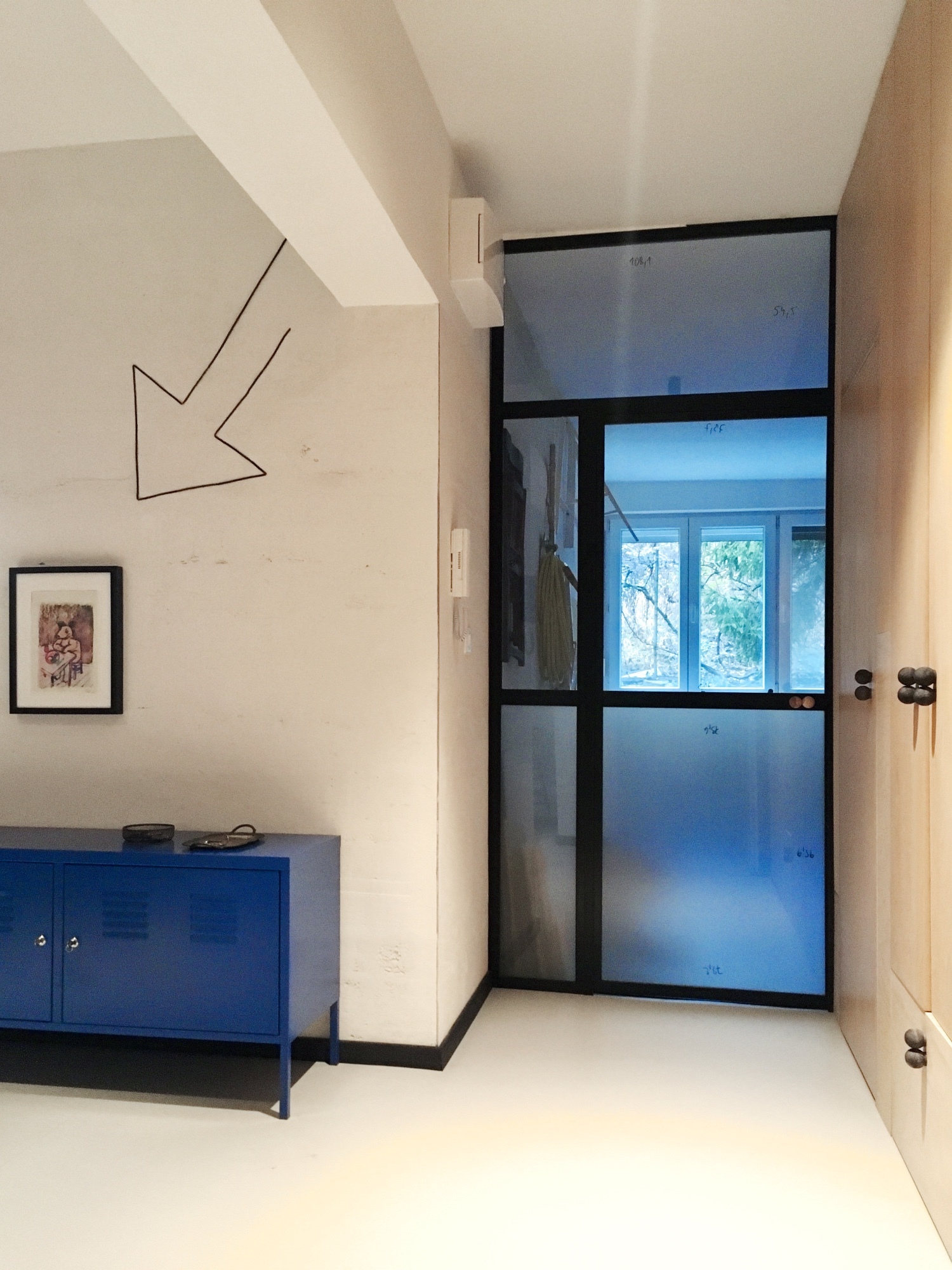 Po materiálovej stránke sa pôvodné prvky spájajú s novými. V byte zostali vstupné dvere, maľby, parkety aj pôvodný telefónny kábel – detail steny v tvare šípky. Tvorca využil štyri druhy omietok, troje podlahy a pestrú škálu farieb. Každá miestnosť má svojskú farebnú atmosféru, pričom odtiene sa jemne prelínajú. Pôvodné parkety prešli farebnou úpravou a dopĺňa ich marmoleum v chodbe a kuchyni. V kúpeľni dominuje čiernobiele terazzo. Steny sa nahrubo omietli sadrovou omietkou a miestami ostala aj pôvodná stierka. Najväčšej stene dominuje ružová exteriérová omietka so striekaným kamenivom. V pracovni sa odhalila pôvodná maľba, ktorú kde-tu doplnila nová omietka. Byt pôsobí eklekticky, sviežo a pestro.