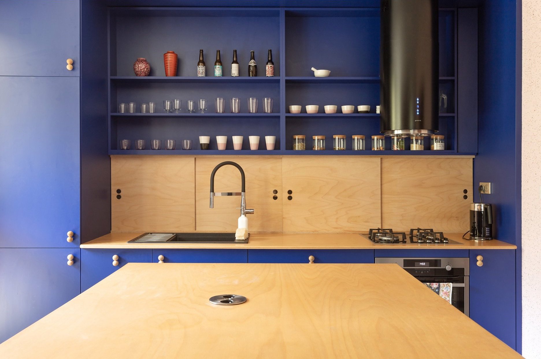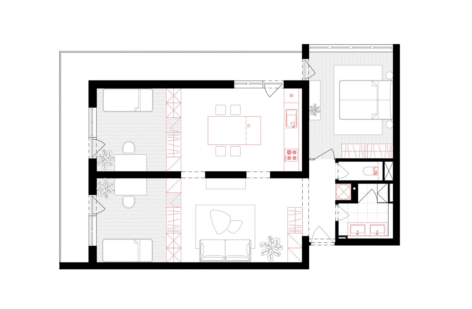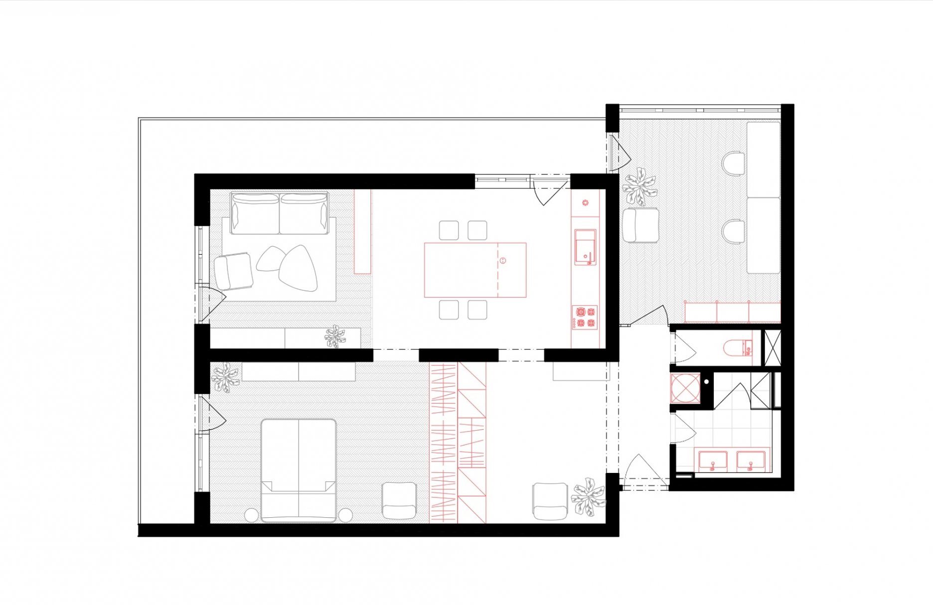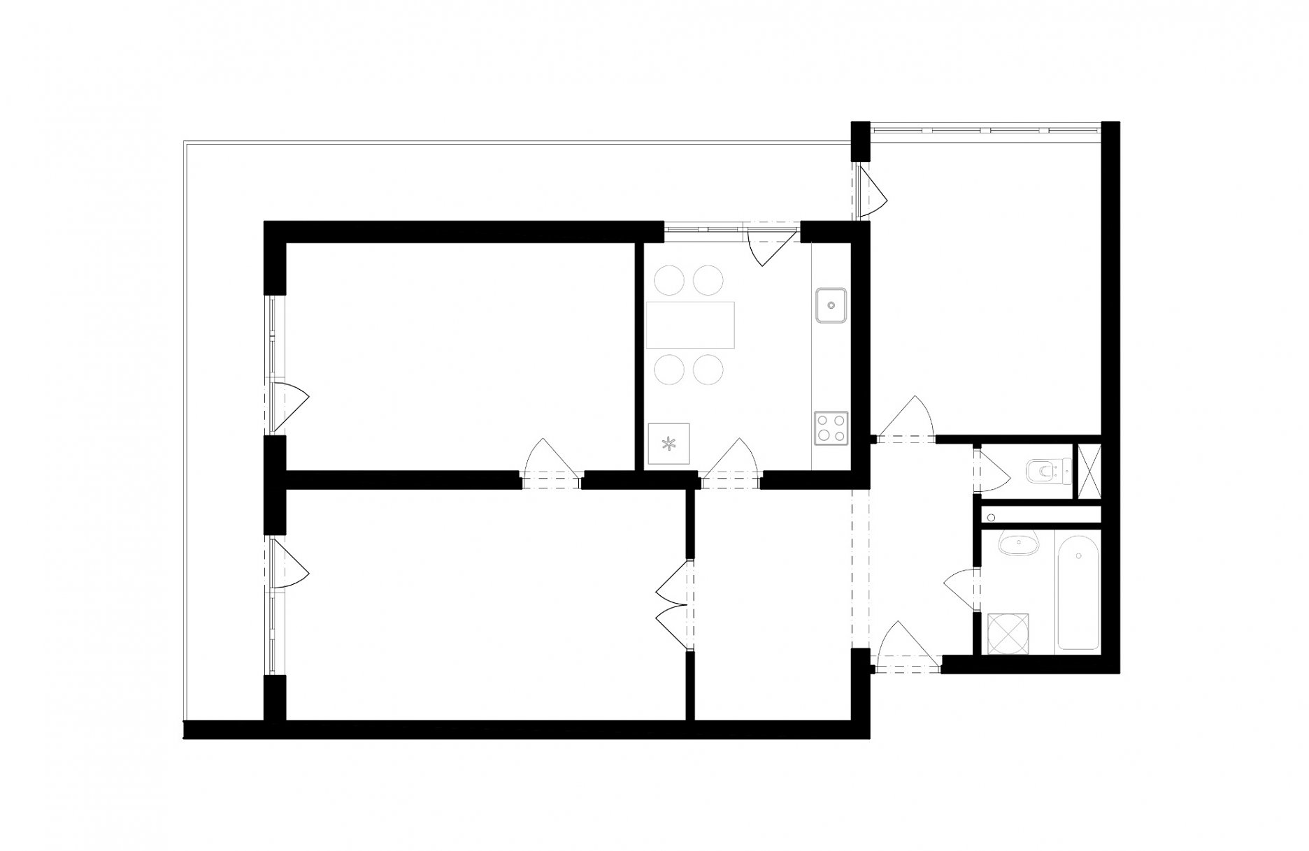 Cieľom projektu bolo vytvoriť flexibilný priestor, aby sa dvojizbový byt prípadne dal prestavať až na štvorizbový. Zbúraním priečok sa otvorila dispozícia a vytvorili sa dva veľké priestory, rozčlenené nábytkom. Realizácia sa robila svojpomocne, čo sa odzrkadlilo na návrhu jednotlivých prvkov aj na trvaní rekonštrukcie. Všetky vstavané nábytky vznikali priamo na stavbe a navrhovali sa tak, aby sa realizovali iba dvoma remeselníkmi.