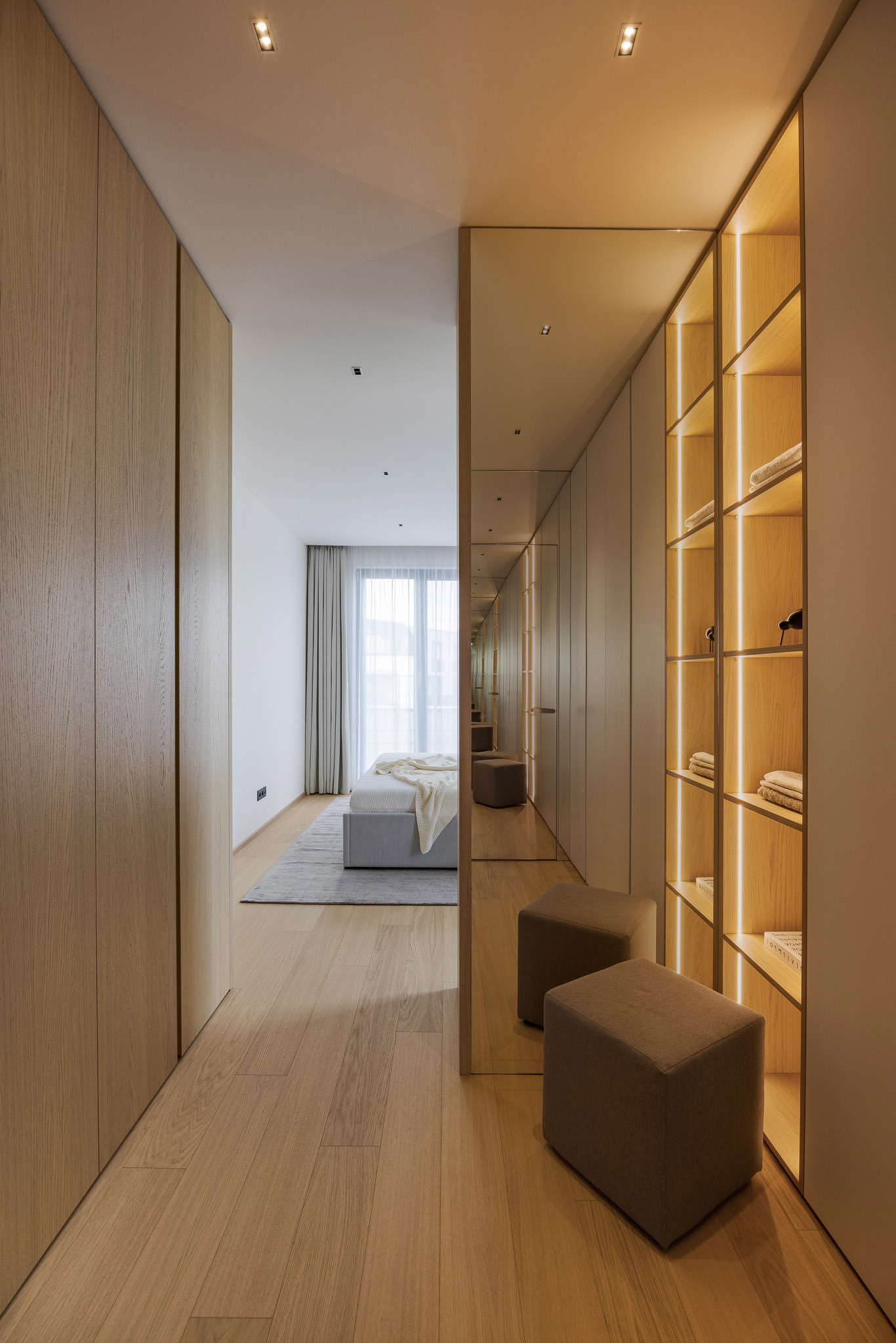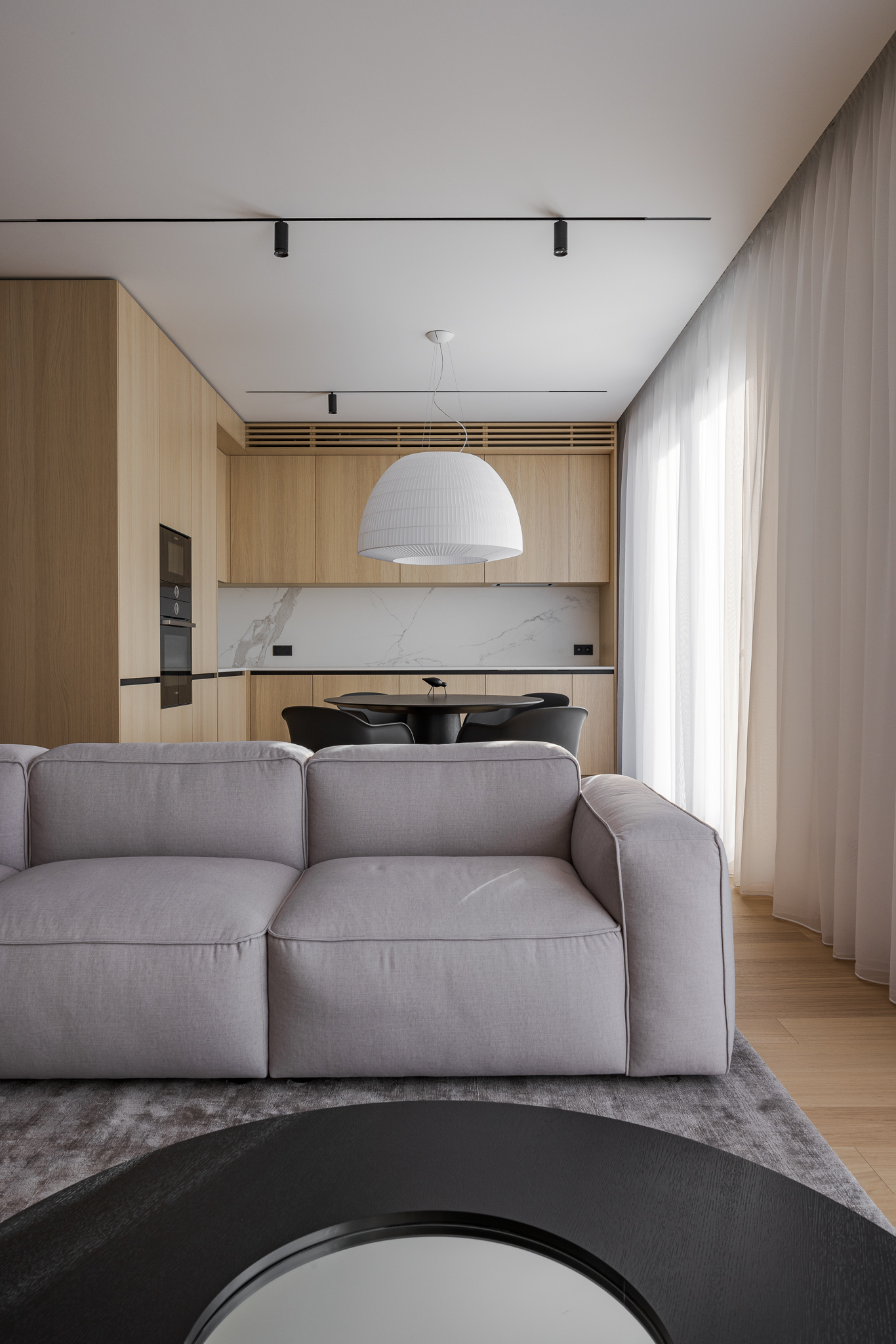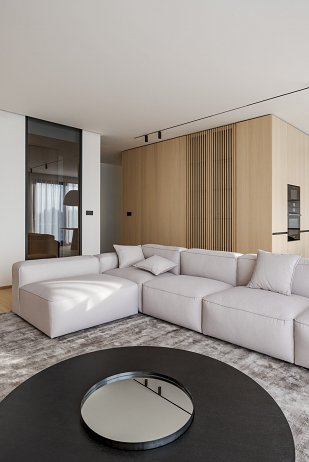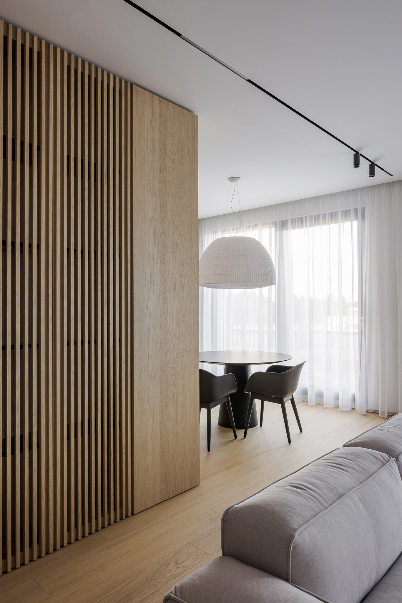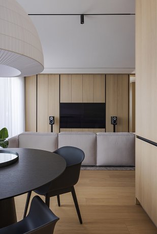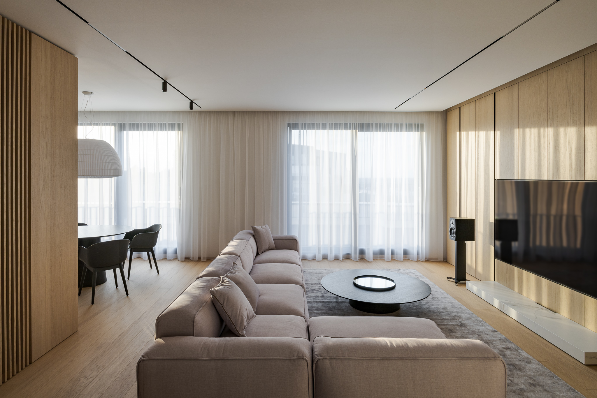 Byt ako celok je navrhnutý v čistých líniach a plochách a v jednotnej materialite s dostatkom úložných priestorov. Vďaka tomu pôsobí uceleným dojmom a majitelia majú dostatočný priestor na odkladanie bez nutnosti zapĺňat priestory ďalšími vecami. Charakteristickým materiálom, ktorý udáva tón je dubové drevo, použité na parketách a vstavaných nábytkoch. Dopĺňané je povrchmi v bielej a sivej farbe. Kontrastom k tejto farebnosti je čierna vo forme svietidiel, typového nábytku a vypínačov. Funkčné povrchy v kúpelniach a kuchyni sú z veľkoformátovej keramiky. Dôraz bol kladený aj na hru s osvetlením. Hlavnú funkciu plní stropné osvetlenie, ktoré je doplňané rôznymi formami led podsvietenia. Vďaka tomu sa dajú v byte vytvoriť viaceré svetelné atmosféry. Pozitívny pocit z interiéru je umocnený aj kvalitným remeselným spracovaním zariadenia a nábytku na mieru.