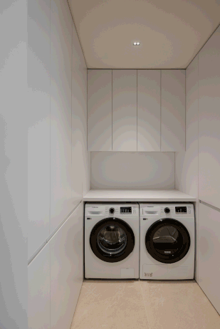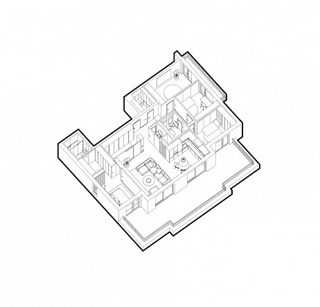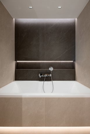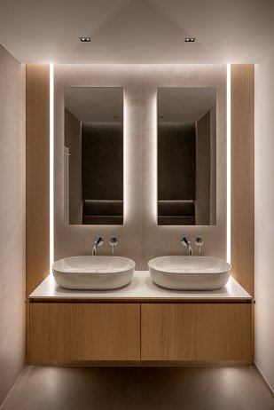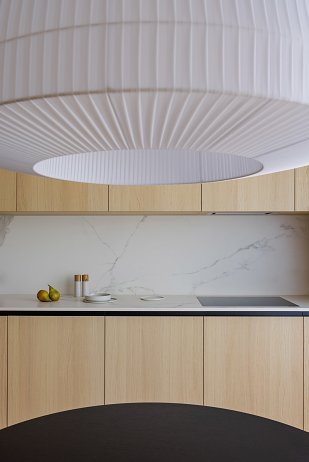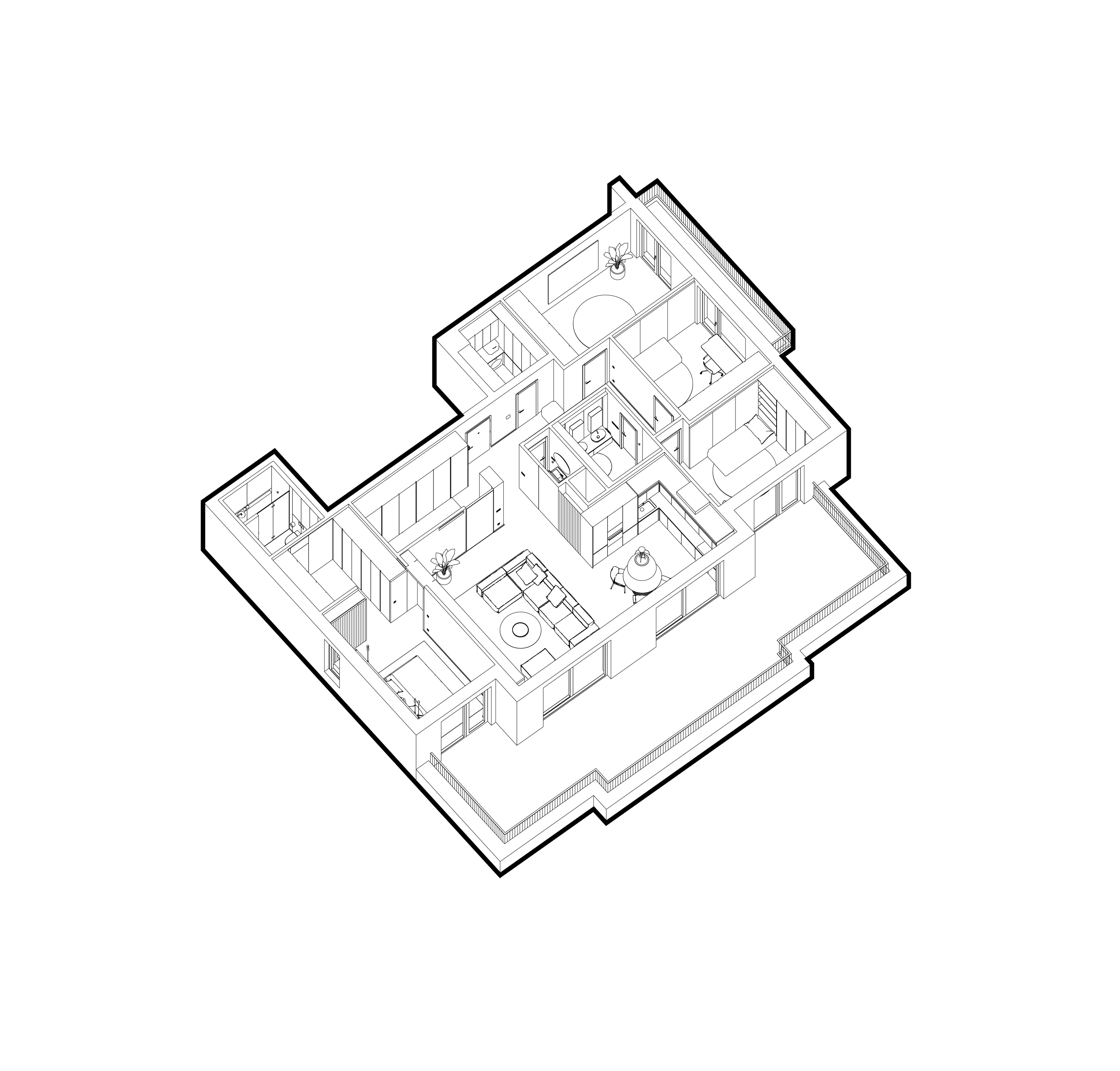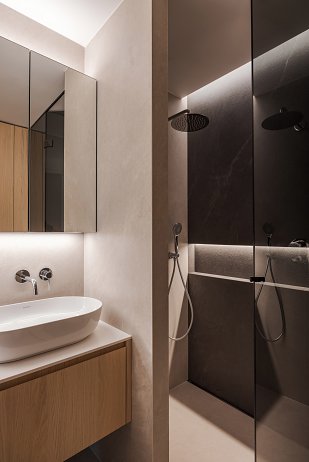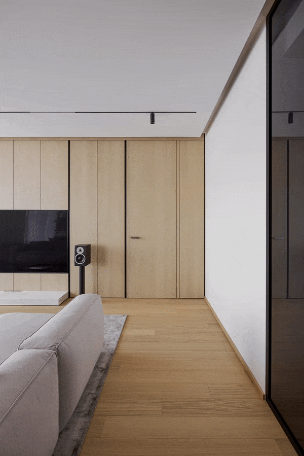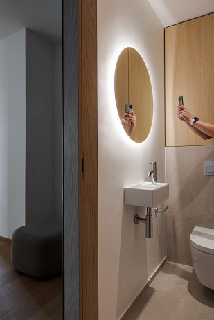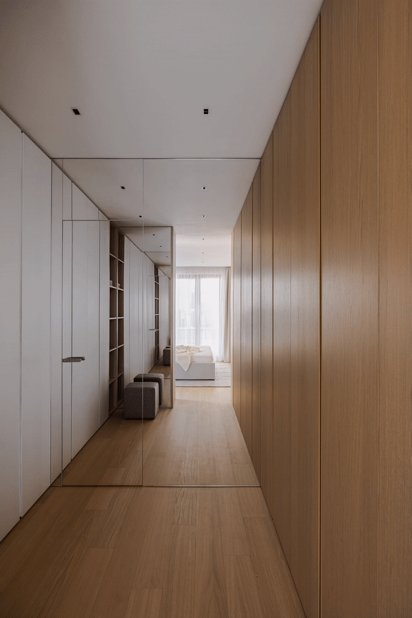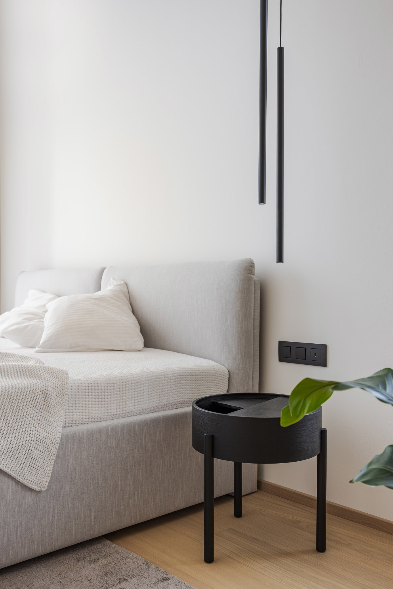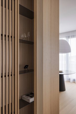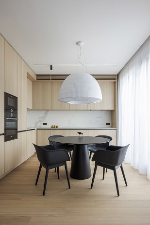 Byt ako celok je navrhnutý v čistých líniach a plochách a v jednotnej materialite s dostatkom úložných priestorov. Vďaka tomu pôsobí uceleným dojmom a majitelia majú dostatočný priestor na odkladanie bez nutnosti zapĺňat priestory ďalšími vecami. Charakteristickým materiálom, ktorý udáva tón je dubové drevo, použité na parketách a vstavaných nábytkoch. Dopĺňané je povrchmi v bielej a sivej farbe. Kontrastom k tejto farebnosti je čierna vo forme svietidiel, typového nábytku a vypínačov. Funkčné povrchy v kúpelniach a kuchyni sú z veľkoformátovej keramiky. Dôraz bol kladený aj na hru s osvetlením. Hlavnú funkciu plní stropné osvetlenie, ktoré je doplňané rôznymi formami led podsvietenia. Vďaka tomu sa dajú v byte vytvoriť viaceré svetelné atmosféry. Pozitívny pocit z interiéru je umocnený aj kvalitným remeselným spracovaním zariadenia a nábytku na mieru.