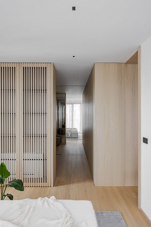 Realizácia interiéru v novostavbe v Záhorskej Bystrici. Počas práce na návrhu sa navrhlo zopár menších stavebných úprav, ktoré zlepšili prevádzku a presvetlenie bytu. Takouto úpravou vzniklo interiérové okno- vybúraním časti priečky vo vstupnej chodbe. Dosiahli sme tým presvetlenie inak tmavého koridoru a pocitovo veľkorysejší vstupný priestor.