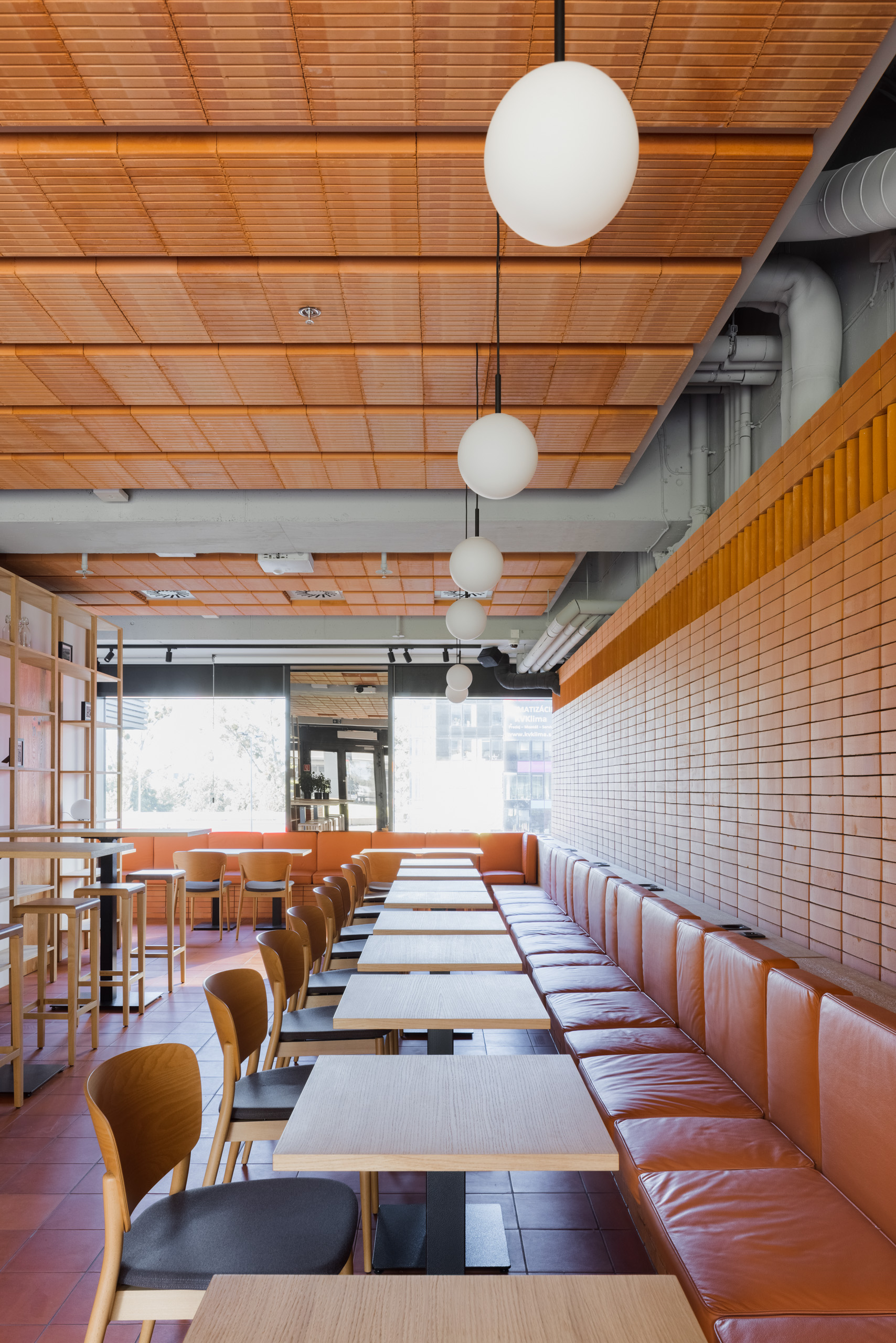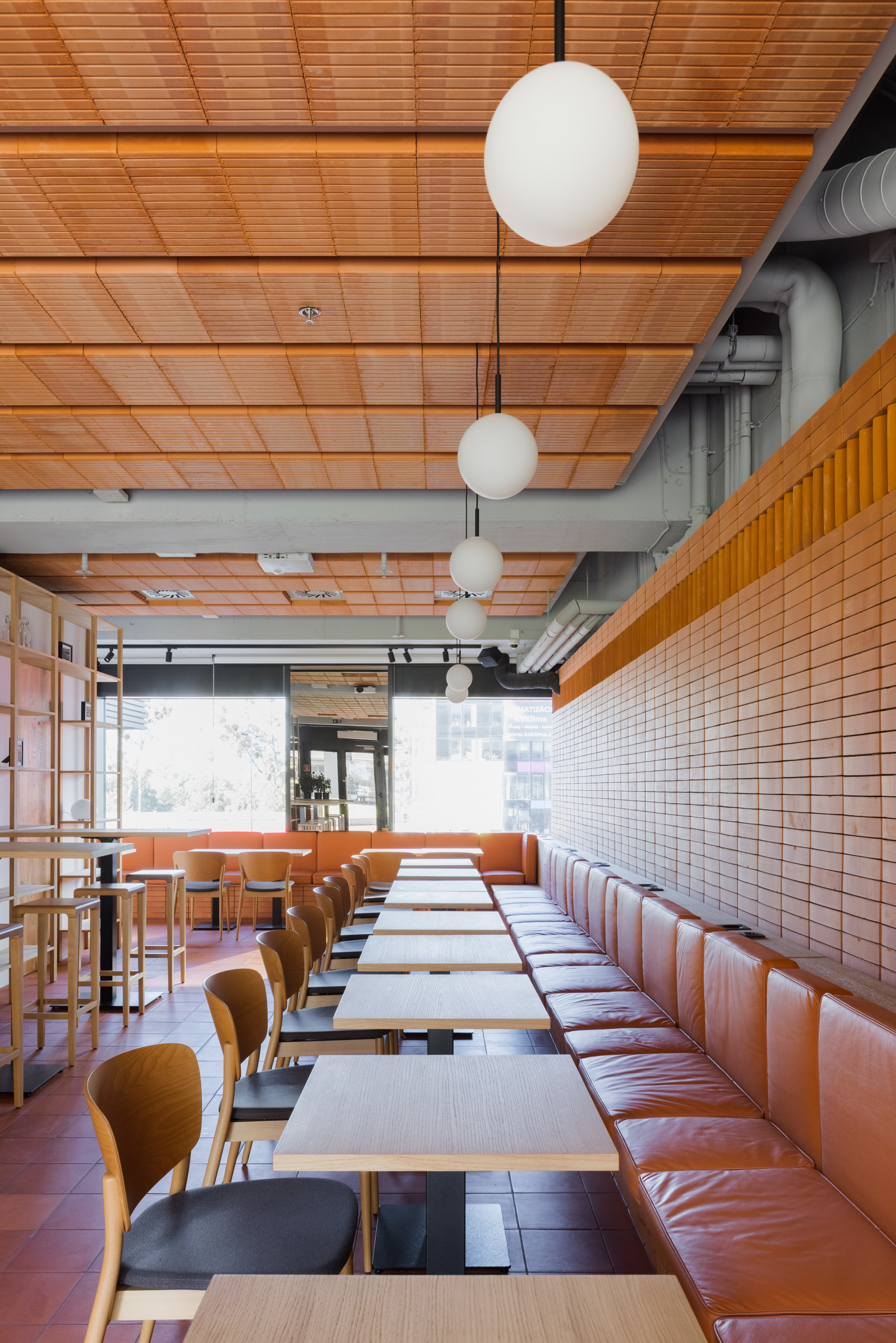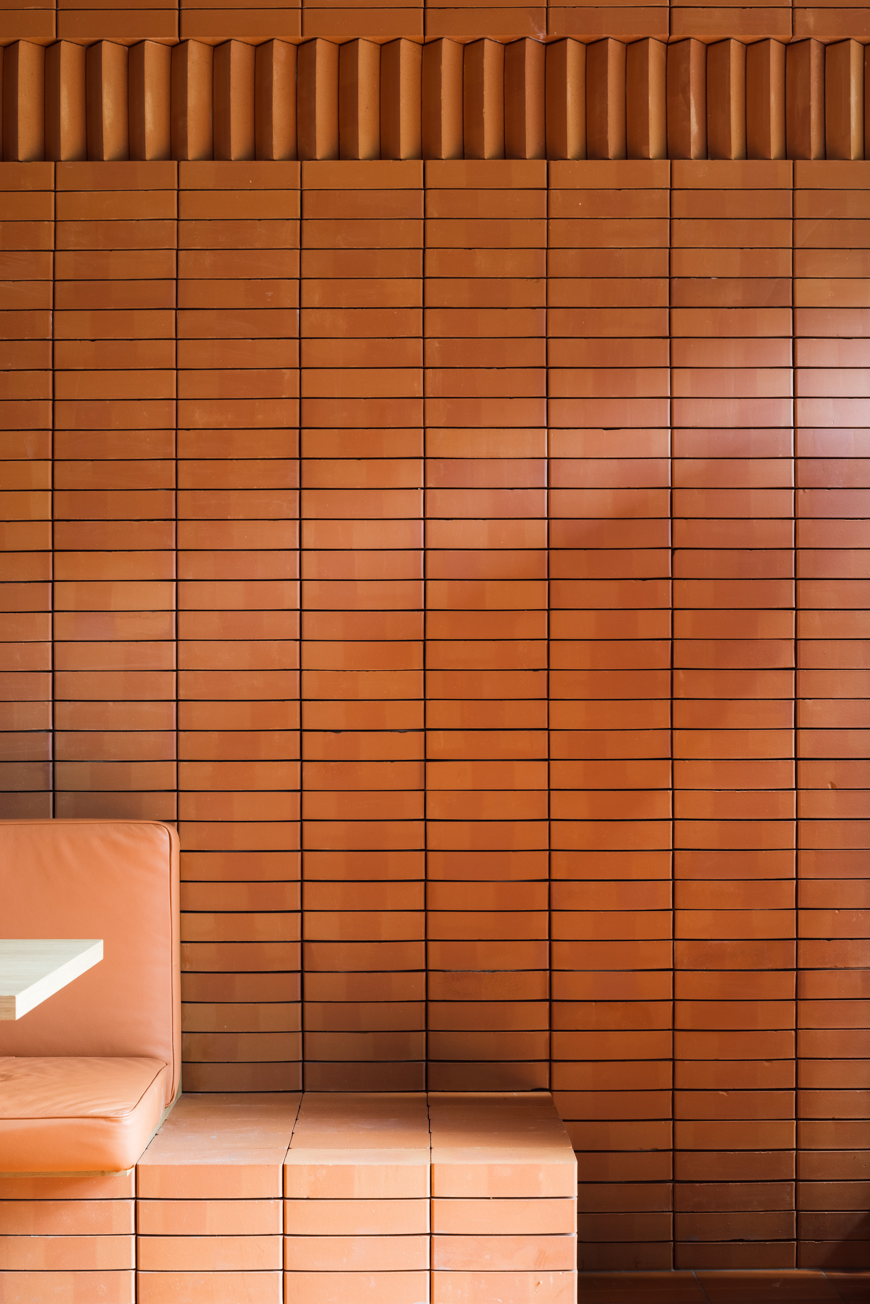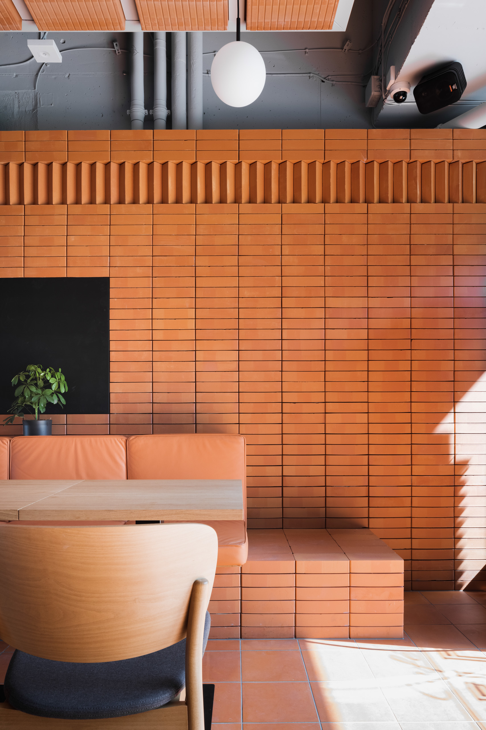 Dominantou interiéru je tehlová predstena s ornamentálnym lemom vertikálne ukladaných tehál a tehlová lavica s koženým čalúnením identickej farebnosti. Pozdĺžnosť priestoru umocňuje rad kruhových svietidiel nad pásom stolov, večer doplnený efektným podsvietením steny. Tehla ako bar, podlaha aj podhľad z tvárnic. Interiér vďaka nej pôsobí́ teplo a nenútene, nevtiera sa. Večerné́ teplé svetlo priestor zintímňuje, zmäkčuje.