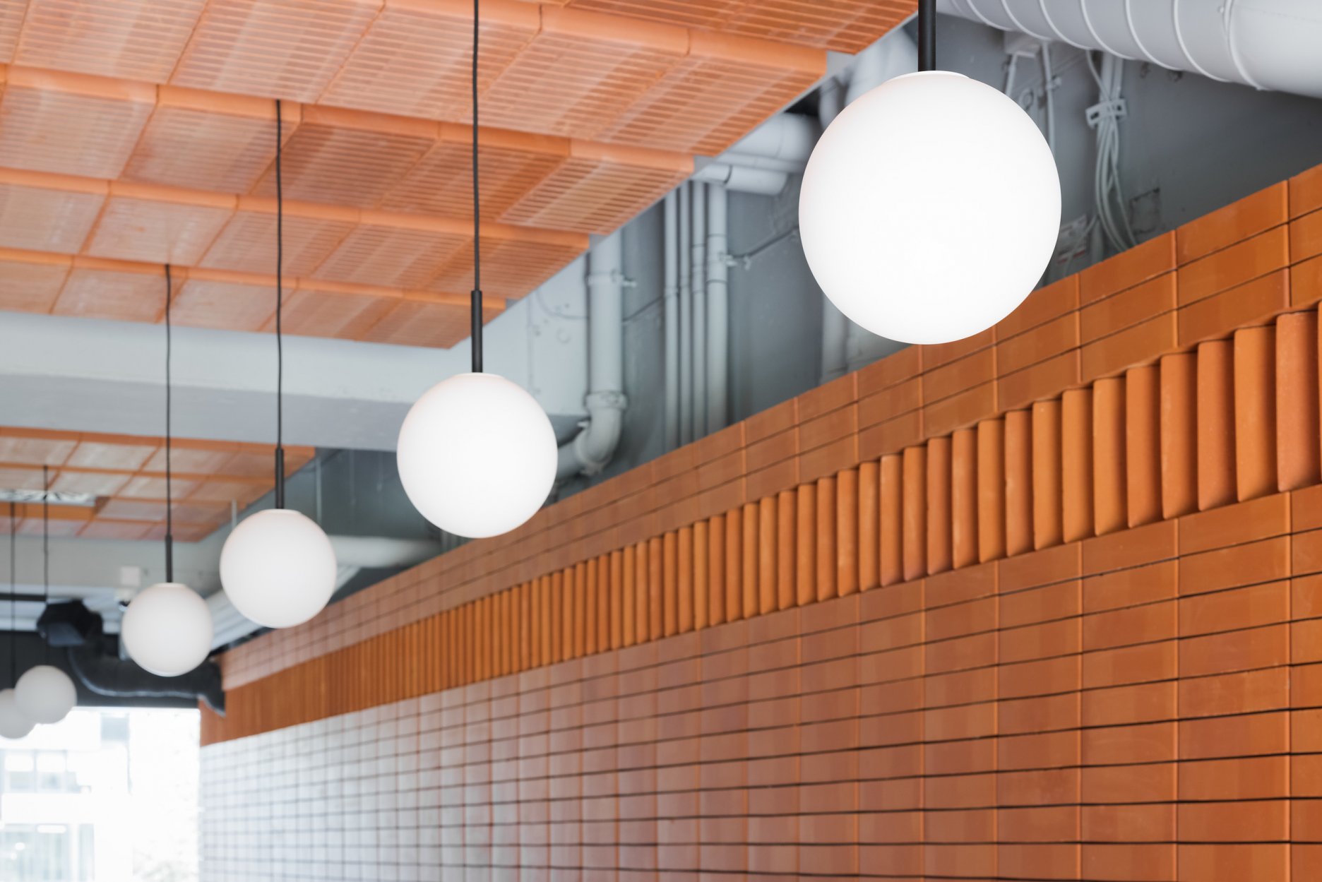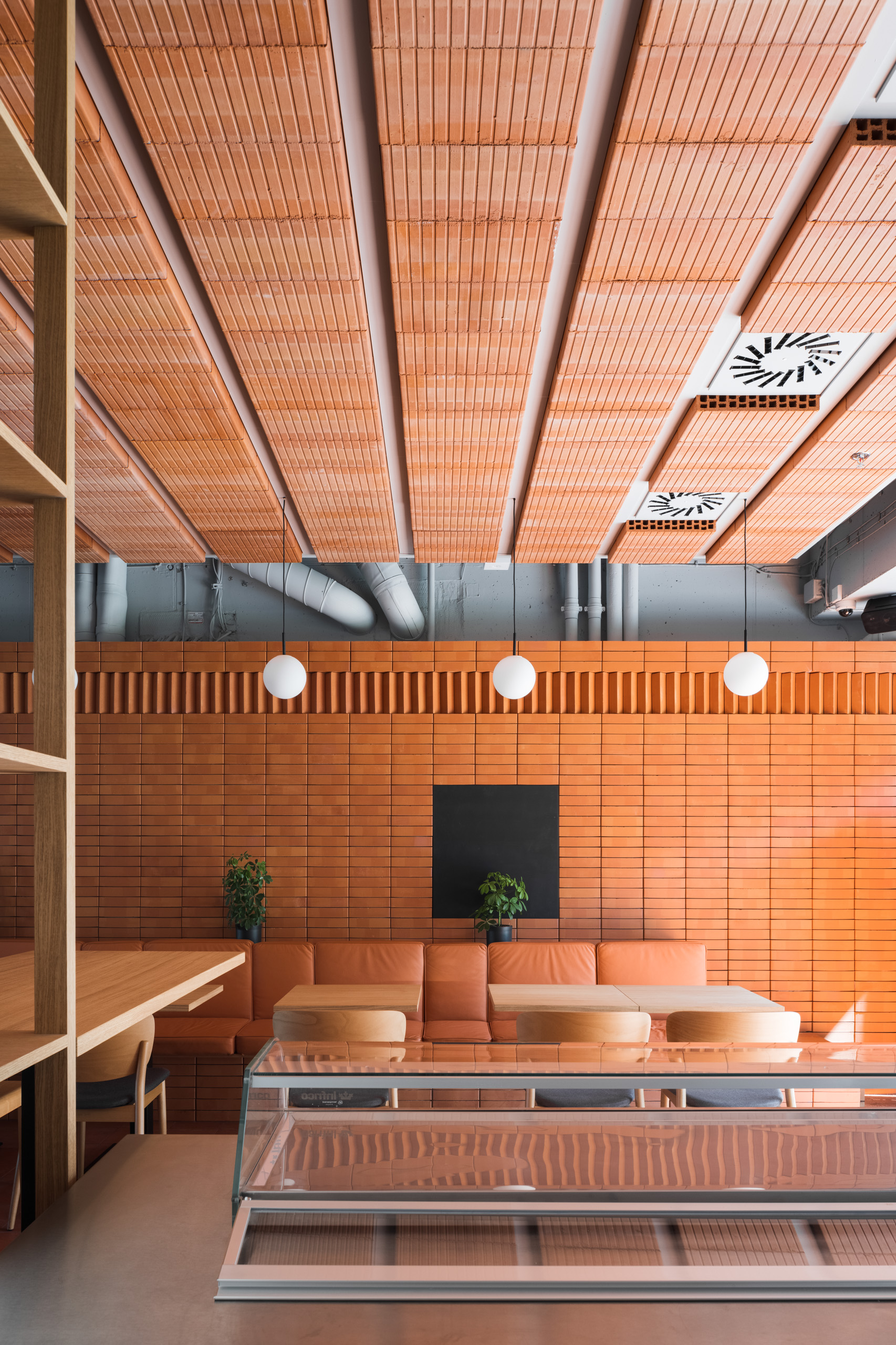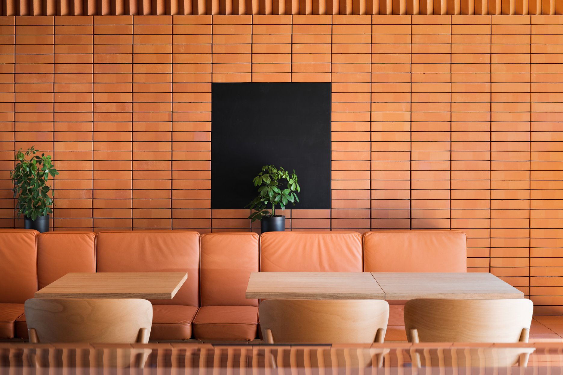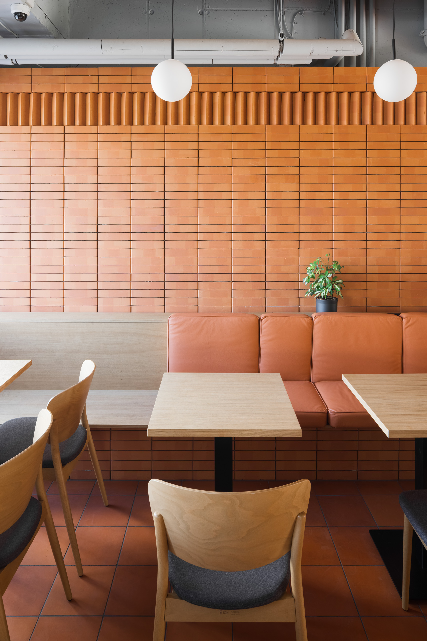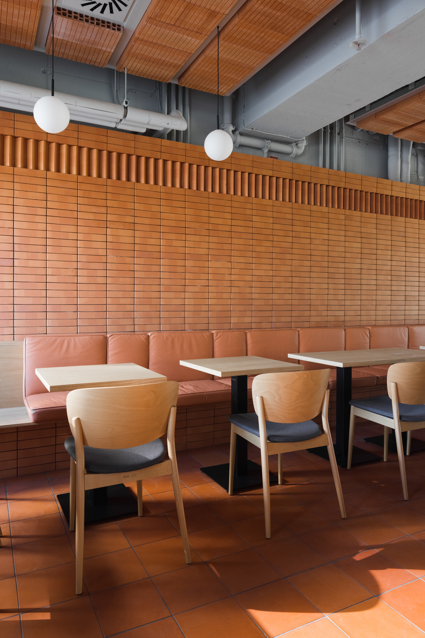 Dominantou interiéru je tehlová predstena s ornamentálnym lemom vertikálne ukladaných tehál a tehlová lavica s koženým čalúnením identickej farebnosti. Pozdĺžnosť priestoru umocňuje rad kruhových svietidiel nad pásom stolov, večer doplnený efektným podsvietením steny. Tehla ako bar, podlaha aj podhľad z tvárnic. Interiér vďaka nej pôsobí́ teplo a nenútene, nevtiera sa. Večerné́ teplé svetlo priestor zintímňuje, zmäkčuje.