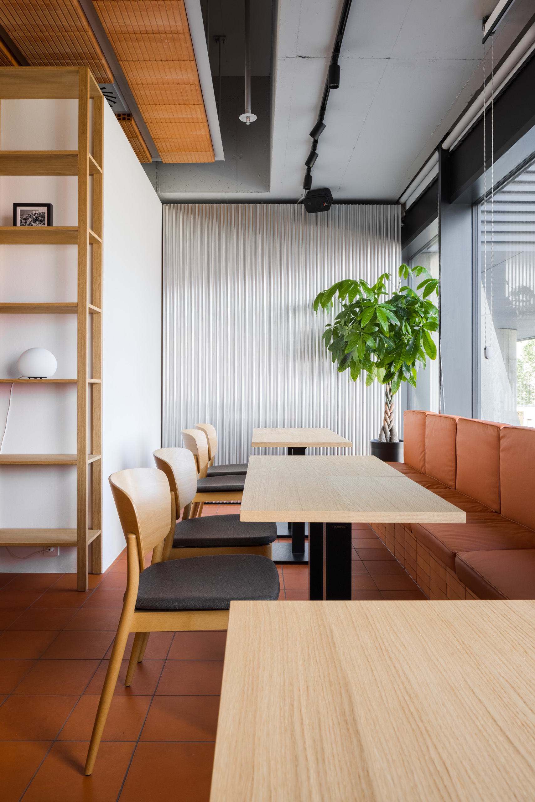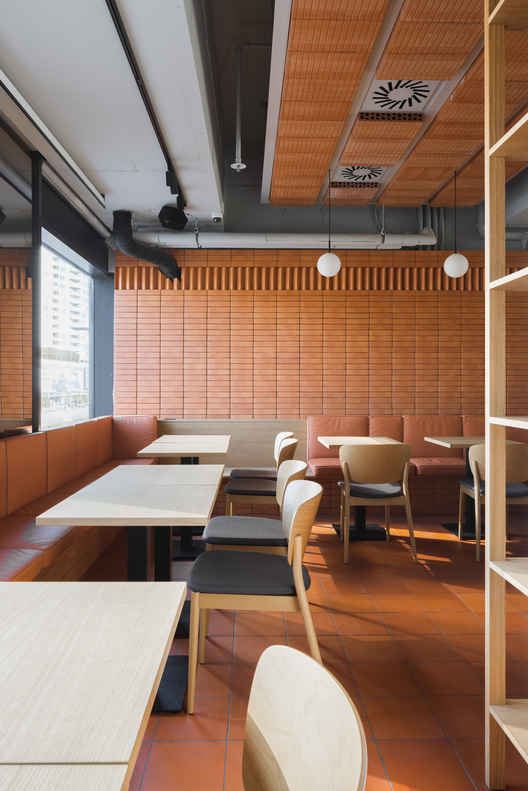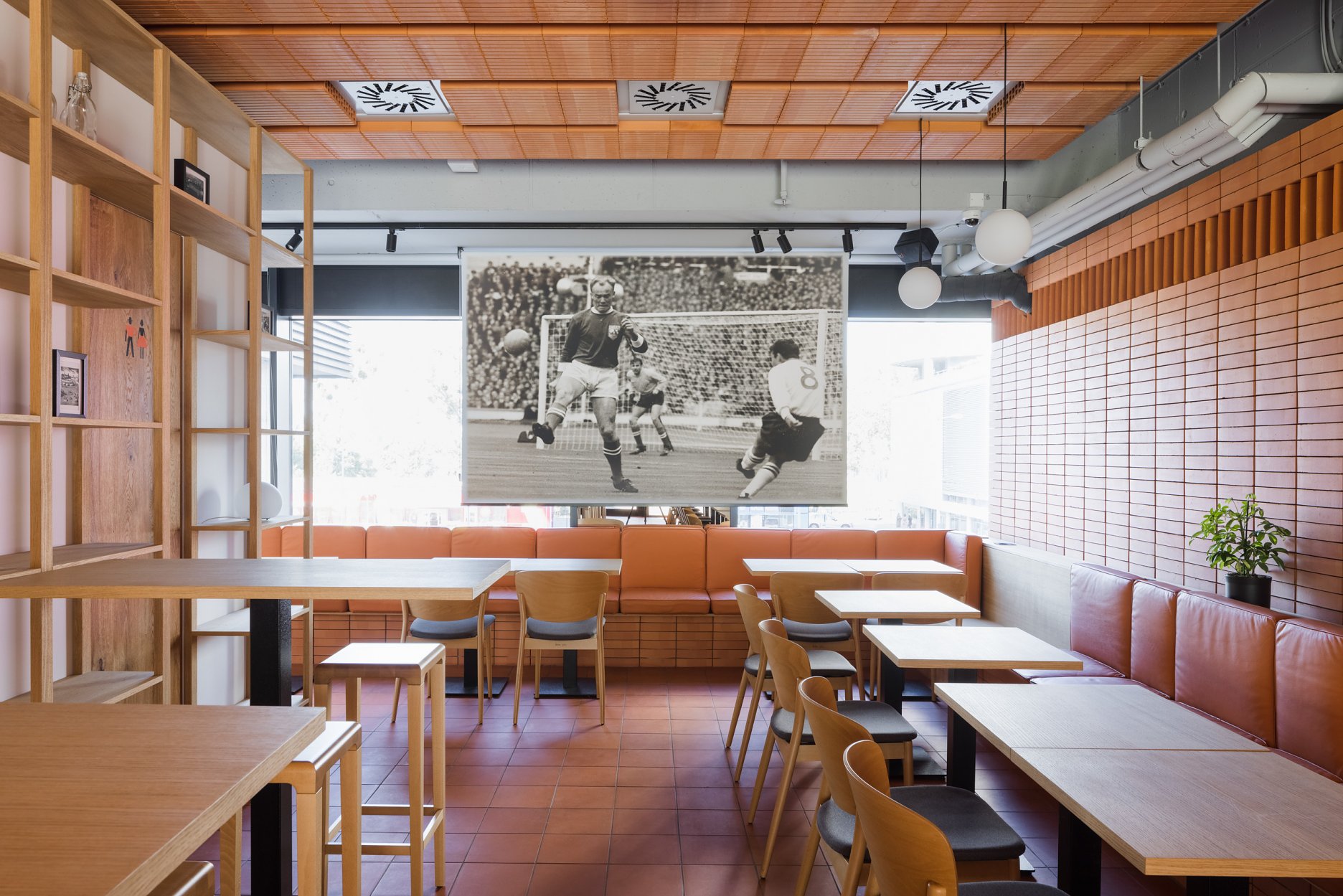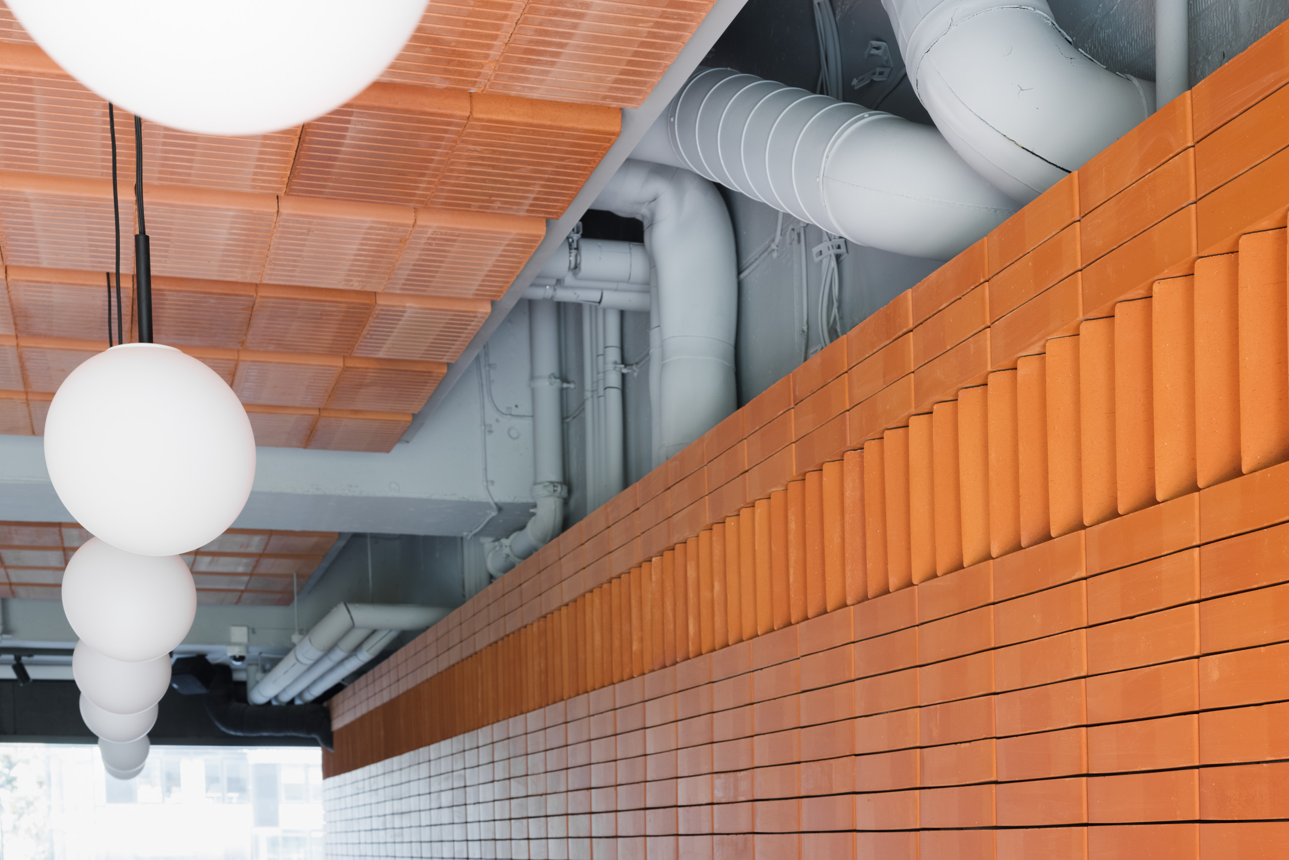 Dominantou interiéru je tehlová predstena s ornamentálnym lemom vertikálne ukladaných tehál a tehlová lavica s koženým čalúnením identickej farebnosti. Pozdĺžnosť priestoru umocňuje rad kruhových svietidiel nad pásom stolov, večer doplnený efektným podsvietením steny. Tehla ako bar, podlaha aj podhľad z tvárnic. Interiér vďaka nej pôsobí́ teplo a nenútene, nevtiera sa. Večerné́ teplé svetlo priestor zintímňuje, zmäkčuje.
