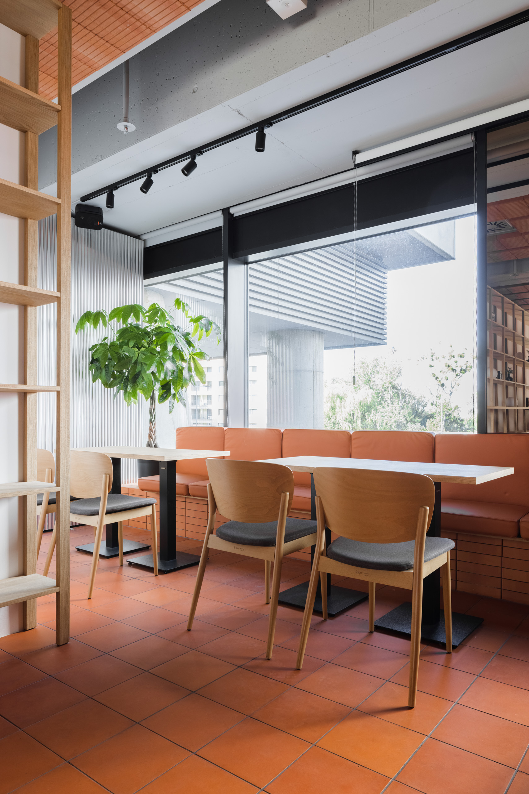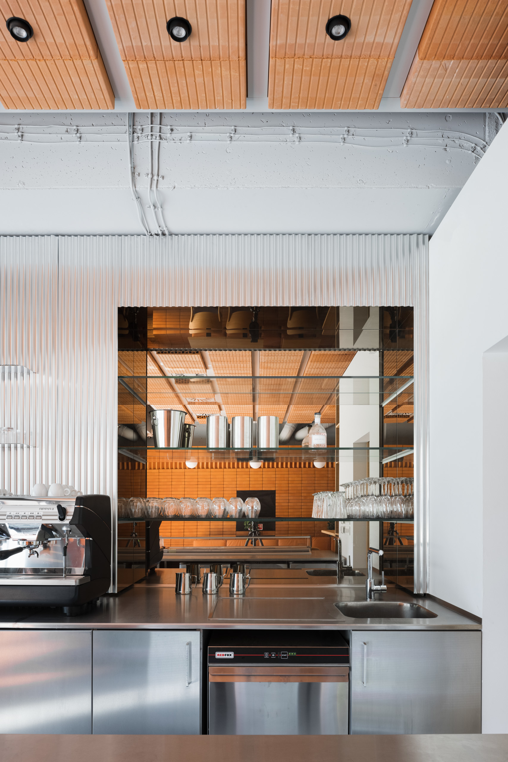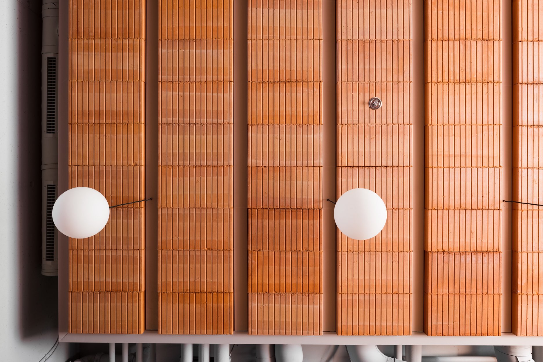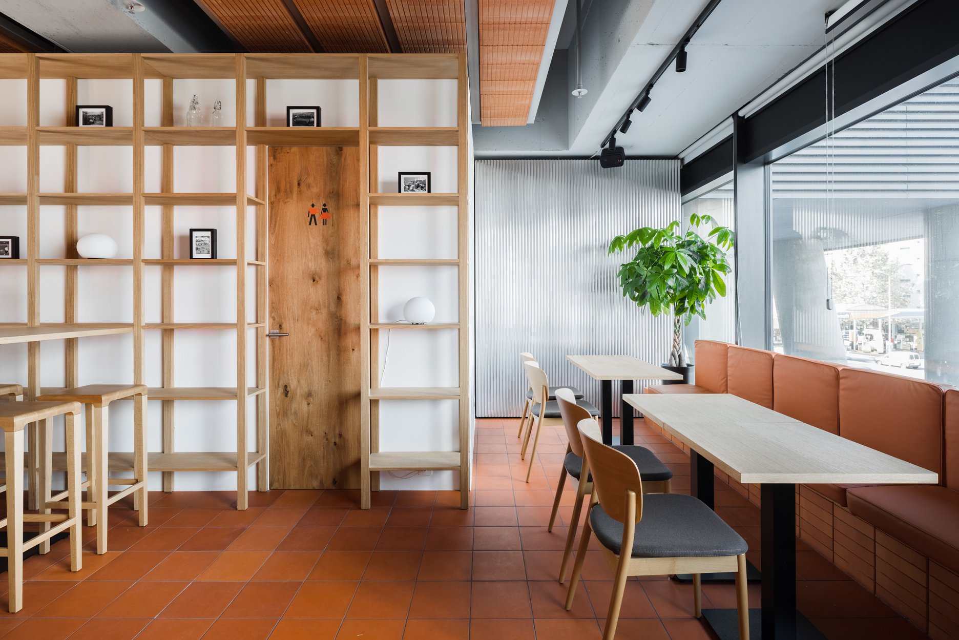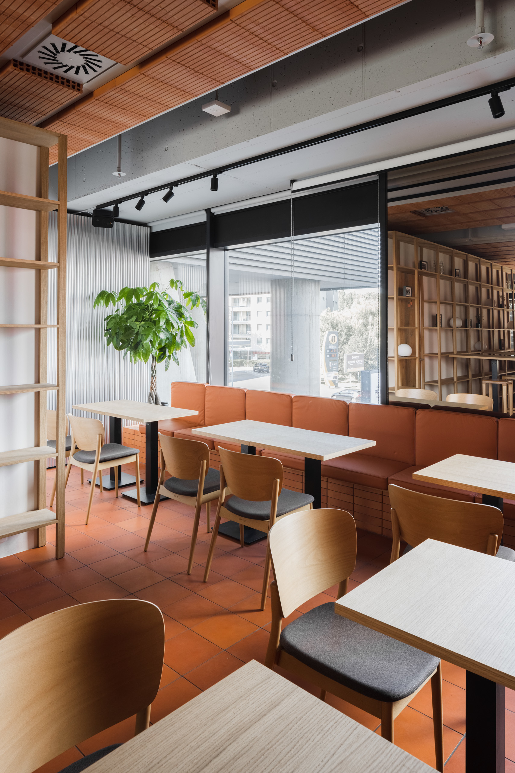 Dominantou interiéru je tehlová predstena s ornamentálnym lemom vertikálne ukladaných tehál a tehlová lavica s koženým čalúnením identickej farebnosti. Pozdĺžnosť priestoru umocňuje rad kruhových svietidiel nad pásom stolov, večer doplnený efektným podsvietením steny. Tehla ako bar, podlaha aj podhľad z tvárnic. Interiér vďaka nej pôsobí́ teplo a nenútene, nevtiera sa. Večerné́ teplé svetlo priestor zintímňuje, zmäkčuje.