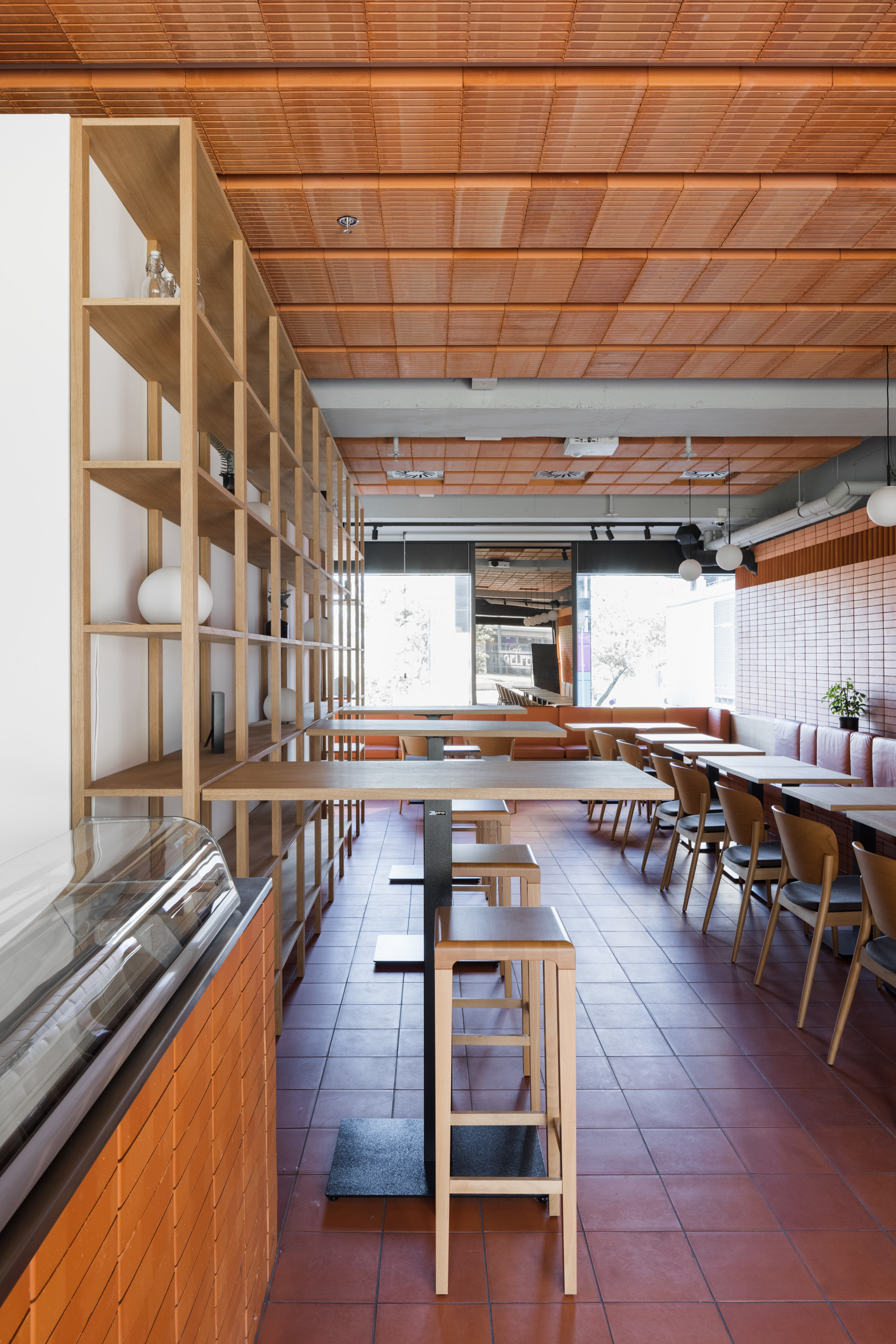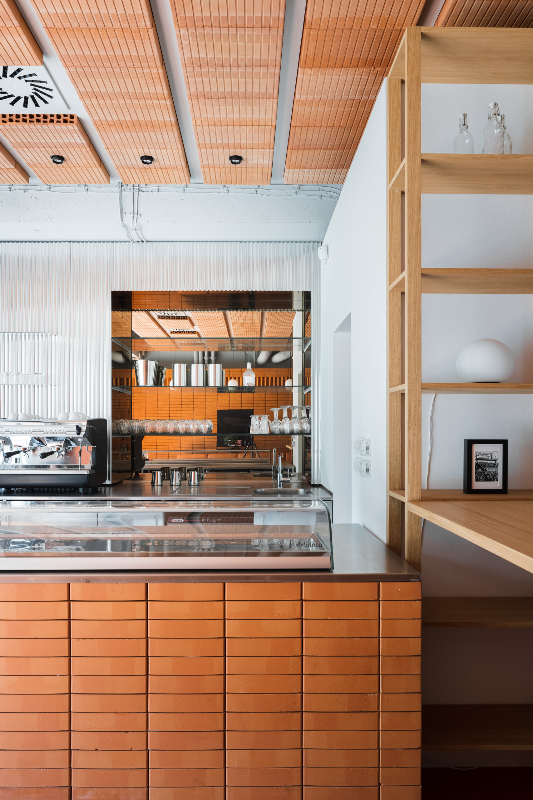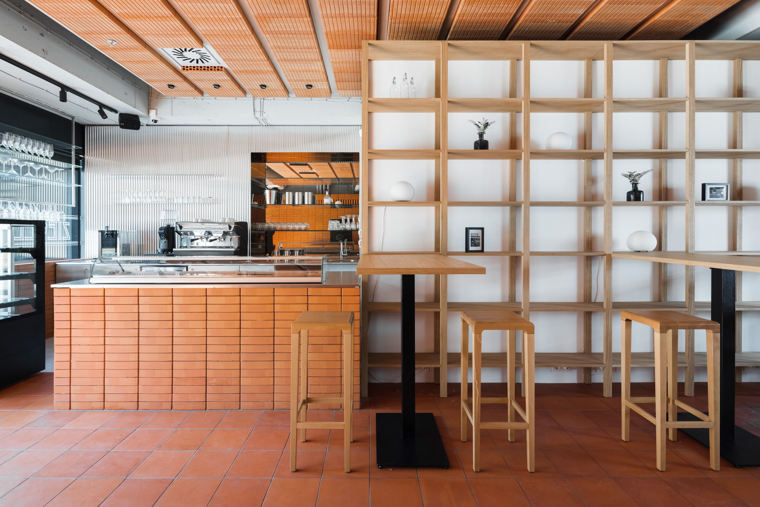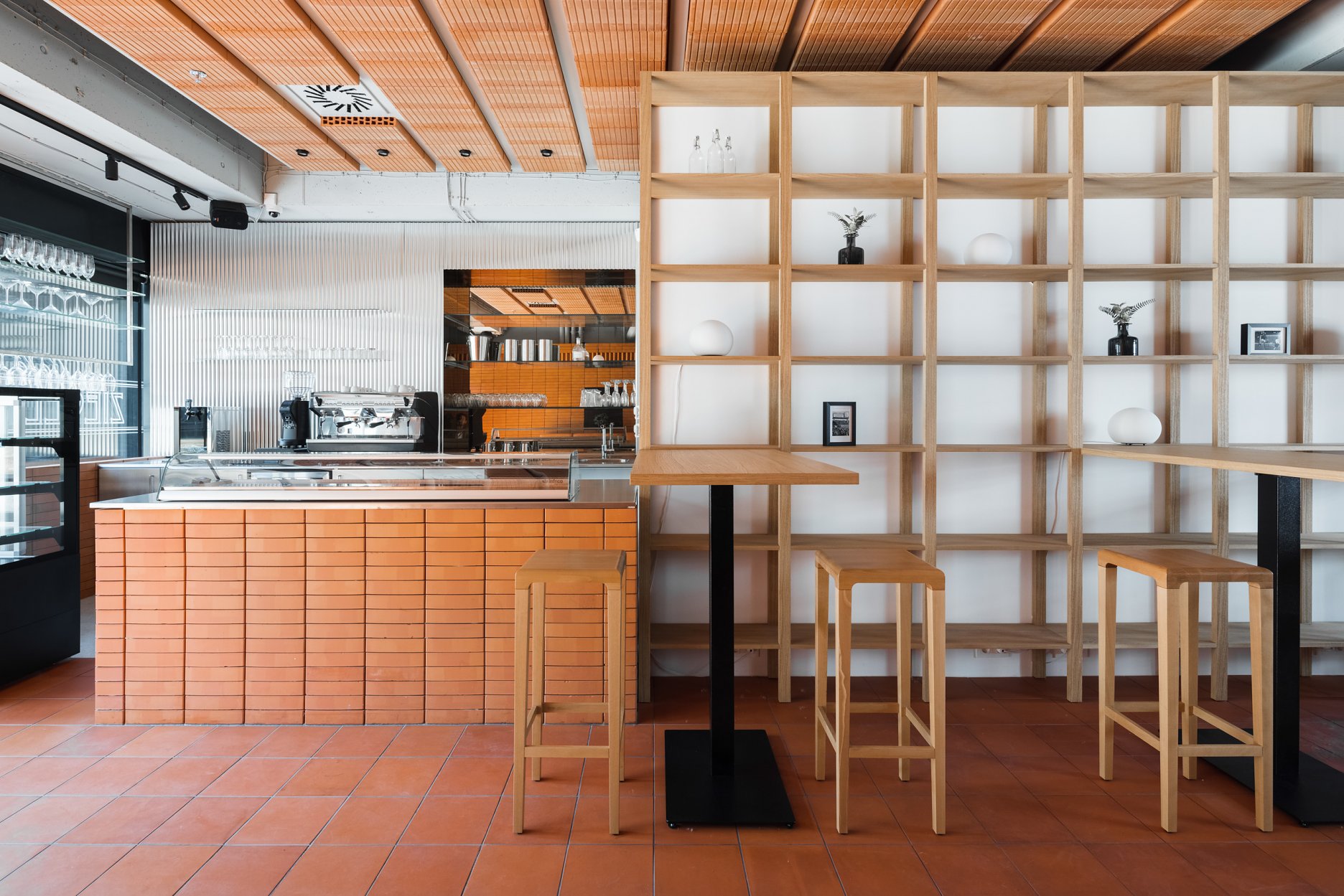 Jasne členený priestor kaviarne na živo prekvapí príjemným obojstranným svetlom. Uzatvorený priestor sa stáva akýmsi medzipriestorom plynúcim medzi novovytvoreným námestím na plató bytového domu a rušnou Bajkalskou ulicou.