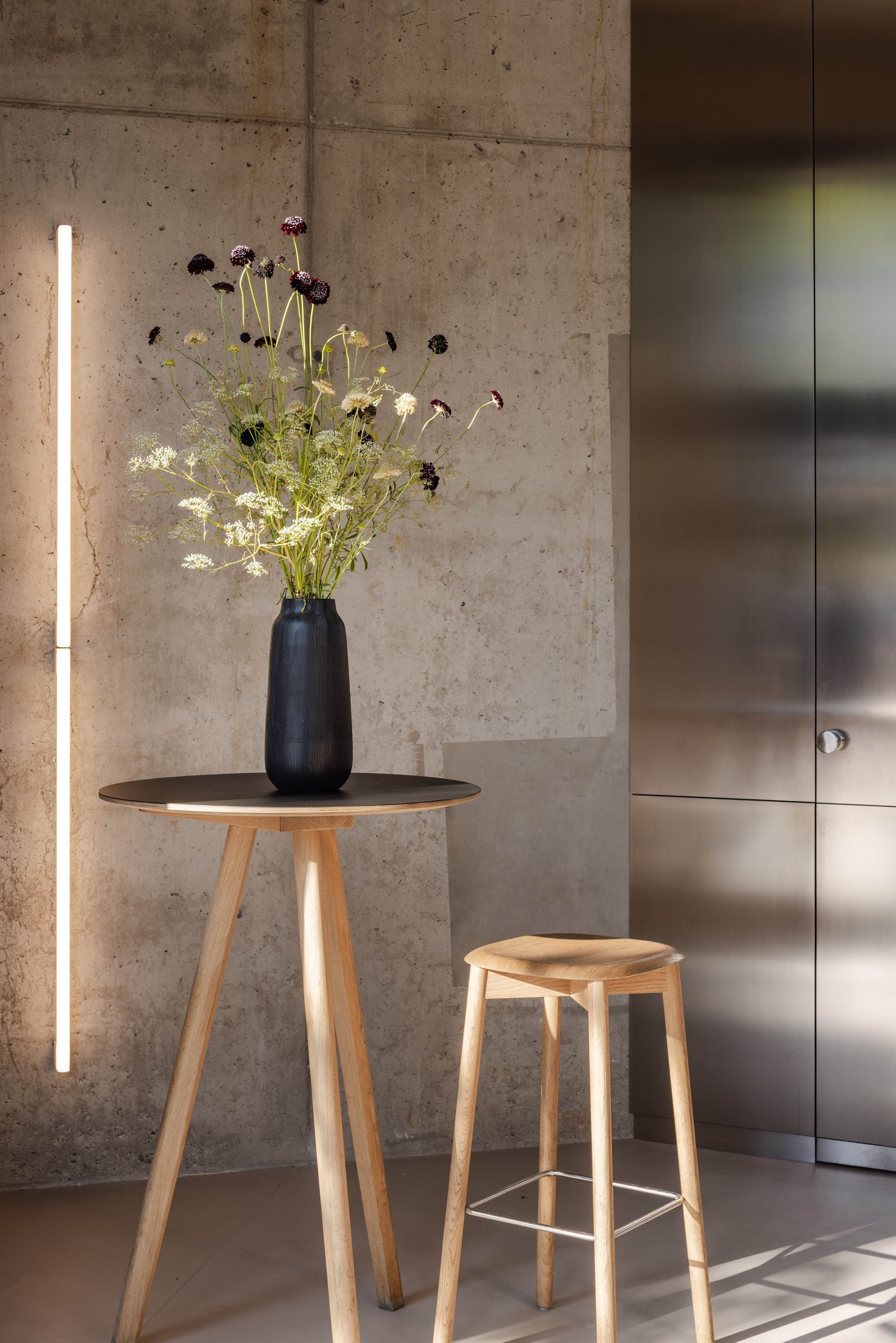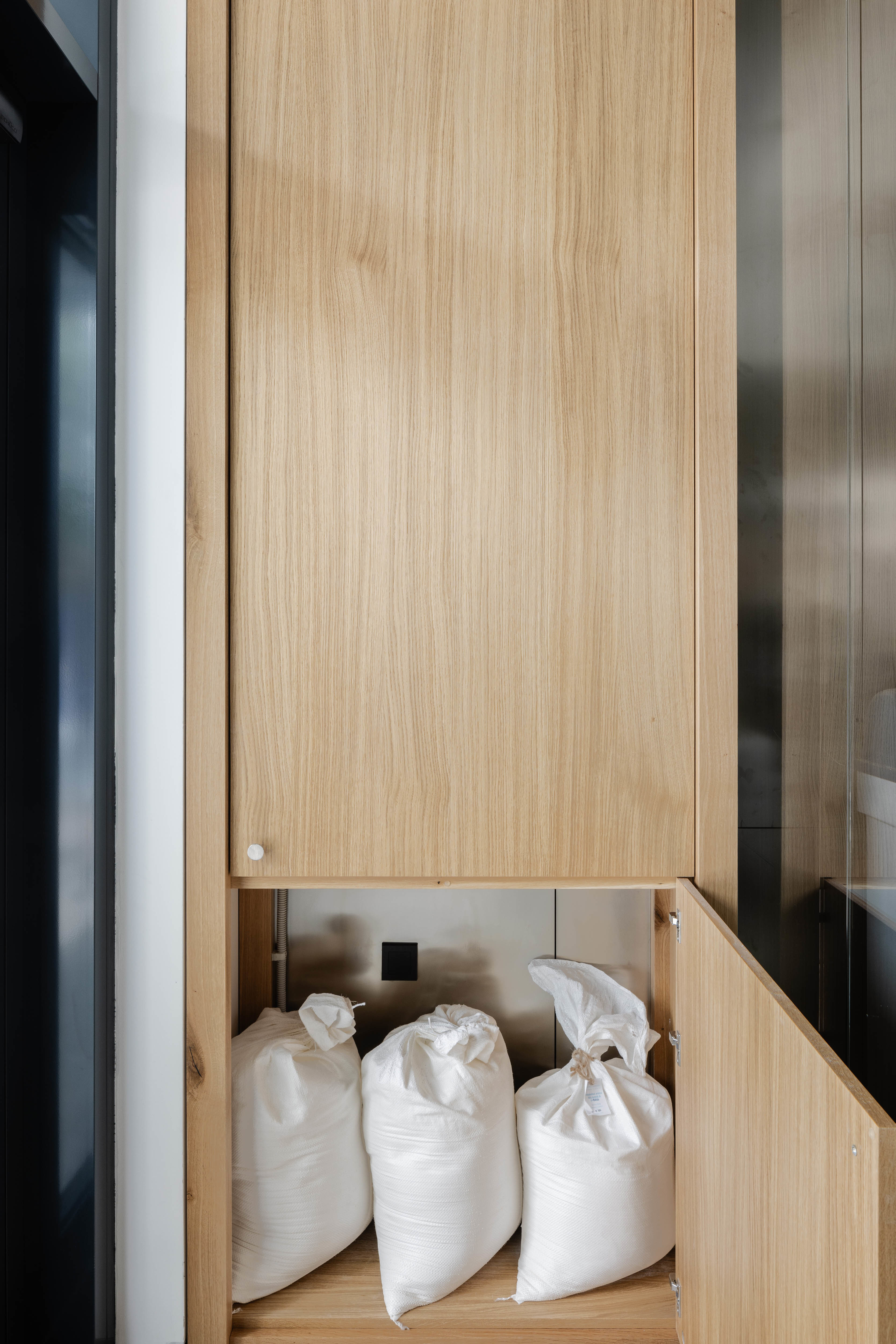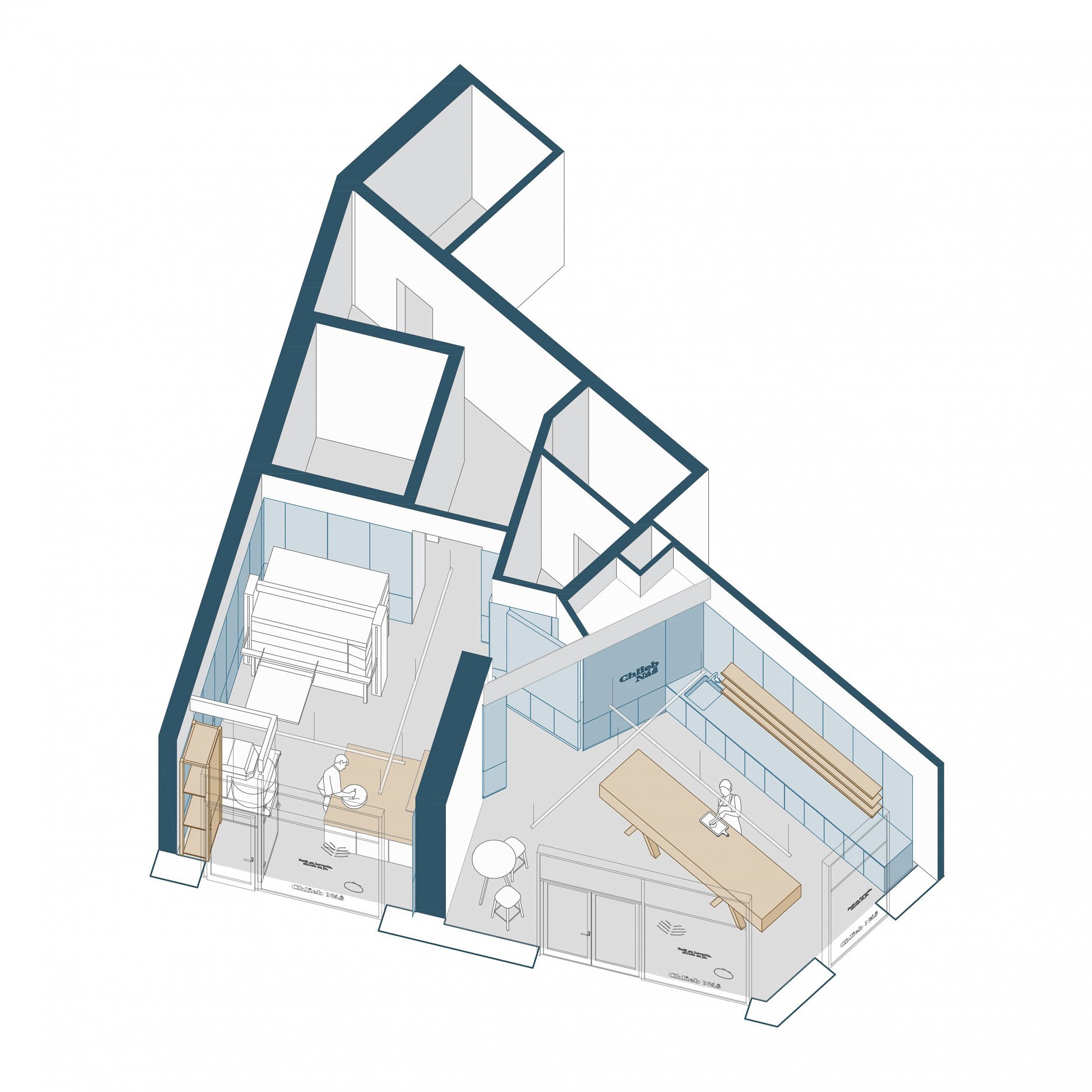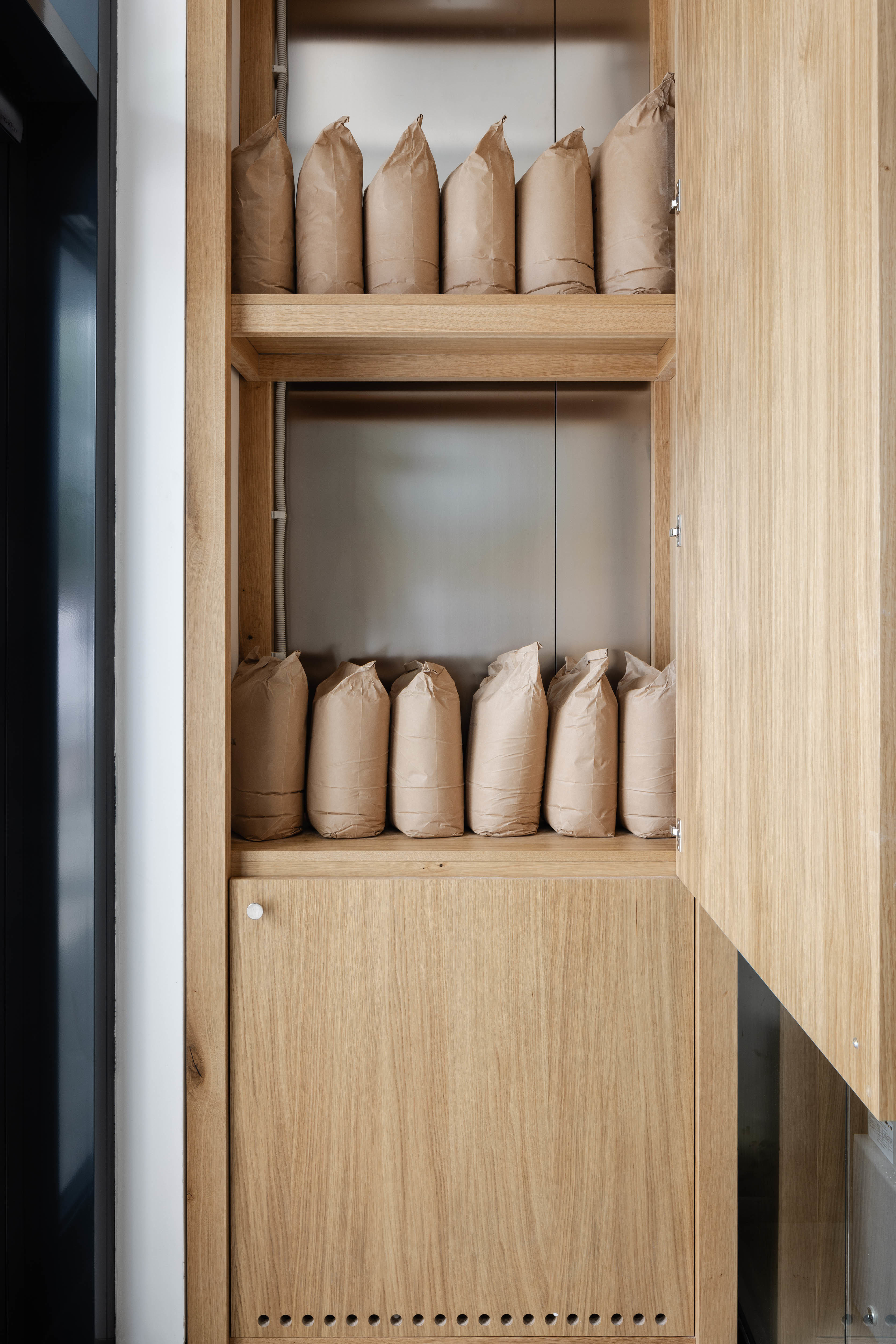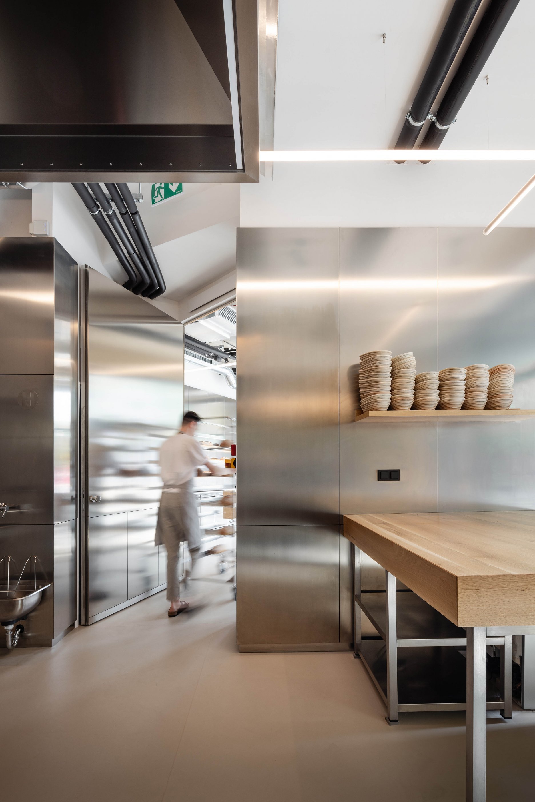 Prepojenosť jednotlivých častí prevádzky umocňuje nerezová stena, ktorá plynule prechádza z jednej časti do druhej. Hlavné pracovné plochy ručnej prípravy ako aj predajný pult sú drevené. Pult formálne nadväzuje na Trnavskú prevádzku a odkazuje na remeselný charakter prípravy.