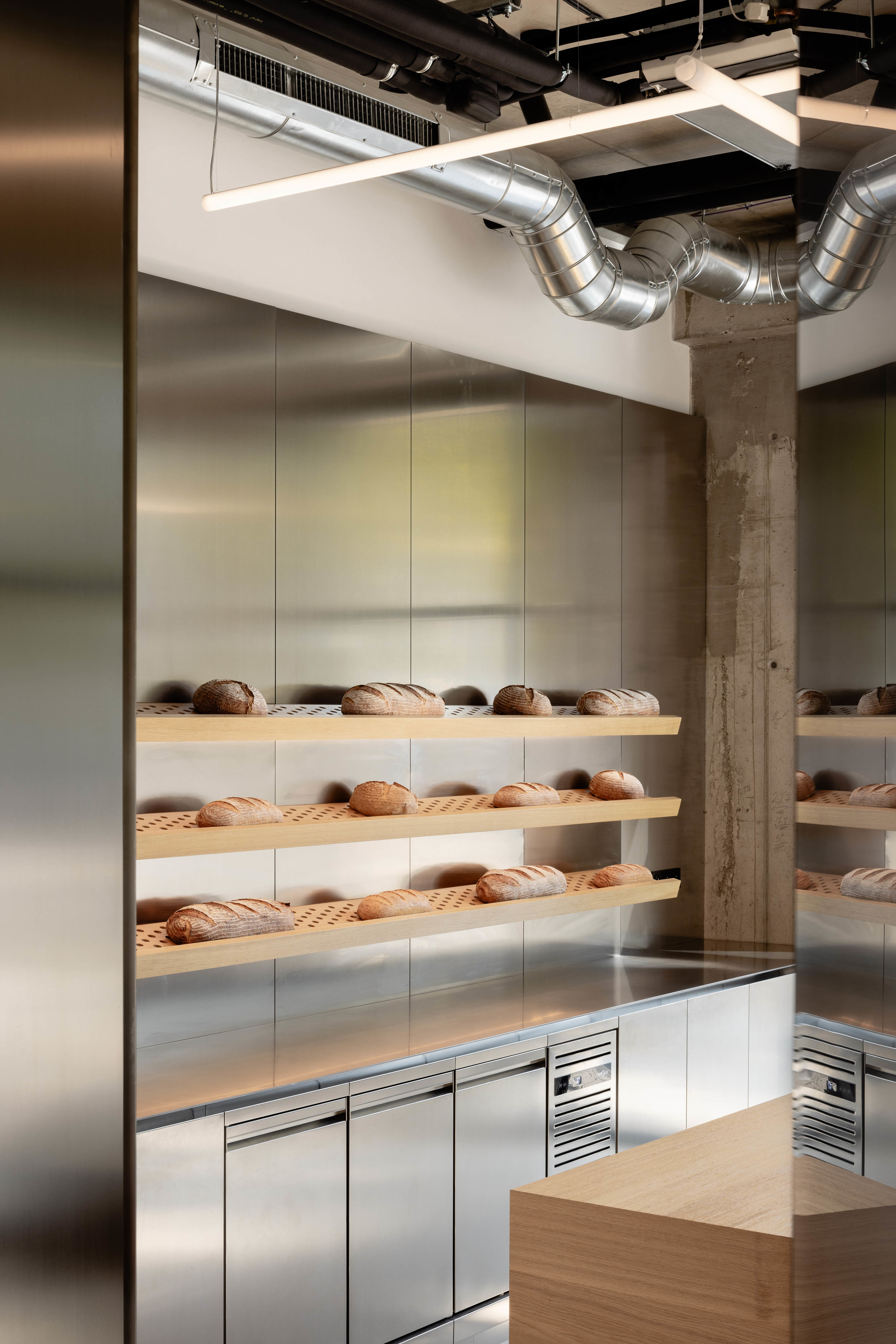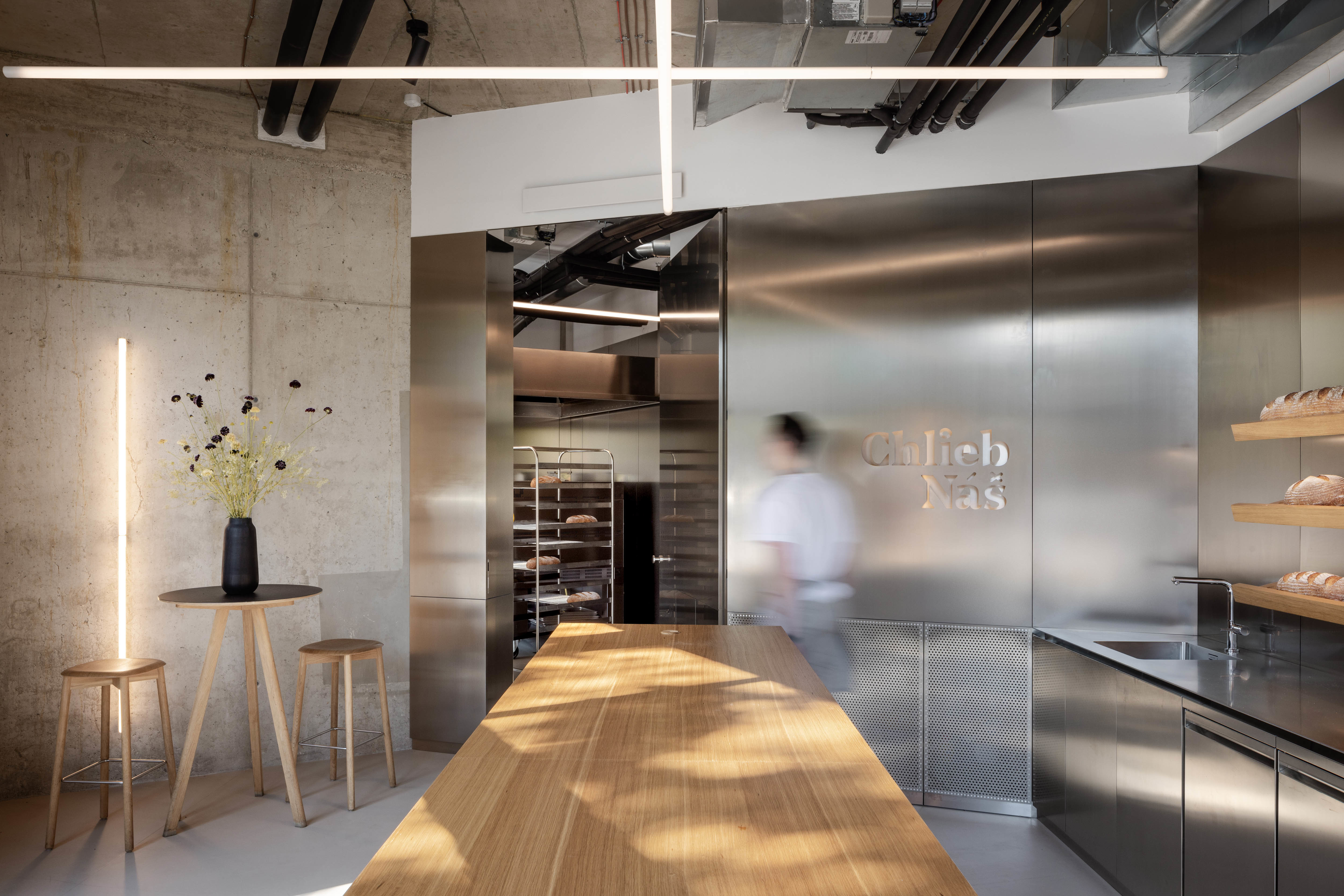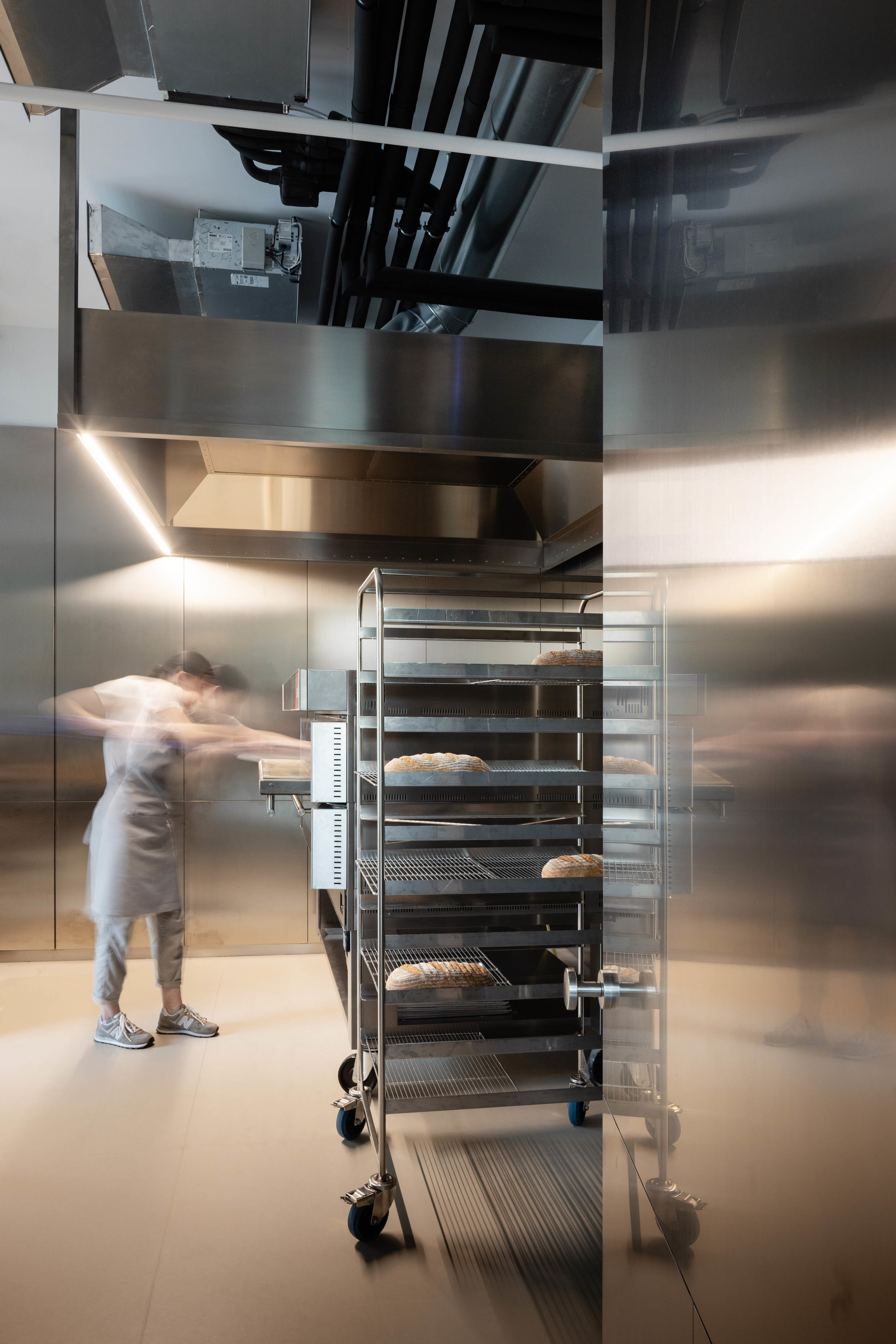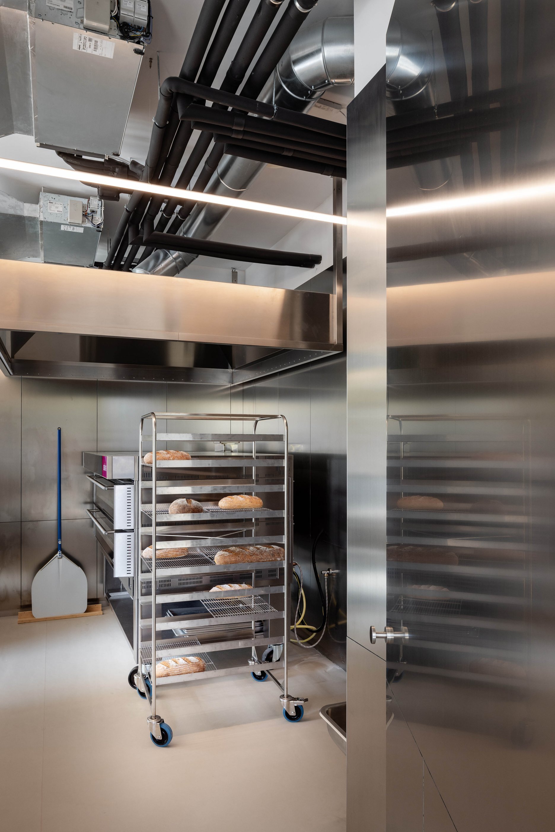 Odrazy osvetlenia v nerezových povrchoch násobia relatívne malý priestor prevádzky. Líniové svietidlá svojou pozíciou označujú hlavné momenty zrodenia a výdaja chleba.