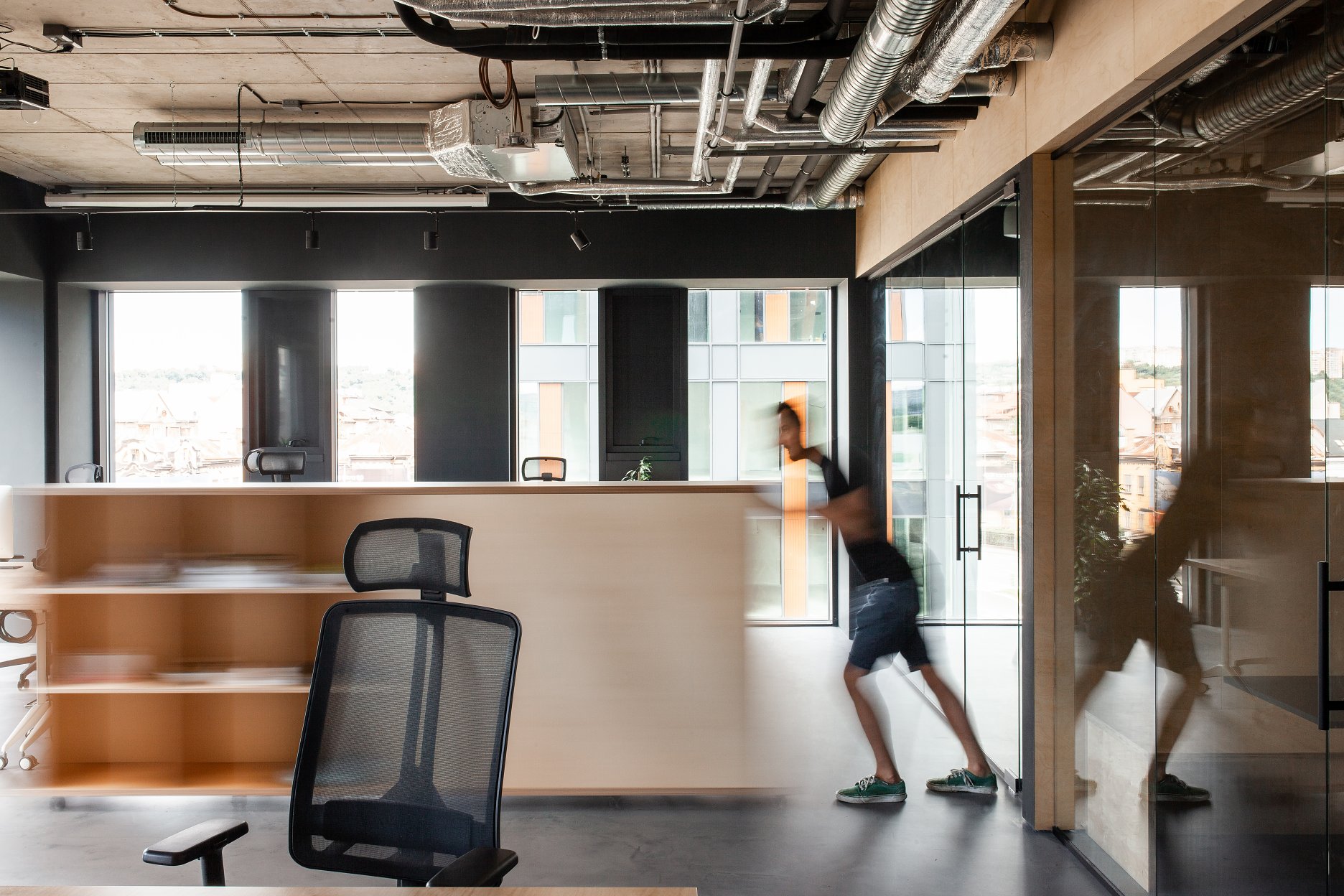 Generické priestory kancelárskej budovy. Drobné, ale účelné zmeny dispozície, využitie konštrukčnej estetiky stavebného základu, nové vložené prvky s poctivou materialitou. Výsledkom je pracovisko, ktoré nespadá do štandardných šablón, formovaných korporátnou vizuálnou identitou. Namiesto “fancy” riešení sa architekt zameral na prehľadnosť a ergonómiu pracovného prostredia.