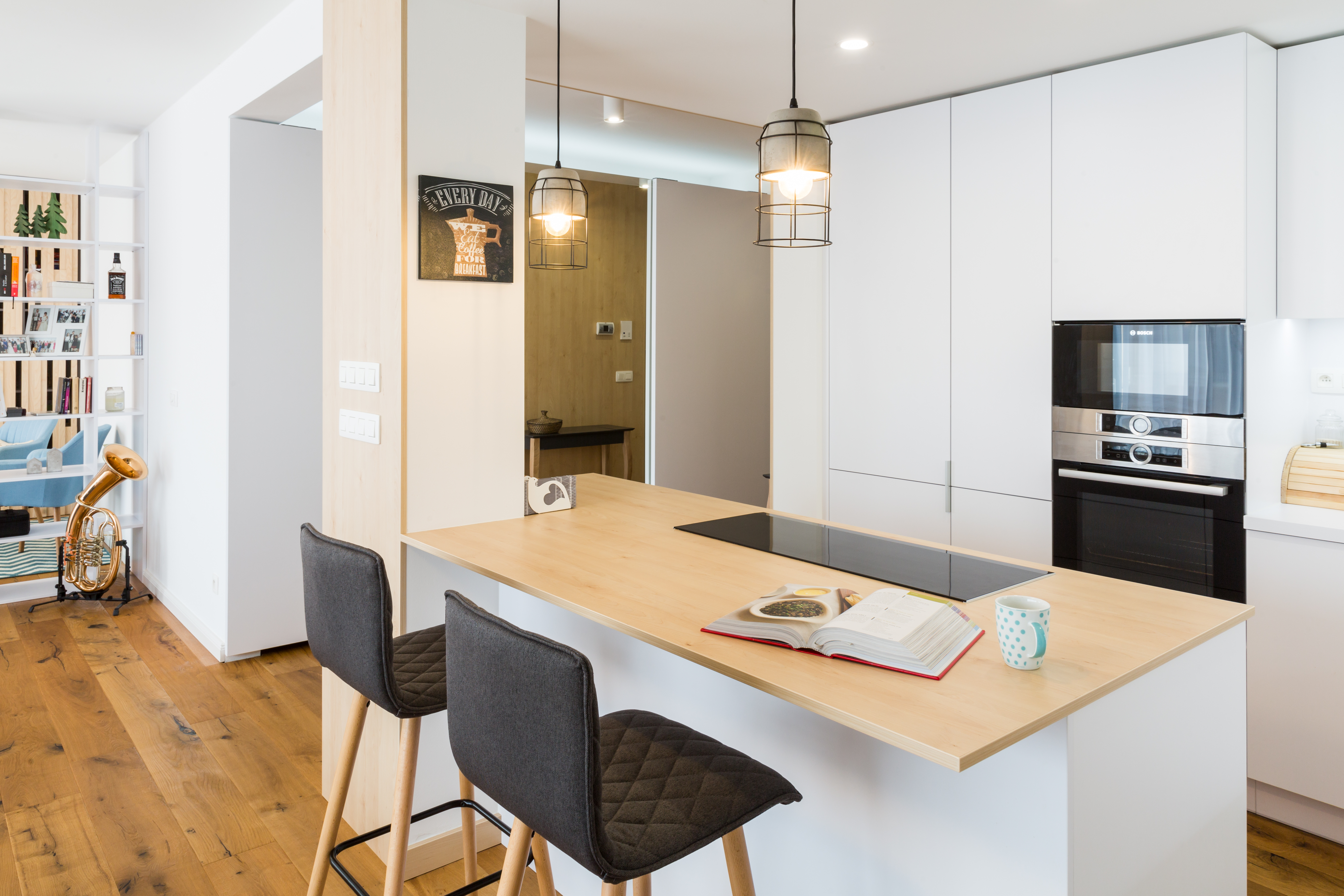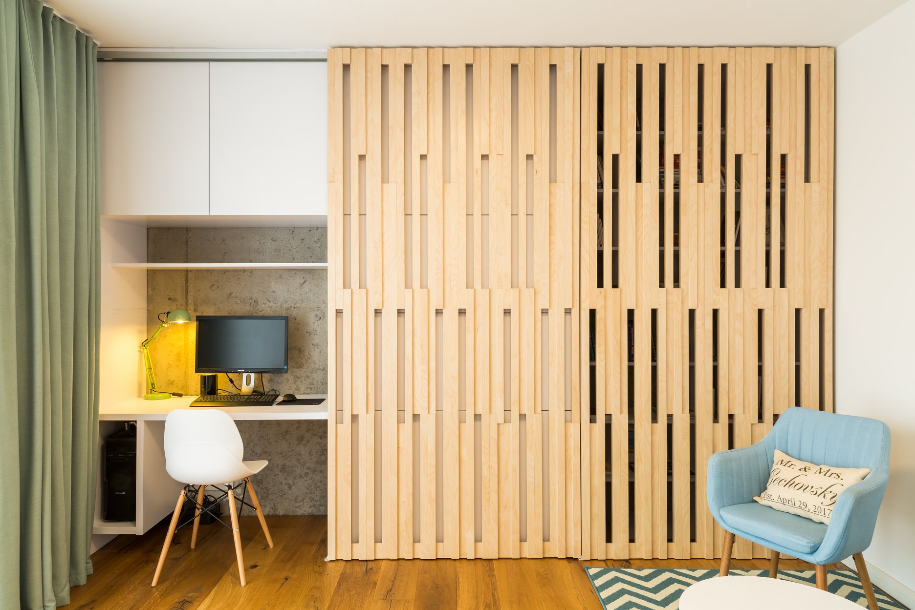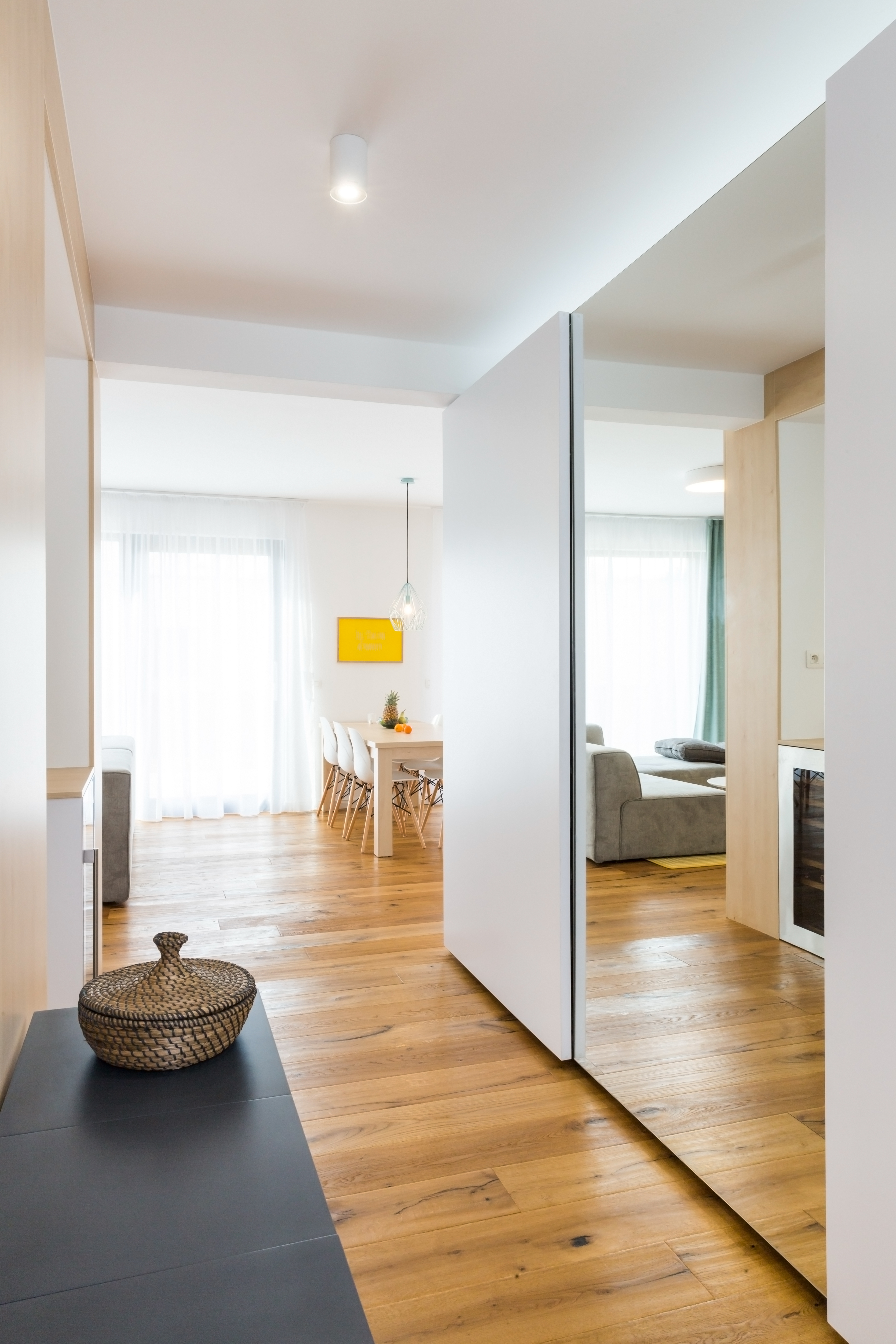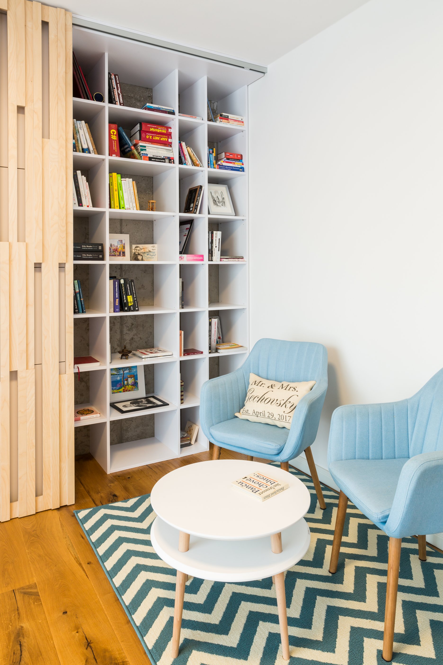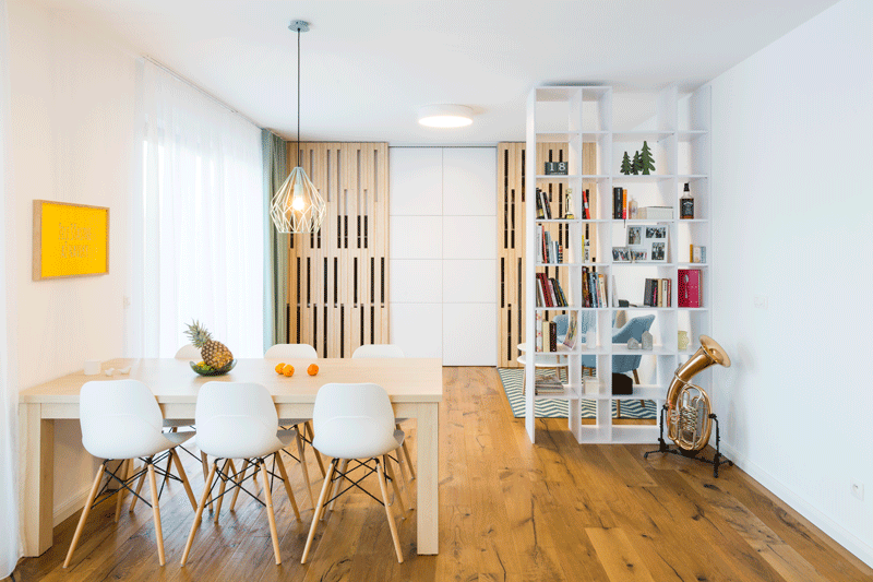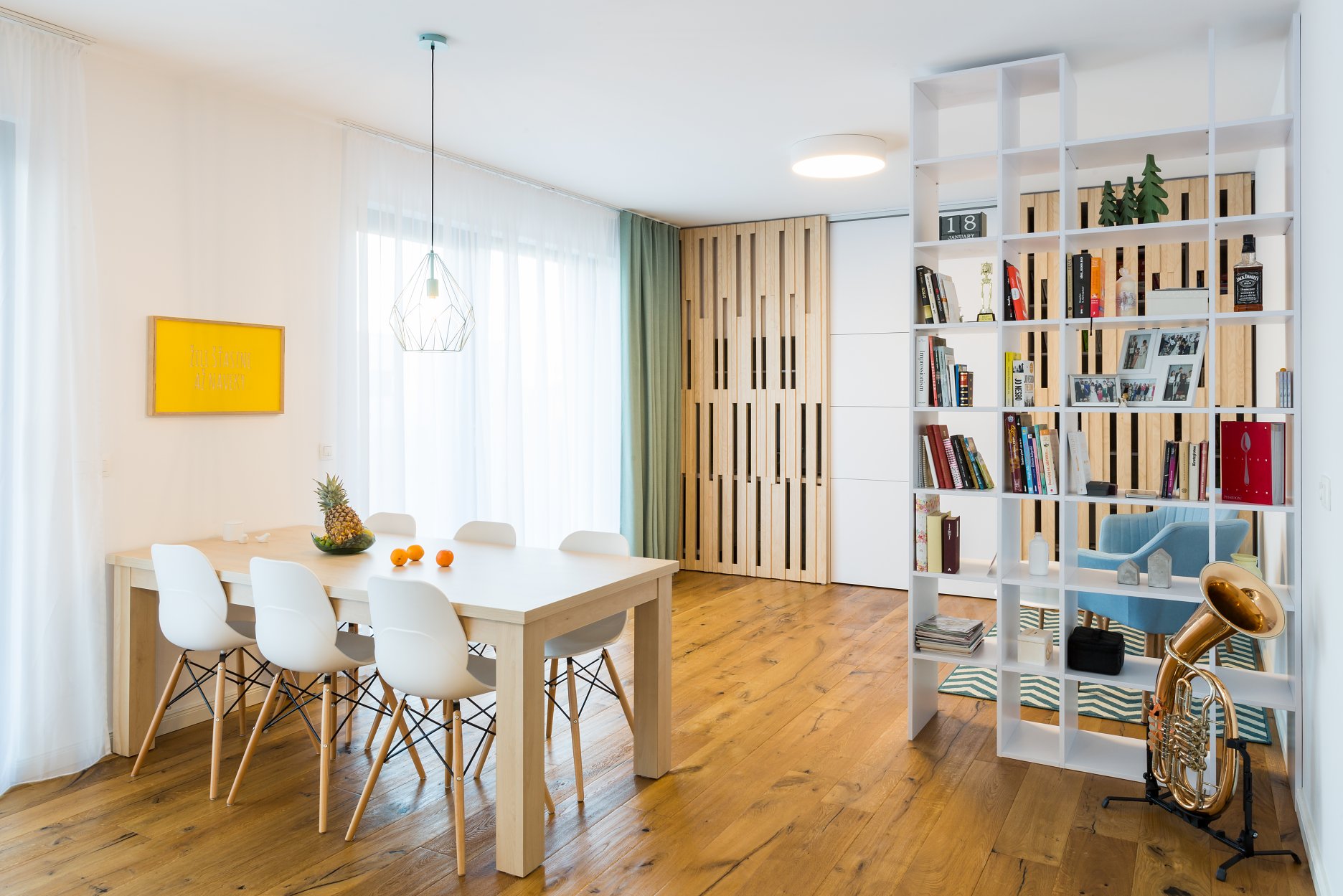Dispozícia bytu sa upravila tak, aby vznikol veľkorysý spoločenský priestor. Kuchyňa je navrhnutá s pracovným ostrovom, ktorý ju oddeľuje od obývacej izby a vytvára barové sedenie. Obývacia izba plynule prechádza do jedálne a oddychovej zóny. Opticky je oddelená knižnicou, je určená na čítanie a prácu. Pracovný kút ako aj druhá časť knižnice sú rafinovane schované za posuvnými drevenými panelmi s perforáciou a jemným reliéfom. Tento prvok sa opakuje aj v kúpeľni nad práčkou a sušičkou, kde bol navrhnutý úložný priestor.