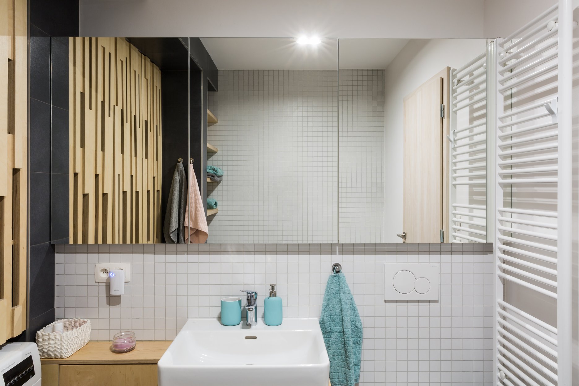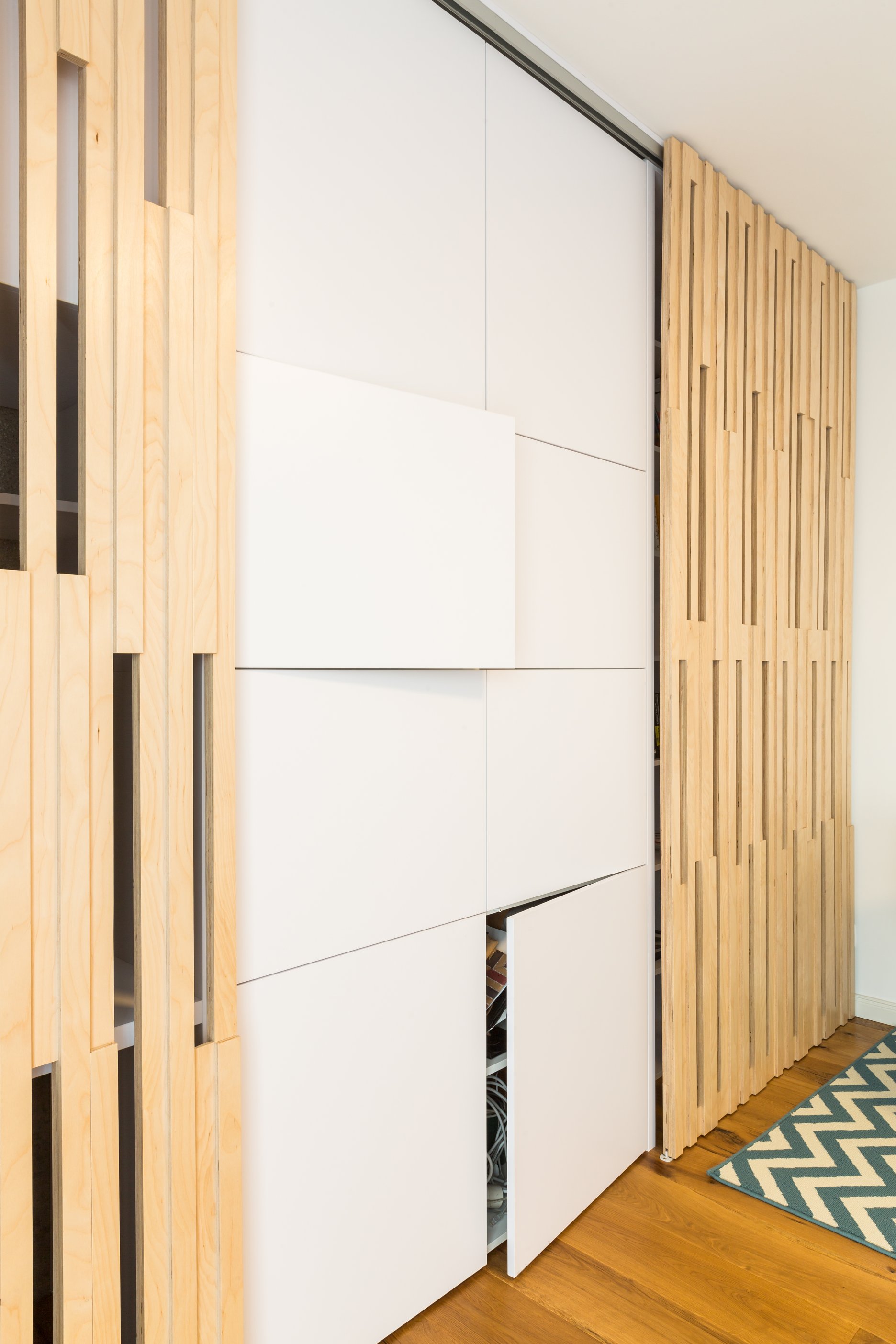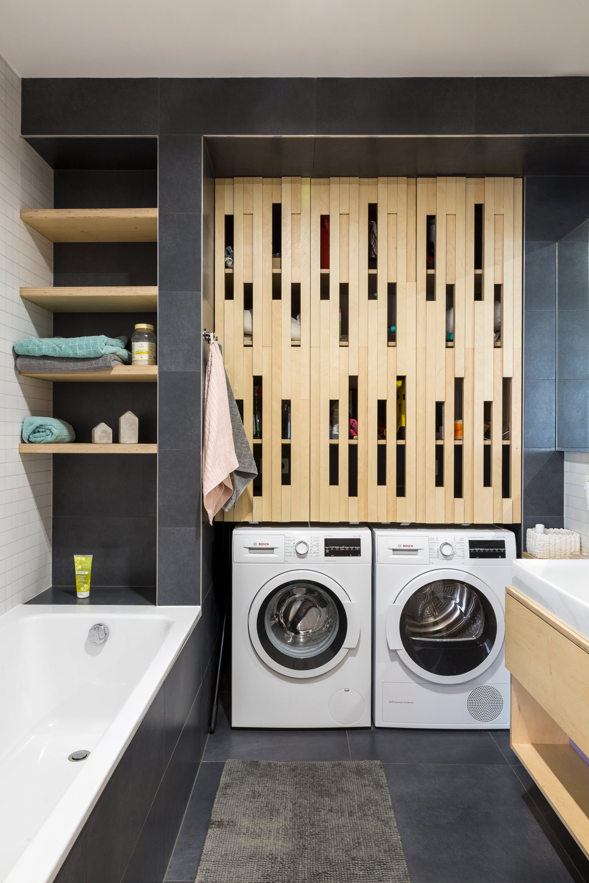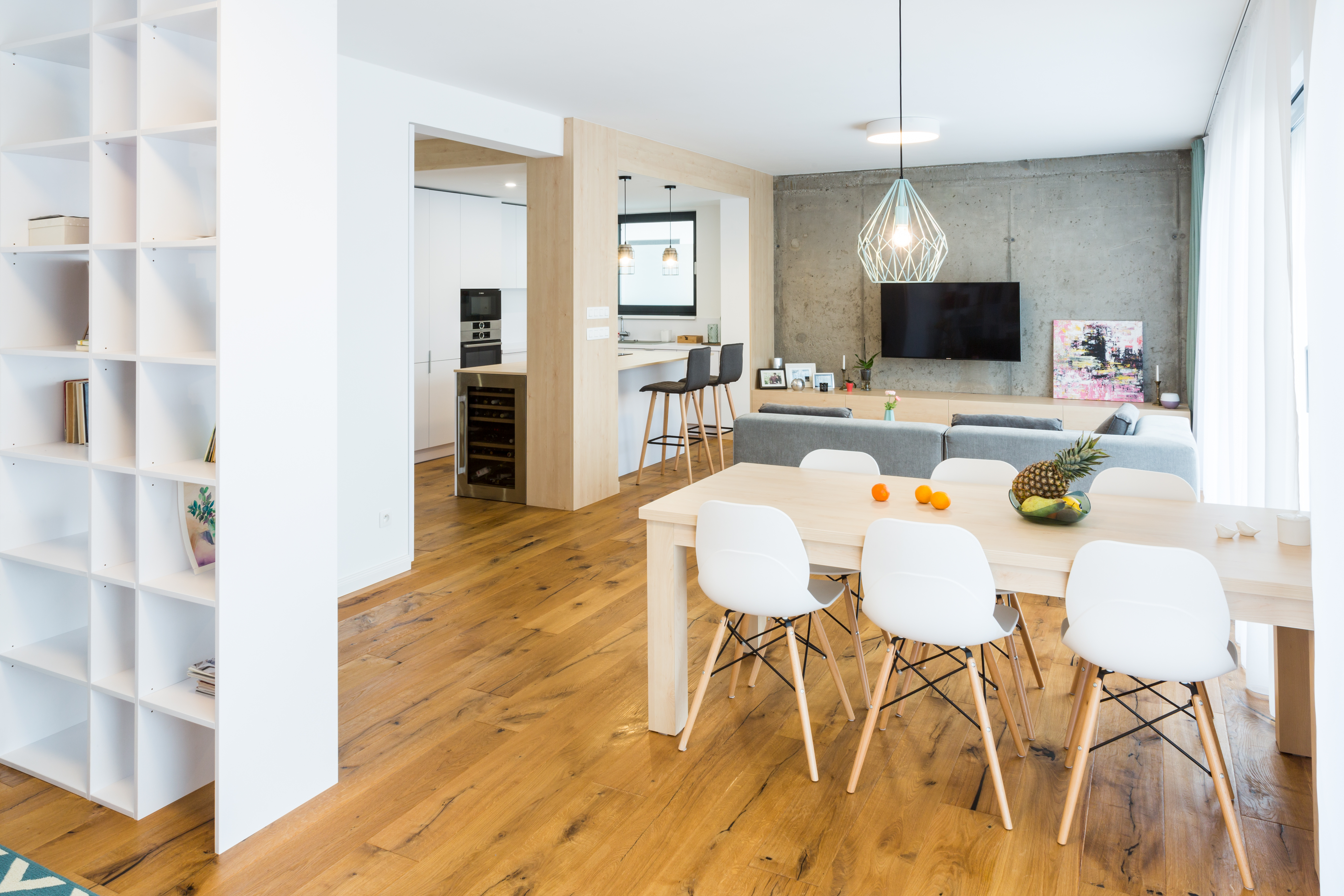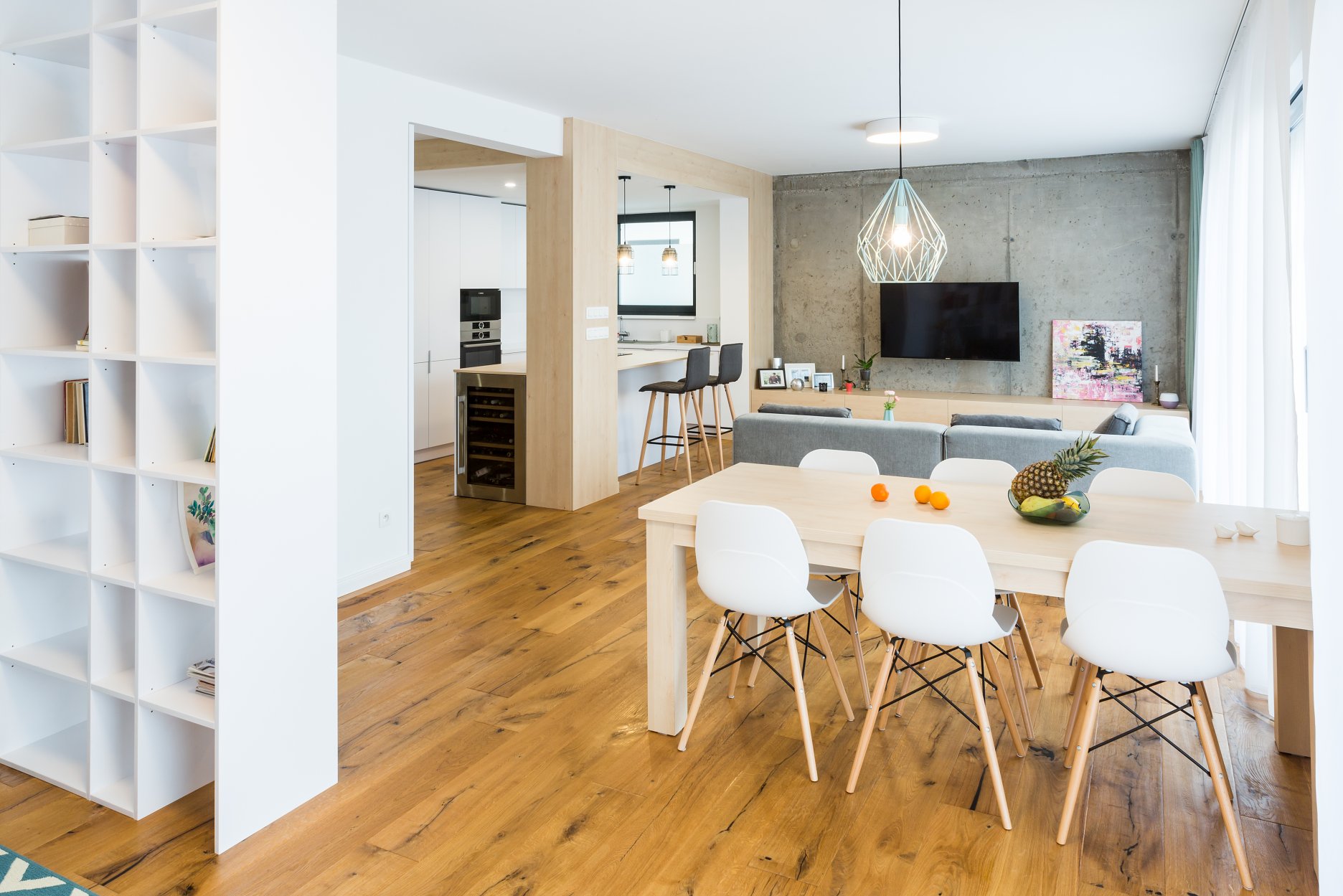 Dispozícia bytu sa upravila tak, aby vznikol veľkorysý spoločenský priestor. Kuchyňa je navrhnutá s pracovným ostrovom, ktorý ju oddeľuje od obývacej izby a vytvára barové sedenie. Obývacia izba plynule prechádza do jedálne a oddychovej zóny. Opticky je oddelená knižnicou, je určená na čítanie a prácu. Pracovný kút ako aj druhá časť knižnice sú rafinovane schované za posuvnými drevenými panelmi s perforáciou a jemným reliéfom. Tento prvok sa opakuje aj v kúpeľni nad práčkou a sušičkou, kde bol navrhnutý úložný priestor.