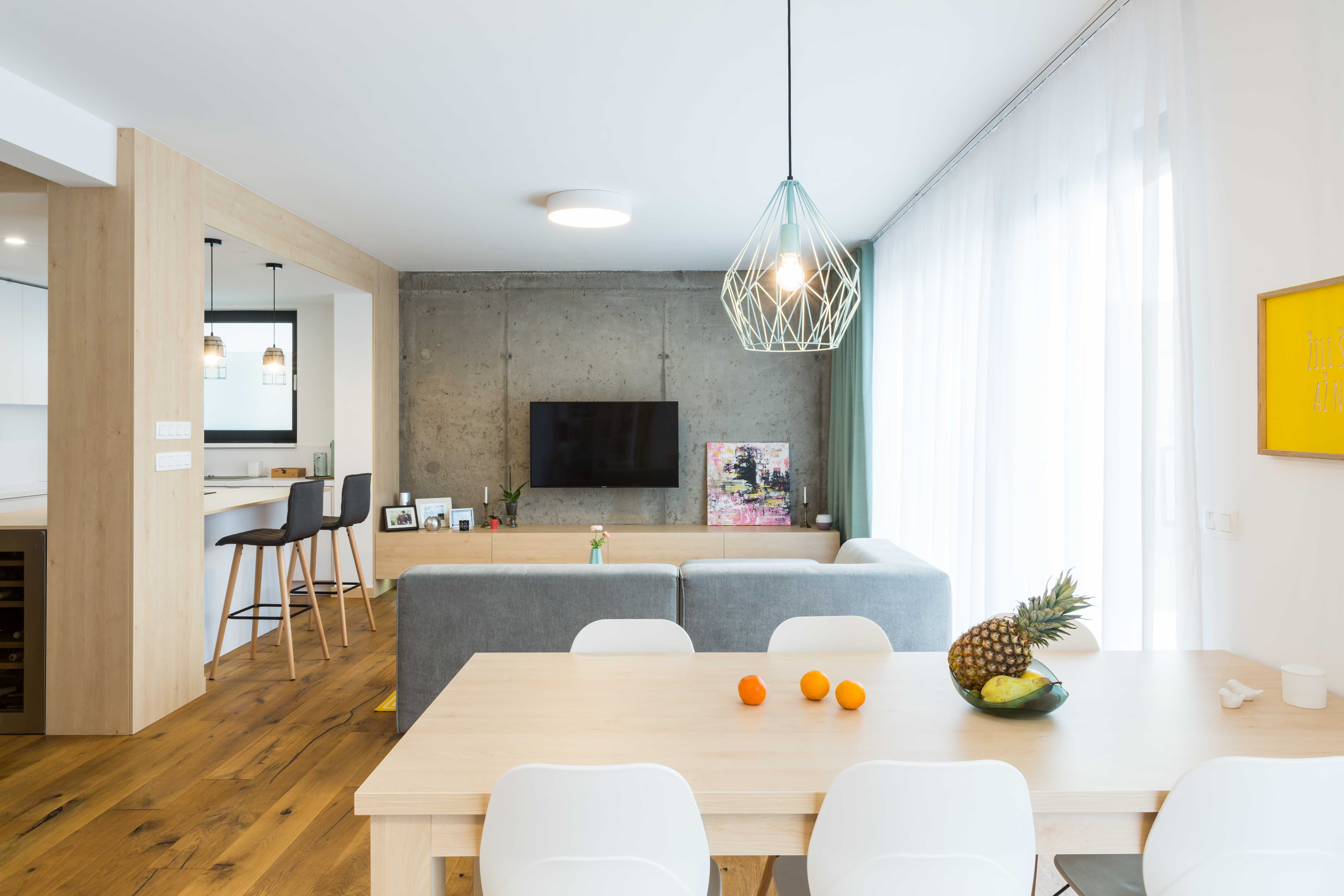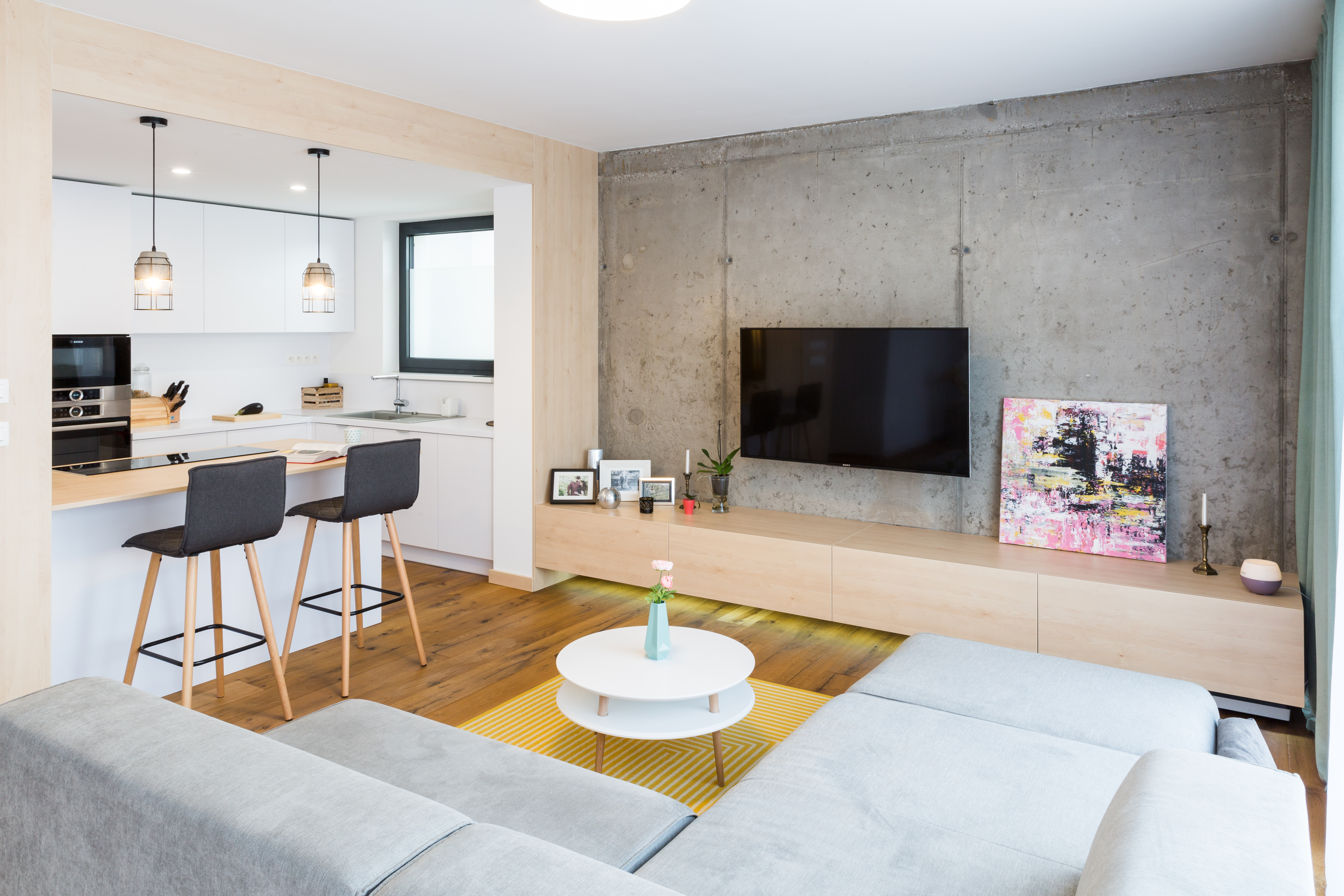 V obývacej izbe sa podarilo zachovať obvodové betónové steny. Celý interiér je ladený v bledých odtieňoch, prevláda biela farba v kombinácii s dreveným dekorom a jemné mentolové akcenty. Drevo vo forme veľkoformátového obkladu sa objavuje vo vstupe a prechádza až ku kuchynskému kútu, na podlahe sú použité drevené parkety.