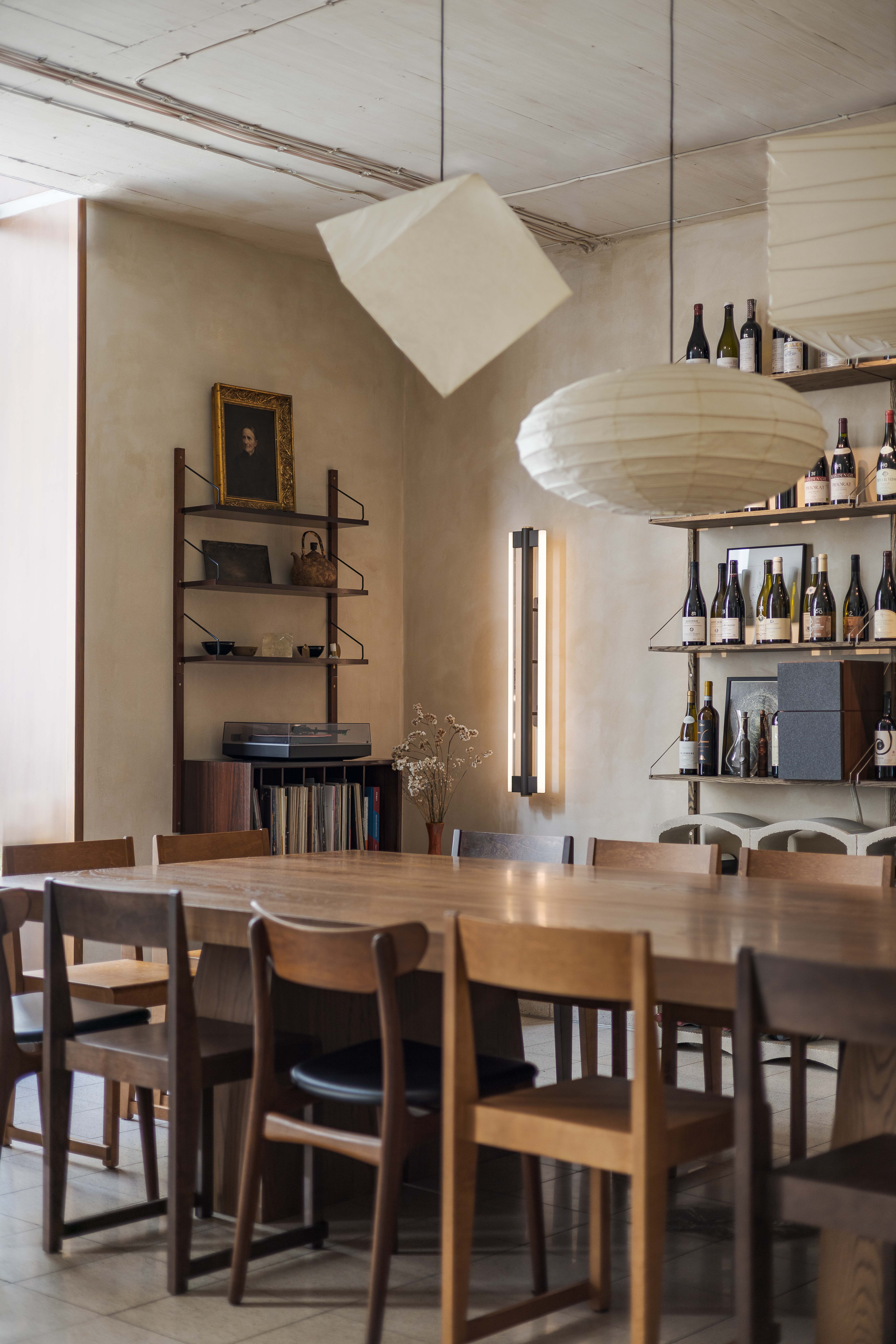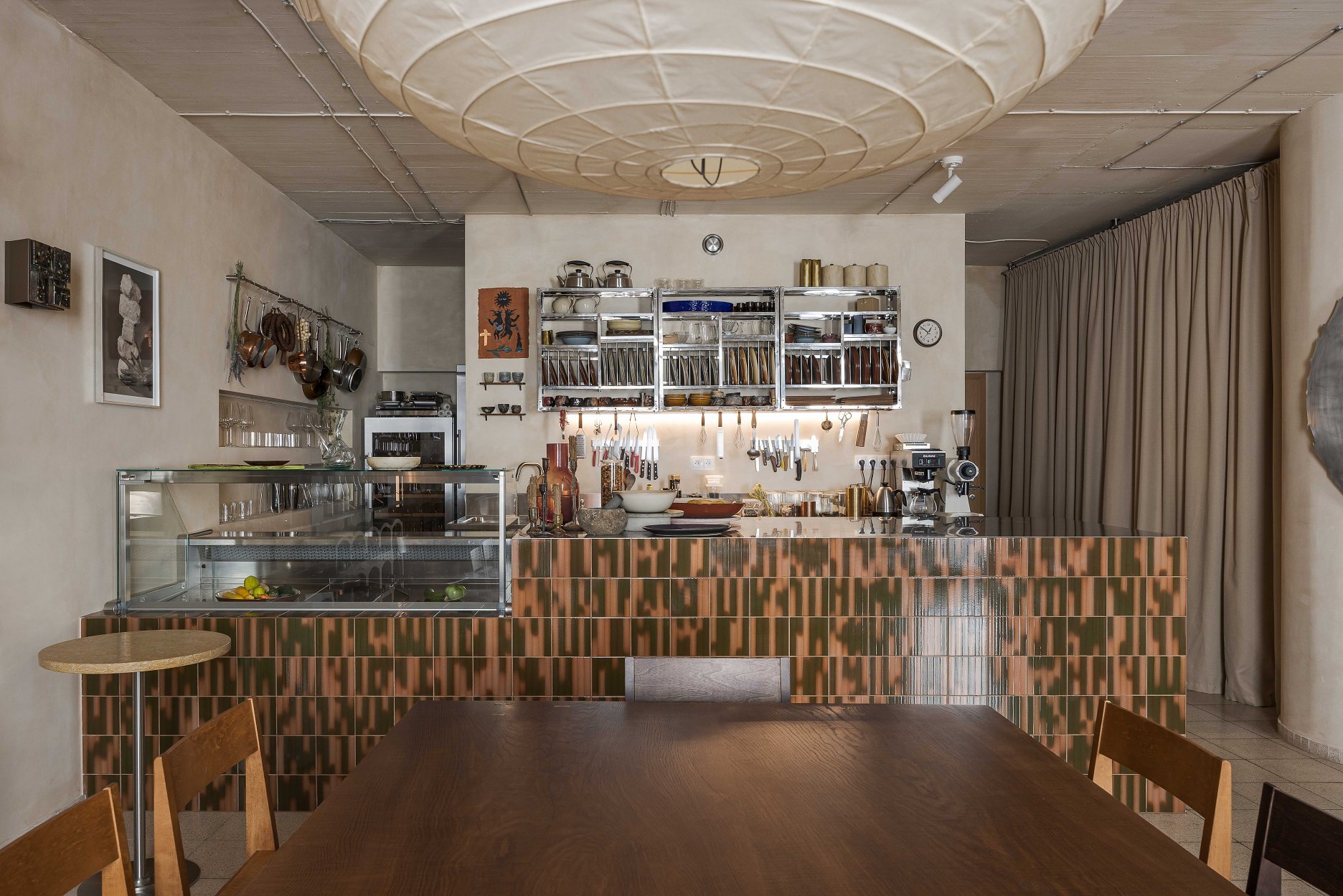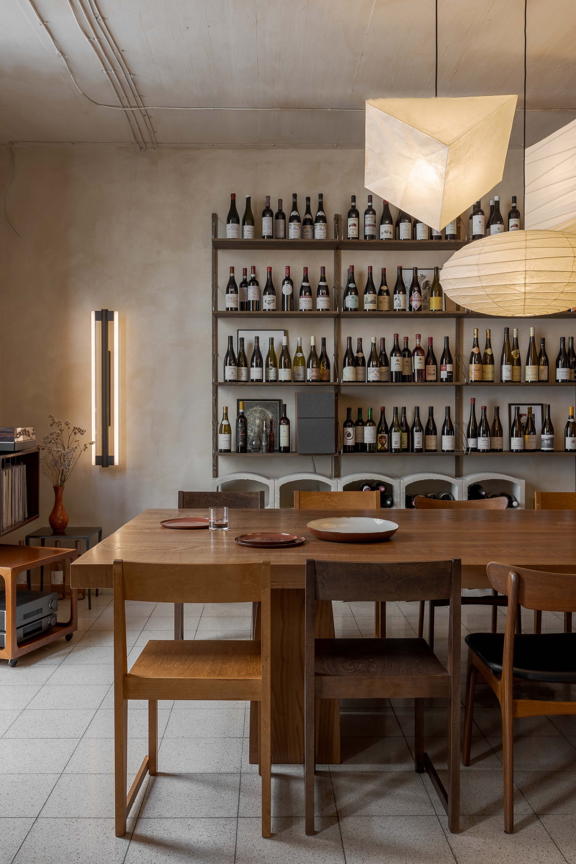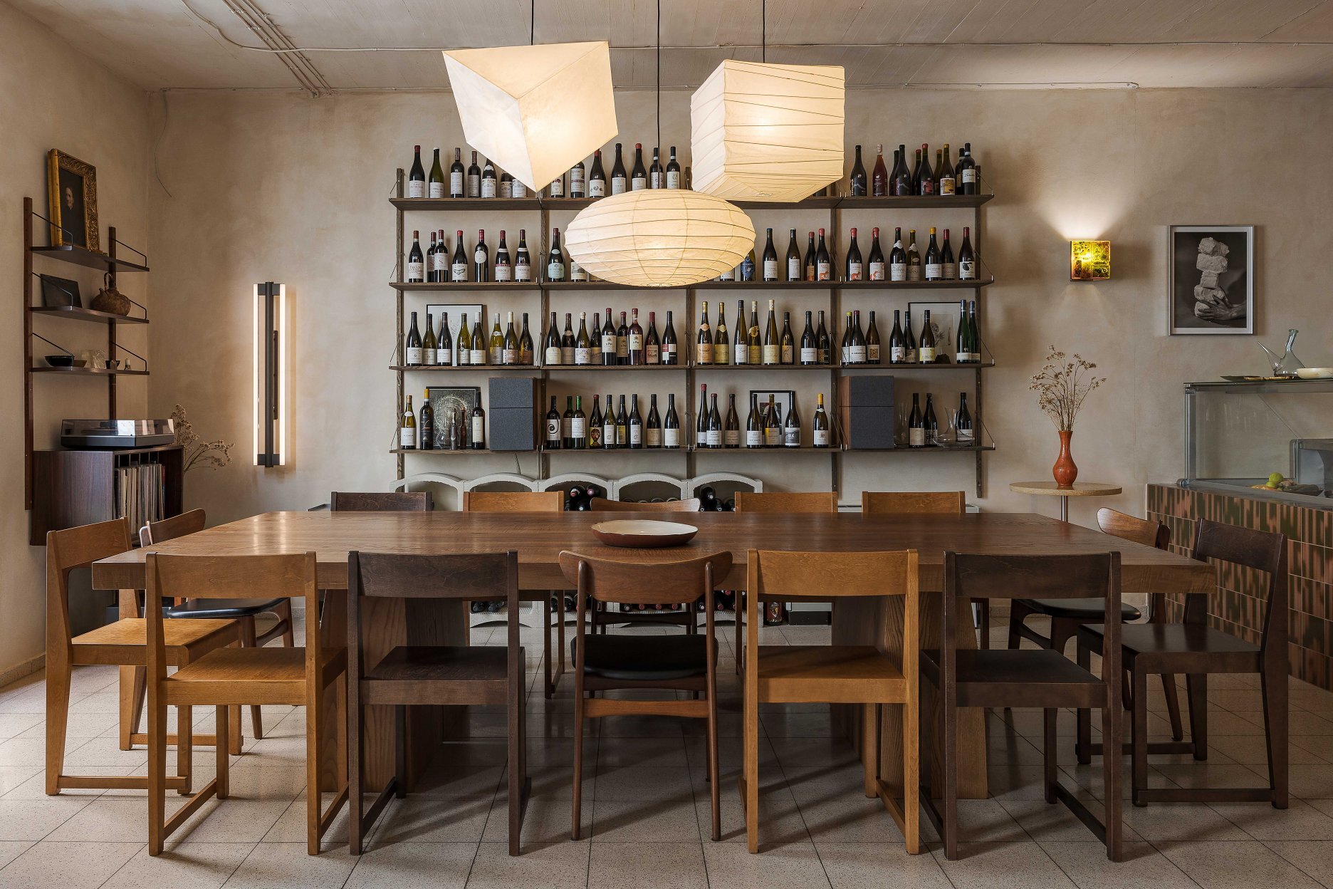Podlahu tvorí pôvodná terrazová dlažba charakteristická pre celý objekt. Útulnú domácku atmosféru dopĺňa trojica svietidiel z tradične spracovaného washi-papiera od japonského designéra Isamu Noguchi-ho.