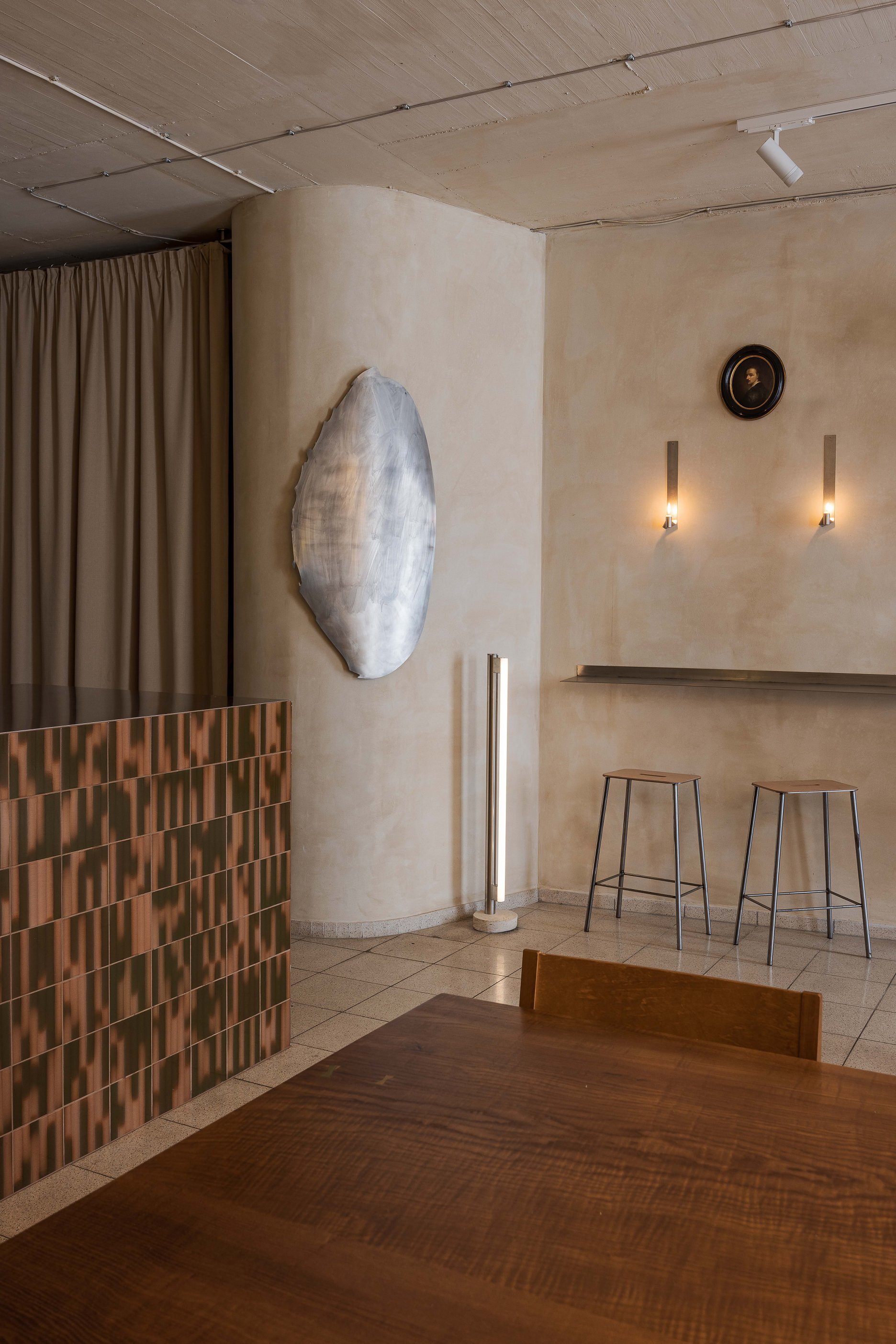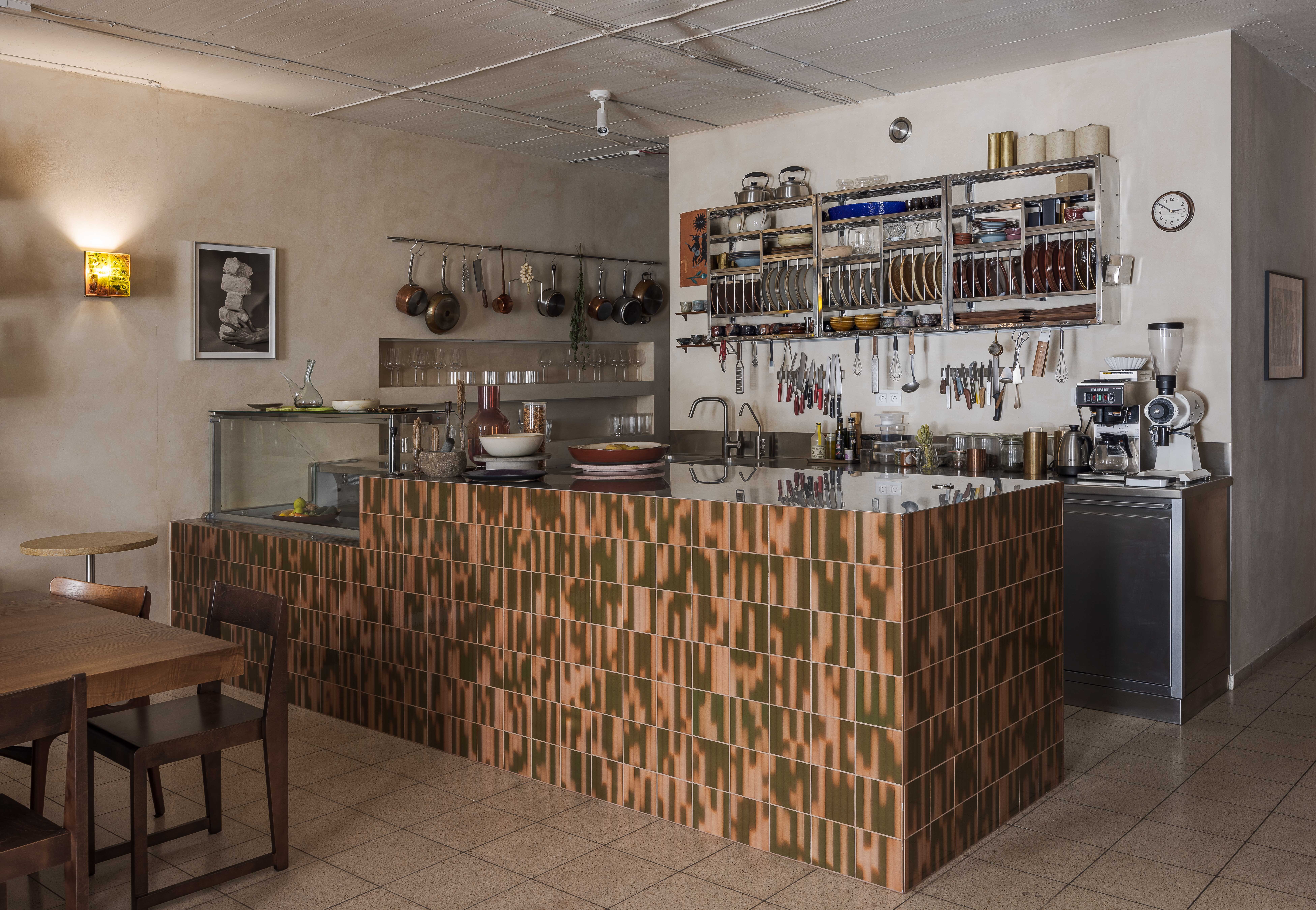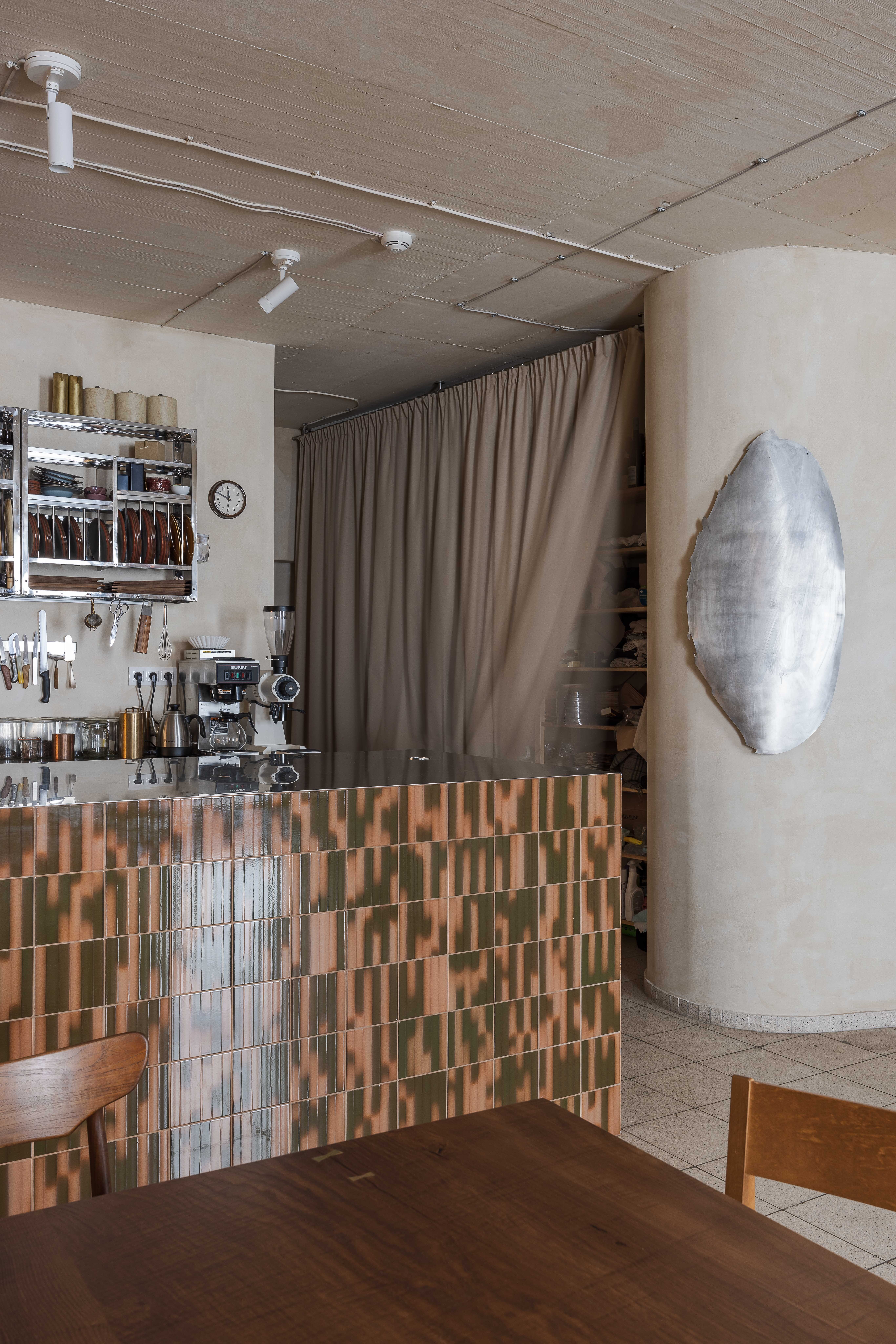 Priestor člení subtílna stena, ktorá oddeľuje odbytovú a prípravnú zónu. Barový pult tu plní funkciu nárazníka a zároveň predstavuje vizuálnu dominantu, umiestnenú oproti dvom precízne komponovaným fasádnym otvorom. Je obložený keramickým obkladom s glazúrami namiešanými podľa kľúčových slov zadaných do výroby priamo investorom.