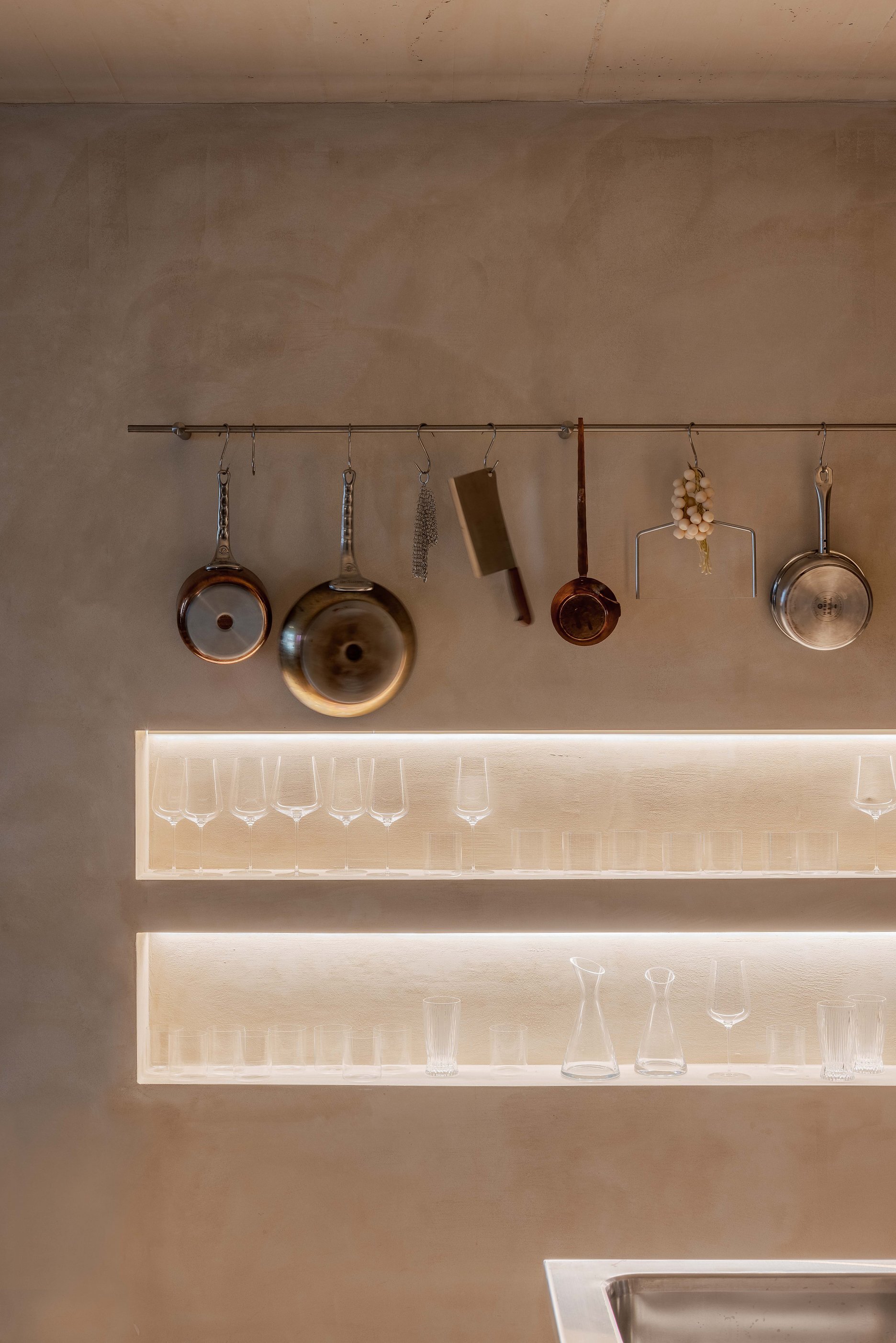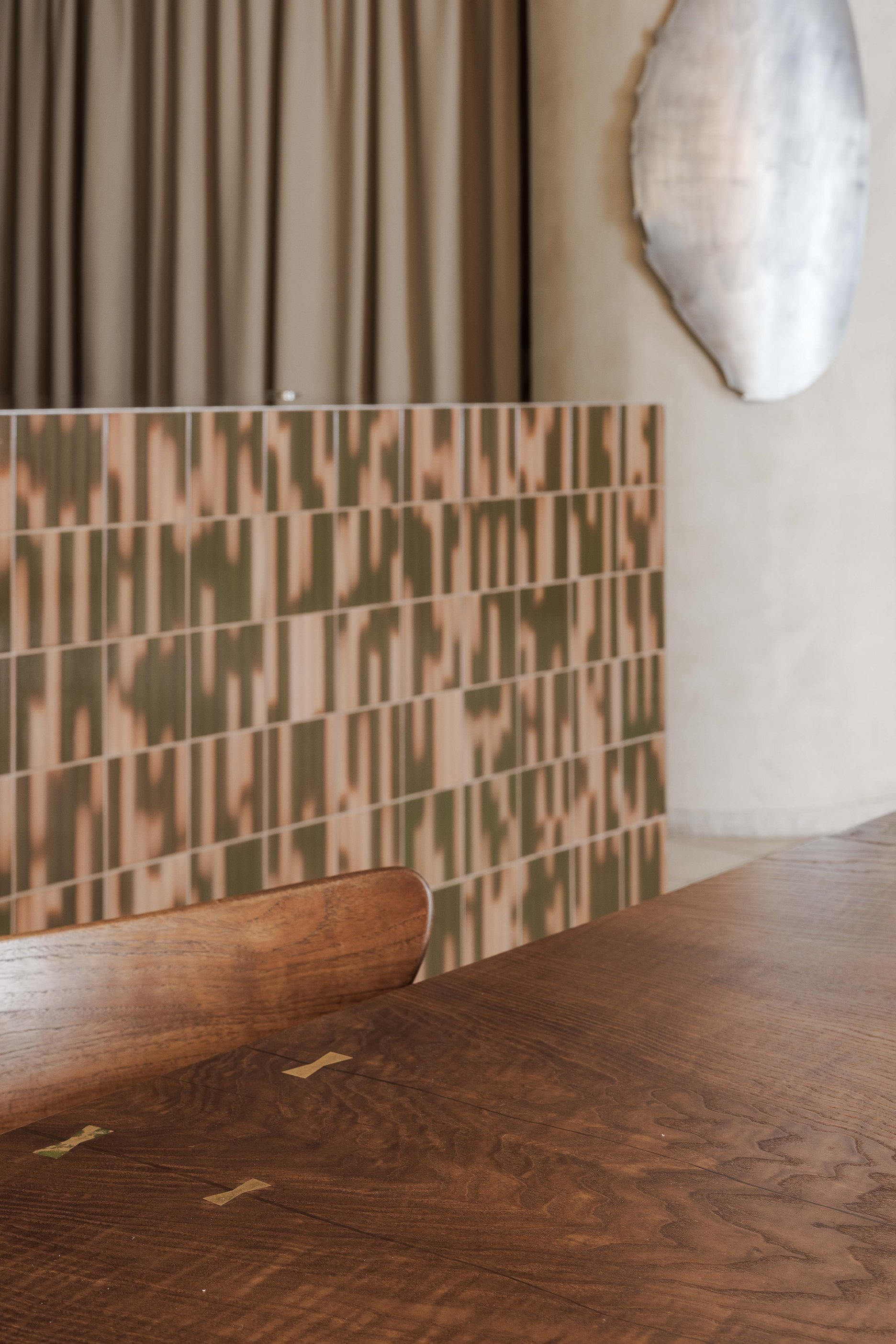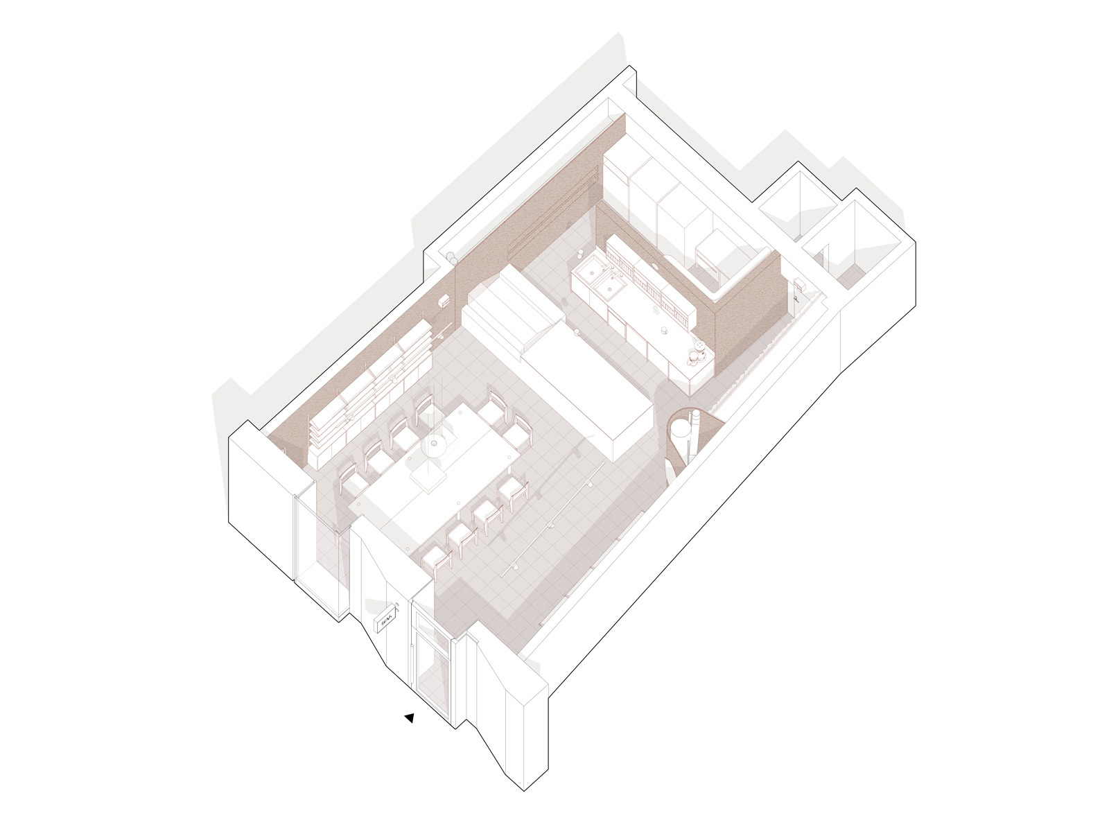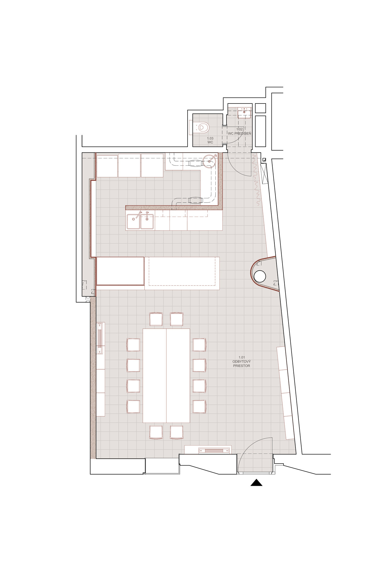 Priestor člení subtílna stena, ktorá oddeľuje odbytovú a prípravnú zónu. Barový pult tu plní funkciu nárazníka a zároveň predstavuje vizuálnu dominantu, umiestnenú oproti dvom precízne komponovaným fasádnym otvorom. Je obložený keramickým obkladom s glazúrami namiešanými podľa kľúčových slov zadaných do výroby priamo investorom.