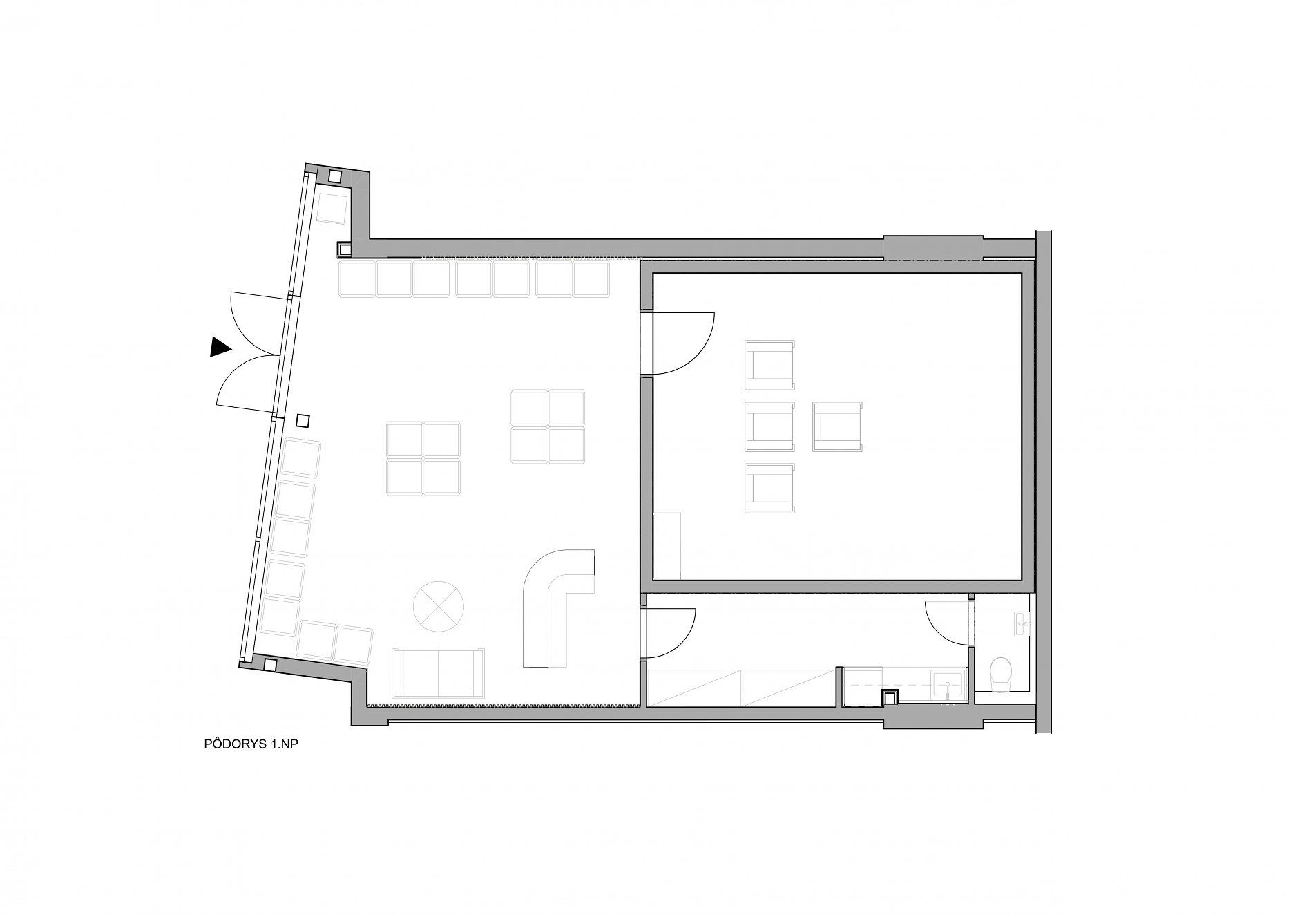 Showroom je tvorený zázemím a dvomi hlavnými priestormi: predajňa a posluchová miestnosť, ktorá je vzhľadom na svoje špecifické požiadavky na nepriezvučnosť a dobu dozvuku navrhnutá ako vstavba "dom v dome".