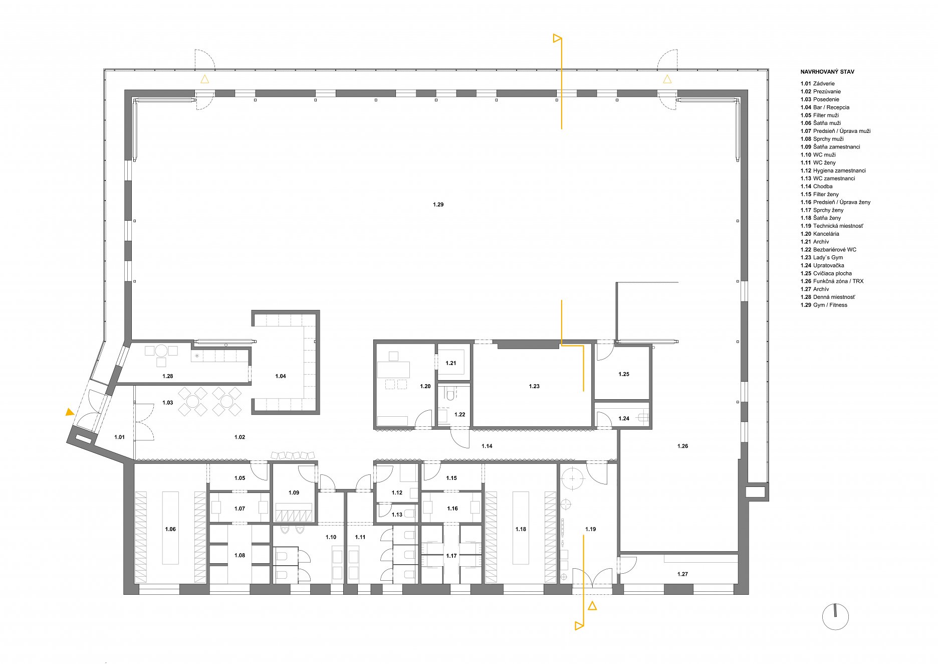 Hlavný vstup, akcentovaný zošikmením smerujúcim k ulici a priľahlému parkingu, sa nachádza na západnej strane objektu. Cez zádverie sa dostávame do vstupnej časti určenej na prezúvanie a posedenie pri recepcii s barom. Recepcia / Bar tvorí prepojenie medzi vstupom a priestormi posilňovňe. Južnú časť objektu využívajú šatne s hygienou, technická miestnosť a archív. Z priestorov komunikácií je prístupná aj kancelária, archív a bezbariérové WC. Hlavnú časť dispozície tvoria priestory na cvičenie. Veľký otvorený priestor je rozdelený na funkčné zóny. Súčasťou riešenia je aj TRX zóna a dva uzavreté priestory pre samostatné skupiny.