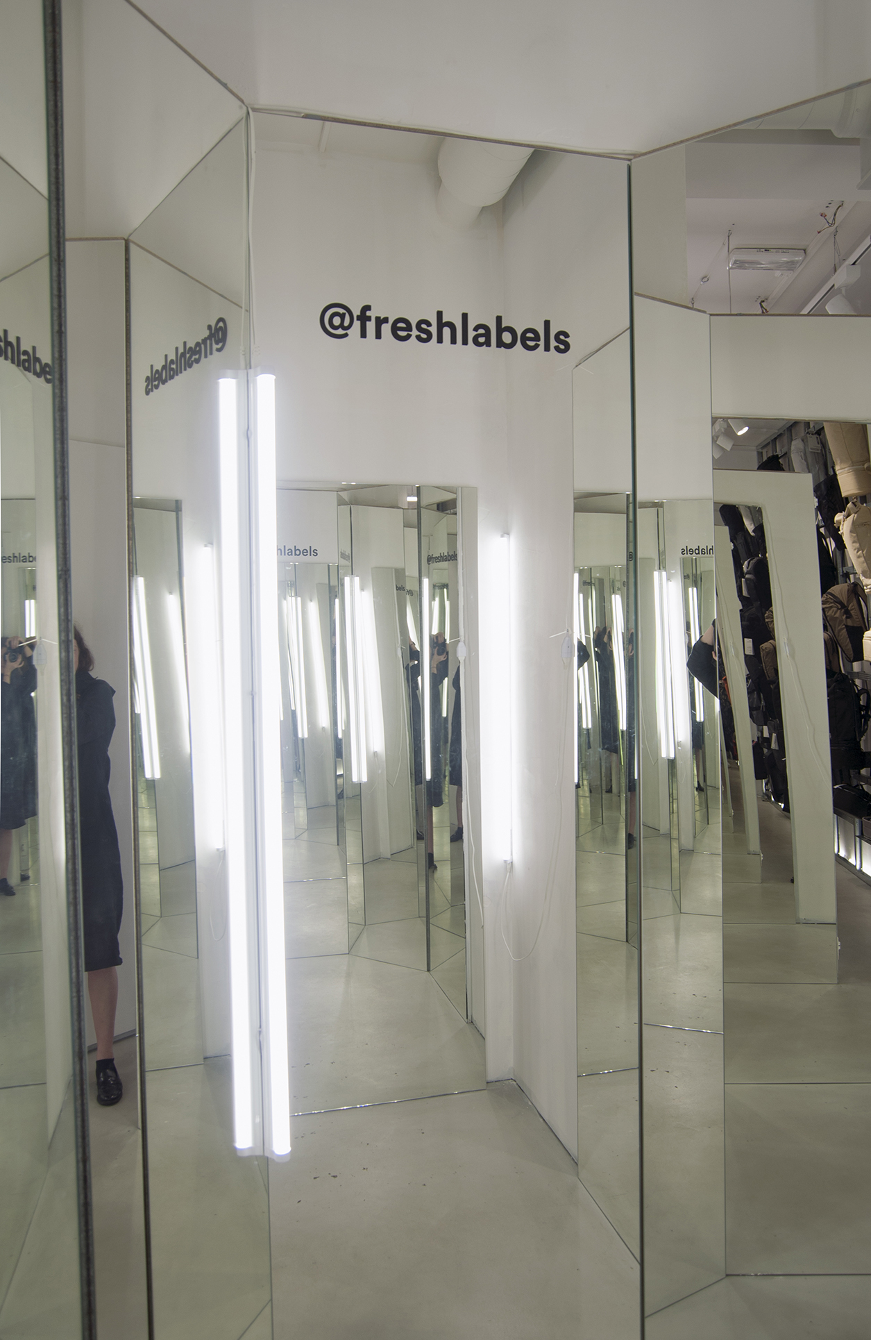 Další vrstvou interiéru se stává zrcadlení – zrcadlící brána i jednotlivé kusy v prostoru oživují průhledy a vnášejí znovu nedokonalost i neurčitost. Zážitek ze zrcadlení nabízí i zkušební kabinka v zadní části prostoru překrytá lightboxem a i speciální CCTV instalace s kamerami a obrazovkou v koutu v přední části.