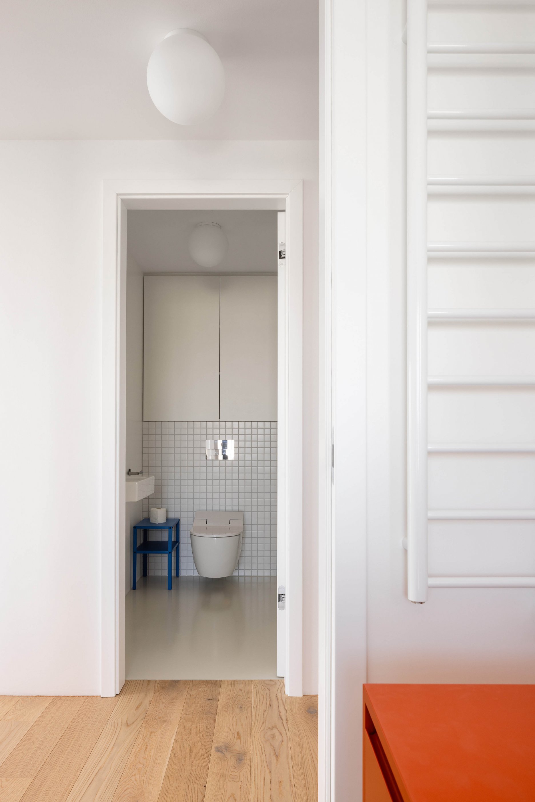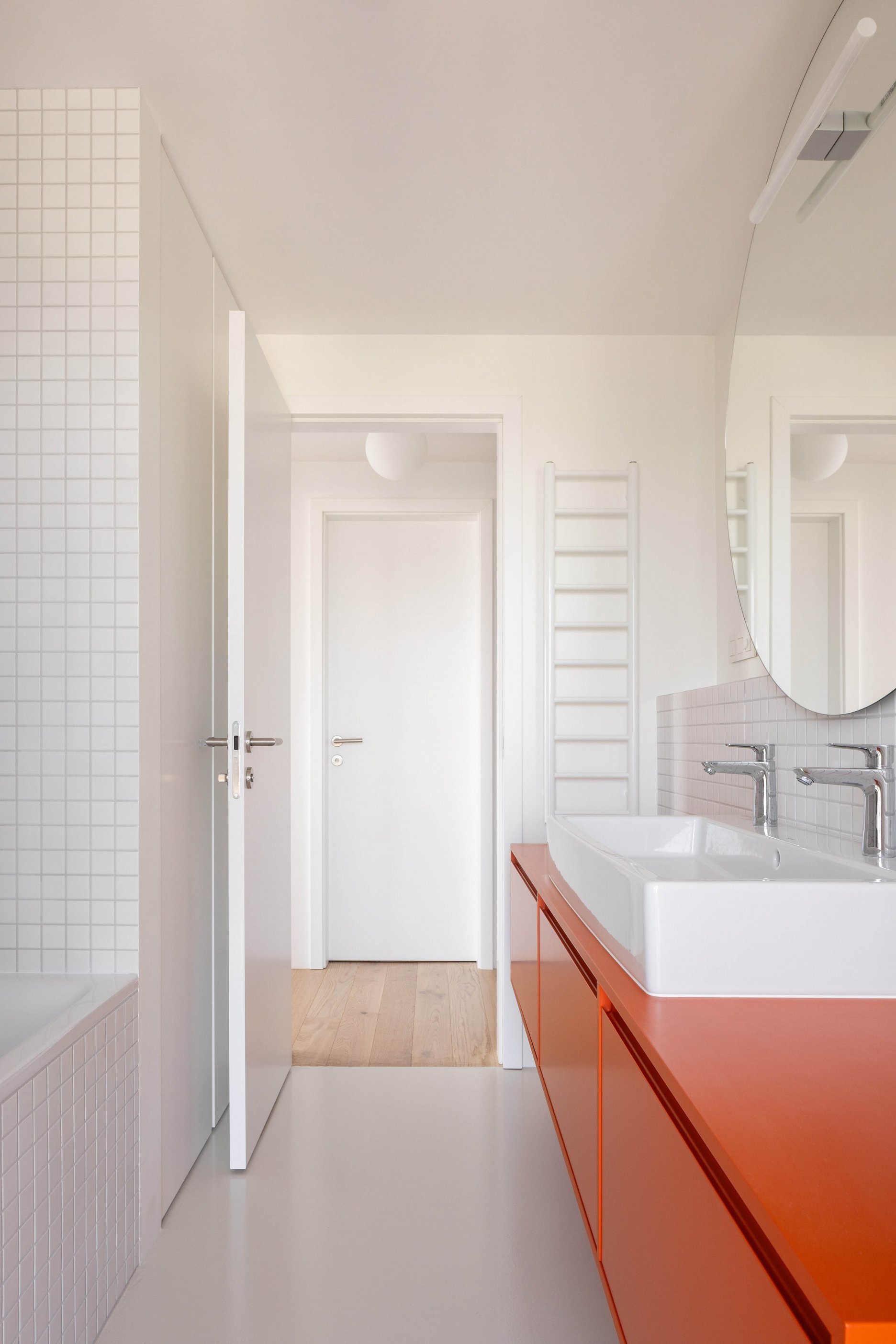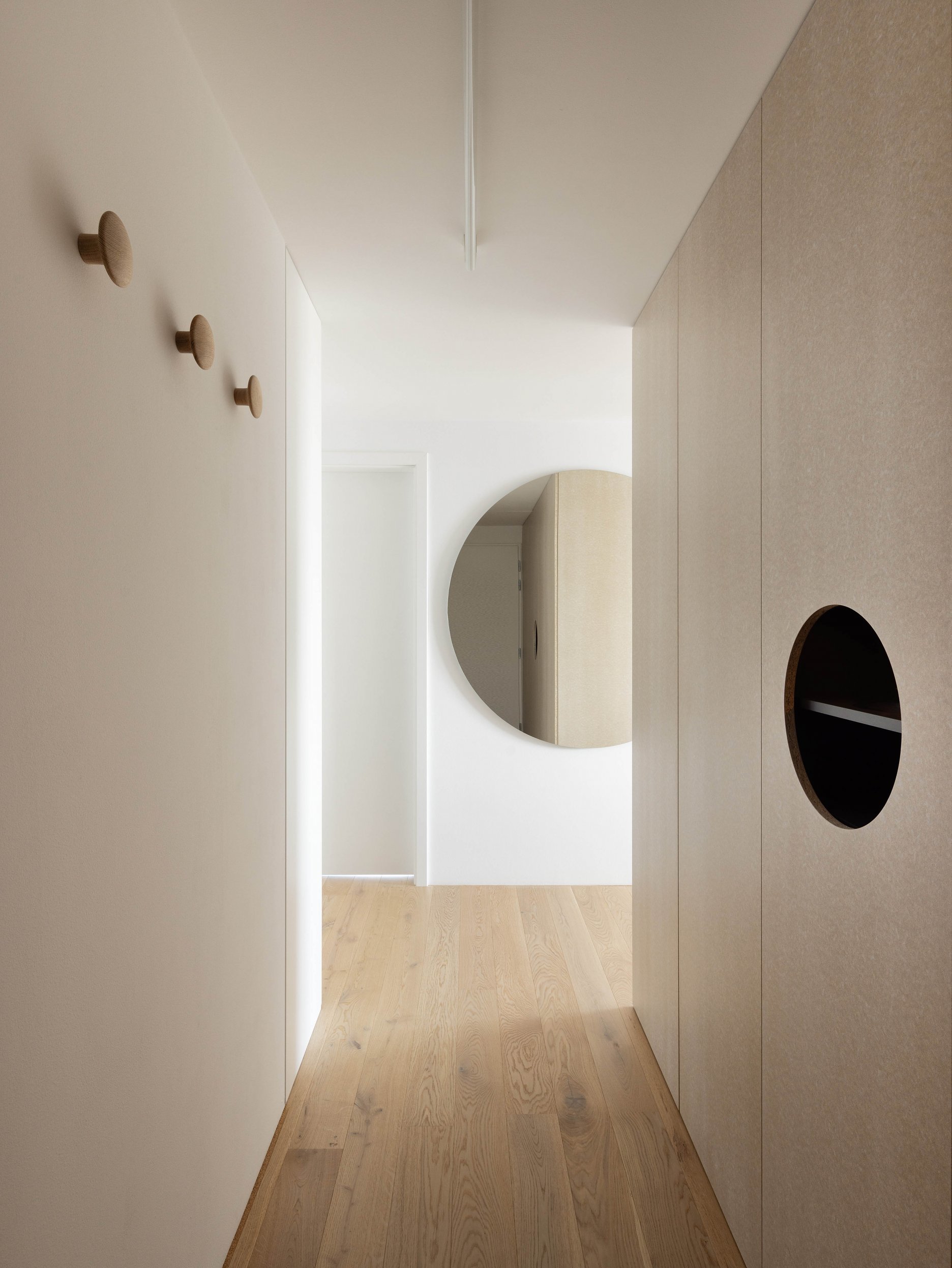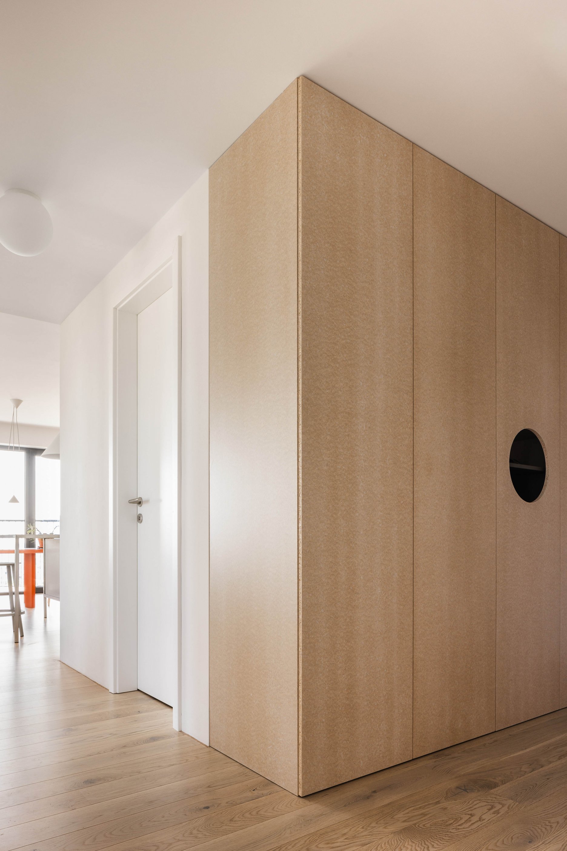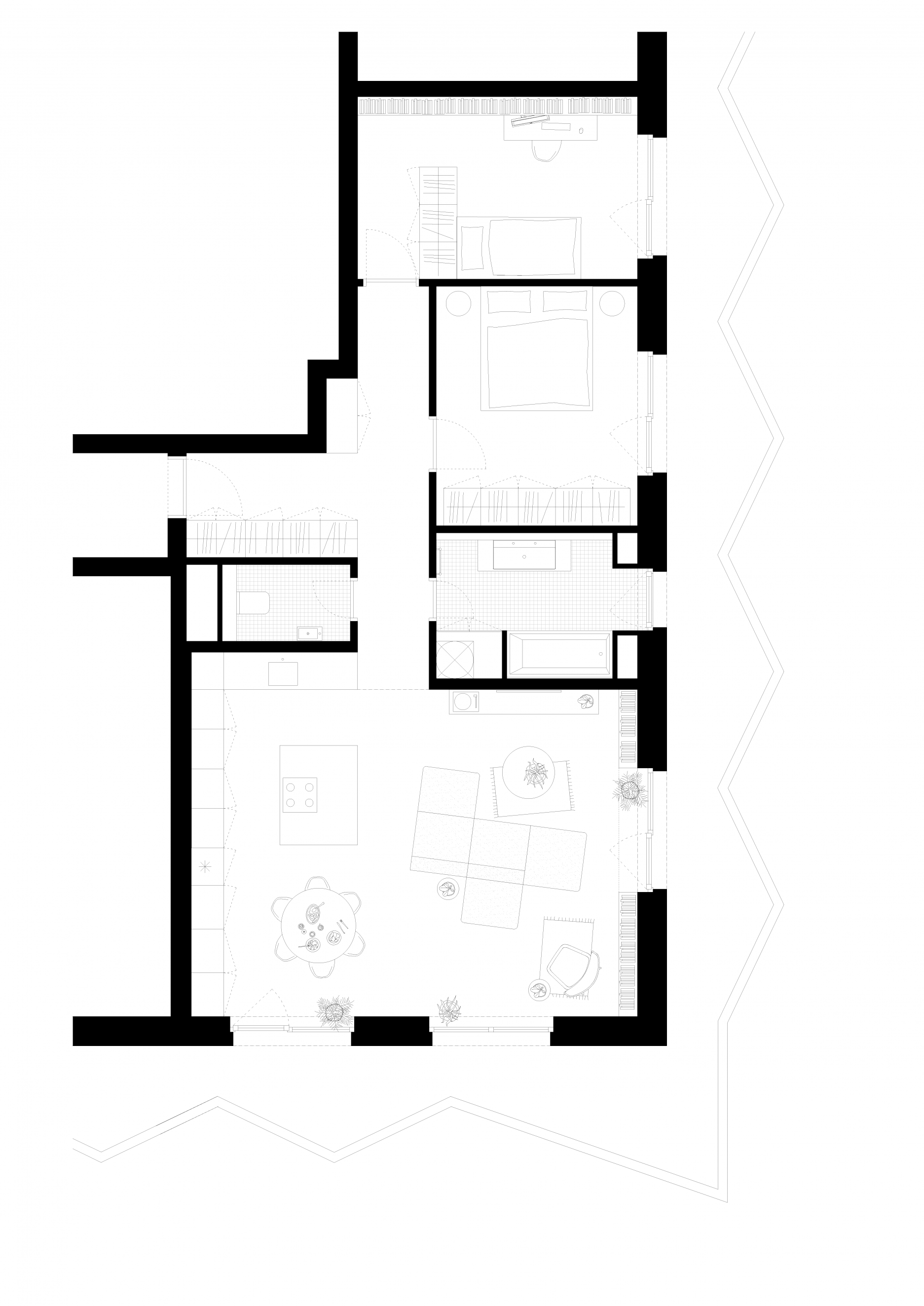 Byt v projekte Guthaus je nie celkom obvyklým zjavom medzi súčasnými novostavbami, hlavne vďaka jeho obytnej ploche a priebežnému balkónu po jeho obvode. Koncepčne sa nesnažíme o nachádzanie novej formy alebo princípu, ale prirodzene vstupujeme do už existujúceho pôdorysu. Celková transformácia spočíva v jednoduchom včlenení materiálov bez komplikovaných stolárskych prvkov a ich formou vytvárame čistý a nerušený priestor. V obývacej časti bytu si kontrujú objemný úložný priestor kuchynskej časti s objemnou no ľahkou knižnicou. V priestore medzi nimi sú scénicky rozložené funkčné stolárske objekty ktoré definujú využitie daného priestoru. Zároveň svojou subtílnosťou nevytvárajú vizuálnu prekážku. Nočná časť bytu je oprostená od zbytočného dizajnovania a ponúka nerušený čistý priestor pre spánok.