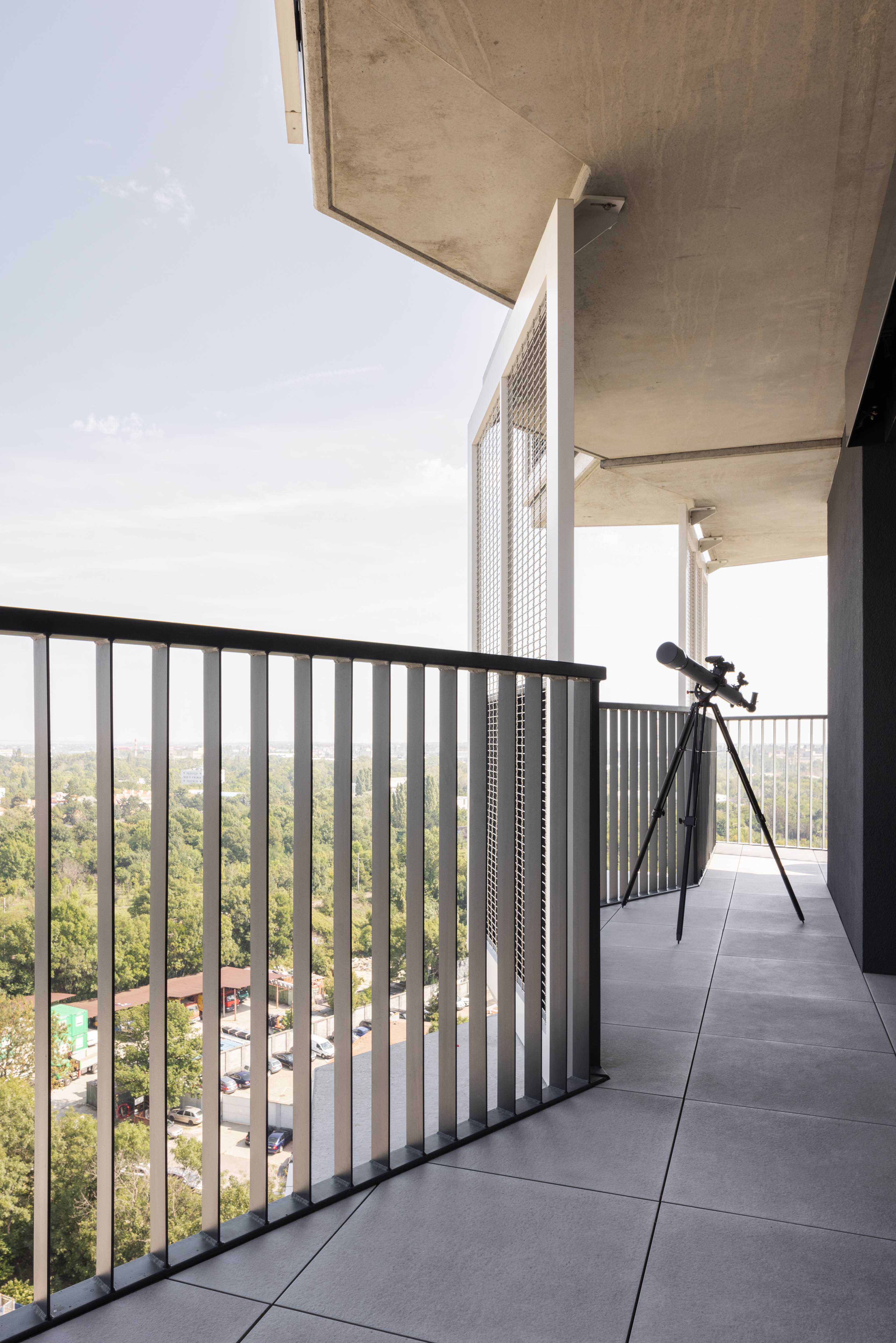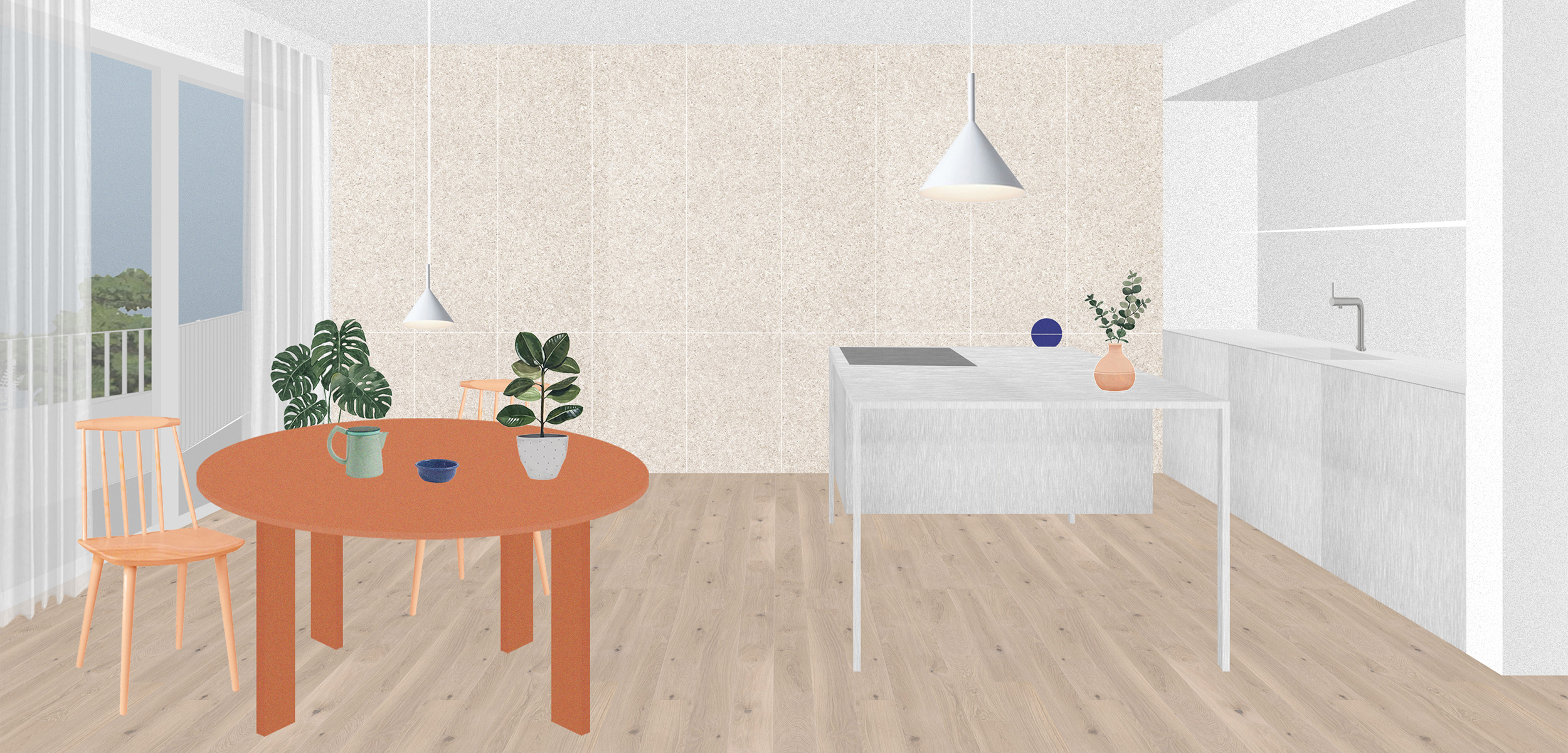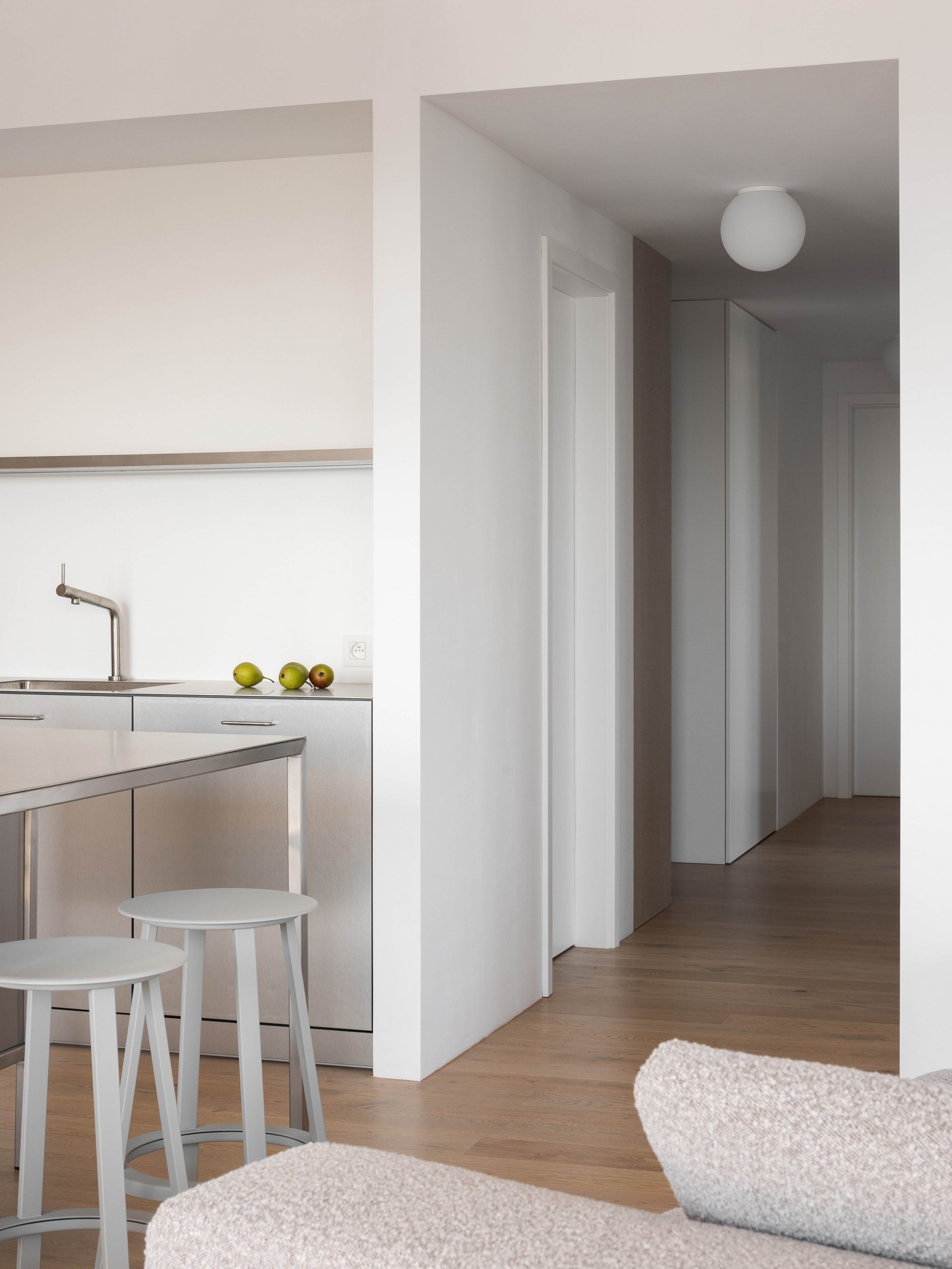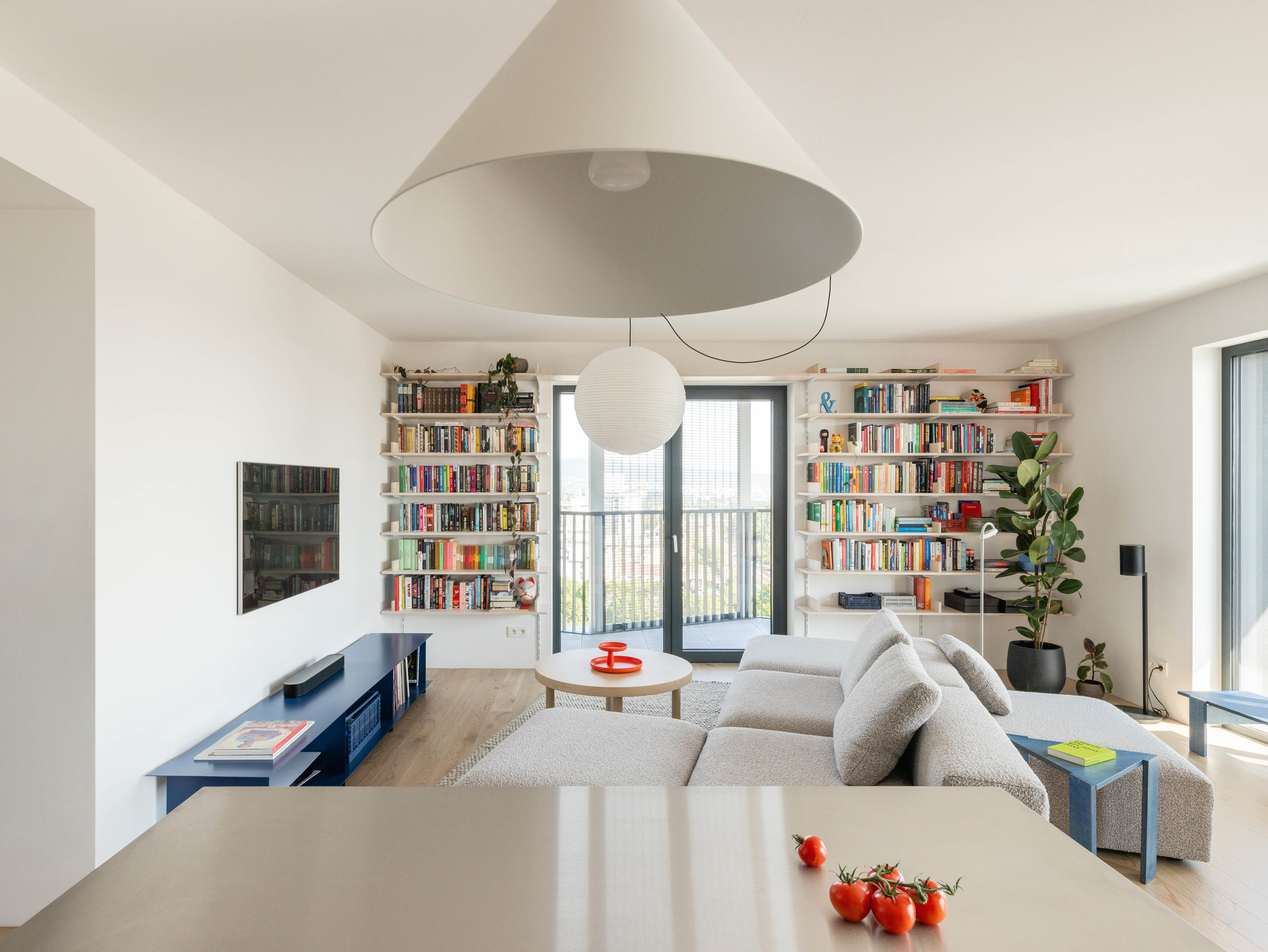 Aktuálna realizácia ateliéru GRAU. Otvorený obytný priestor, rozšírený o líniu priebežného balkónu. Subtílne autorské nábytkové solitéry, priznaná materialita.