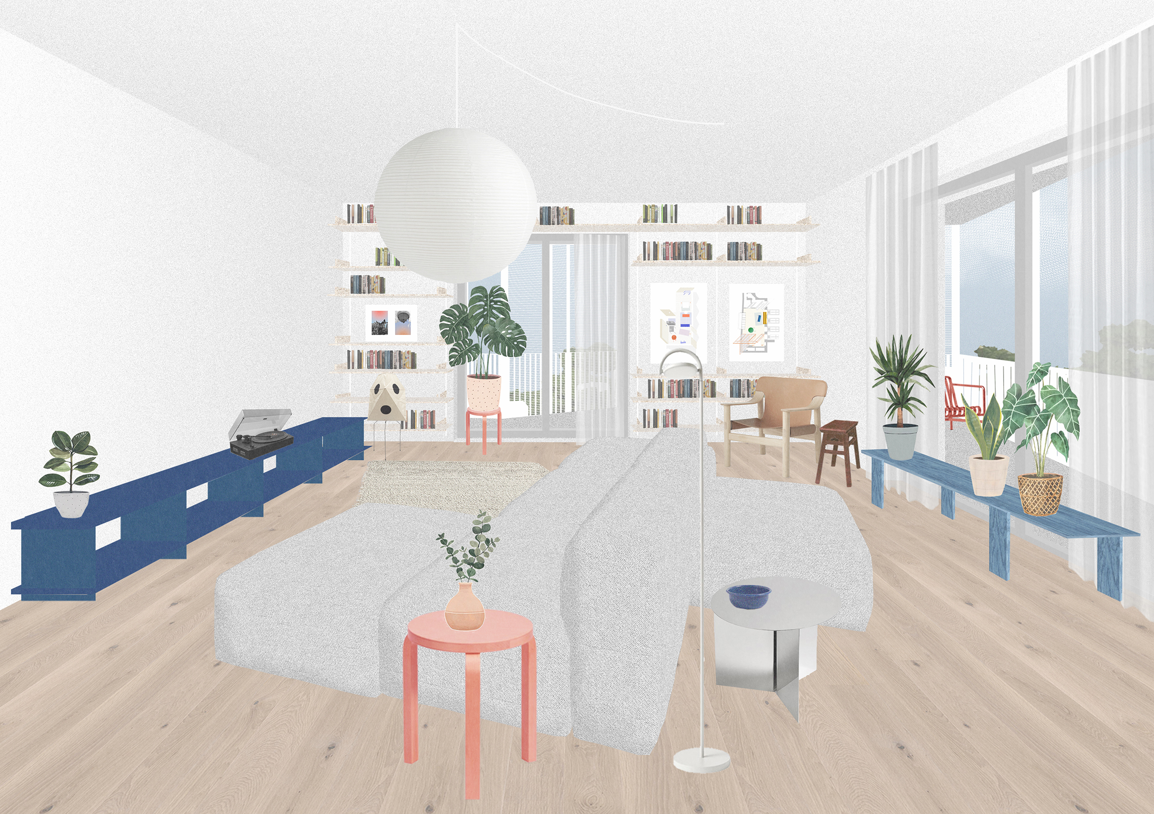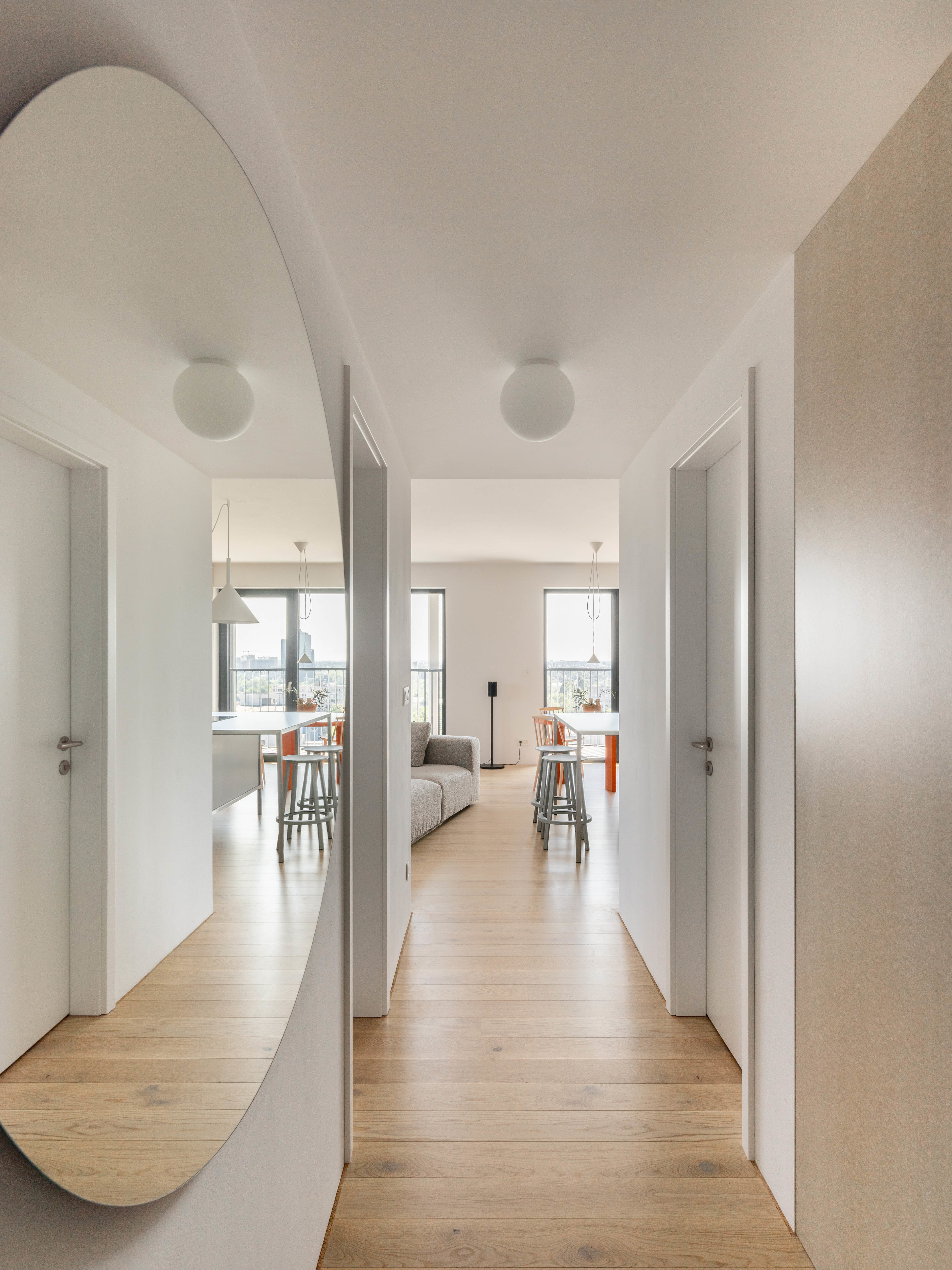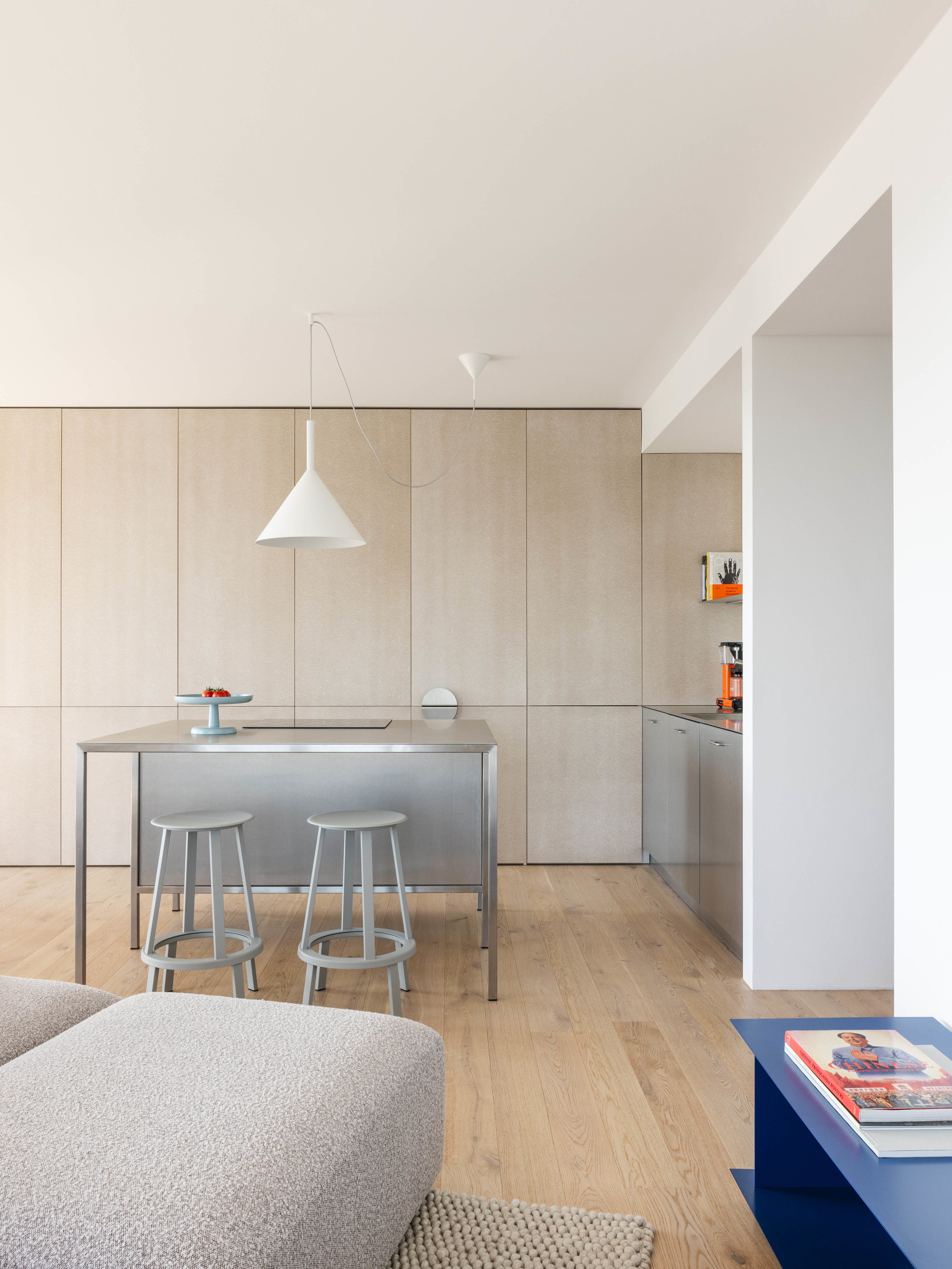 Aktuálna realizácia ateliéru GRAU. Otvorený obytný priestor, rozšírený o líniu priebežného balkónu. Subtílne autorské nábytkové solitéry, priznaná materialita.