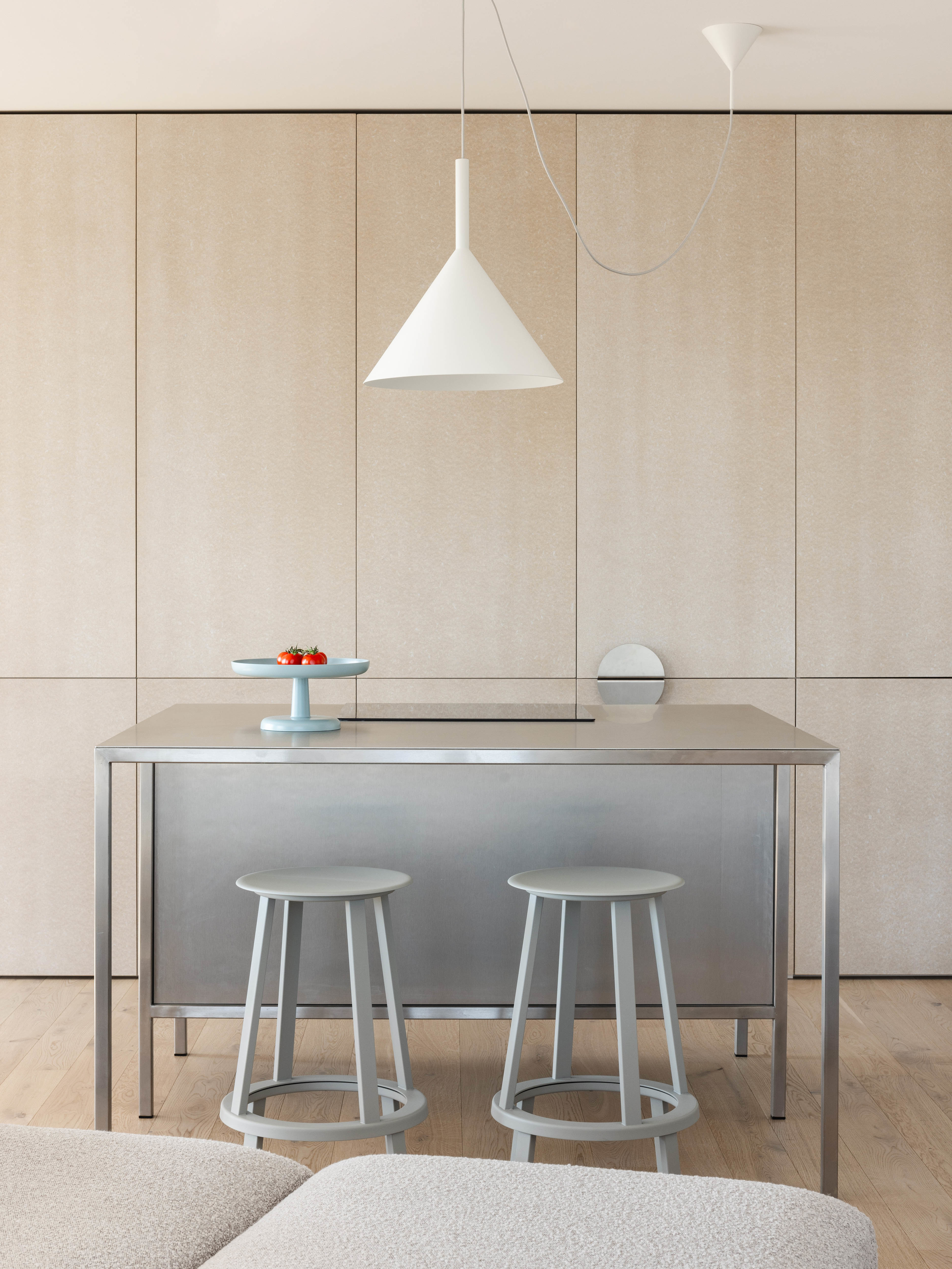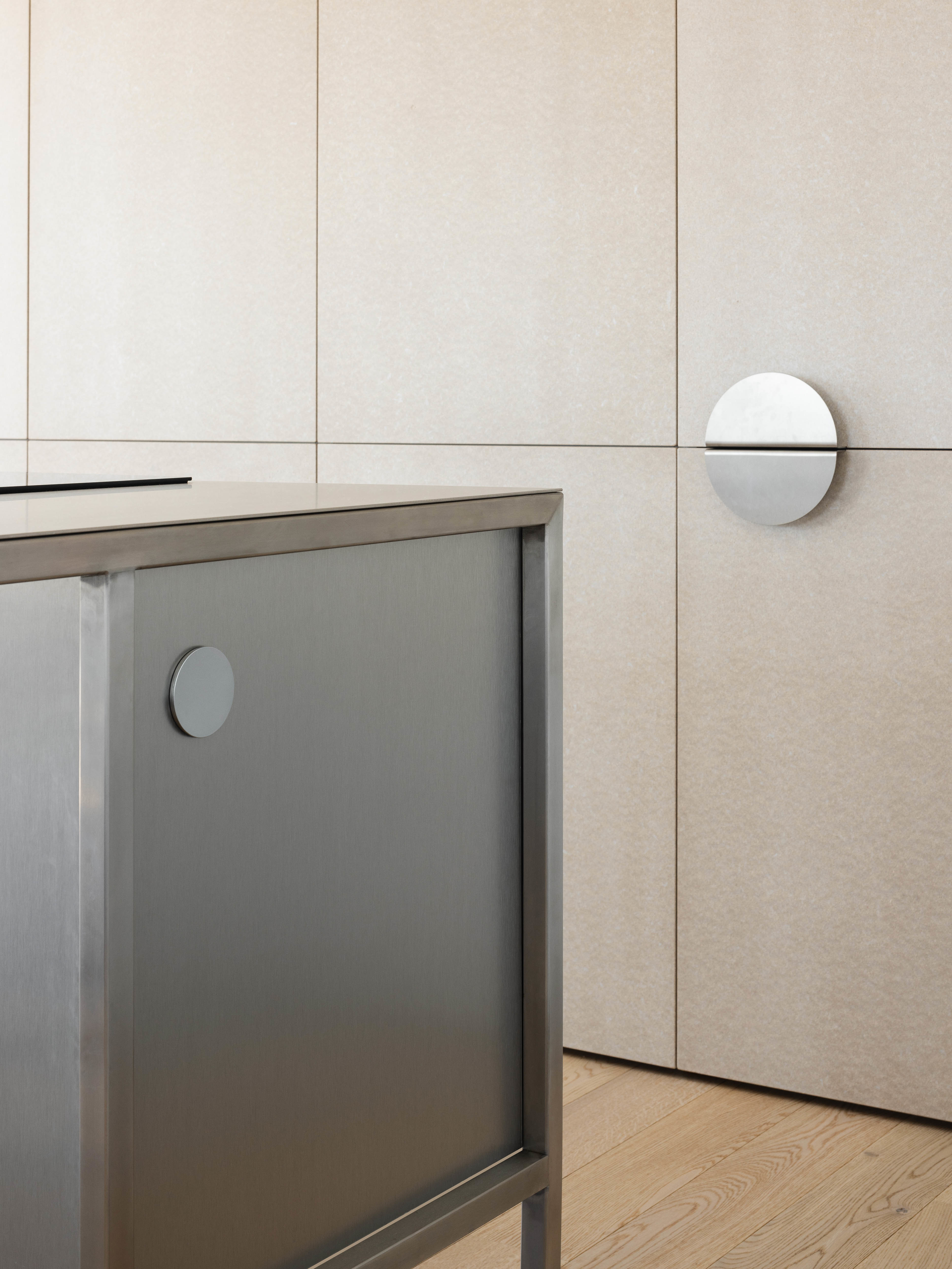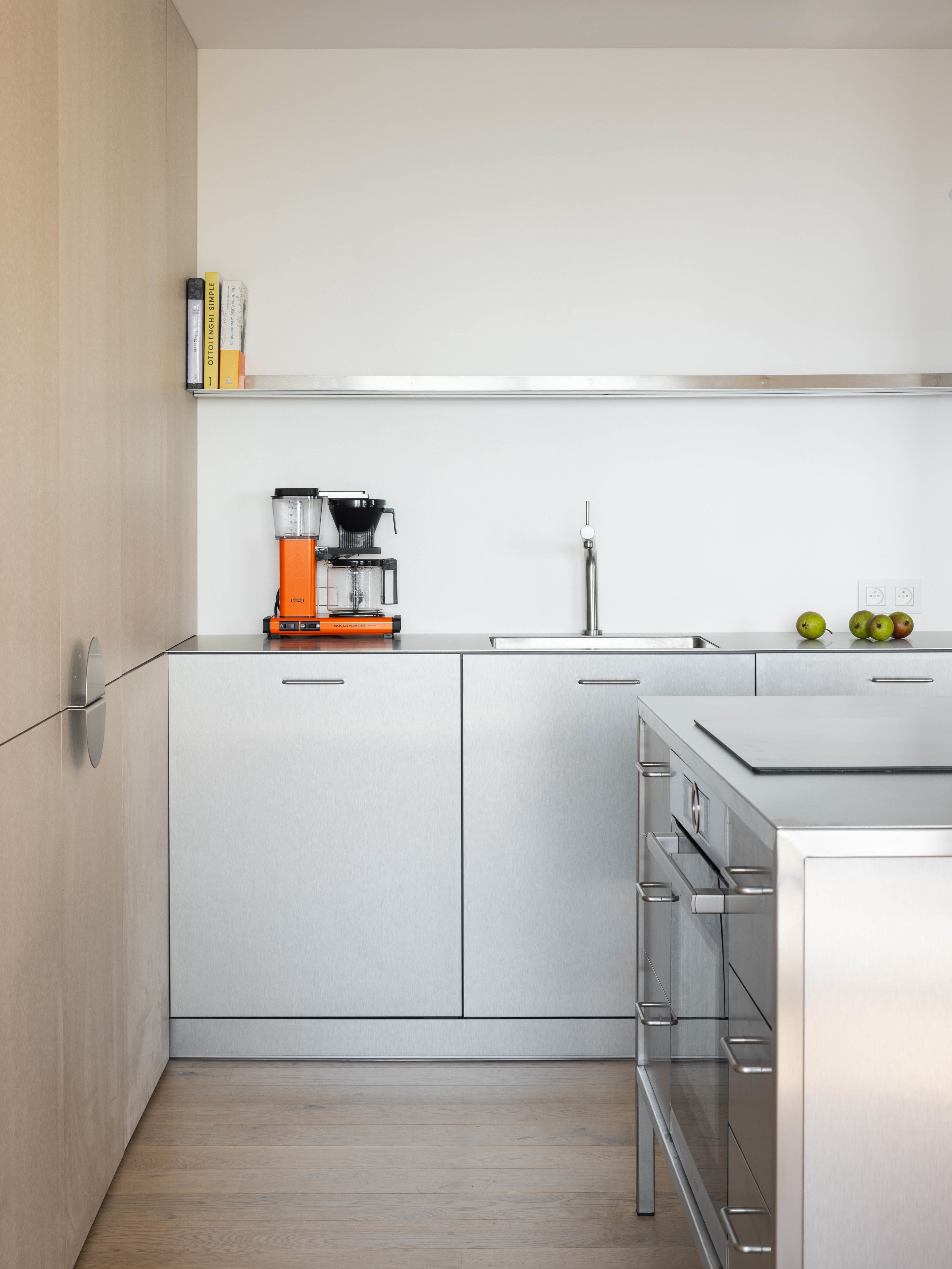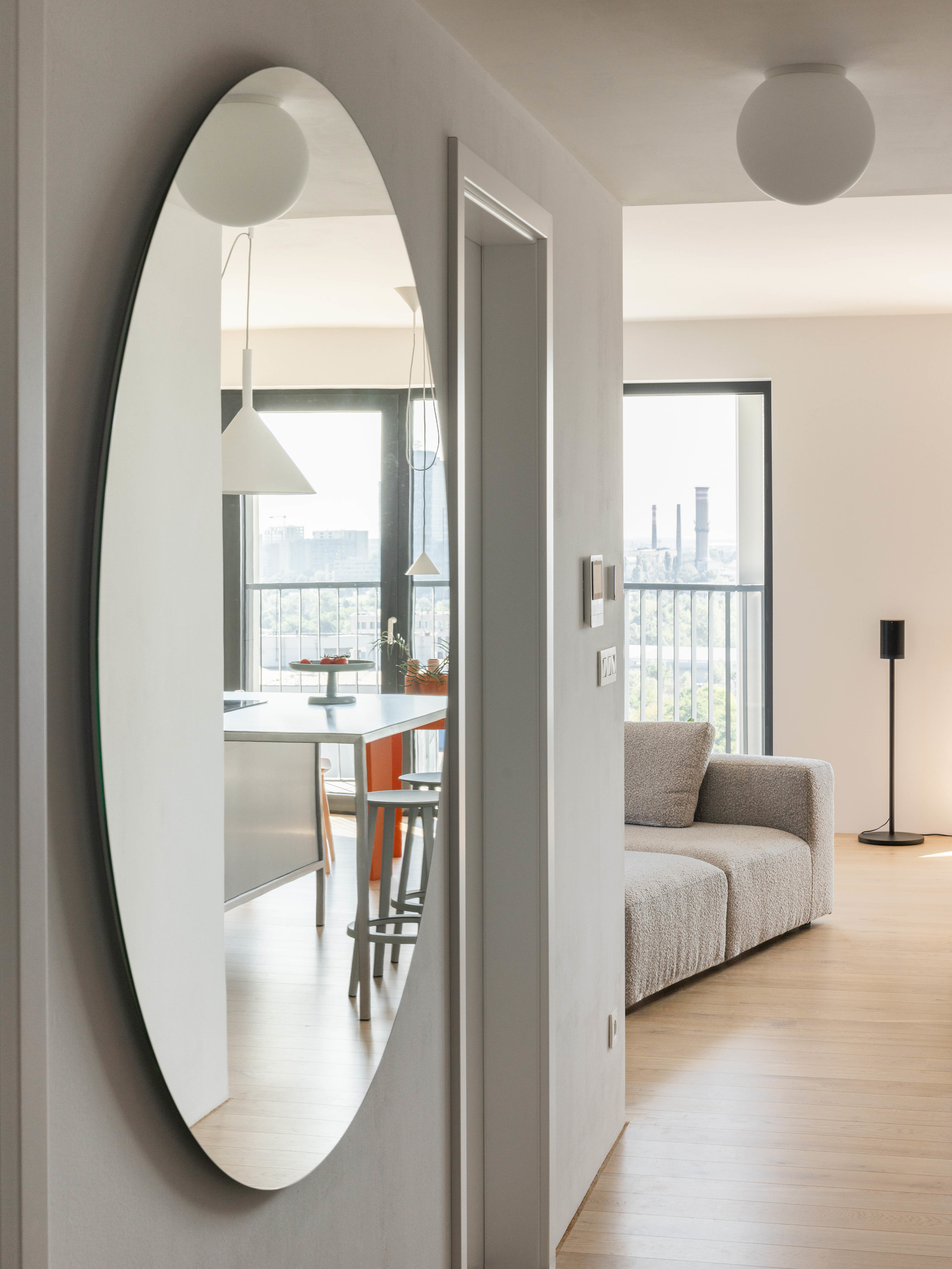 Aktuálna realizácia ateliéru GRAU. Otvorený obytný priestor, rozšírený o líniu priebežného balkónu. Subtílne autorské nábytkové solitéry, priznaná materialita.
