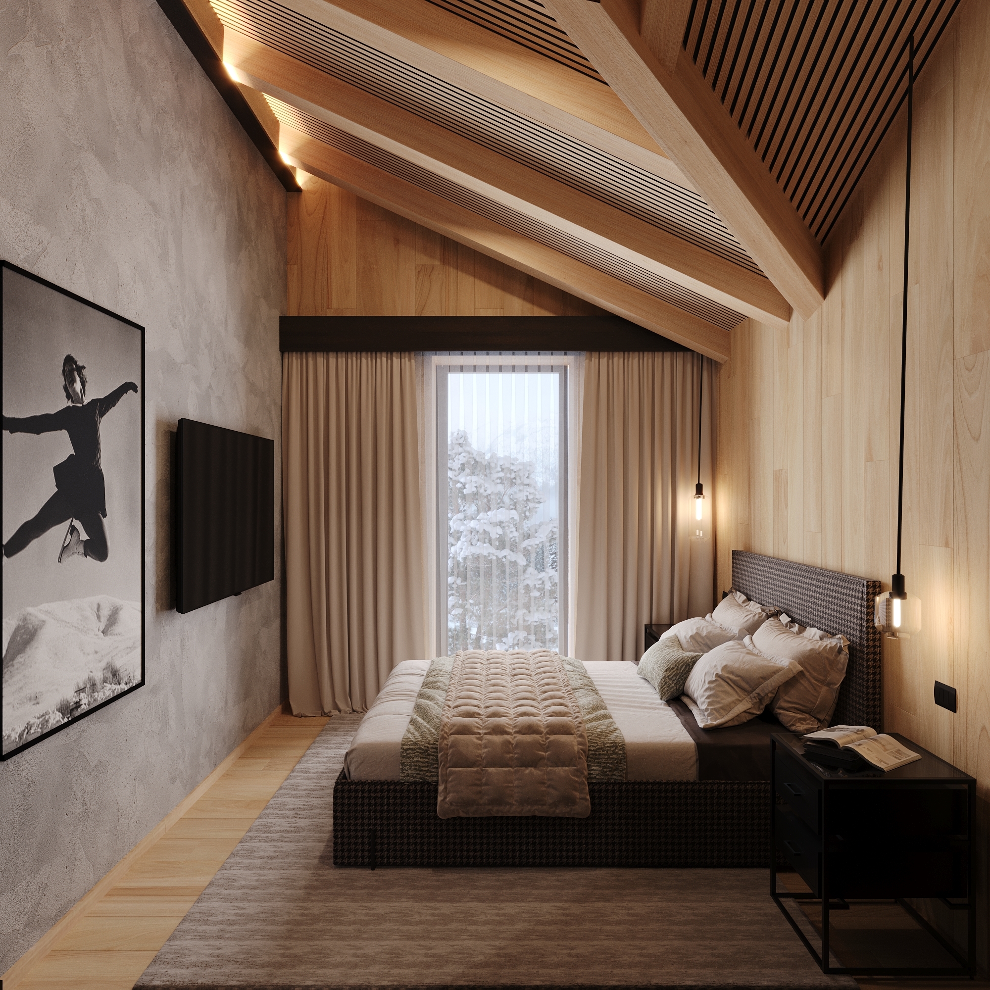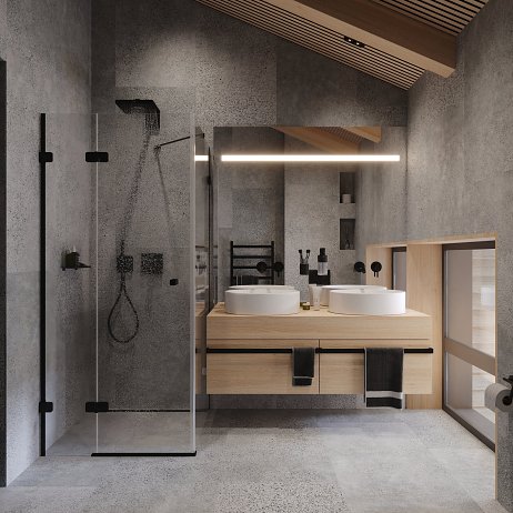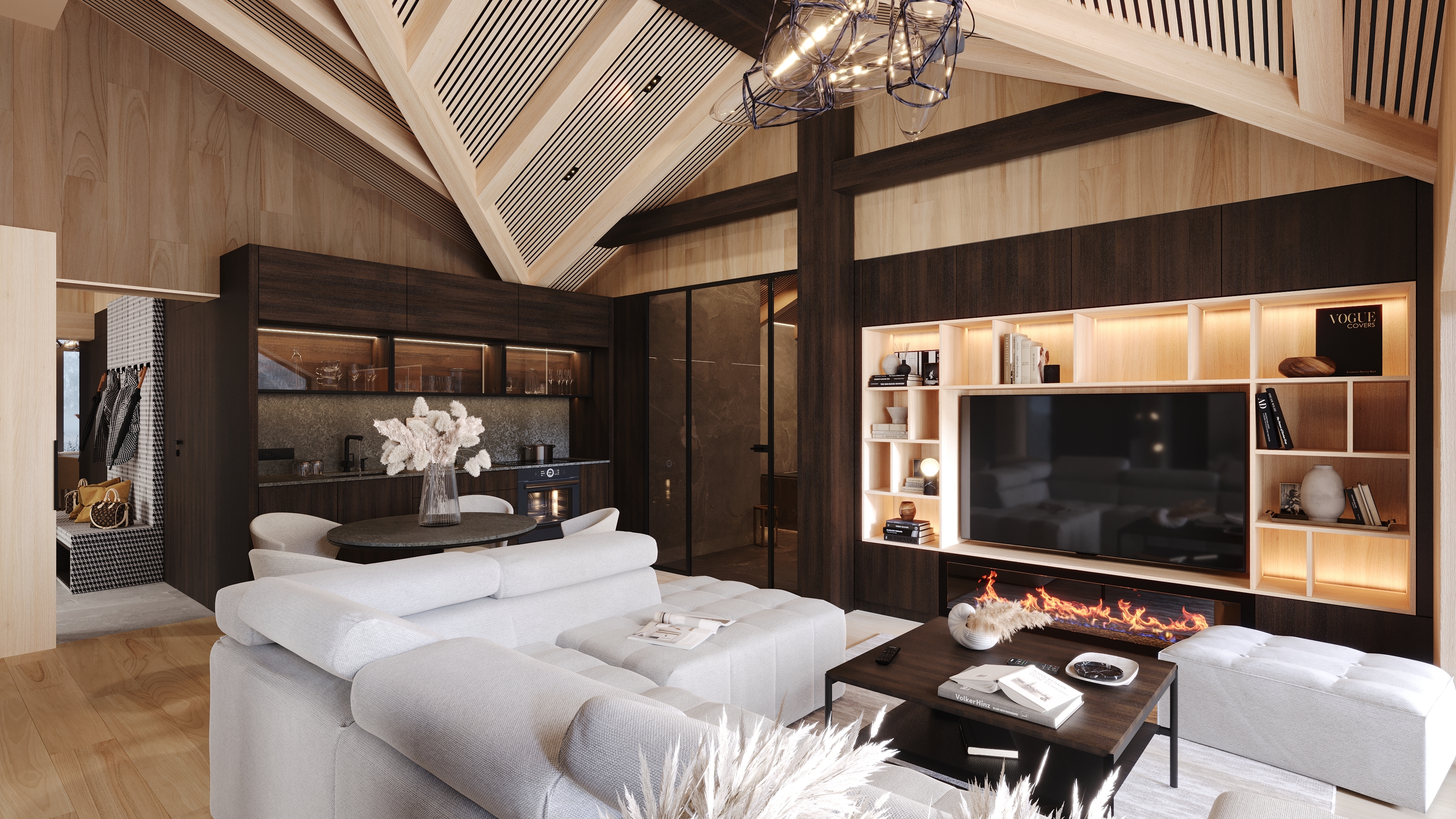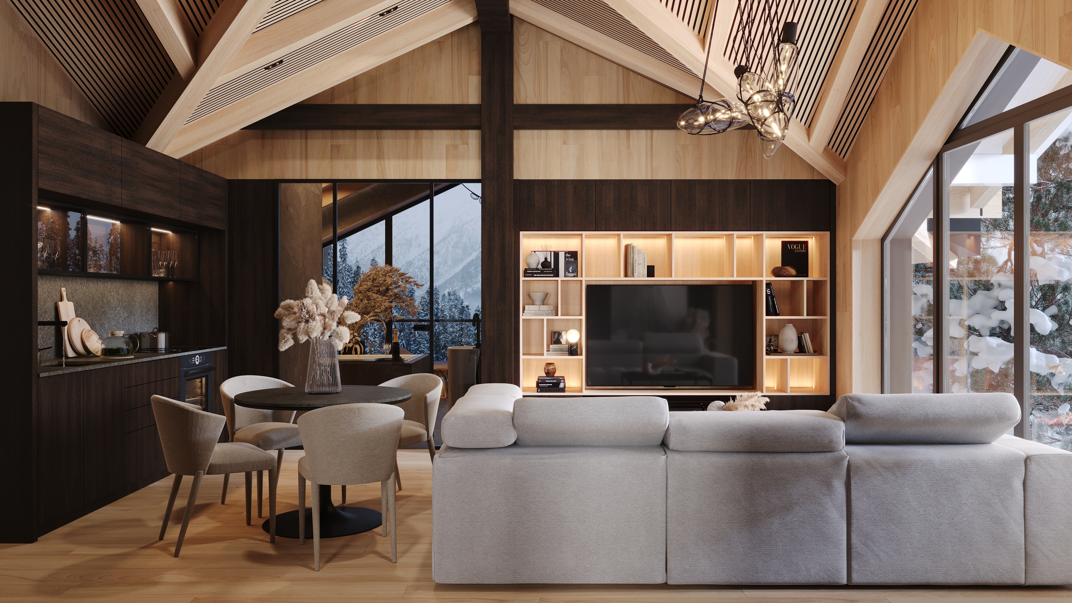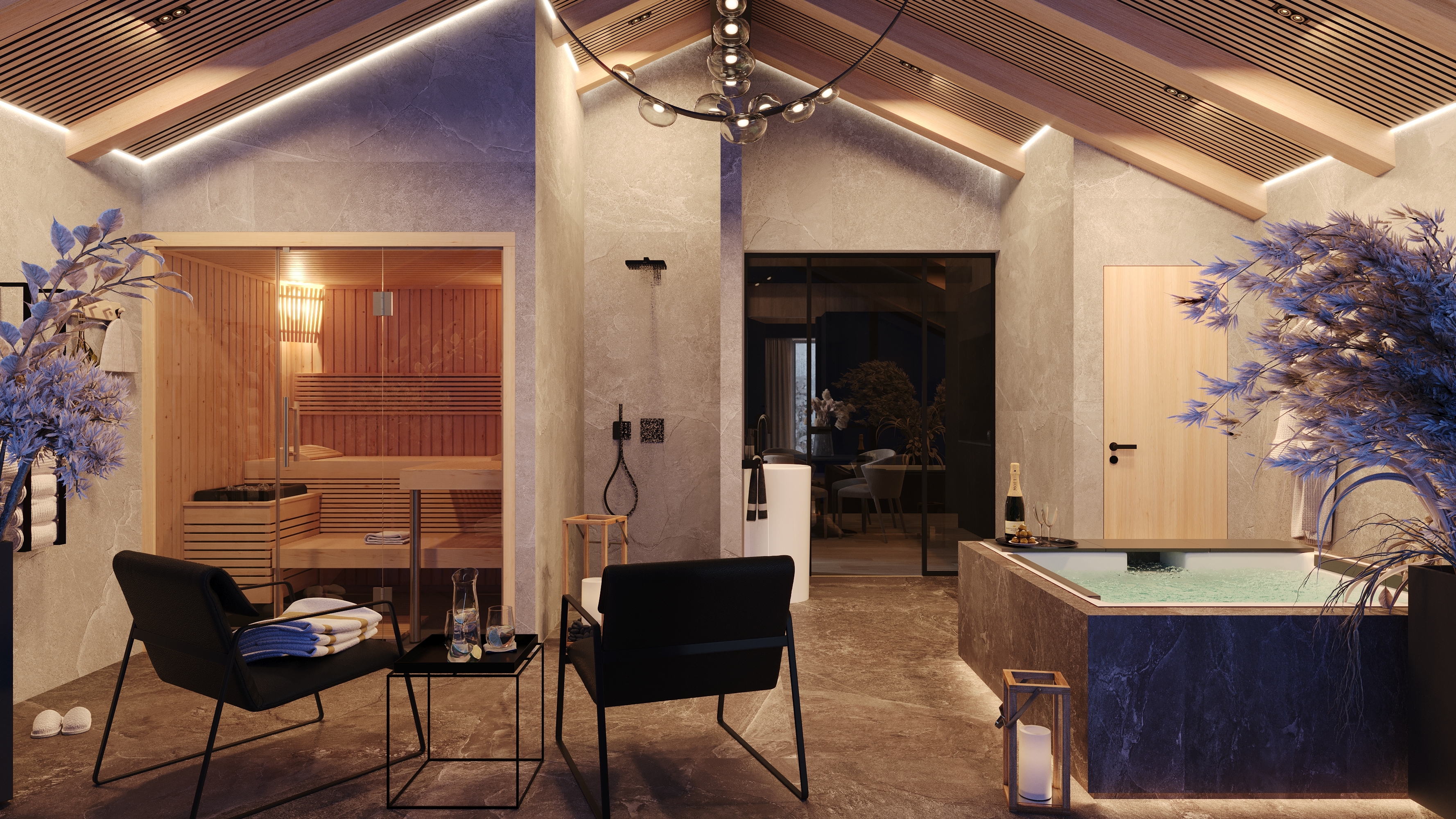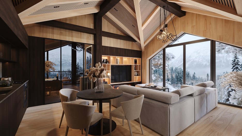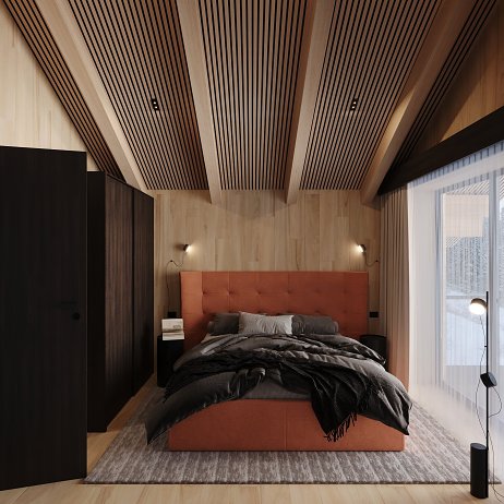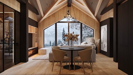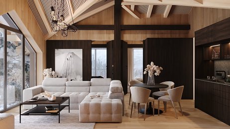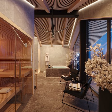 Interiéru dominuje priznaná drevená konštrukcia stropu s lamelovým obkladom, ktorá dodáva priestoru útulný, prírodný vzhľad. V modernom wellness nájdeme saunu a vírivku, obklopené drevom a kameňom, čo vytvára pocit horského útočiska. Veľké okná poskytujú krásny výhľad a prepúšťajú dostatok prirodzeného svetla, čím dotvárajú atmosféru relaxácie.