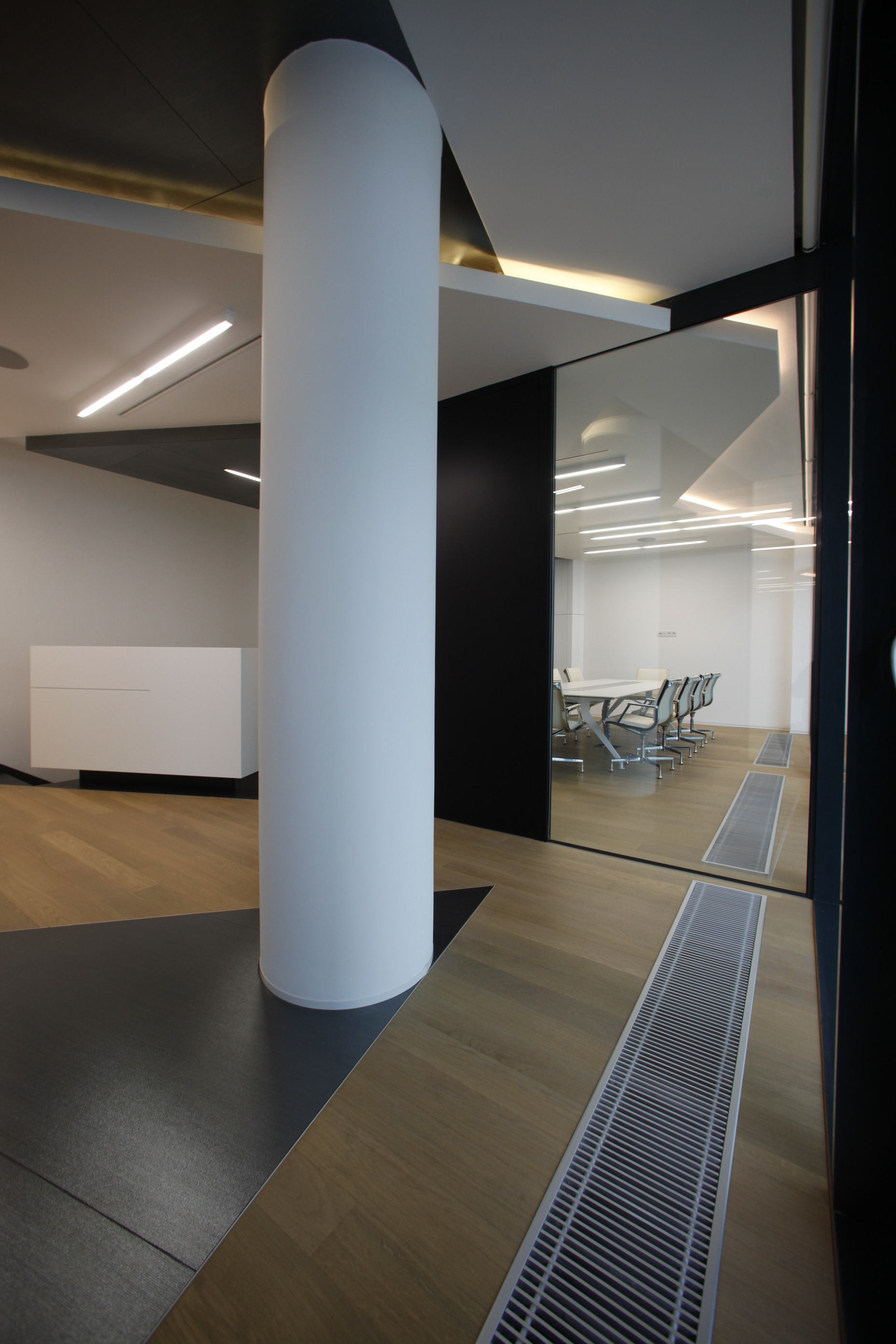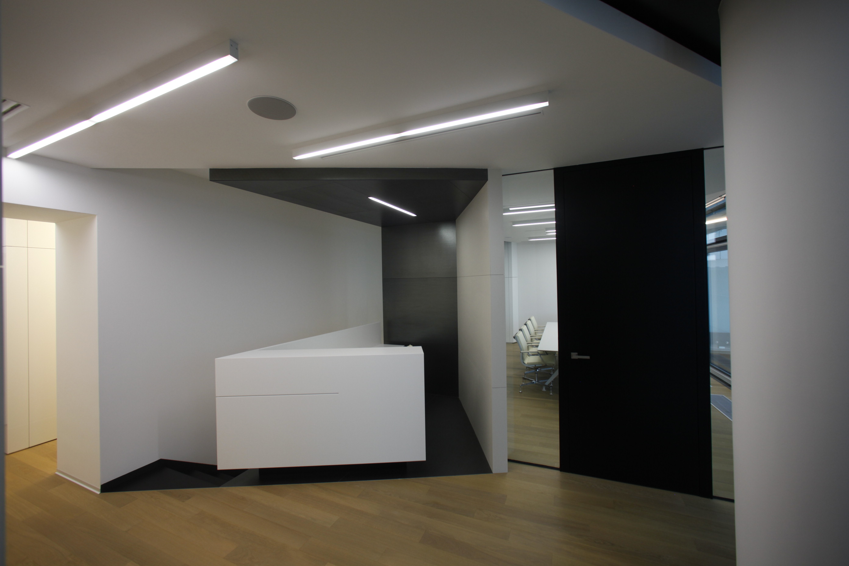 Zadaním investora bolo vytvoriť seriózny, ale zároveň moderný a atraktívny interiér firmy pre cca 7 pracovníkov, sekretárku a riaditeľa. Interiér je hneď na prvý pohľad charakteristický kontrastom farebnosti povrchov (biela – čierna/antracitová), materiálovým zložením (keramika – omietka – sklo – drevené parkety) a akcentovaním minipriestorov recepcie a čakárne.